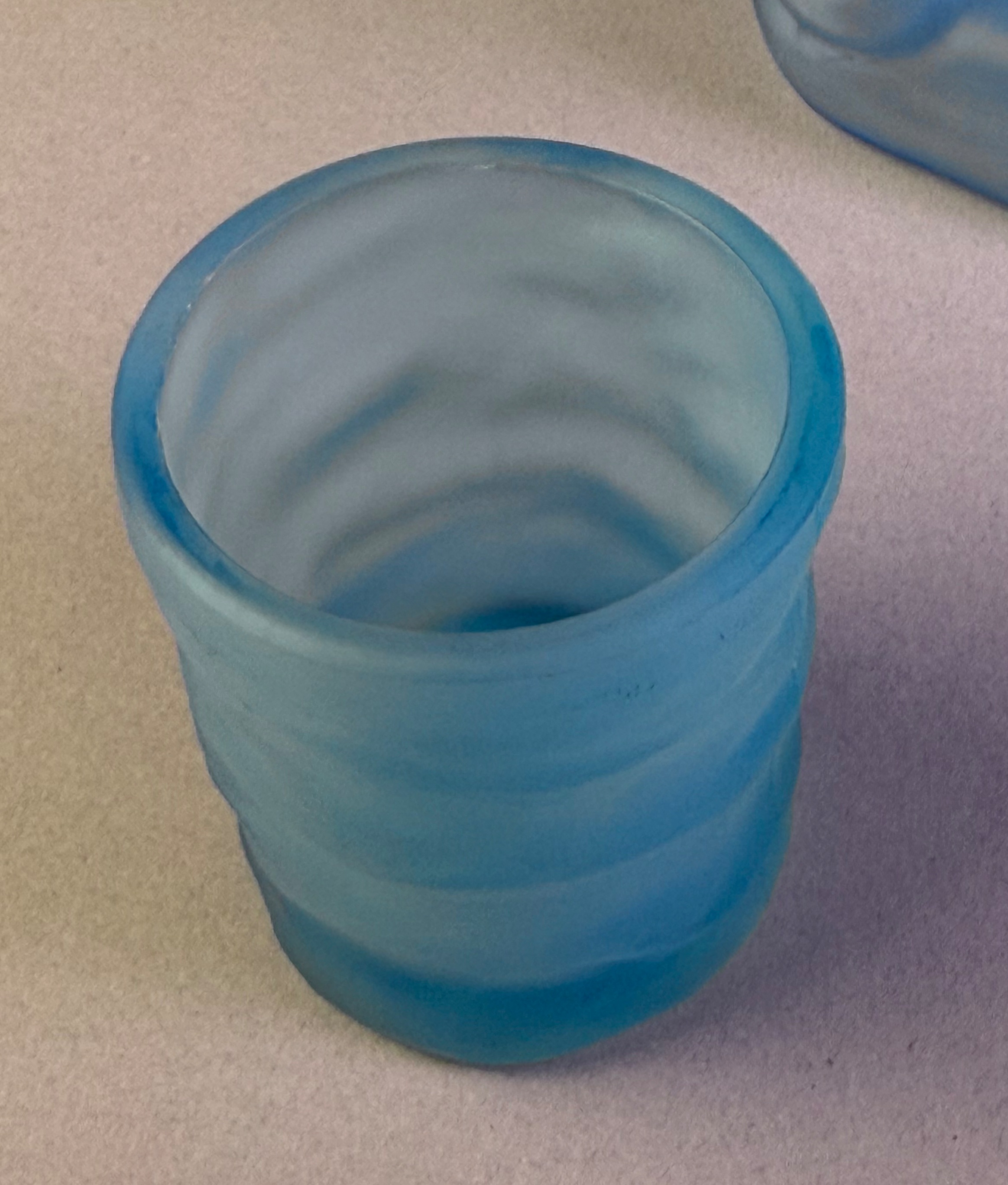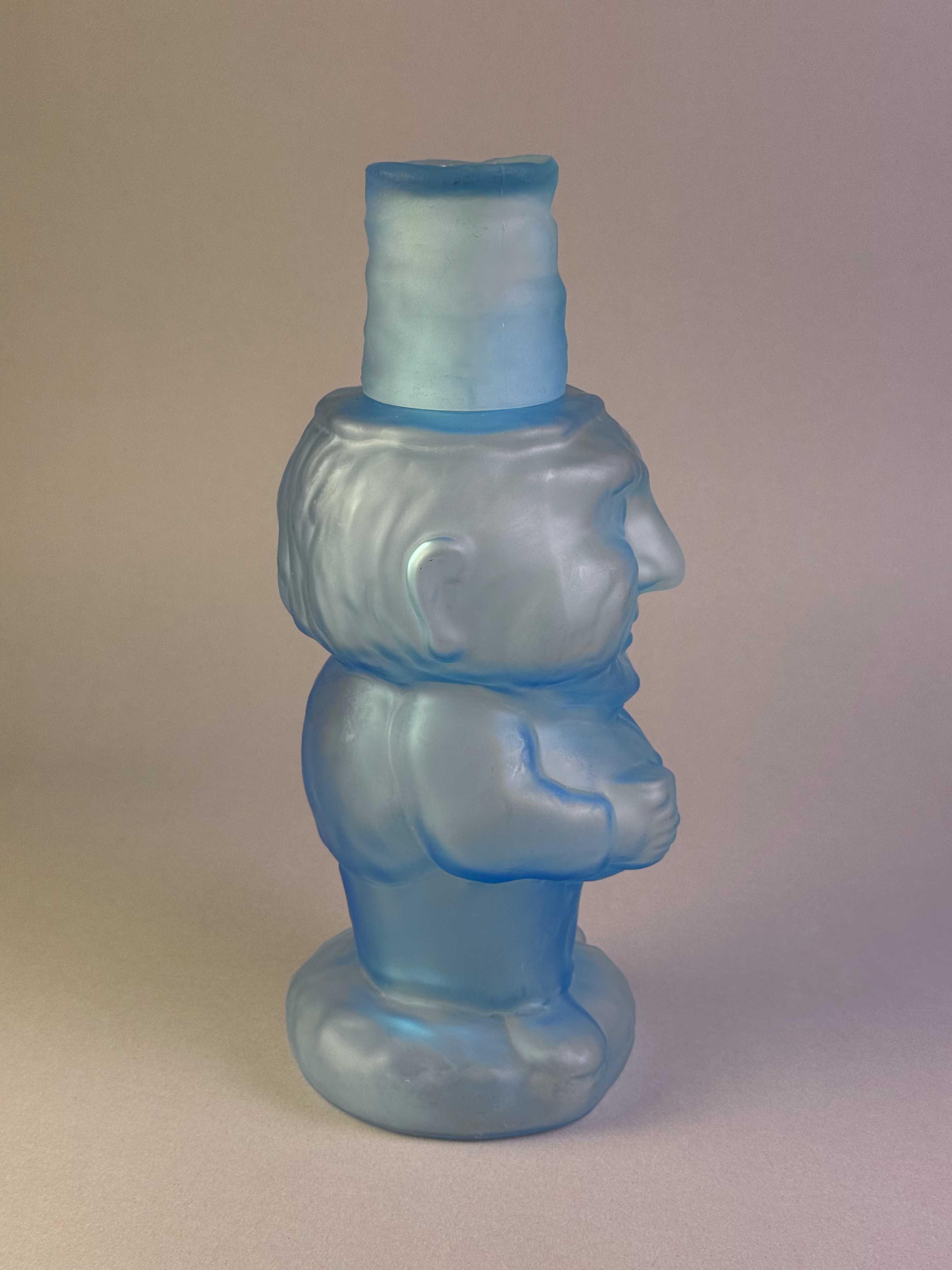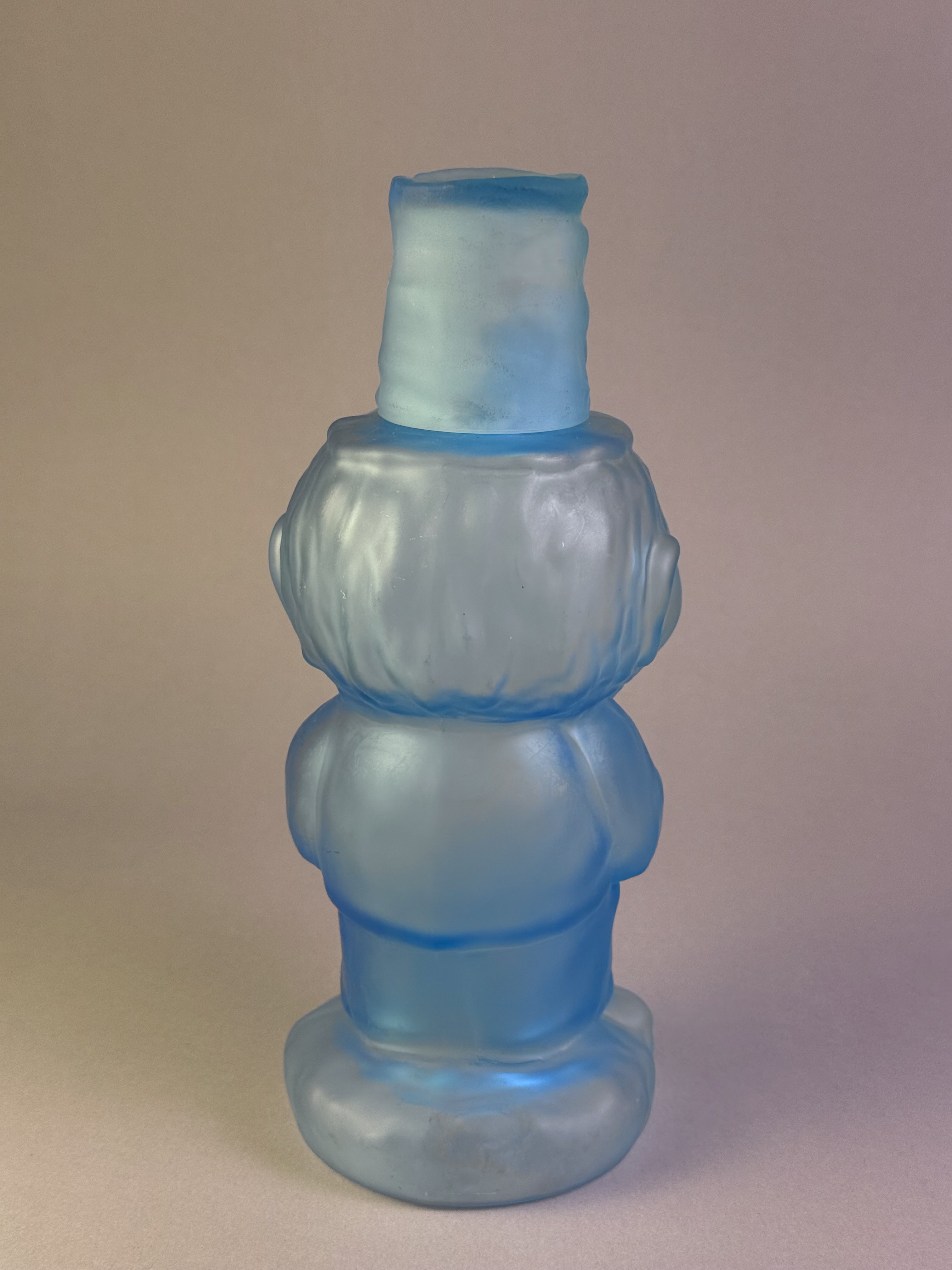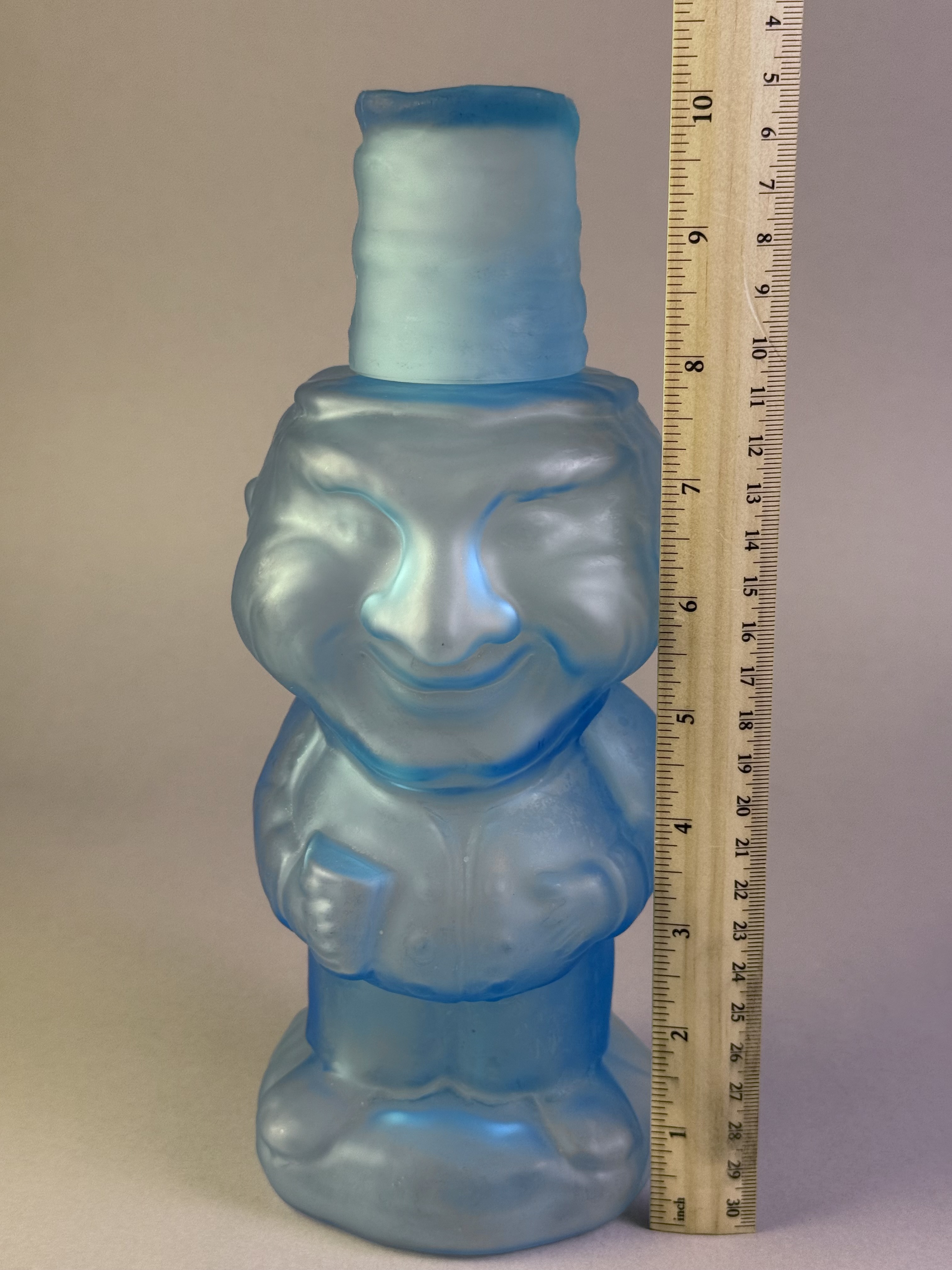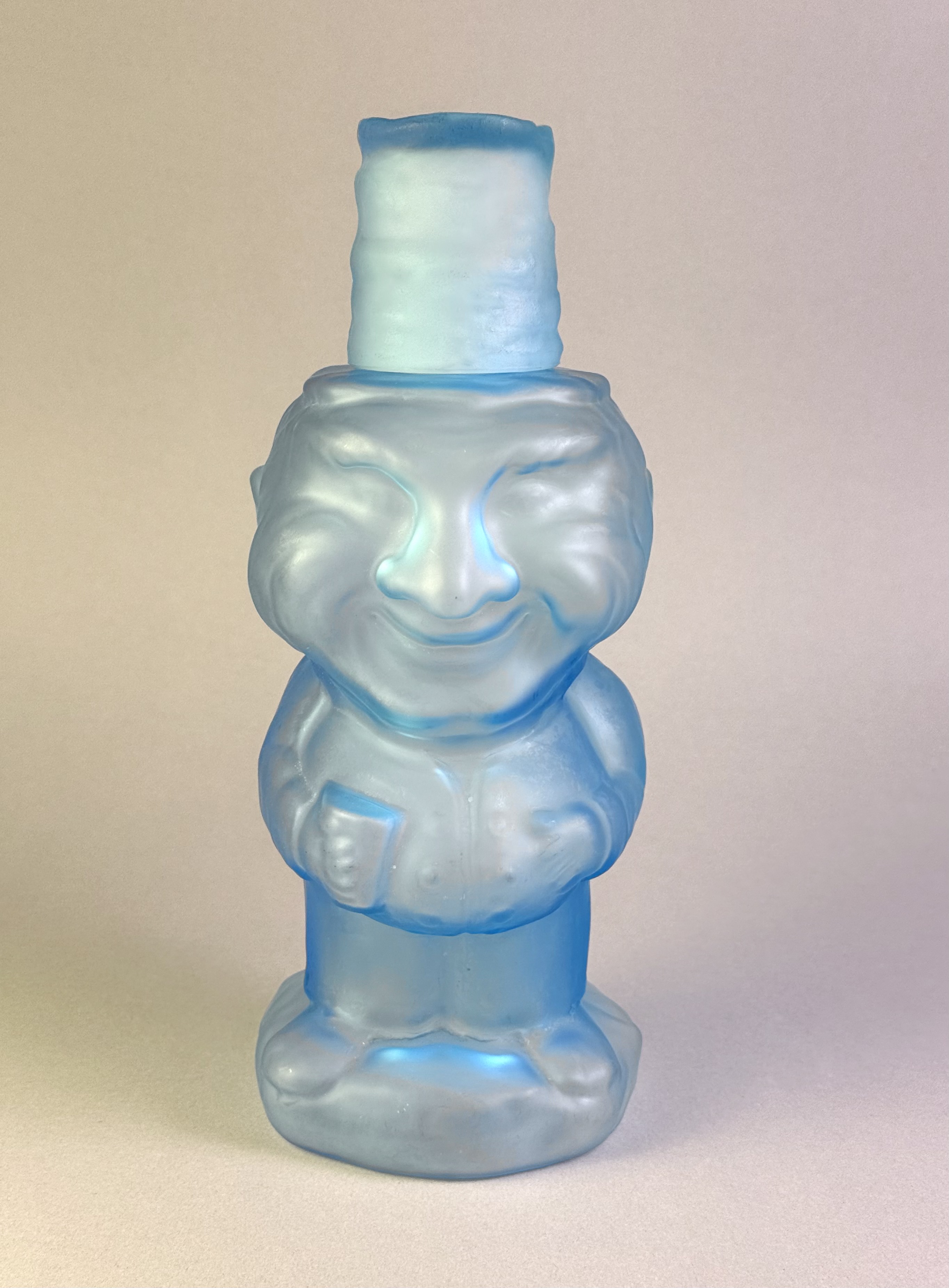 The glass is a vibrant cerulean blue with a uniform, velvety matte finish achieved through acid etching. The set includes a coordinating lid in the form of a tall, textured hat that fits onto the figure’s head; the lid is hollow and can serve as a small jigger or tasting vessel. The item is mold-blown with stylized details throughout the face and body. No signatures, maker’s marks, or labels are present.