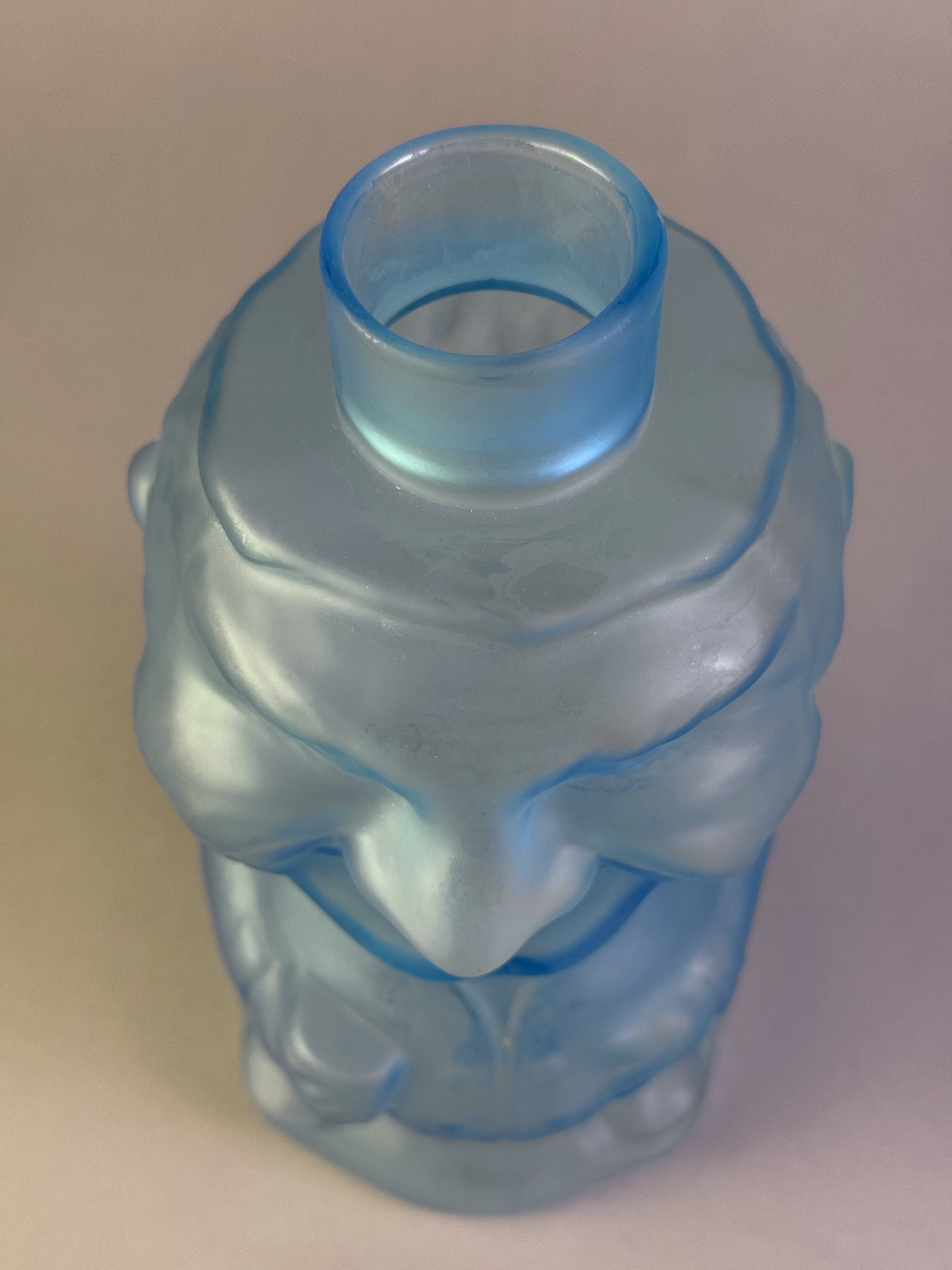 The decanter and Glass top are in excellent vintage condition. There are no visible chips, cracks, or significant abrasions to the frosted surface. The rims of the bottle and the base of the stopper are smooth and well-preserved.