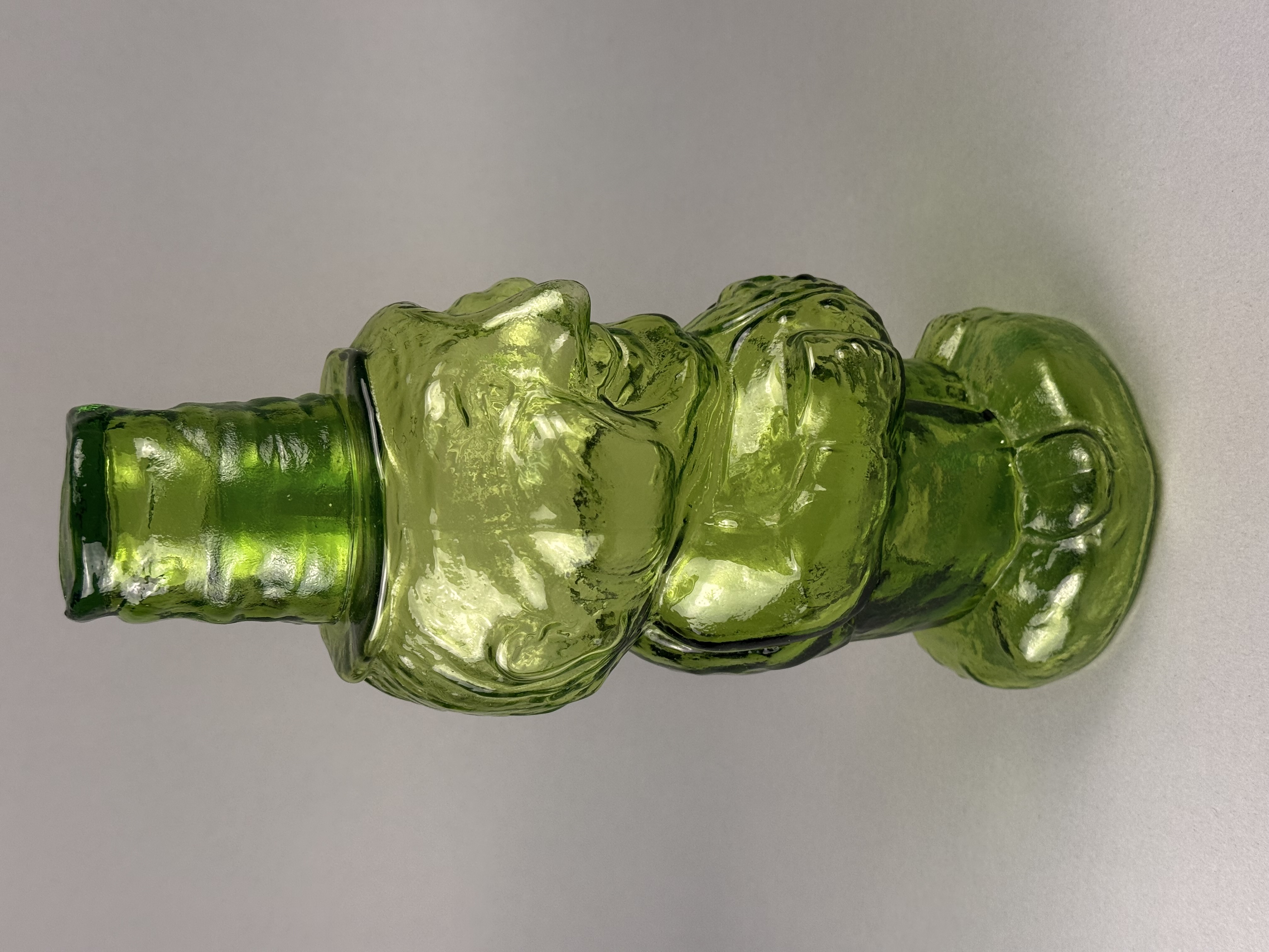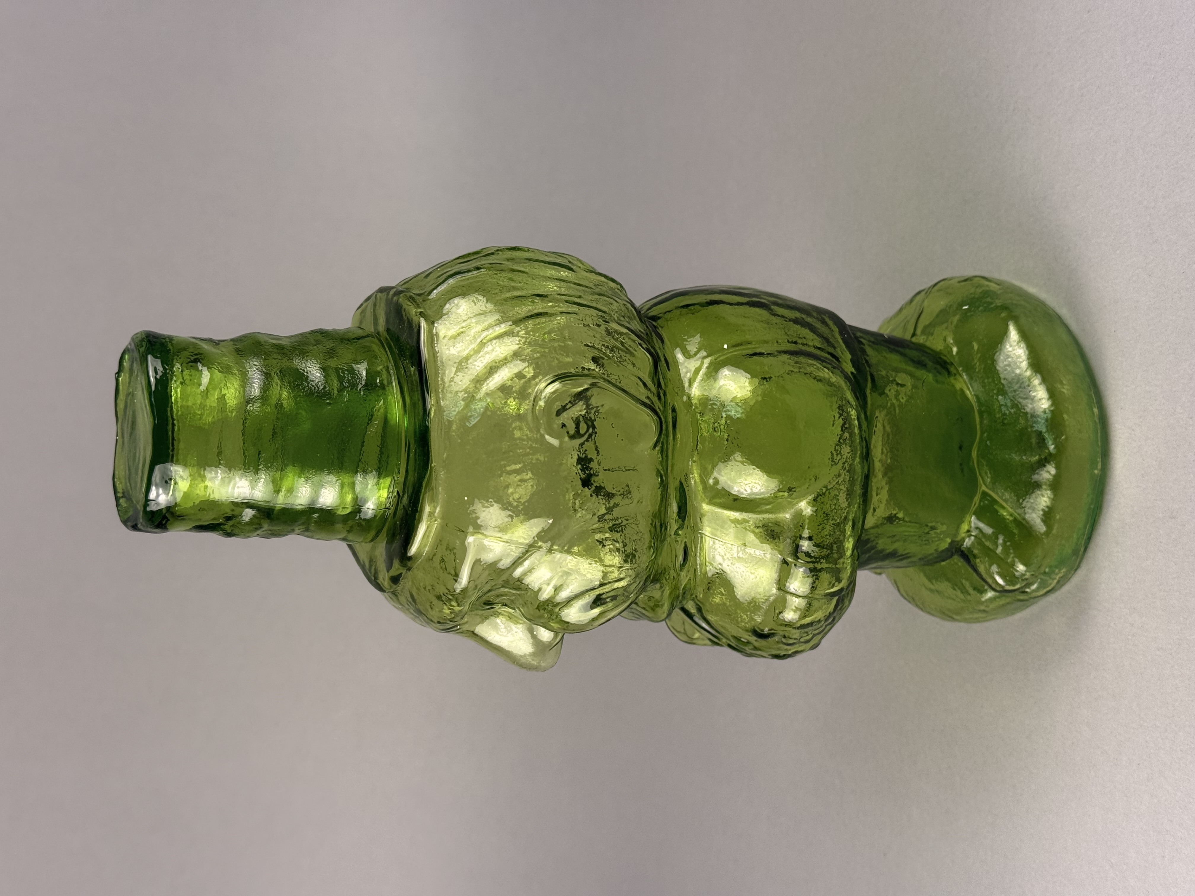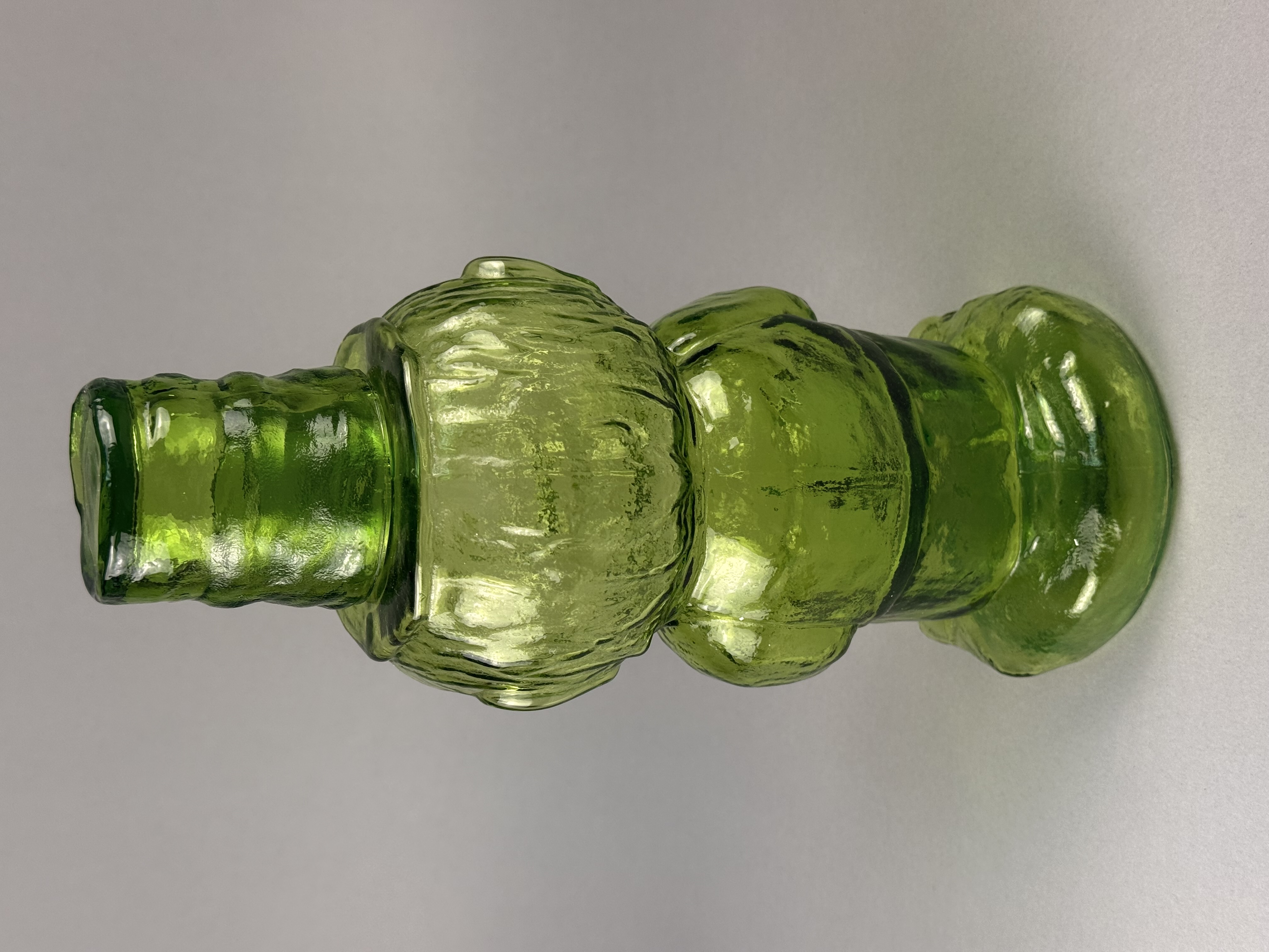 A mid-century decorative figural bottle or decanter crafted from mold-blown transparent green glass. The glass features a distinct textured or hammered finish throughout the body and neck, a technique common in mid-20th-century decorative glass. While the piece bears no visible maker’s marks or labels, the form and color are highly characteristic of the Gallery Jolly line produced by Indiana Glass. The bottle is designed with a finished rim and a hollow interior.