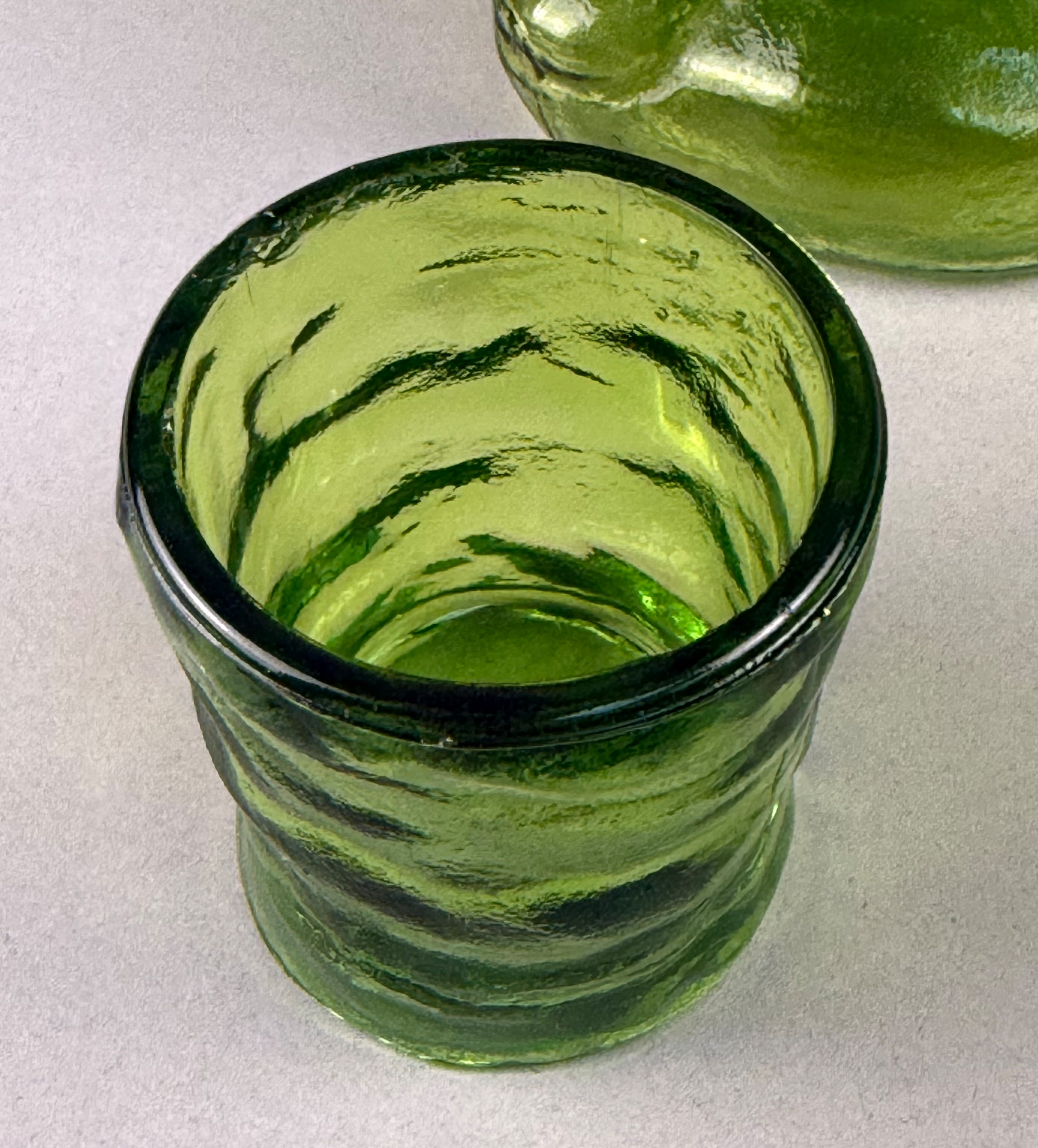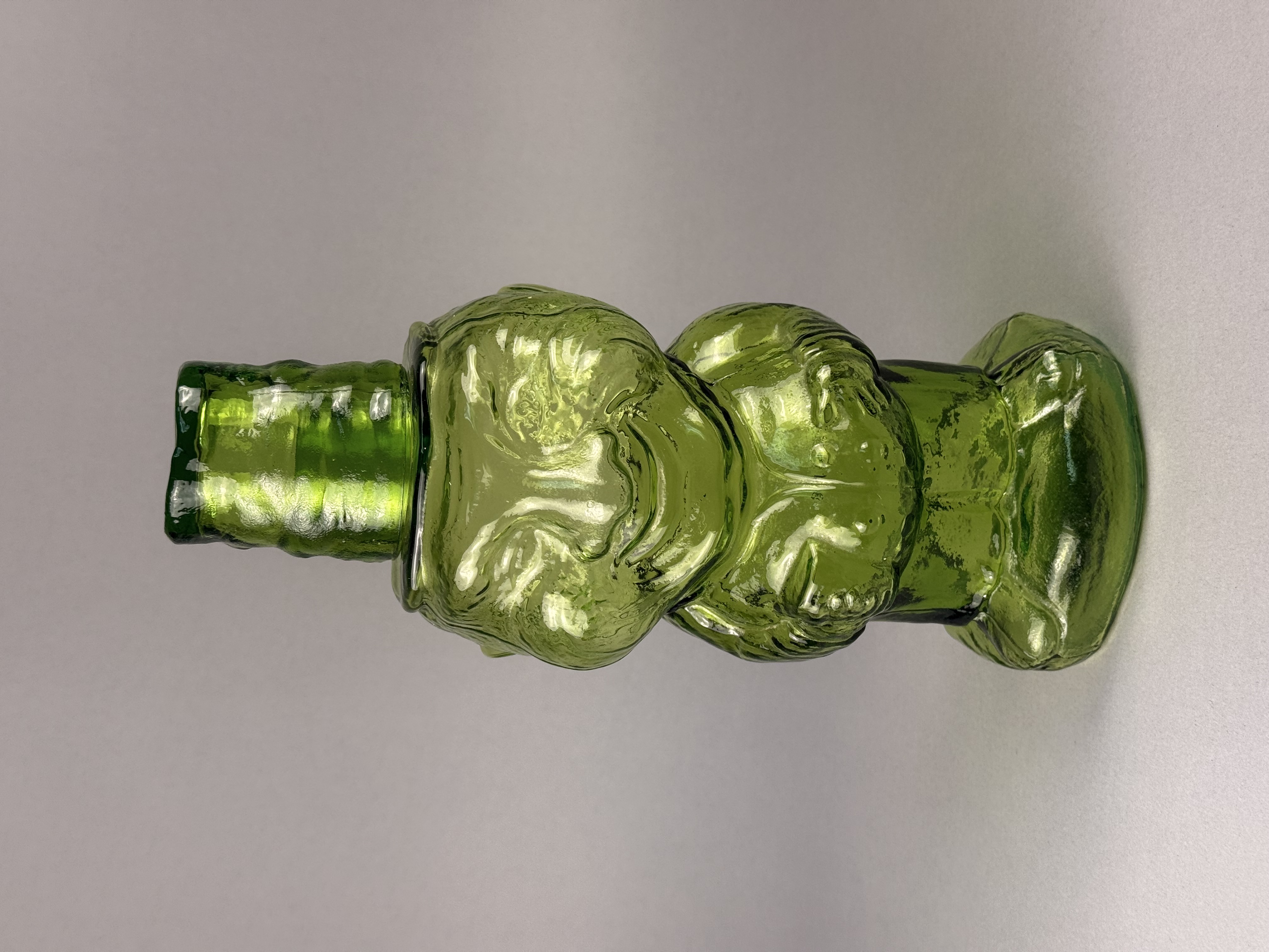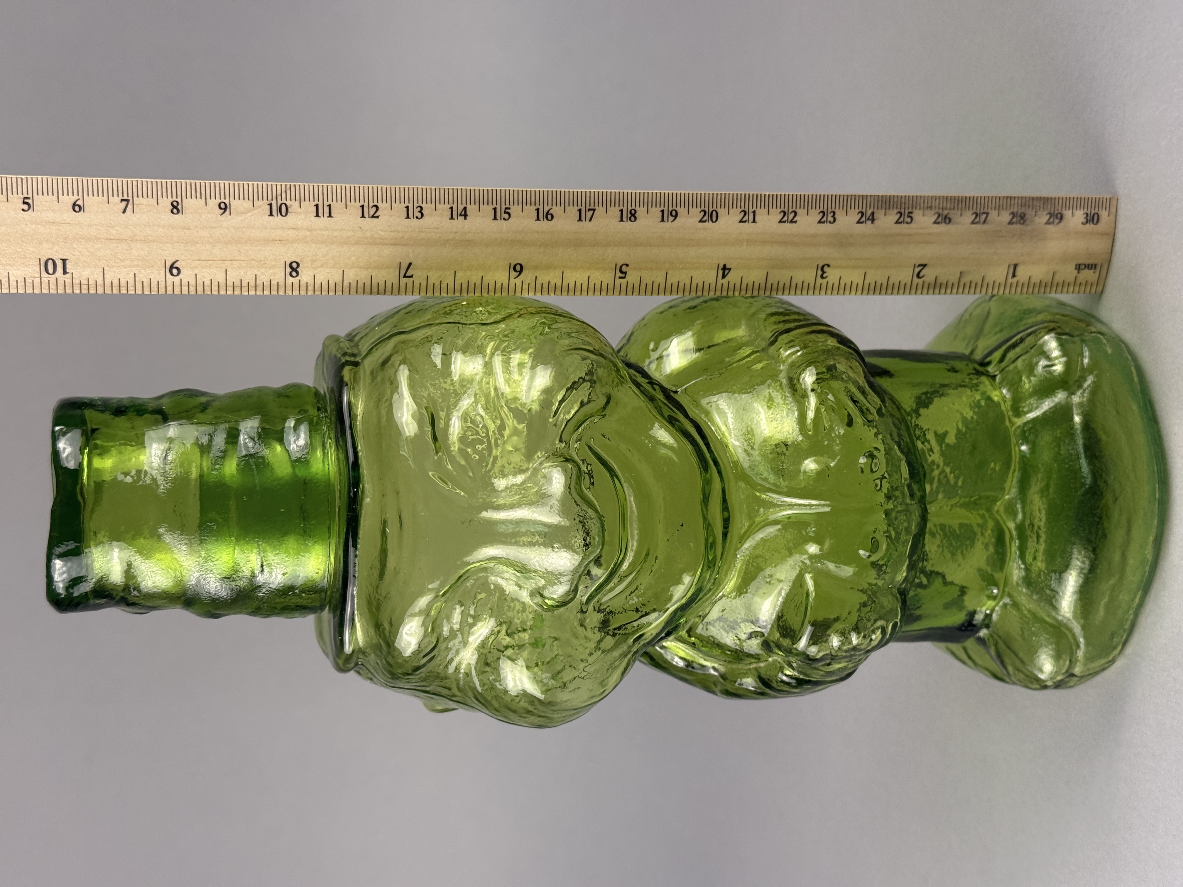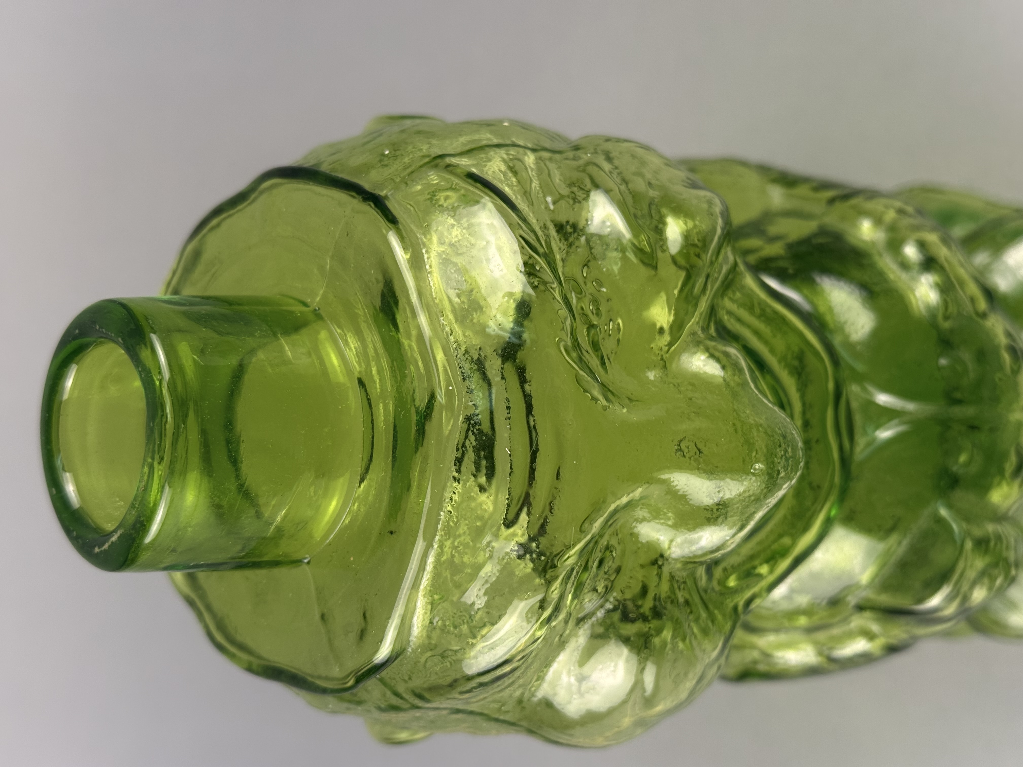 A mid-century decorative figural bottle or decanter crafted from mold-blown transparent green glass. The glass features a distinct textured or hammered finish throughout the body and neck, a technique common in mid-20th-century decorative glass. While the piece bears no visible maker’s marks or labels, the form and color are highly characteristic of the Gallery Jolly line produced by Indiana Glass. The bottle is designed with a finished rim and a hollow interior.