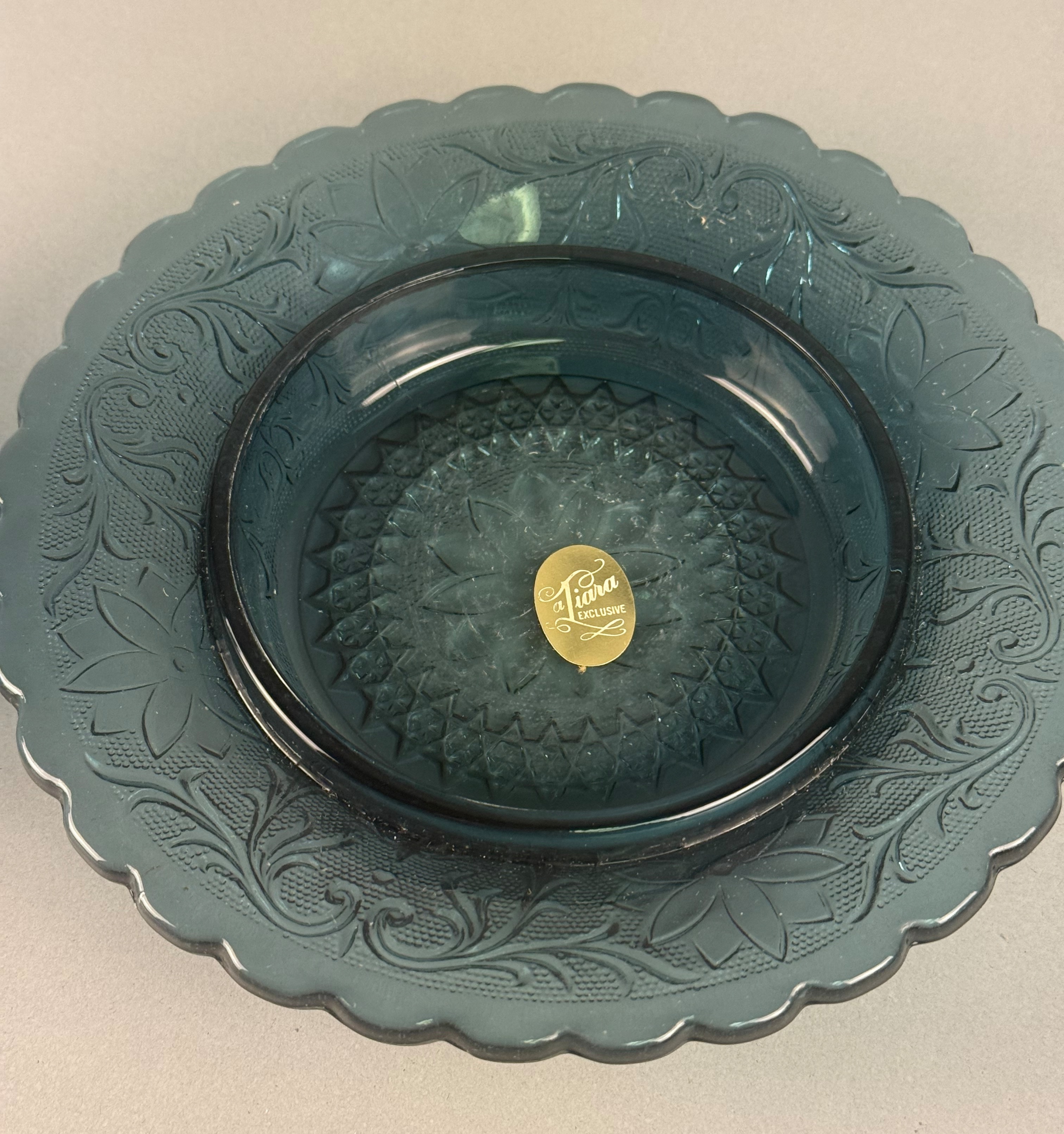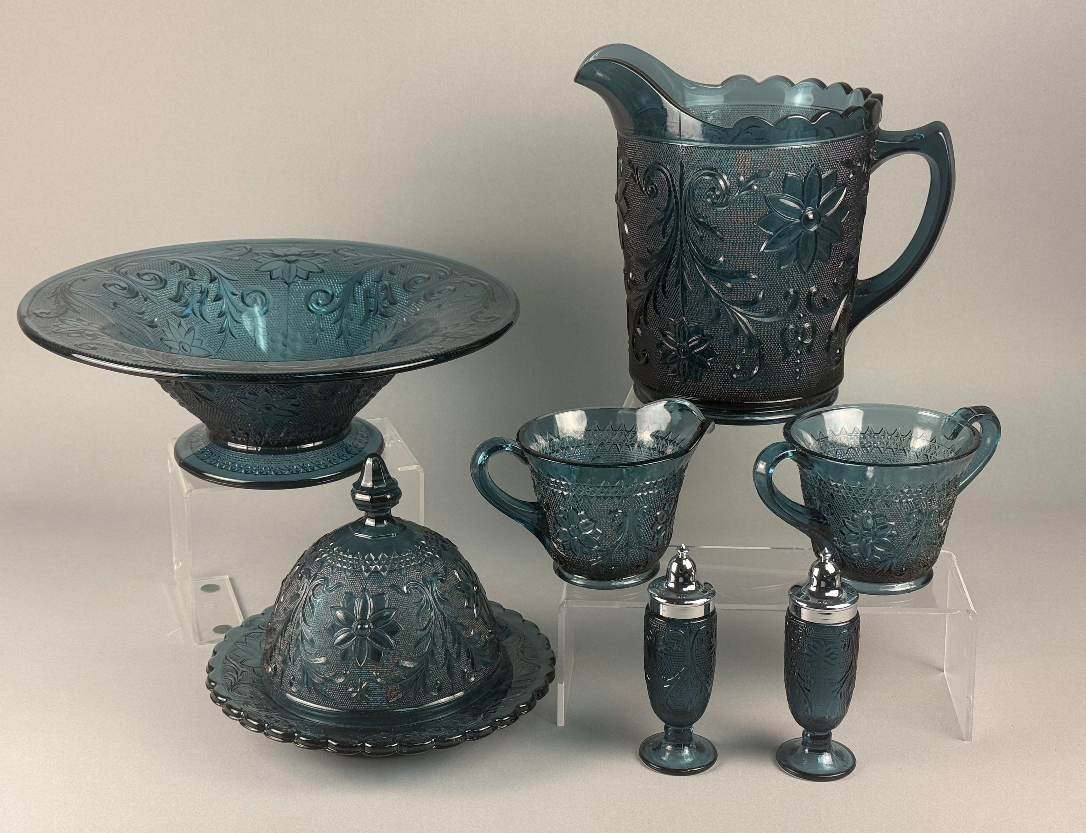 A collection of Indiana Glass pressed glass tableware produced for Tiara Exclusives in the Sandwich pattern, featuring a Bicentennial Blue color. The group includes a pitcher with a scalloped rim and ice lip, a wide footed console bowl, a two-piece covered butter dish, a footed creamer, a footed sugar bowl, and a pair of footed salt and pepper shakers with silver-tone metal caps. Each piece is decorated with embossed floral and scroll motifs against a stippled ground. A gold-tone Tiara Exclusive foil manufacturer label is present on the underside of the console bowl. The items are accompanied by an original cardboard shipping box featuring a 13-star Betsy Ross flag design.