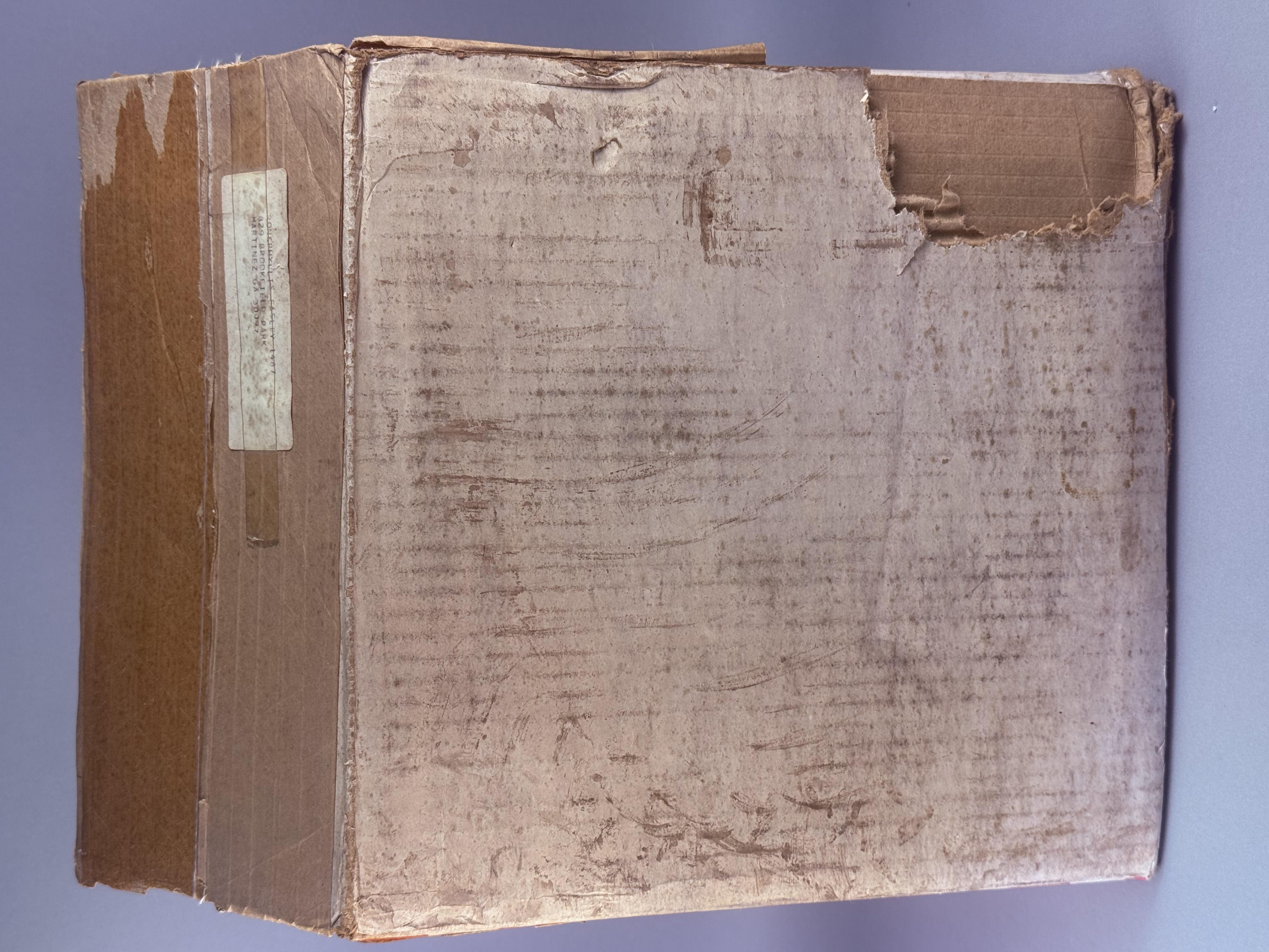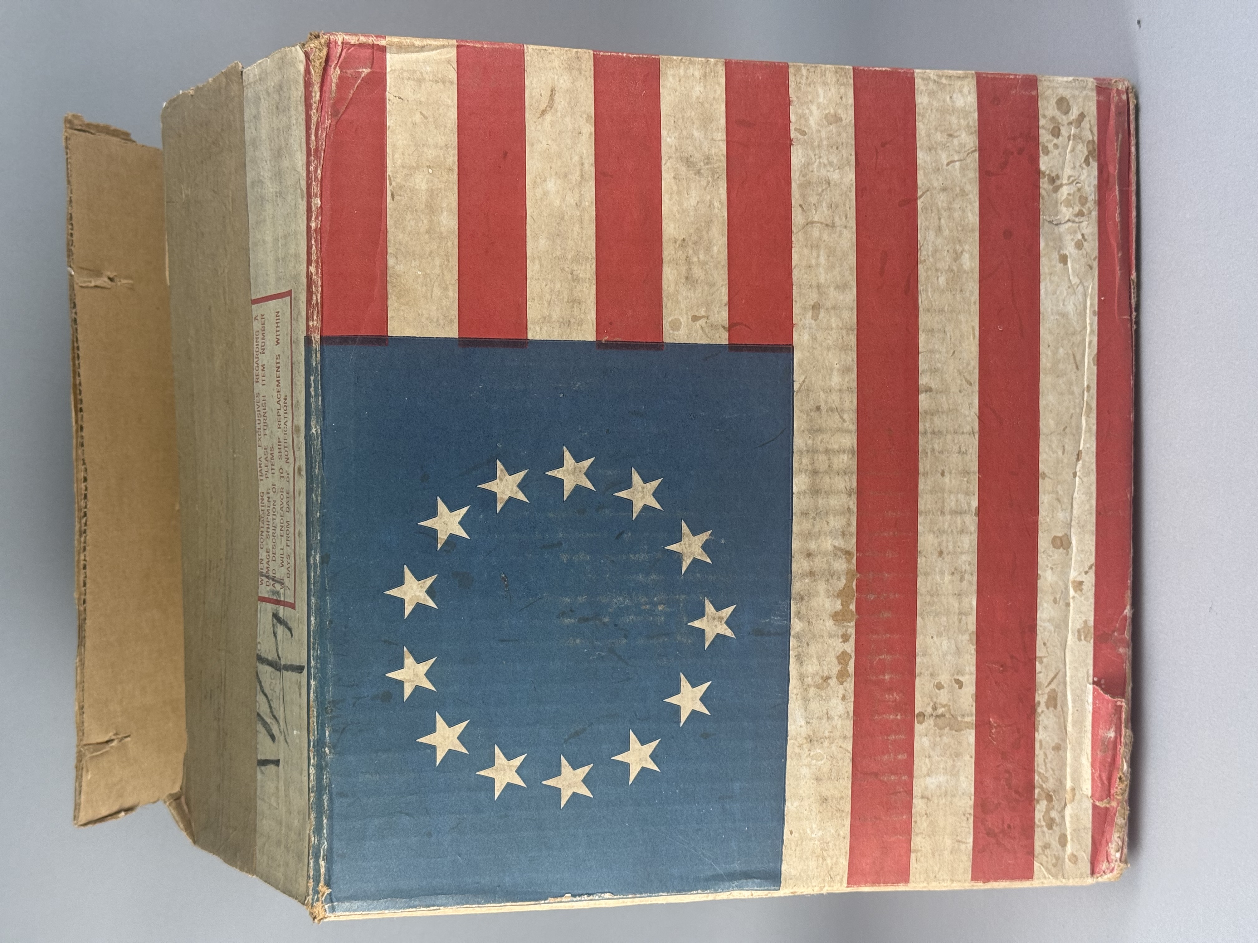 The glassware appears to be in overall good condition with no visible chips, cracks, or repairs. The original cardboard packaging is in distressed condition, exhibiting significant structural wear, tearing, and age-related discoloration.