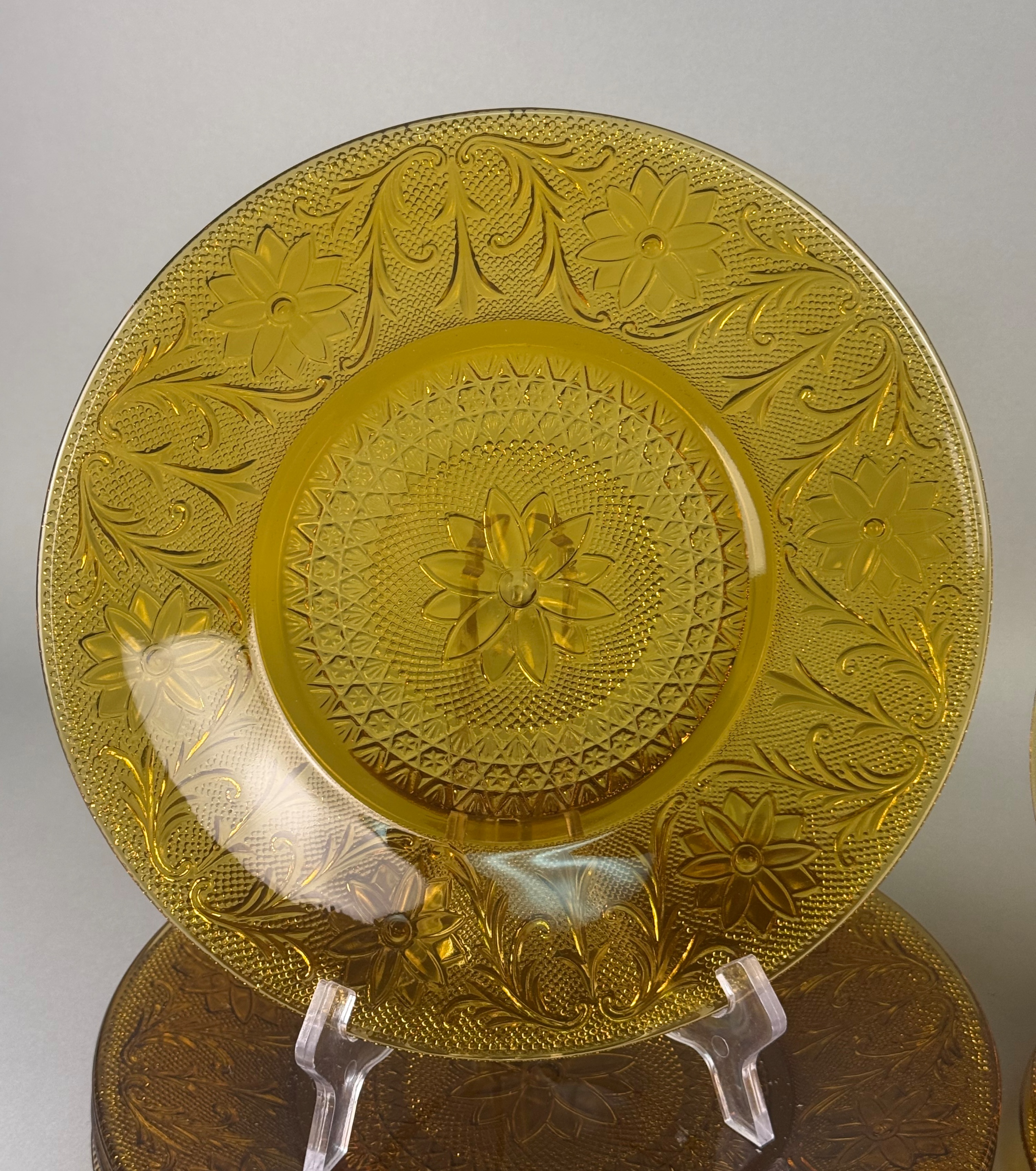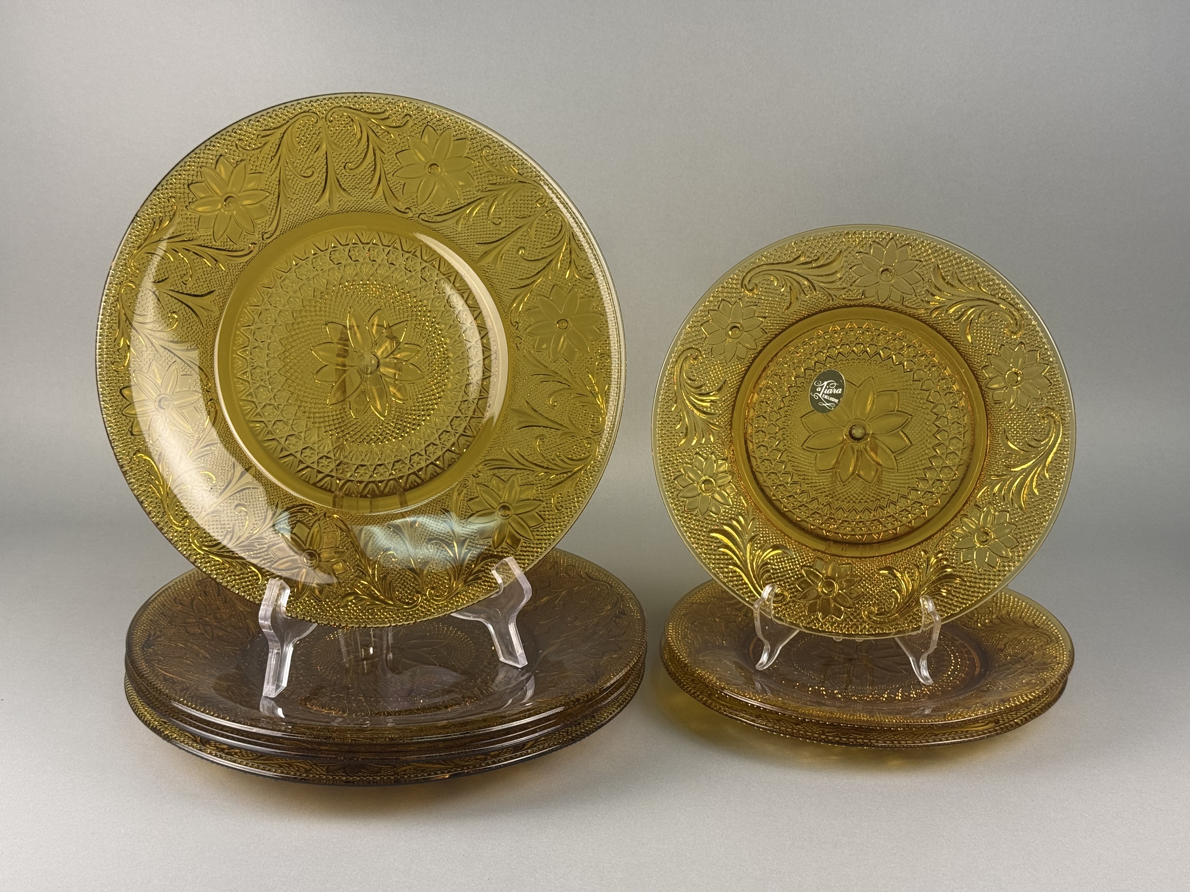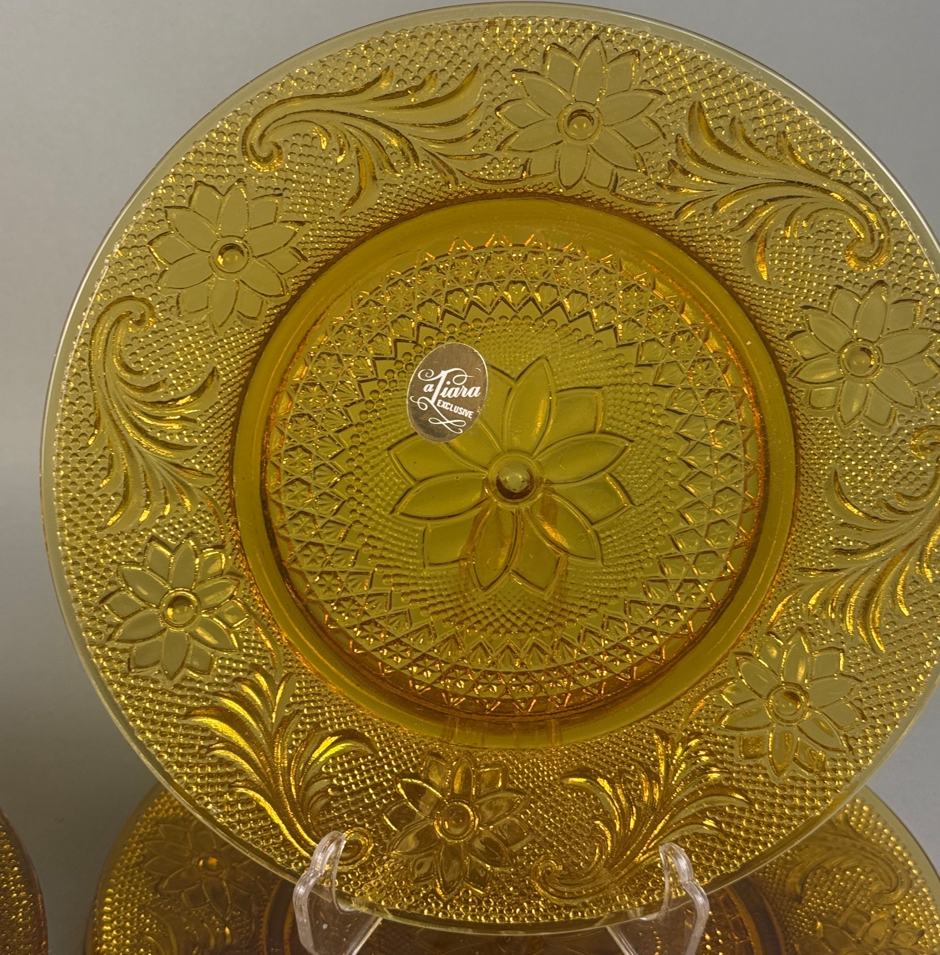 A collection of amber pressed glass plates featuring the Sandwich pattern. The decoration includes a central floral medallion surrounded by intricate scrolls, daisy motifs, and a textured stippled background. One plate in the smaller size retains a silver-toned foil label marked Tiara EXCLUSIVE. This pattern was produced by Indiana Glass for the Tiara Exclusives line. The collection consists of plates in two distinct sizes, typically used for dinner and luncheon or salad service.