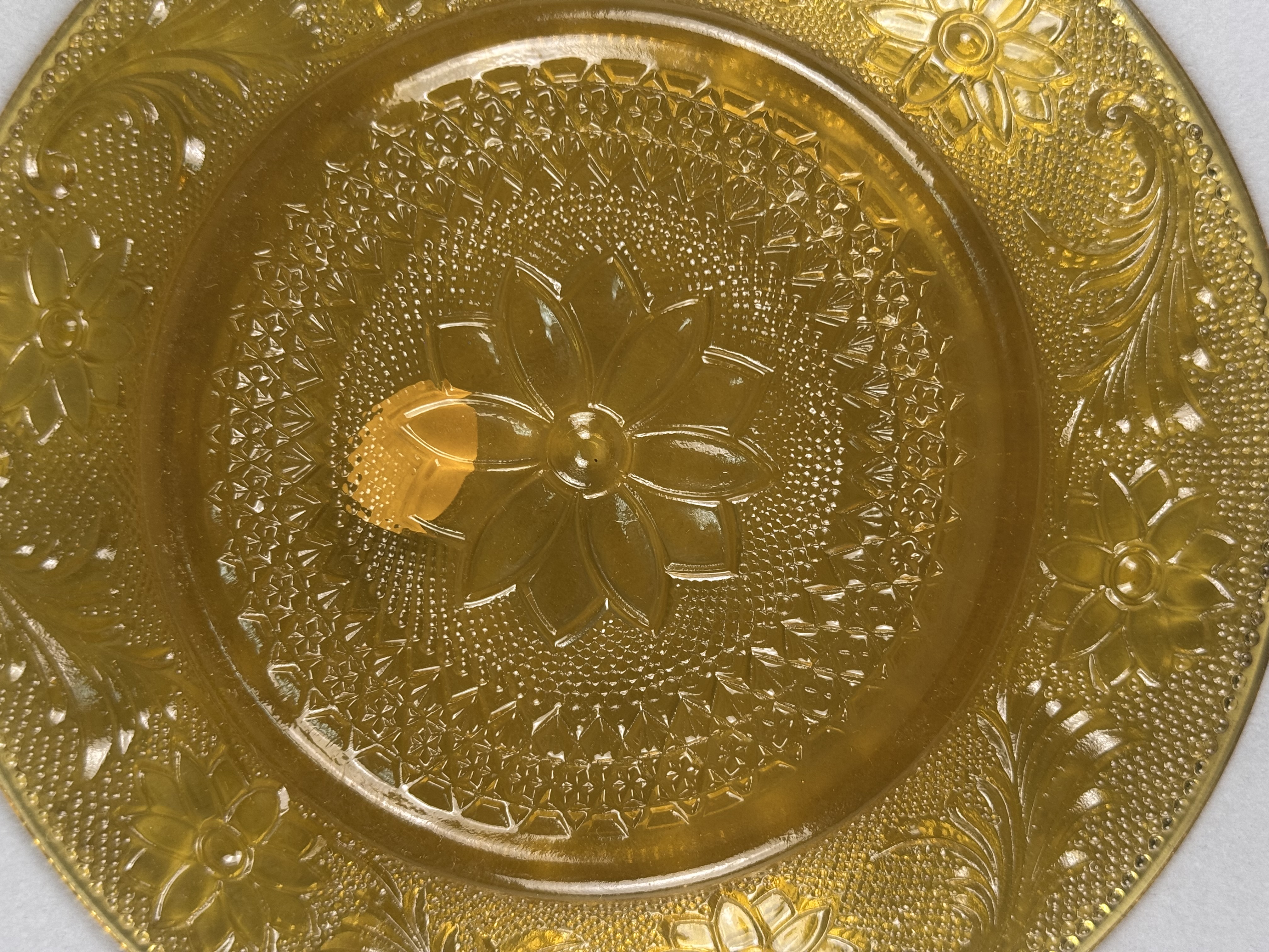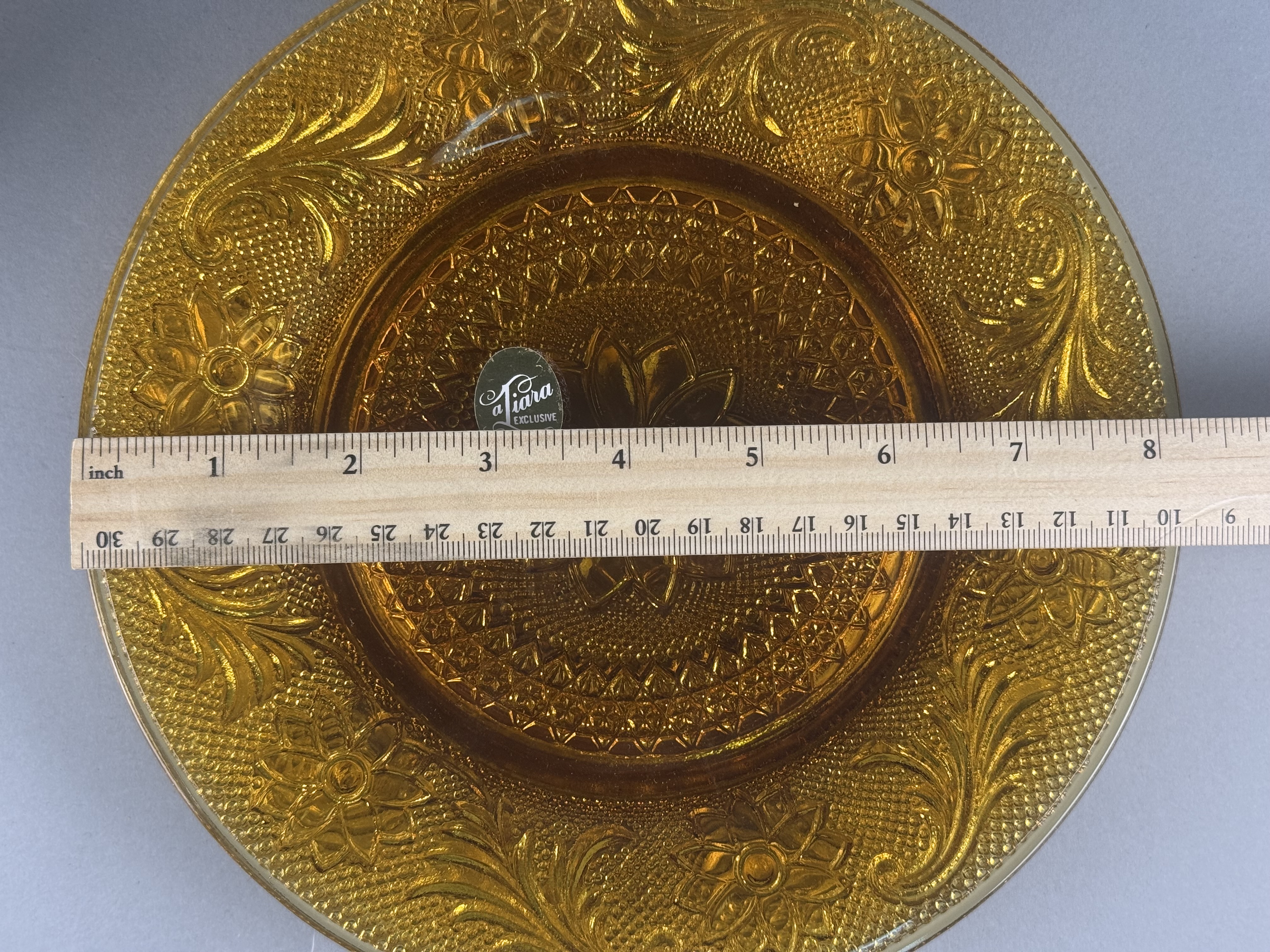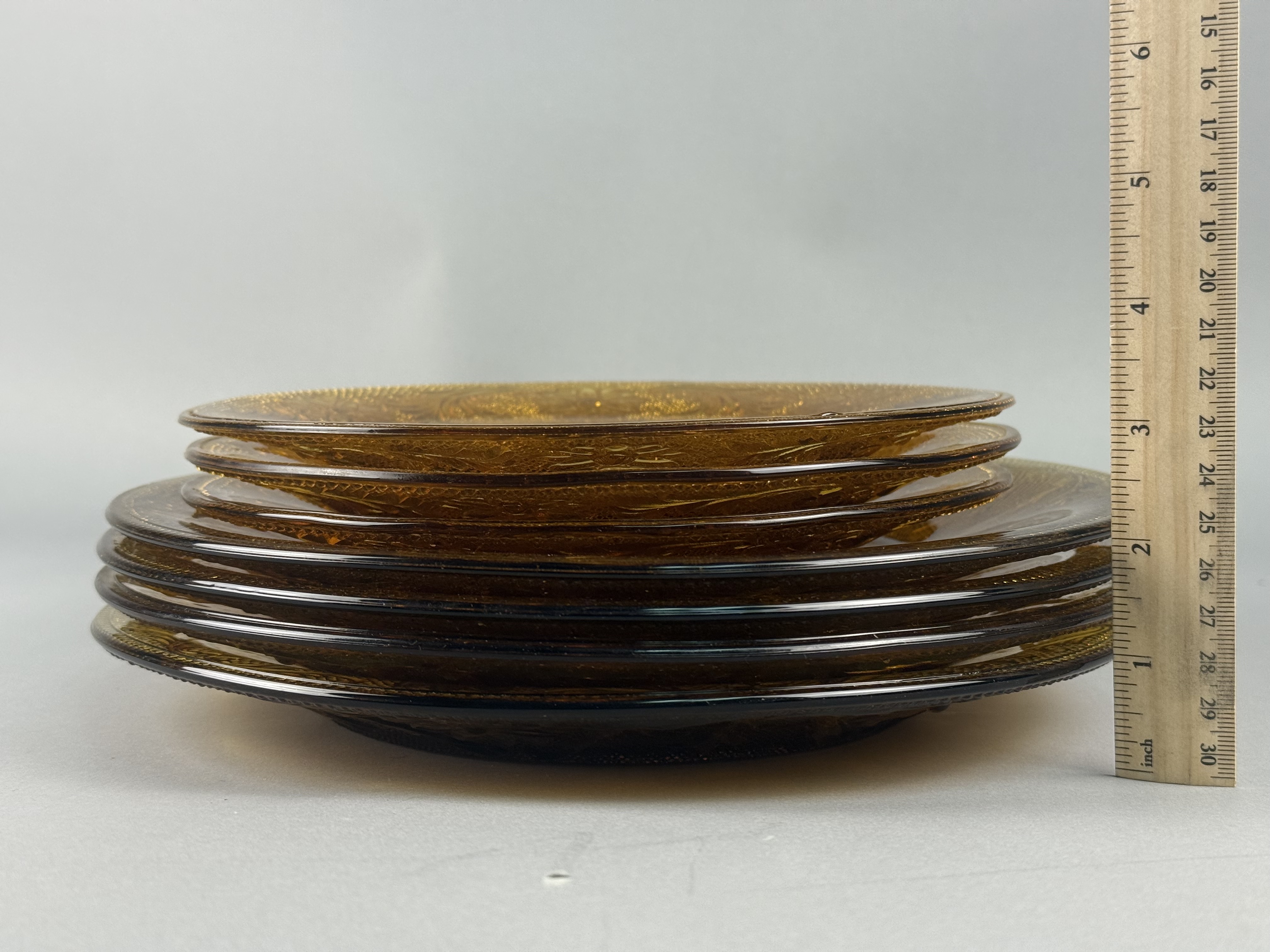 A collection of amber pressed glass plates featuring the Sandwich pattern. The decoration includes a central floral medallion surrounded by intricate scrolls, daisy motifs, and a textured stippled background. One plate in the smaller size retains a silver-toned foil label marked Tiara EXCLUSIVE. This pattern was produced by Indiana Glass for the Tiara Exclusives line. The collection consists of plates in two distinct sizes, typically used for dinner and luncheon or salad service.