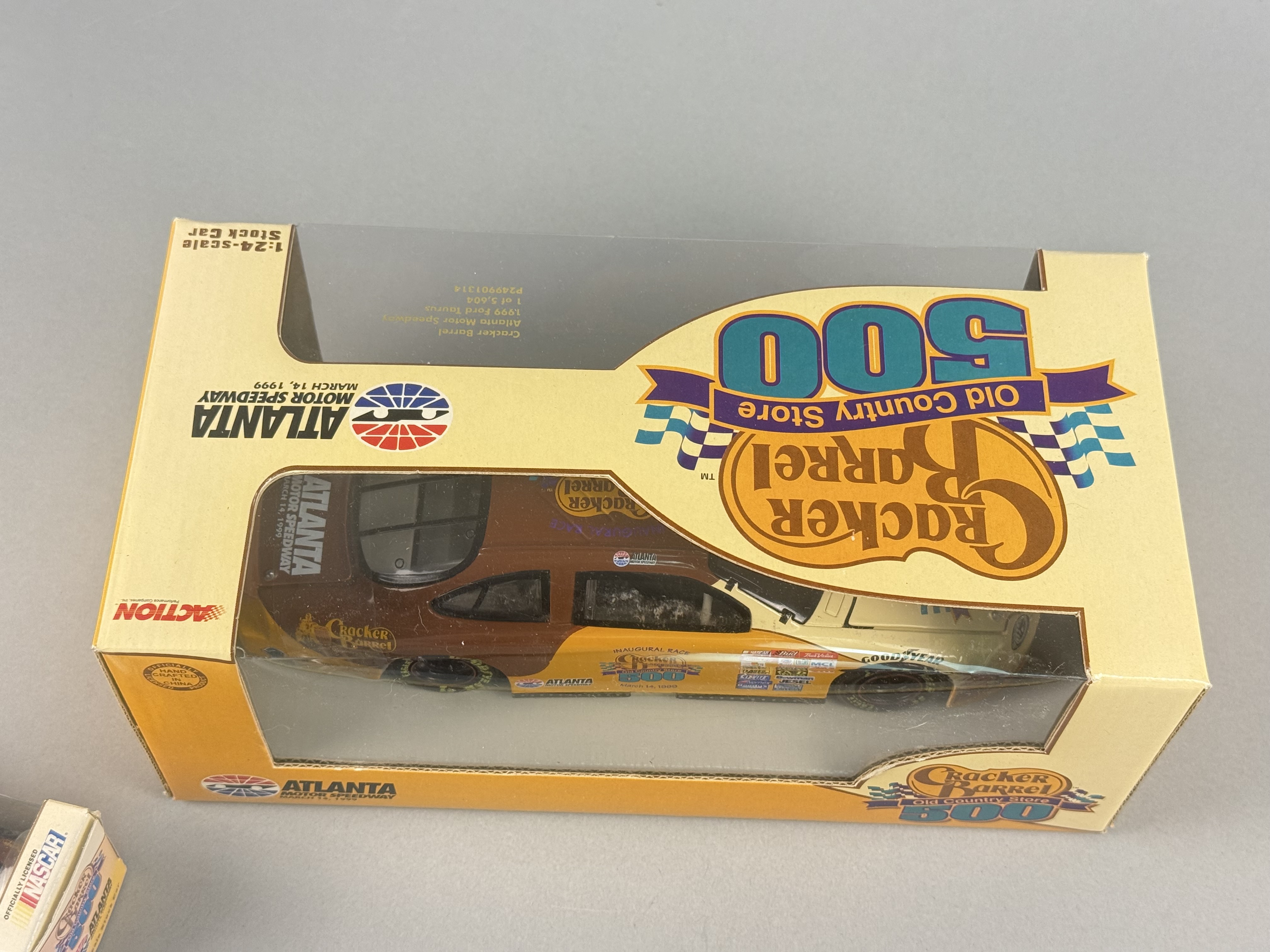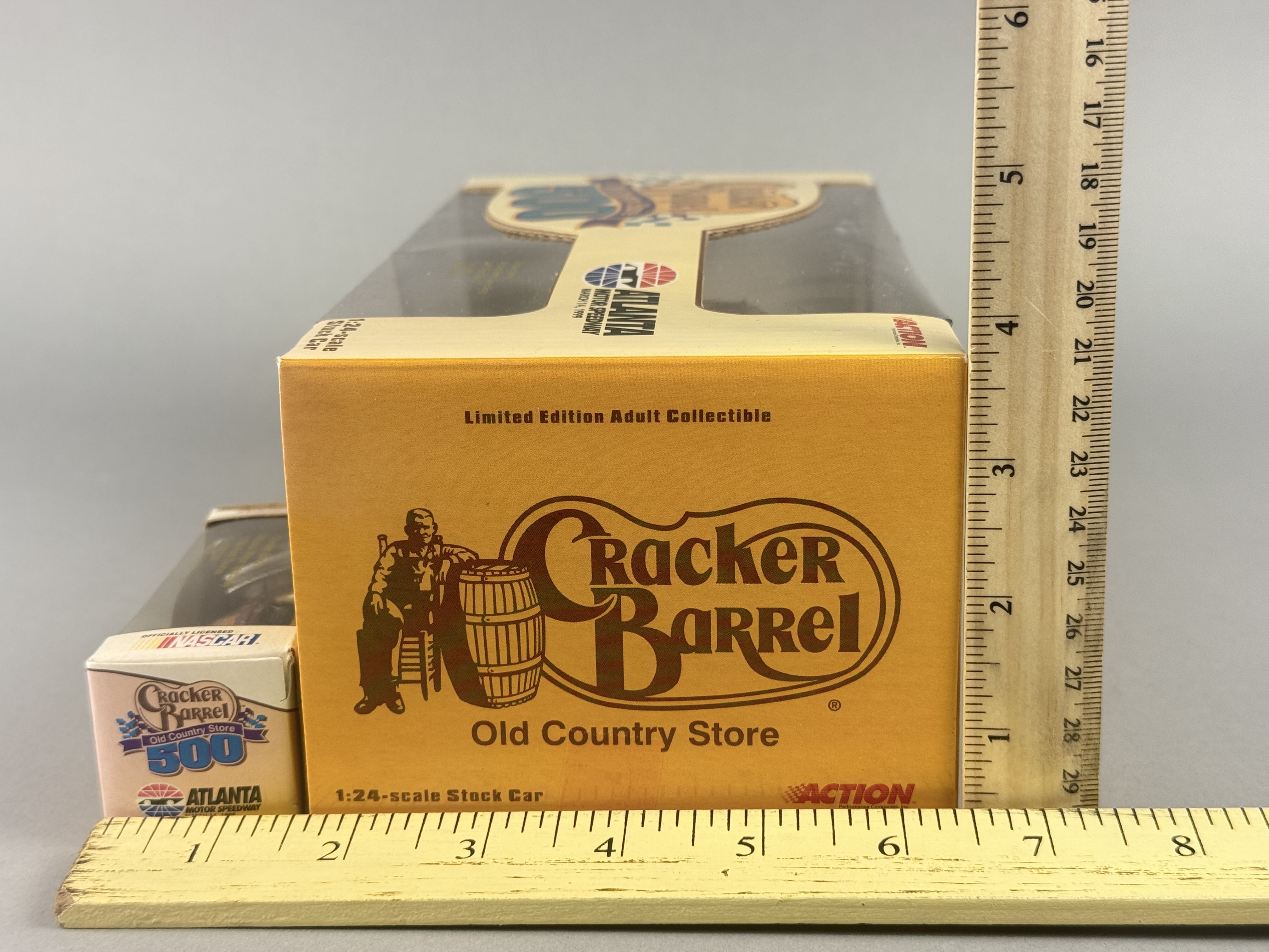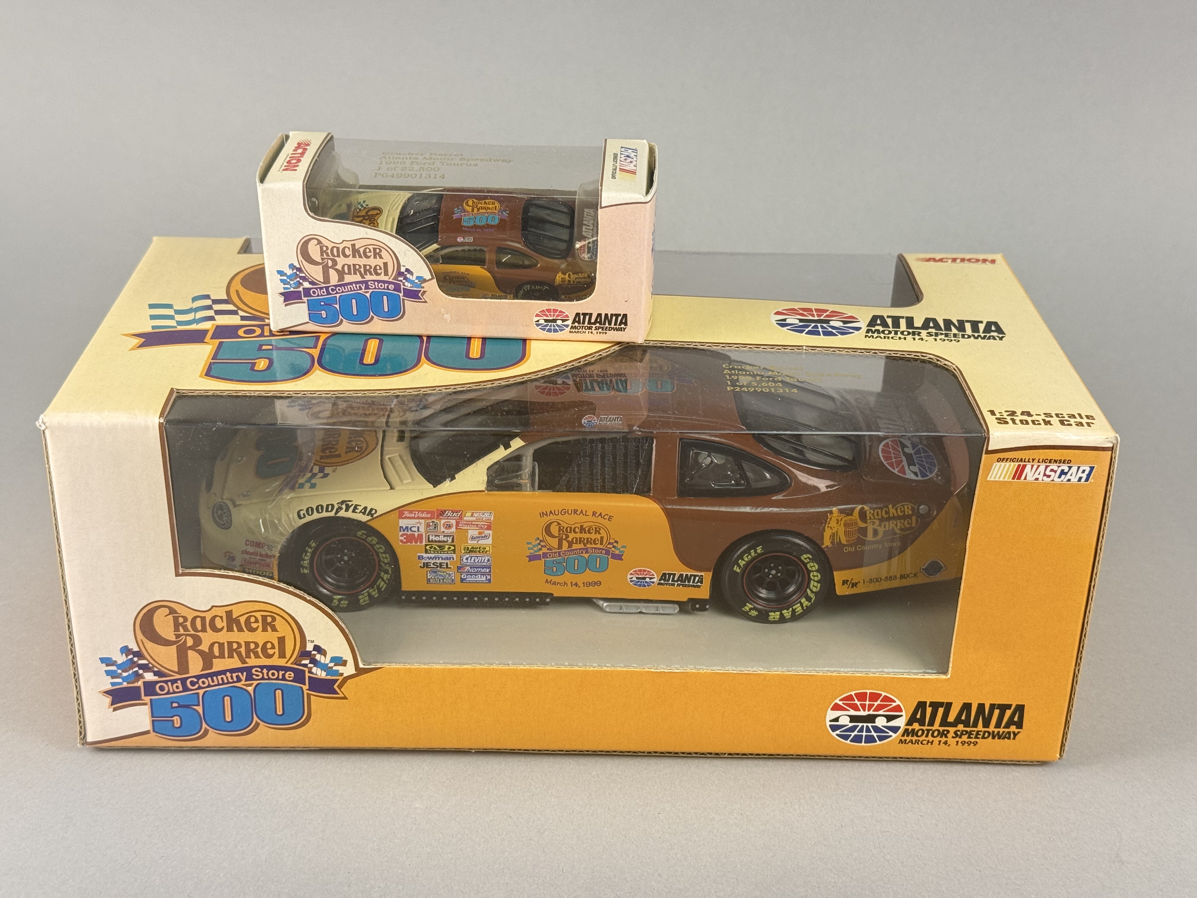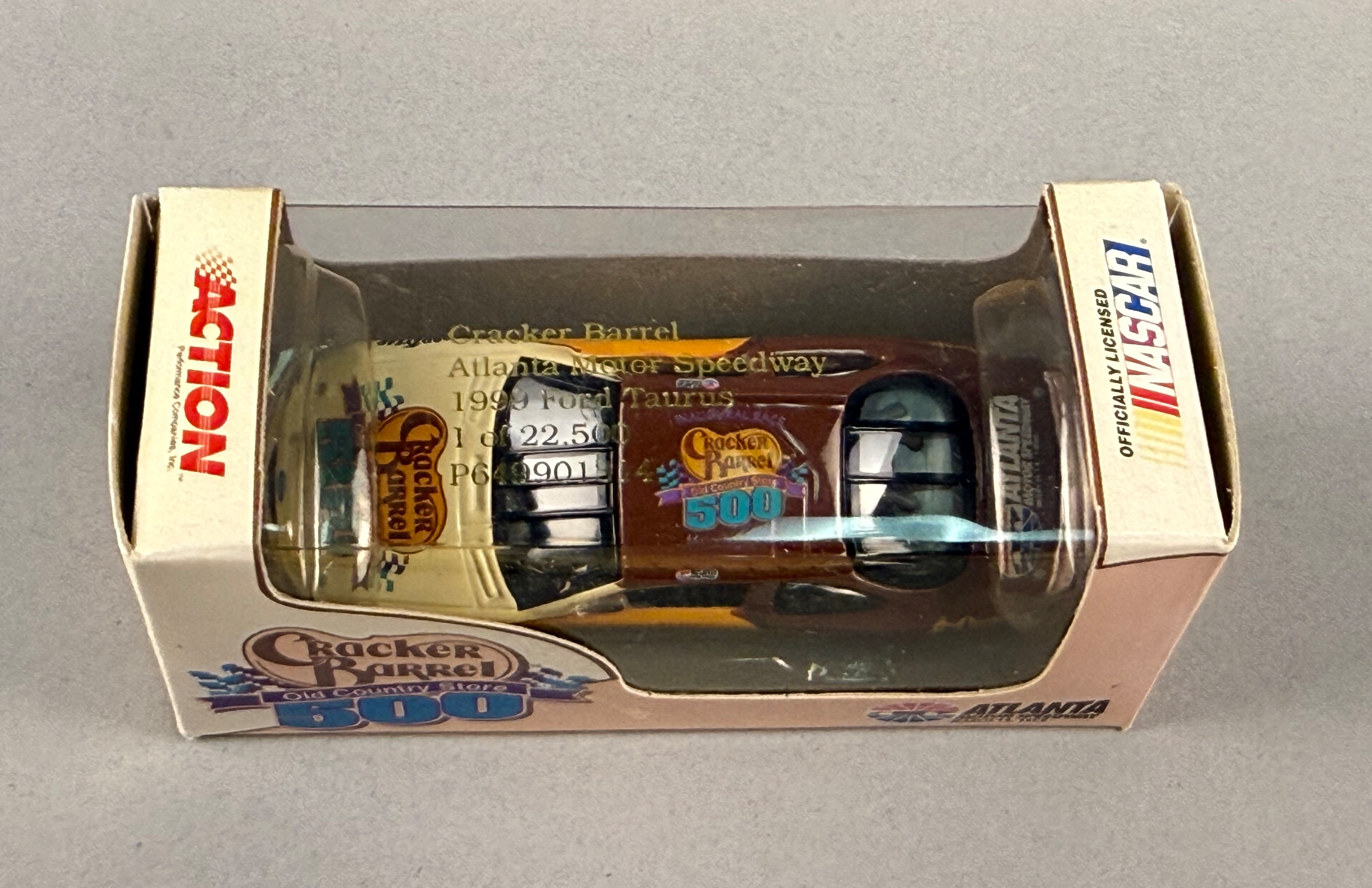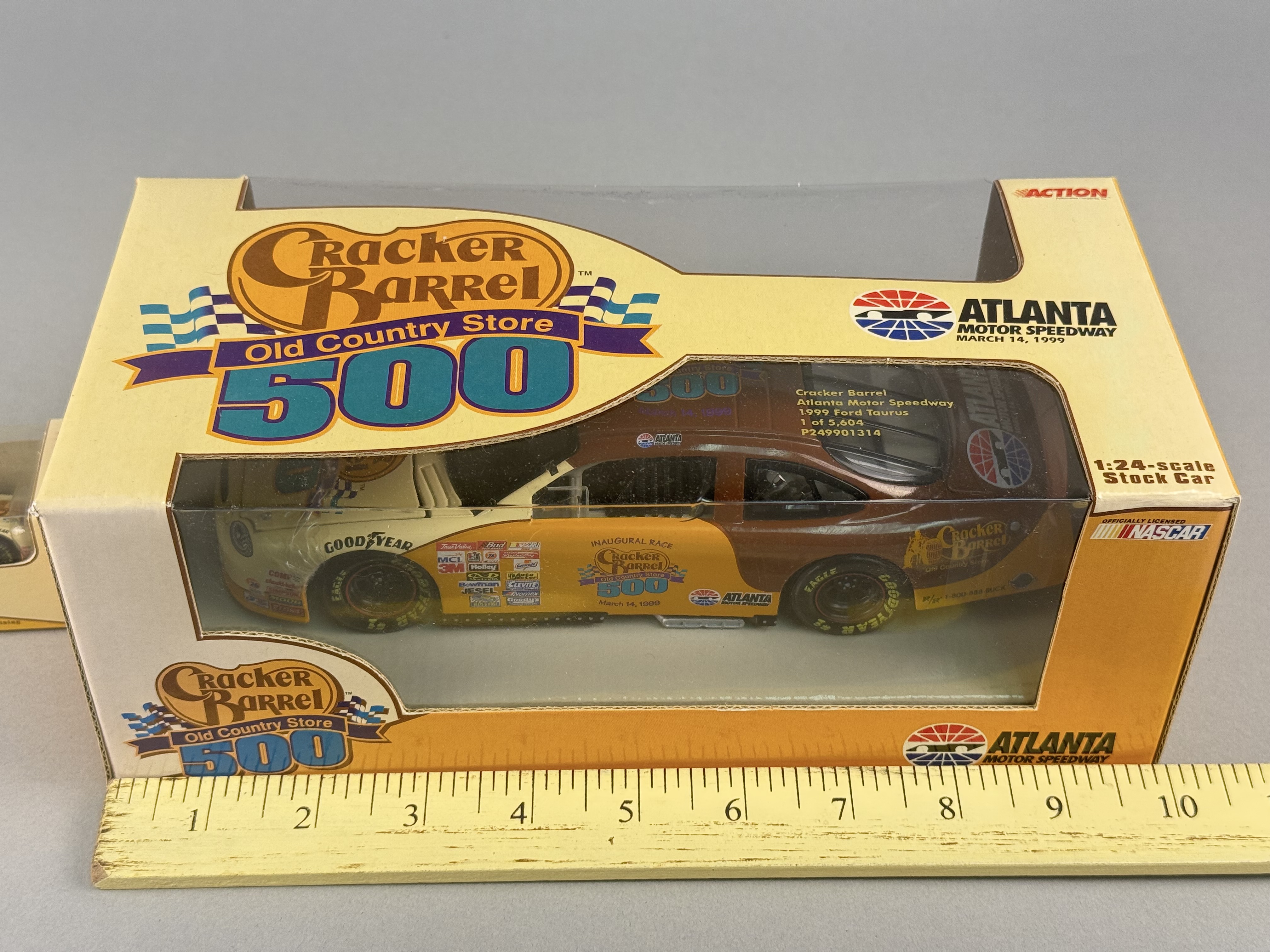 A pair of limited-edition die-cast NASCAR stock cars produced by Action Performance Companies, Inc. to commemorate the inaugural Cracker Barrel Old Country Store 500 held at Atlanta Motor Speedway on March 14, 1999. The group includes two 1999 Ford Taurus models in different scales. The 1:24-scale vehicle is part of a limited edition of 5,604 units, while the smaller-scale vehicle is part of a limited edition of 22,500 units. Both vehicles feature a tri-color brown, yellow, and cream livery with Cracker Barrel Old Country Store primary branding and various associate sponsor decals. The items are housed in their original illustrated window boxes featuring official NASCAR licensing and event-specific text.