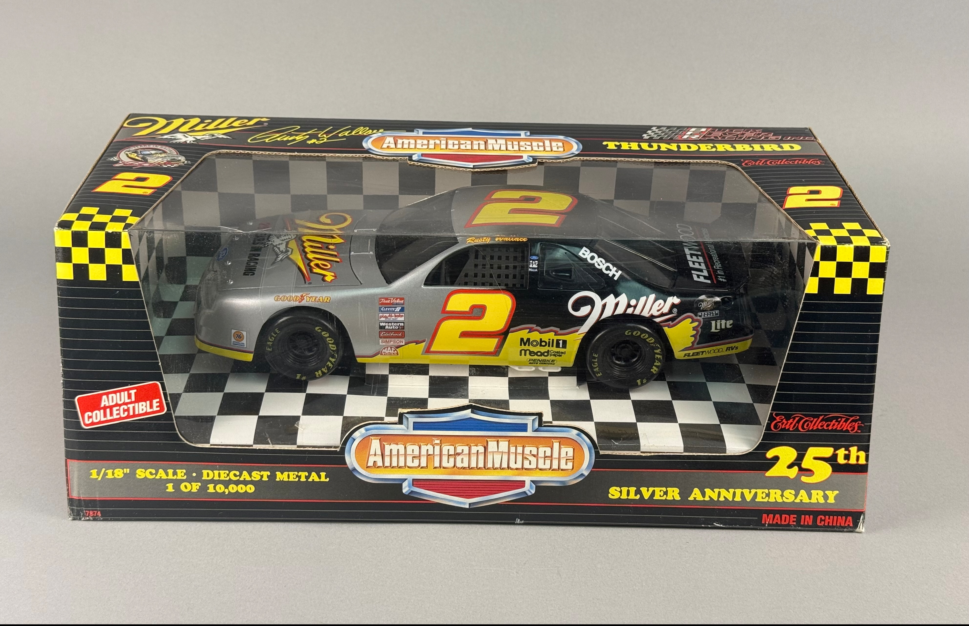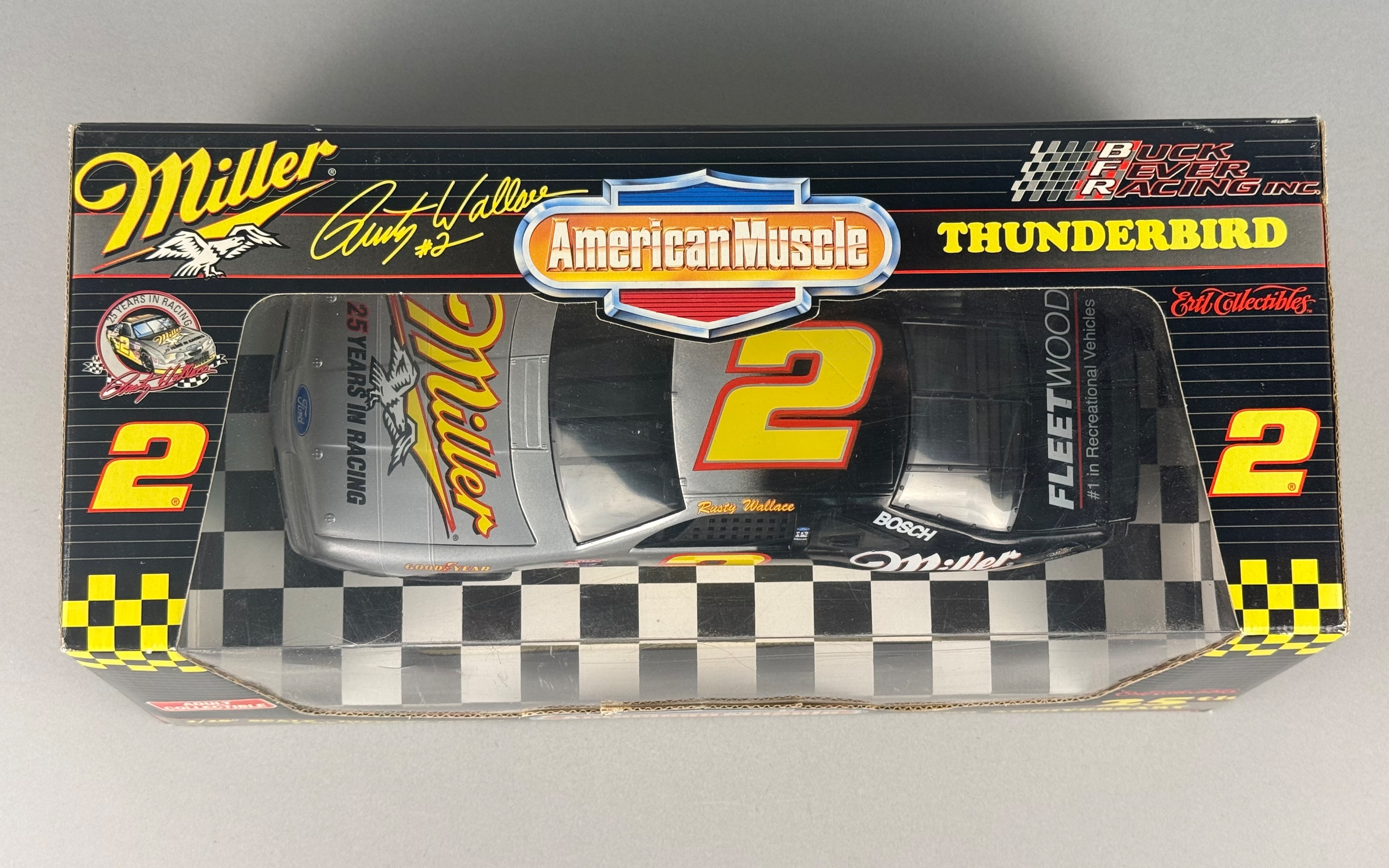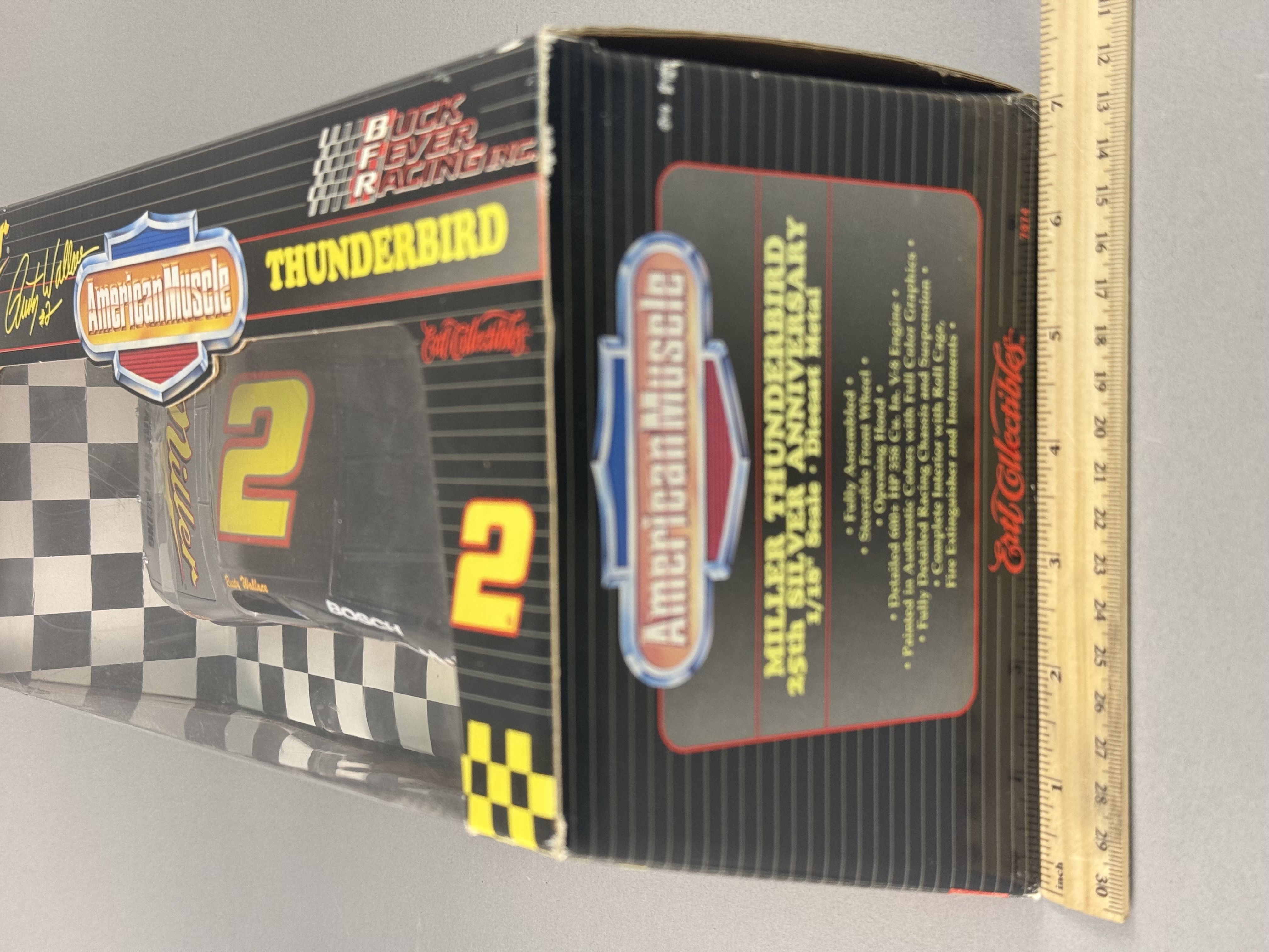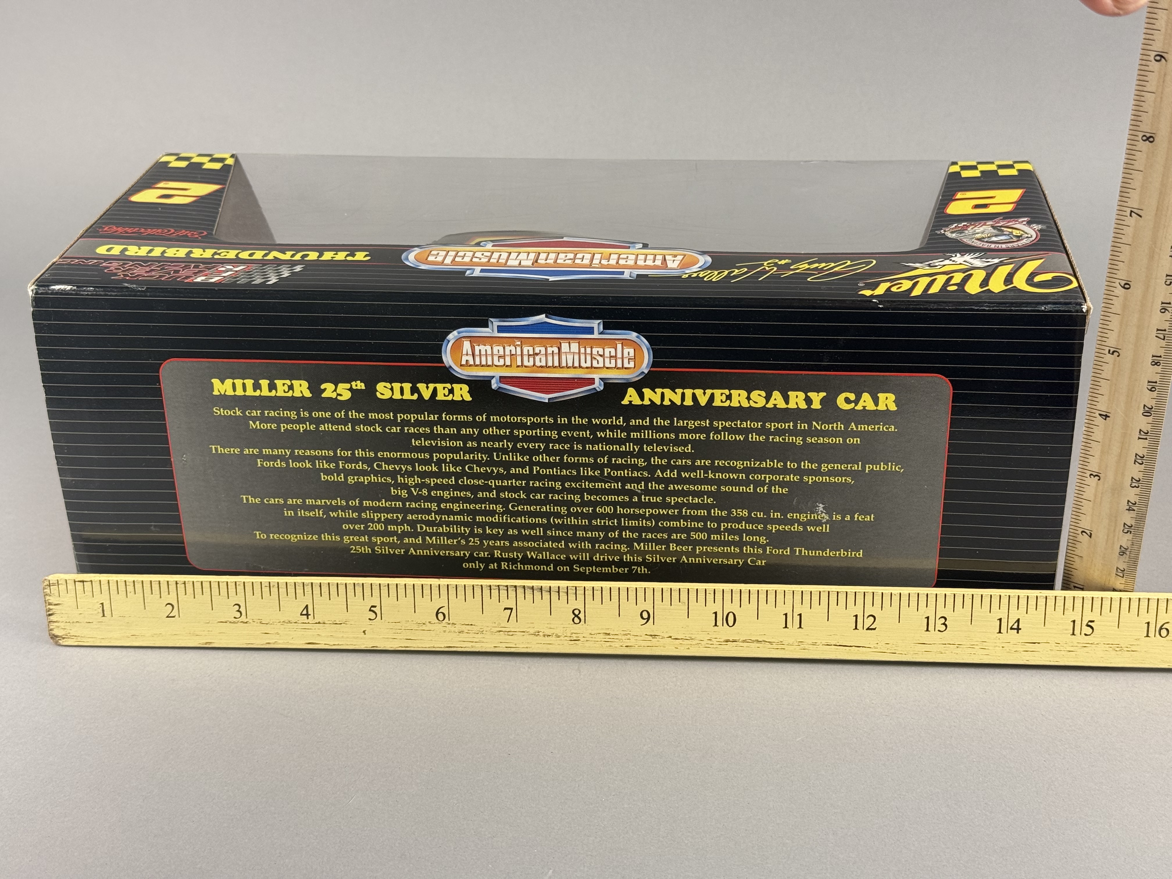 This 1/18 scale diecast metal model represents the #2 Rusty Wallace Miller 25th Silver Anniversary Ford Thunderbird, produced by Ertl Collectibles under the American Muscle brand. The vehicle features a striking silver and black livery with yellow and red accents, commissioned to celebrate Miller Beer’s twenty-five years of association with racing. The item is presented in its original window box with Buck Fever Racing Inc. branding and is identified as a limited edition of 10,000 units. The packaging includes historical context regarding the car’s performance and technical specifications.