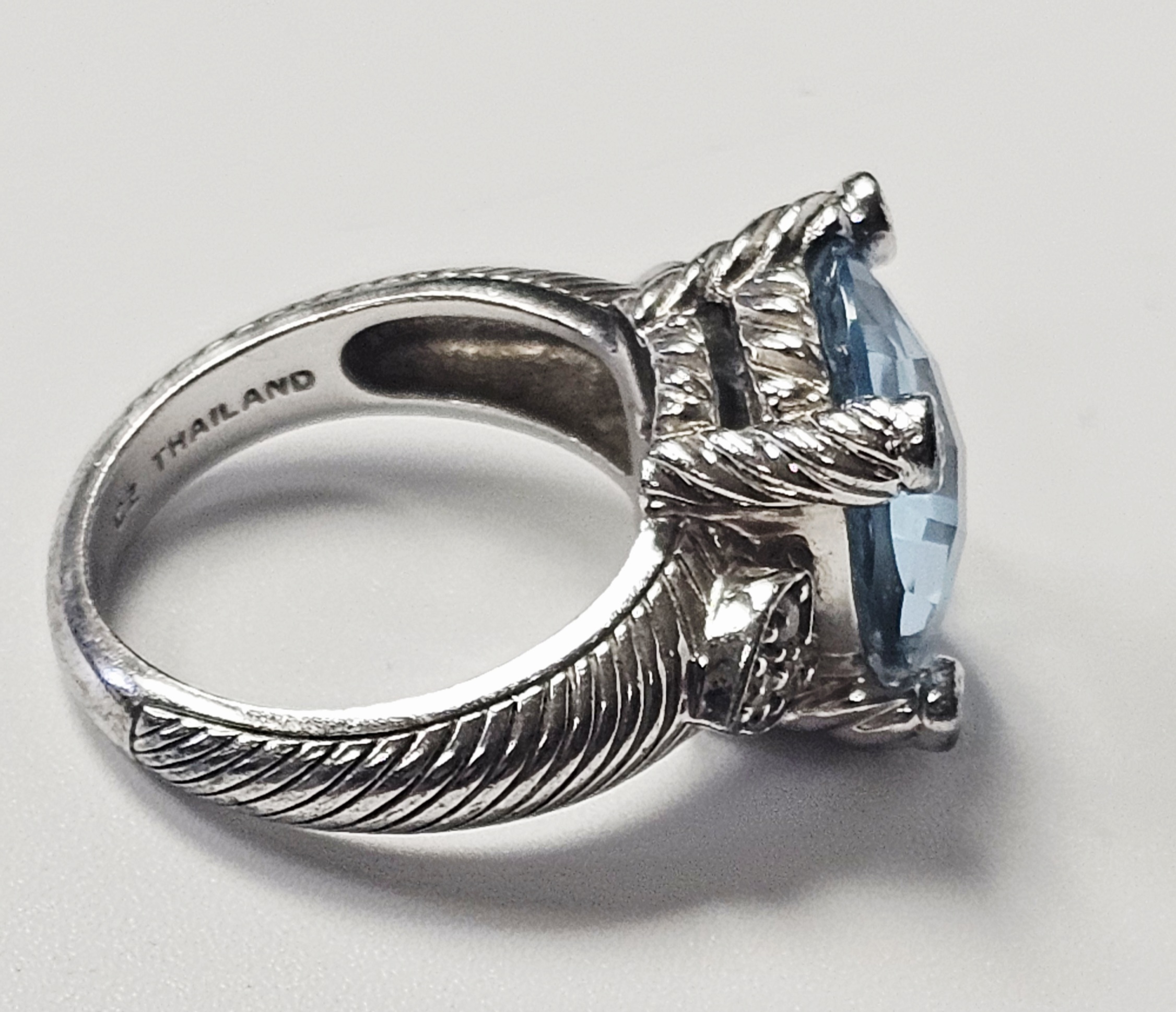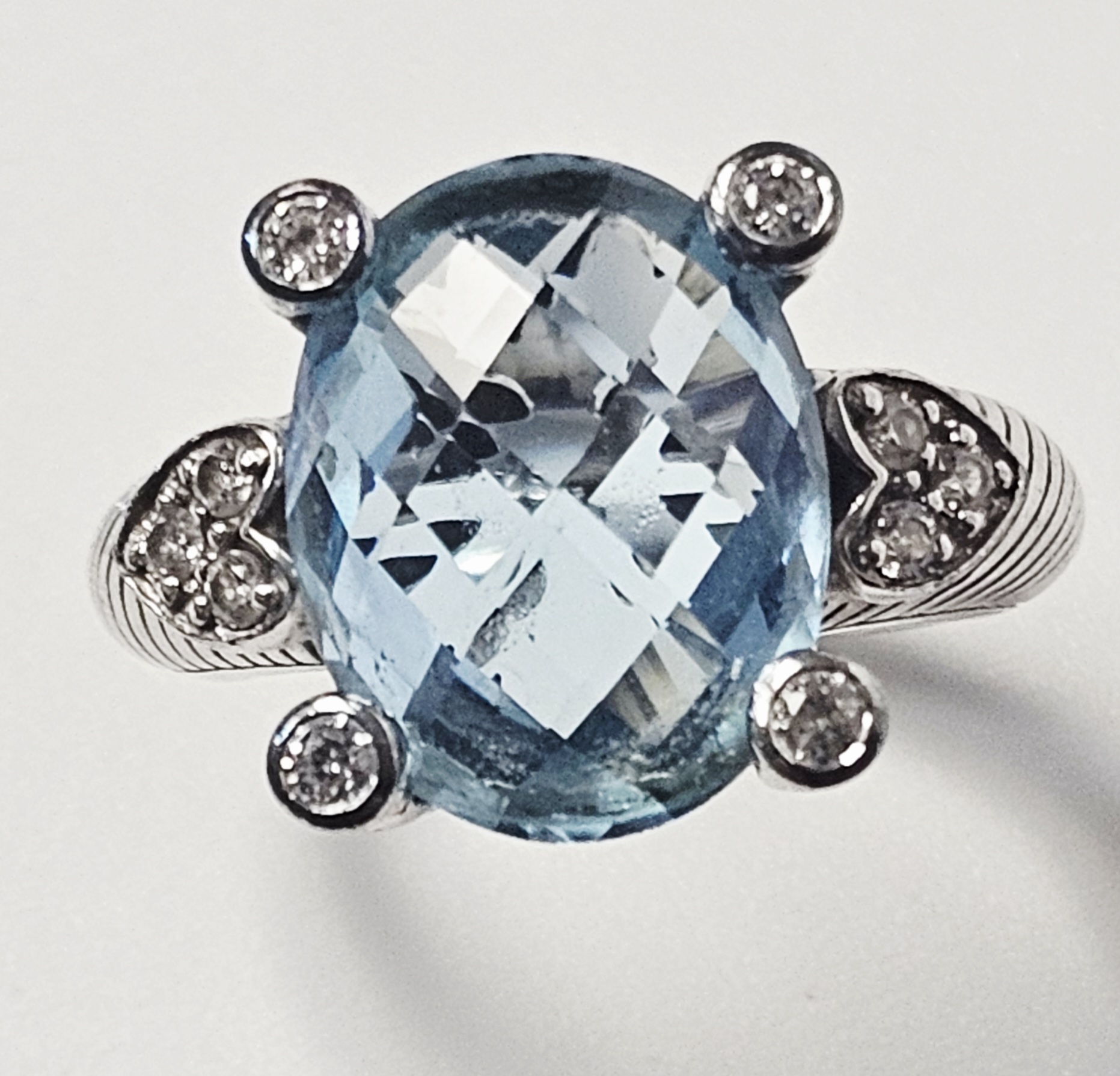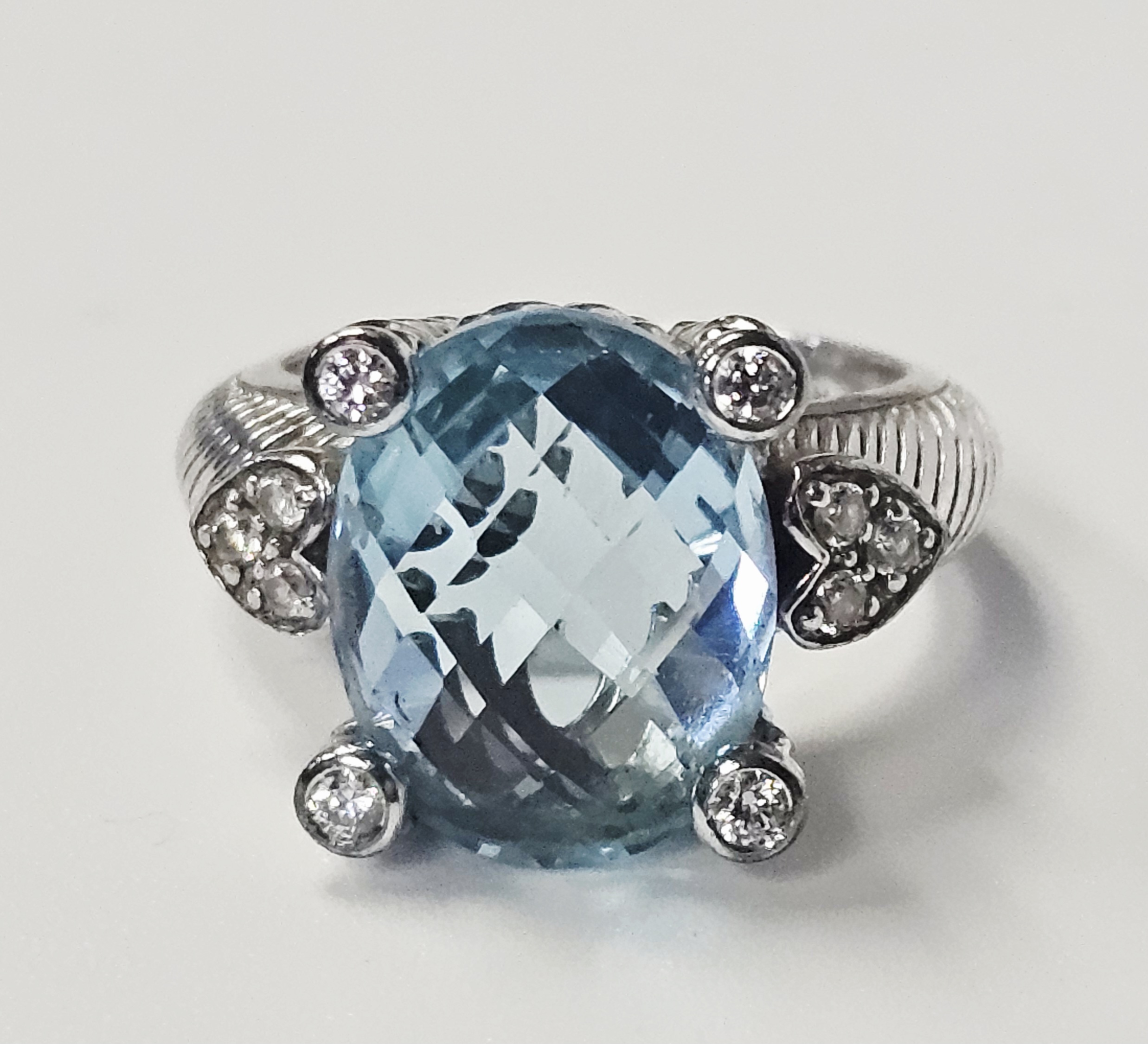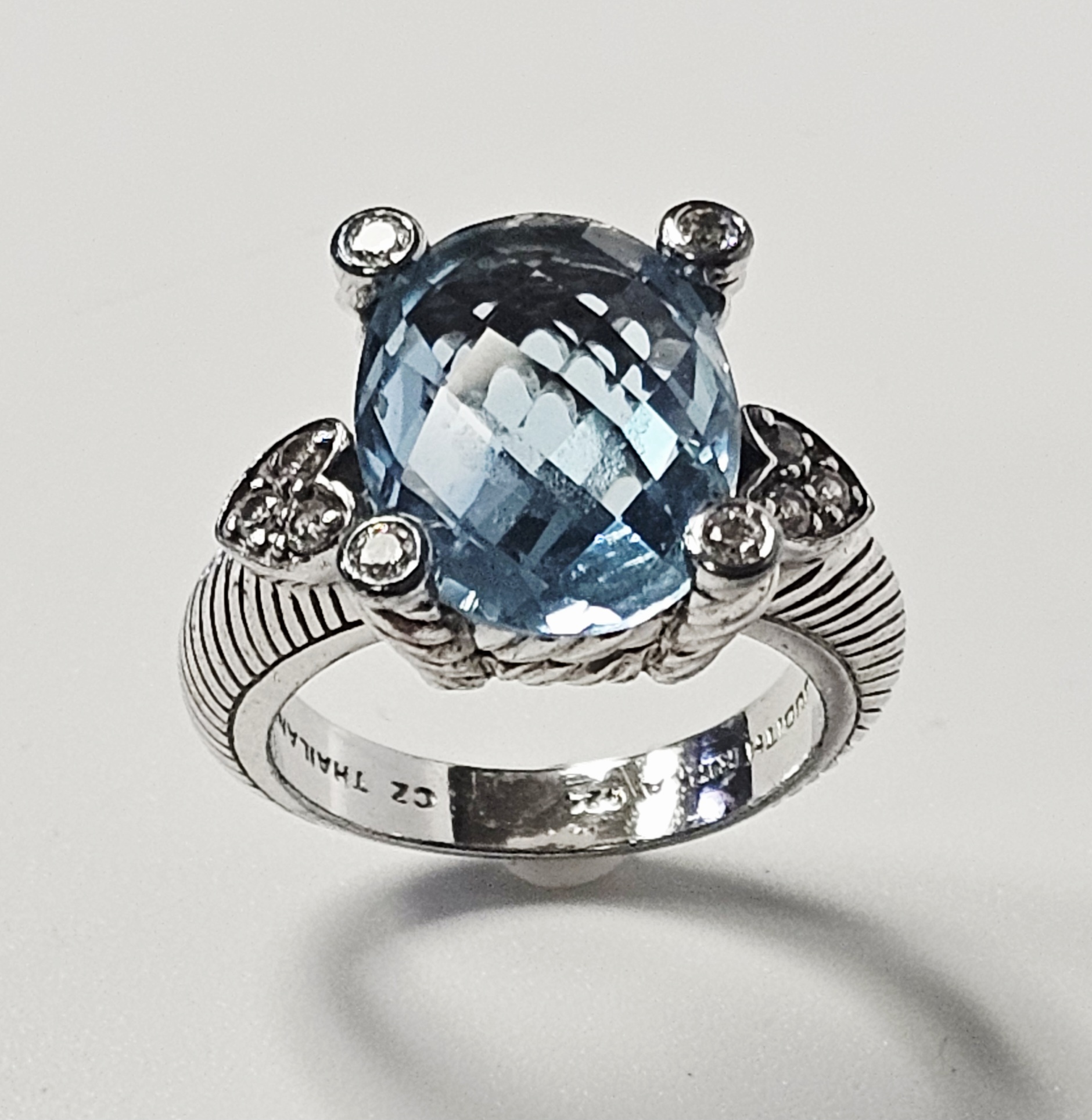 A sterling silver cocktail ring by designer Judith Ripka. The ring features a central large oval-cut light blue stone with a checkerboard-faceted crown. The center stone is secured in a four-prong setting, where each substantial prong is decorated with a twisted-rope texture and capped with a small round brilliant-cut clear cubic zirconia. The shoulders of the ring are designed with heart-shaped motifs, each set with clear cubic zirconia. The shank displays the designer’s signature textured cable or rope motif. The interior of the band is stamped with JUDITH RIPKA, 925, CZ, and THAILAND. Weight: 8.0 grams Size: US 6. The ring is in good pre-owned condition with minor surface wear and light tarnishing to the silver consistent with use. Stones appear secure in their settings.