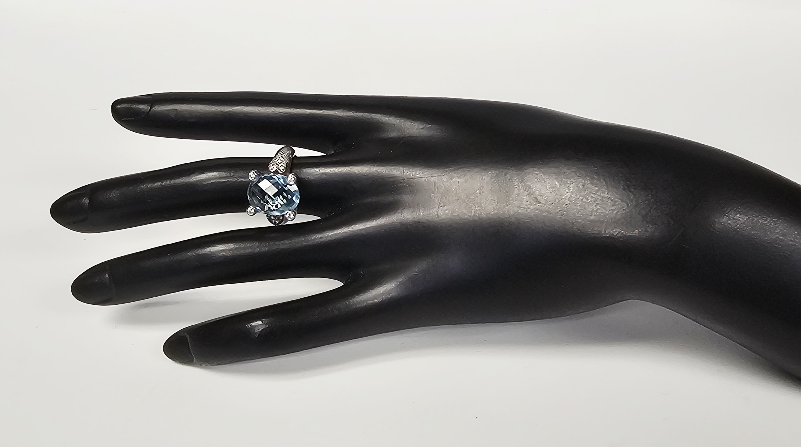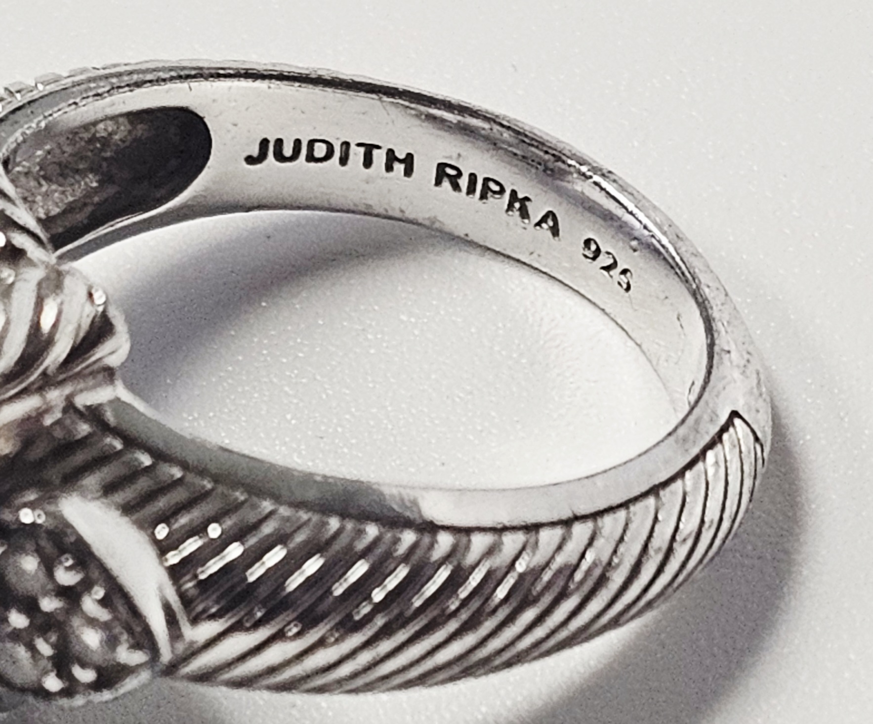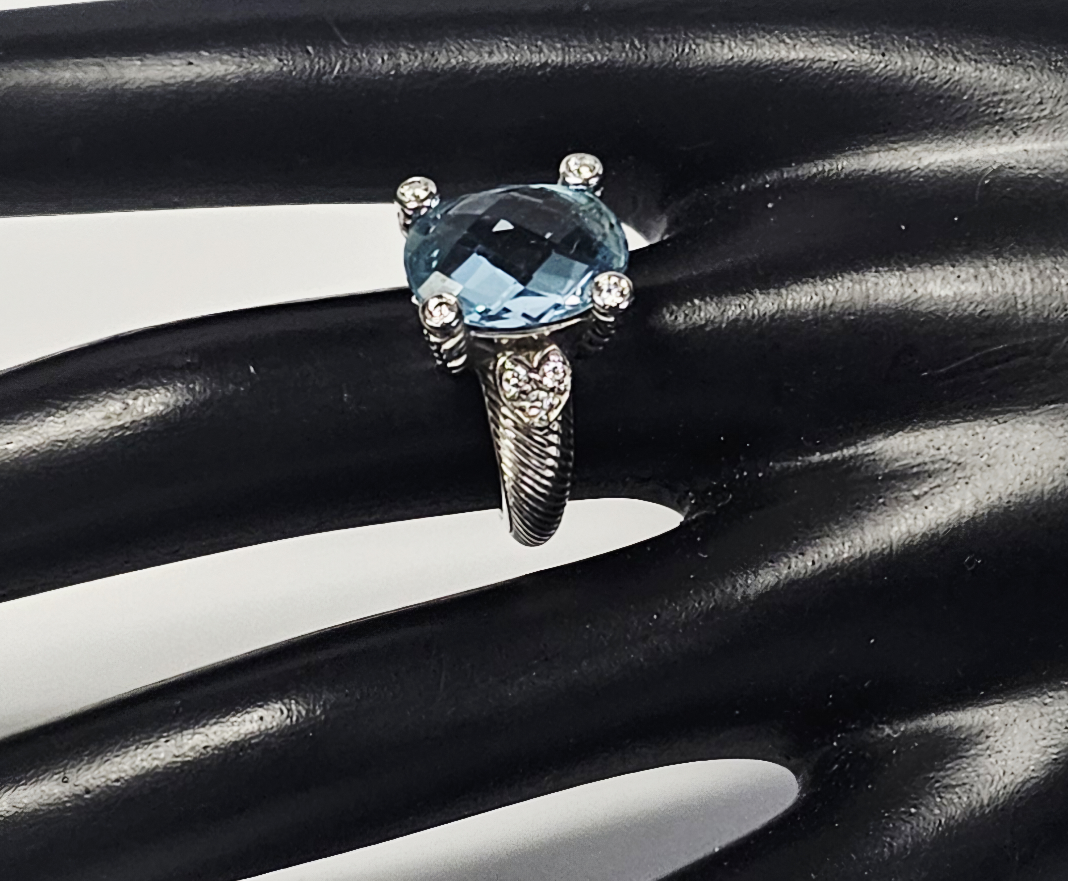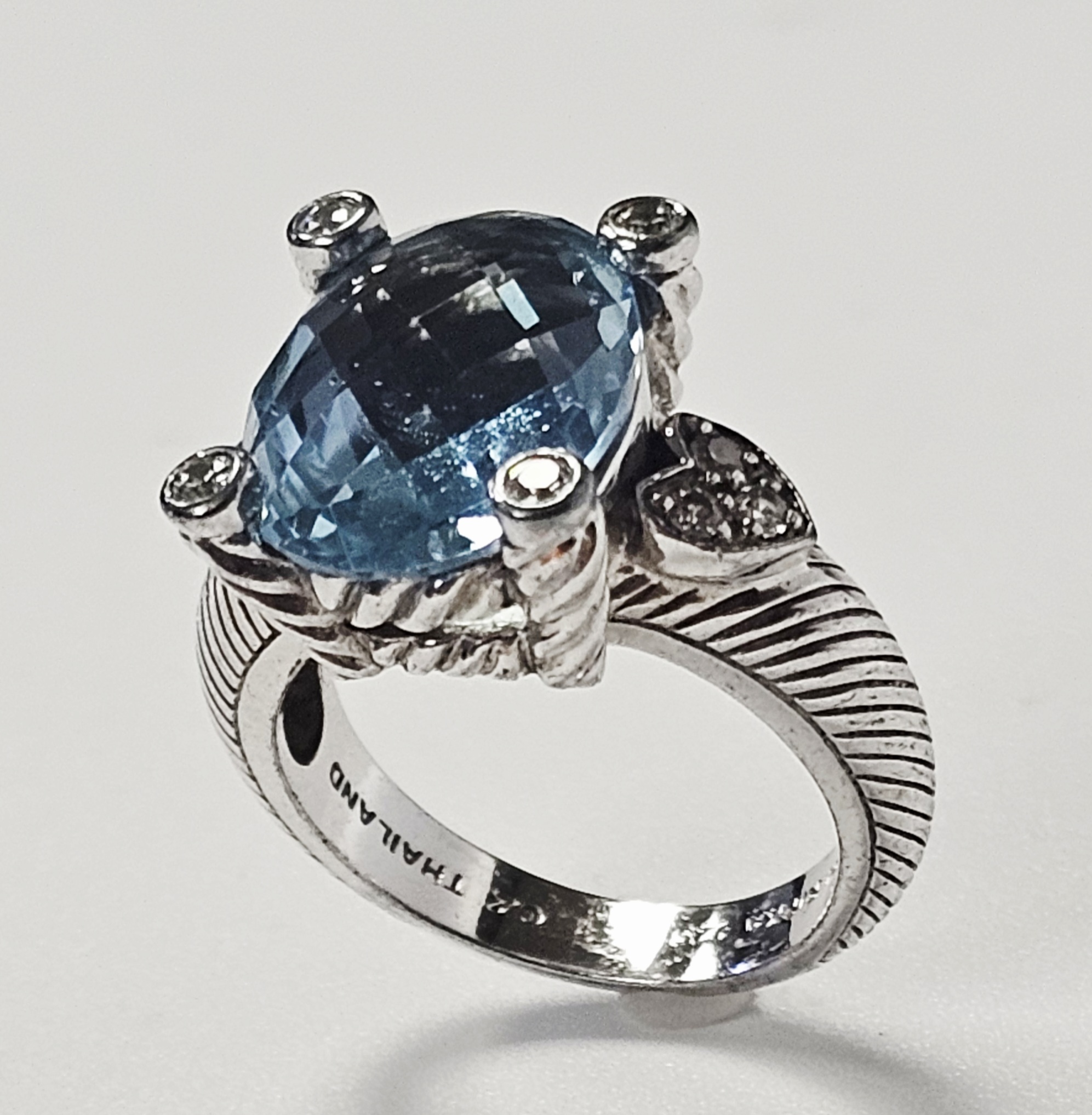 A sterling silver cocktail ring by designer Judith Ripka. The ring features a central large oval-cut light blue stone with a checkerboard-faceted crown. The center stone is secured in a four-prong setting, where each substantial prong is decorated with a twisted-rope texture and capped with a small round brilliant-cut clear cubic zirconia. The shoulders of the ring are designed with heart-shaped motifs, each set with clear cubic zirconia. The shank displays the designer’s signature textured cable or rope motif. The interior of the band is stamped with JUDITH RIPKA, 925, CZ, and THAILAND. Weight: 8.0 grams Size: US 6. The ring is in good pre-owned condition with minor surface wear and light tarnishing to the silver consistent with use. Stones appear secure in their settings.