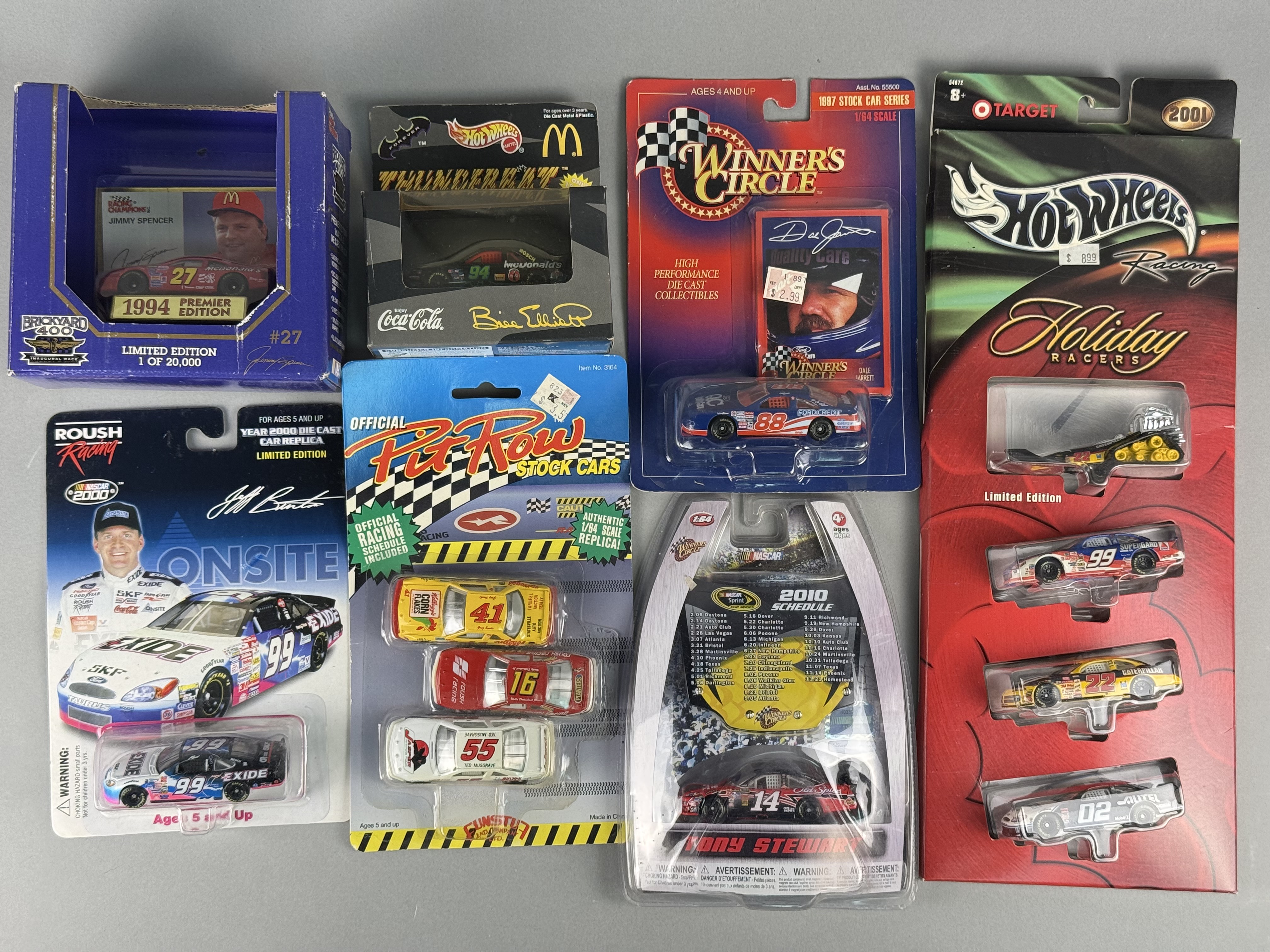 A group of seven NASCAR-themed die-cast metal stock car replicas primarily in 1/64 scale. The collection features various manufacturers including Racing Champions, Hot Wheels (Mattel), Winner’s Circle (Kenner/Hasbro), Team Caliber, and Funstuf. Highlights include a 1994 Racing Champions Premier Edition Jimmy Spencer #27 McDonald’s Ford, produced as a limited edition of 20,000 for the Brickyard 400 Inaugural Race. Also included is a Hot Wheels Bill Elliott #94 “Thunderbat” McDonald’s and Batman Forever crossover vehicle. The set features a 1997 Winner’s Circle Dale Jarrett #88 Ford Credit Ford and a 2010 Winner’s Circle Tony Stewart #14 Old Spice Chevrolet Impala with a printed race schedule. Multi-car sets include a 2001 Hot Wheels Racing “Holiday Racers” Target Exclusive 4-car pack and a Funstuf Pit Row 3-car pack featuring Kellogg’s Corn Flakes, Roush Racing, and Jasper liveries. Rounding out the collection is a Team Caliber Jeff Burton #99 Exide Onsite Ford Taurus. All vehicles are housed in their original manufacturer window boxes or blister card packaging.