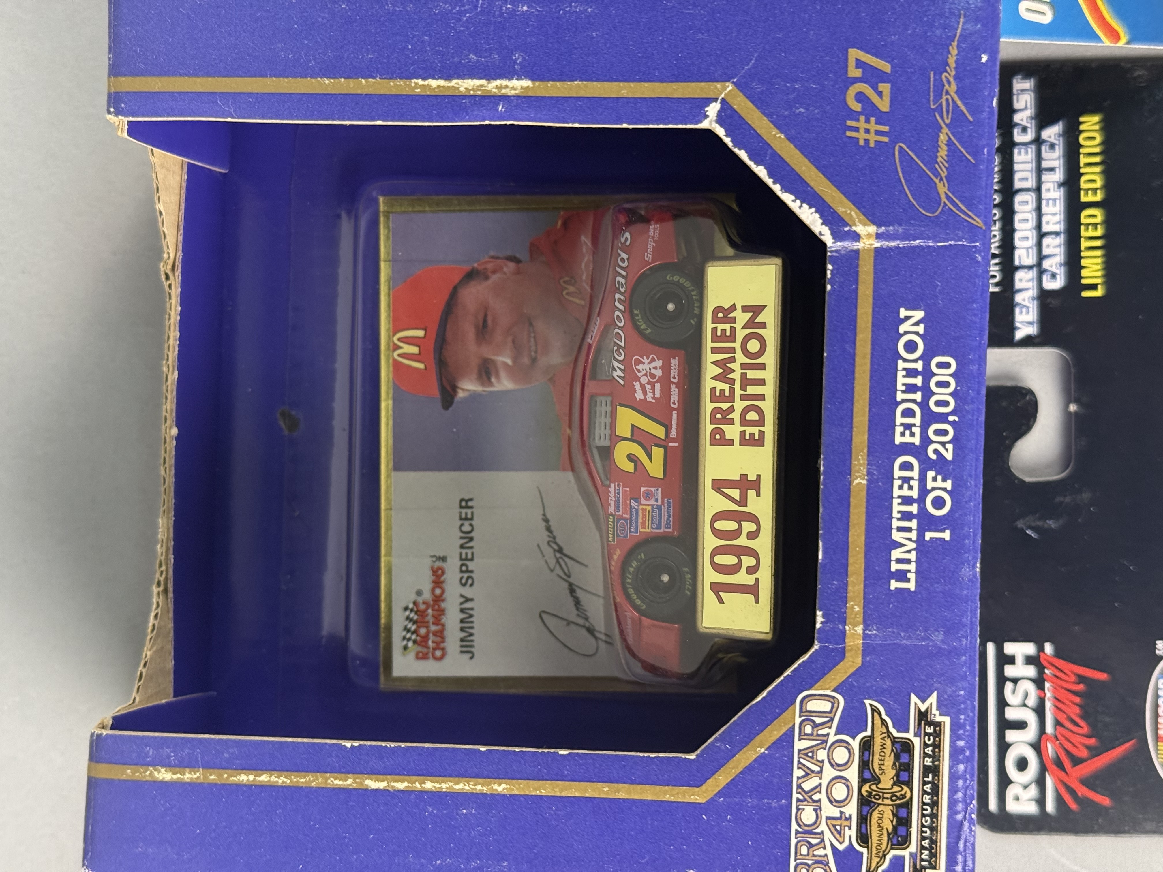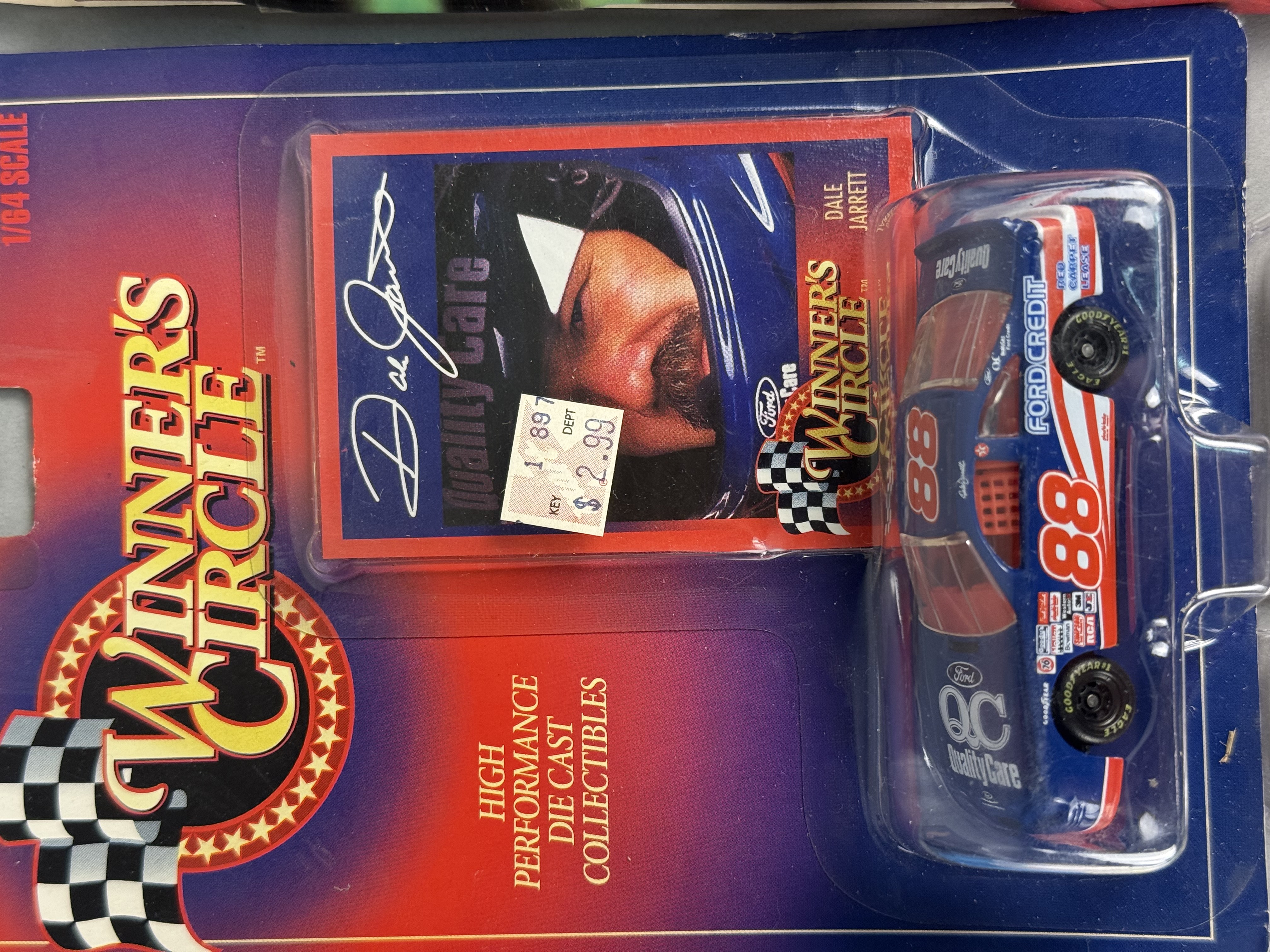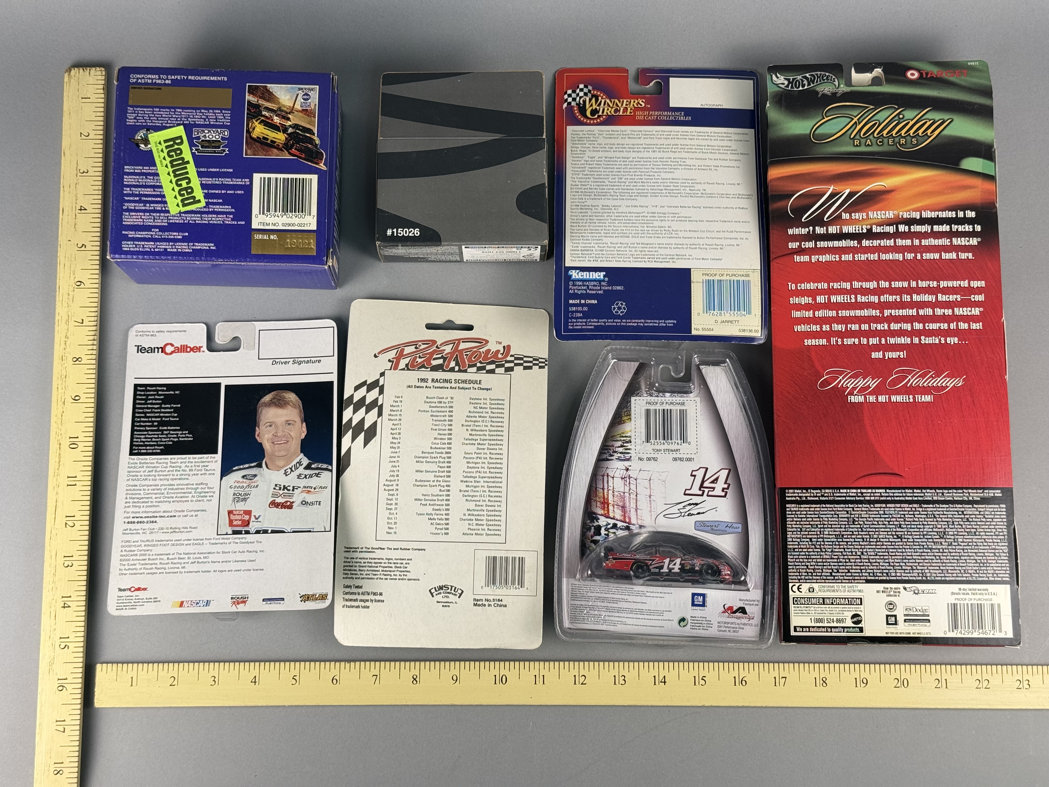 All items are in new, unopened condition within their original retail packaging. The Racing Champions box exhibits light edge wear and a “Reduced” sticker on the reverse. The Winner’s Circle Dale Jarrett blister card retains a retail price sticker. General shelf wear is present across the collection, including minor softening of card corners and light scuffing to plastic blisters, though all remain intact and clear. Paint finishes on the die-cast vehicles appear factory-fresh.
