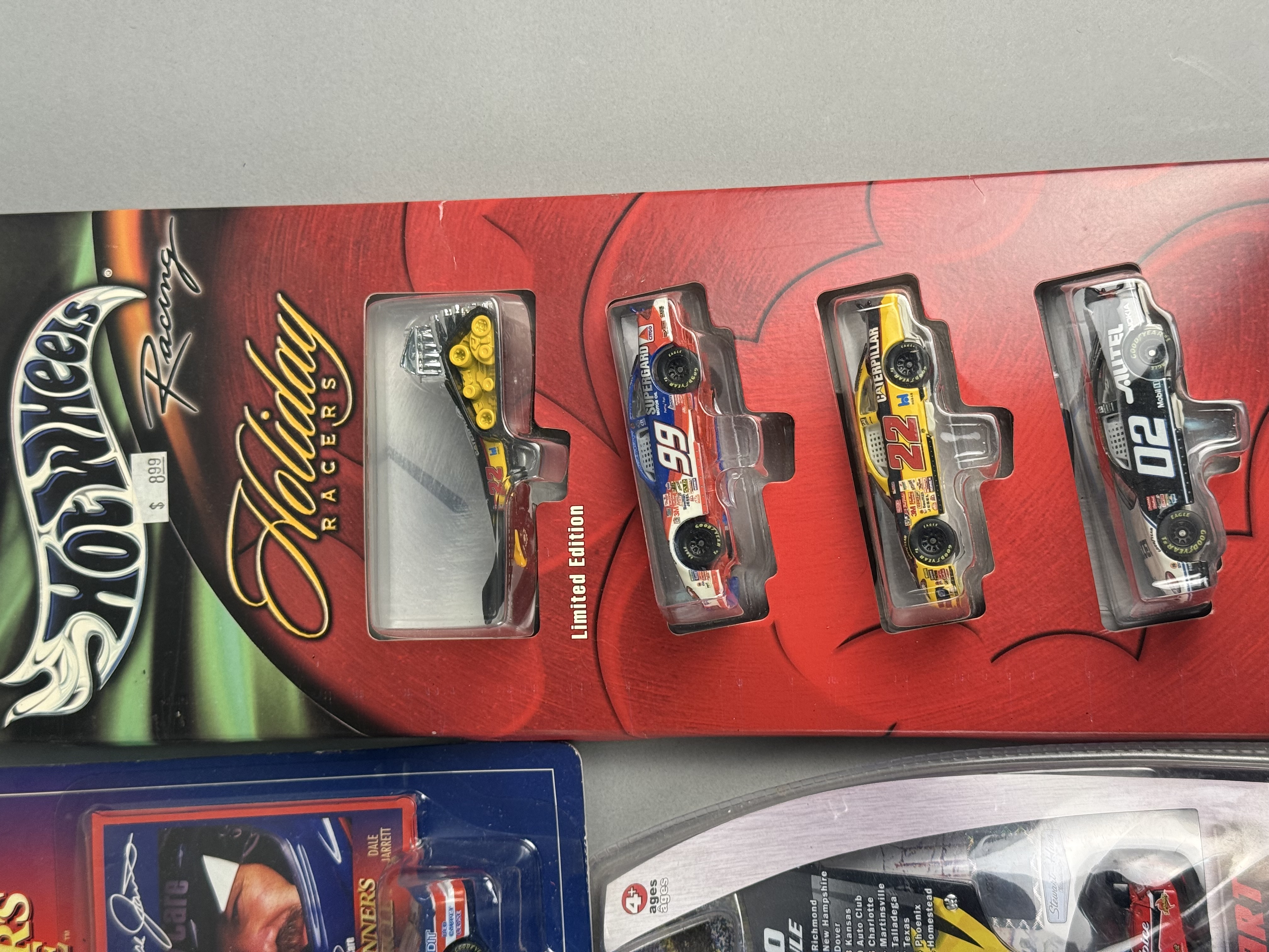 All items are in new, unopened condition within their original retail packaging. The Racing Champions box exhibits light edge wear and a \"Reduced\" sticker on the reverse. The Winner\'s Circle Dale Jarrett blister card retains a retail price sticker. General shelf wear is present across the collection, including minor softening of card corners and light scuffing to plastic blisters, though all remain intact and clear. Paint finishes on the die-cast vehicles appear factory-fresh.