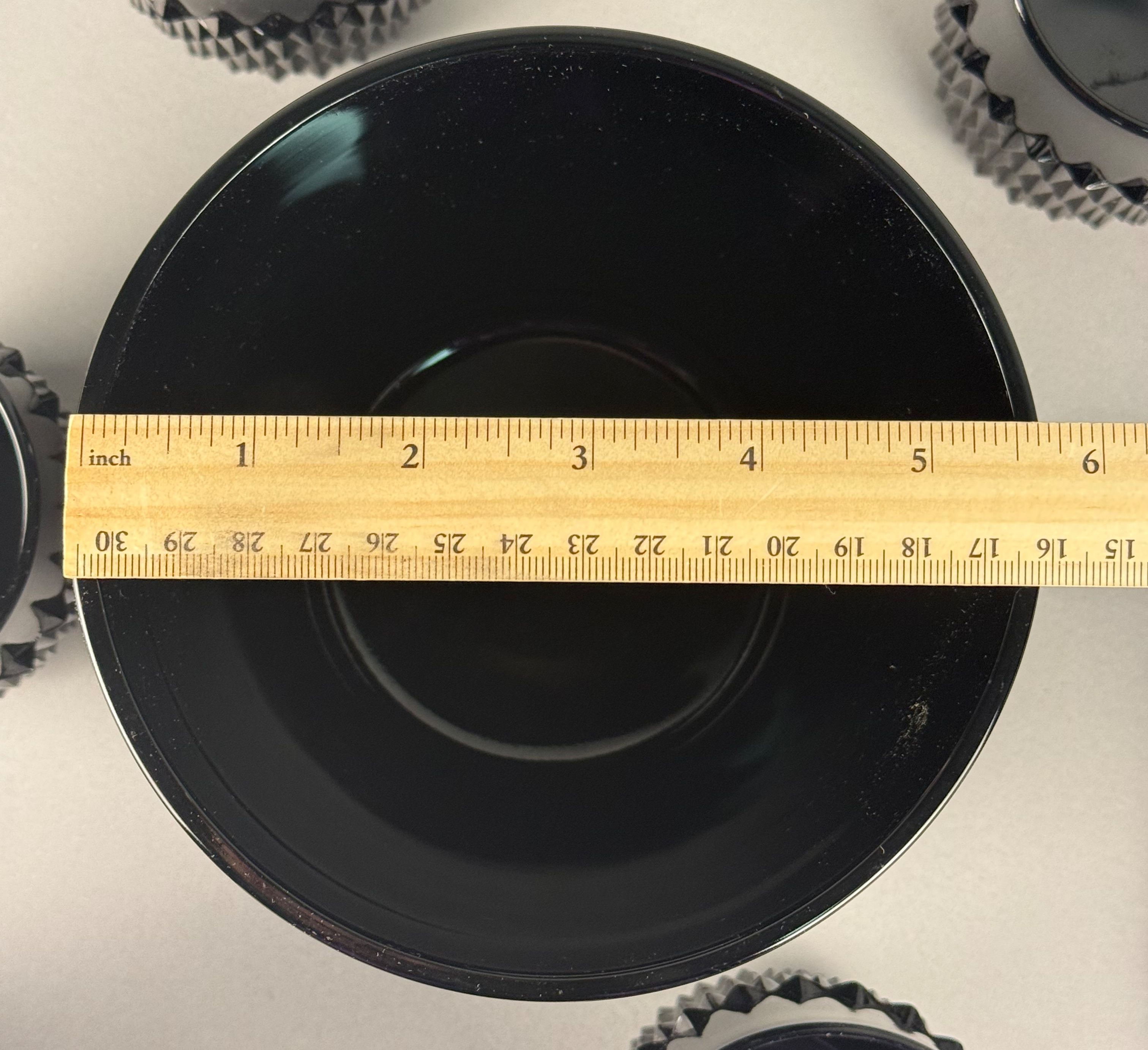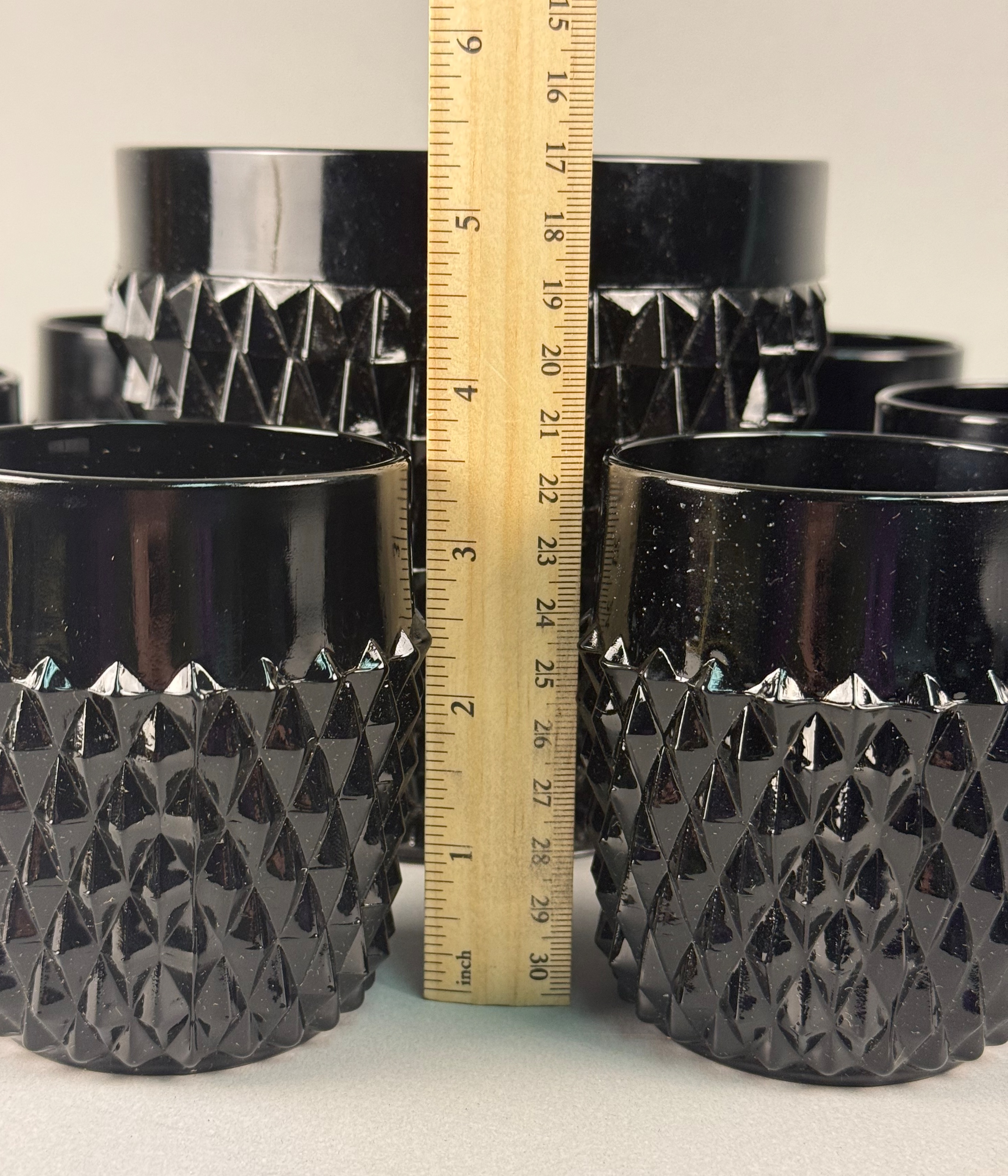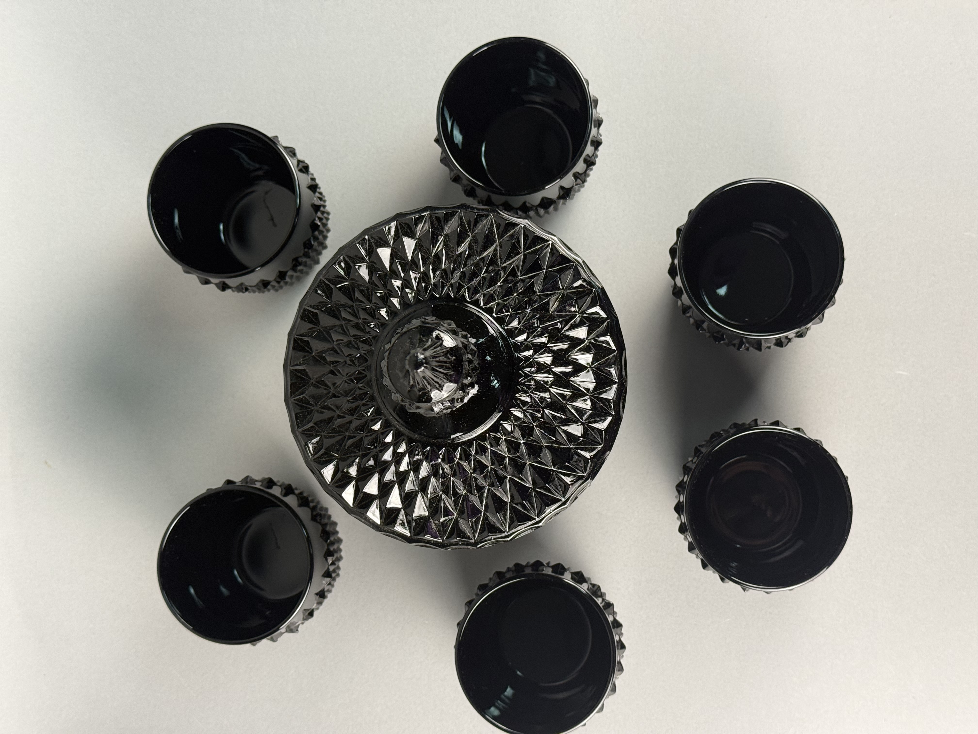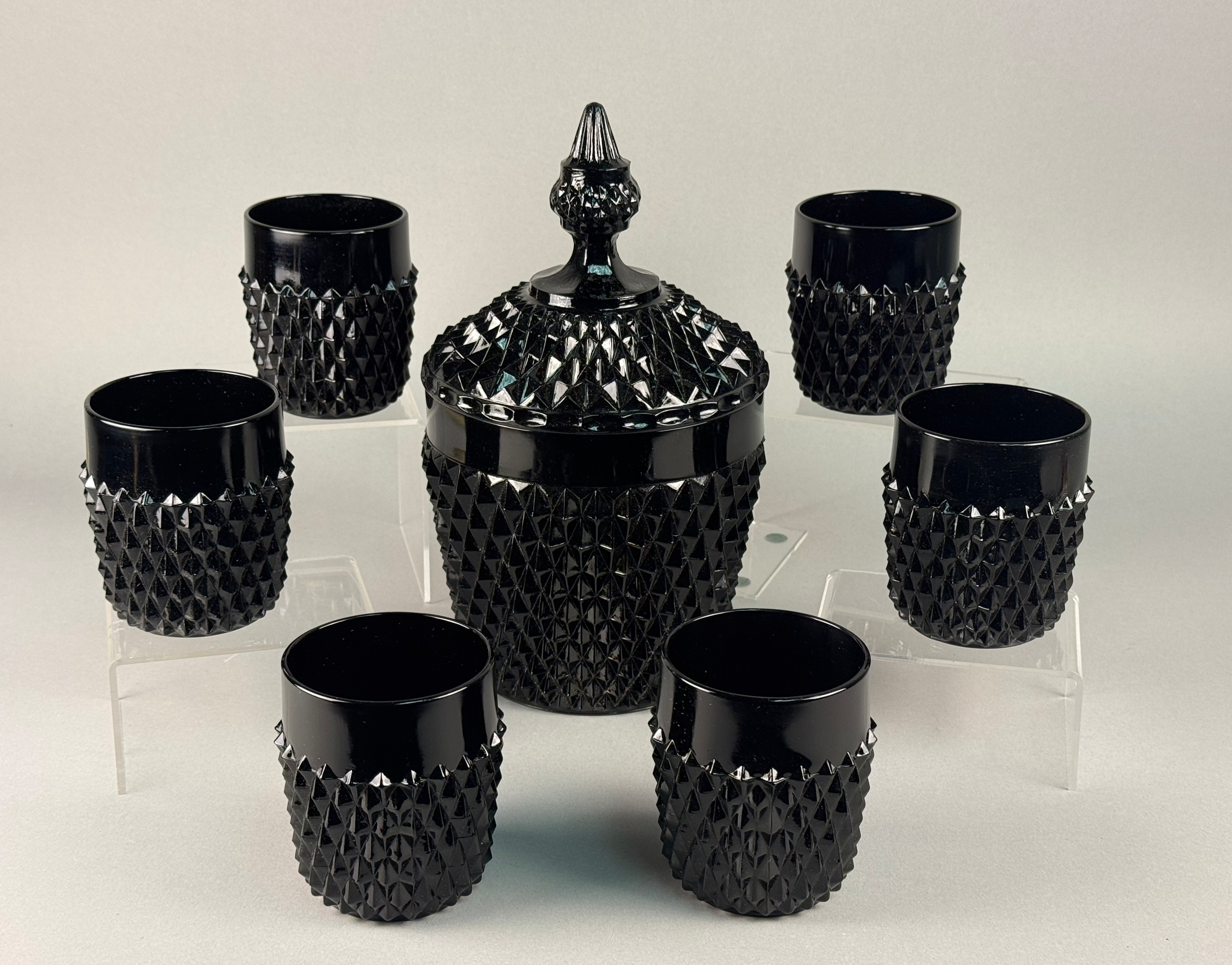 A seven-piece beverage service set manufactured by Indiana Glass for the Tiara Exclusives home-party plan company of Dunkirk, Indiana. This set is crafted in “black amethyst” glass, a style of pressed glass that appears opaque black but reveals a deep purple translucence when held to a direct light source. The pieces feature the “Diamond Point” pattern, also known within the Tiara “Cameo” line, which is defined by a dense, geometric hobnail texture on the lower three-quarters of the body and a smooth, high-gloss band at the rim. The set includes one lidded vessel, suitable for use as an ice bucket or biscuit jar, featuring a matching textured lid and a faceted finial, along with six coordinating lowball-style tumblers. This collection is a quintessential example of mid-to-late 20th-century American decorative glassware. The set is accompanied by its original distributor box.