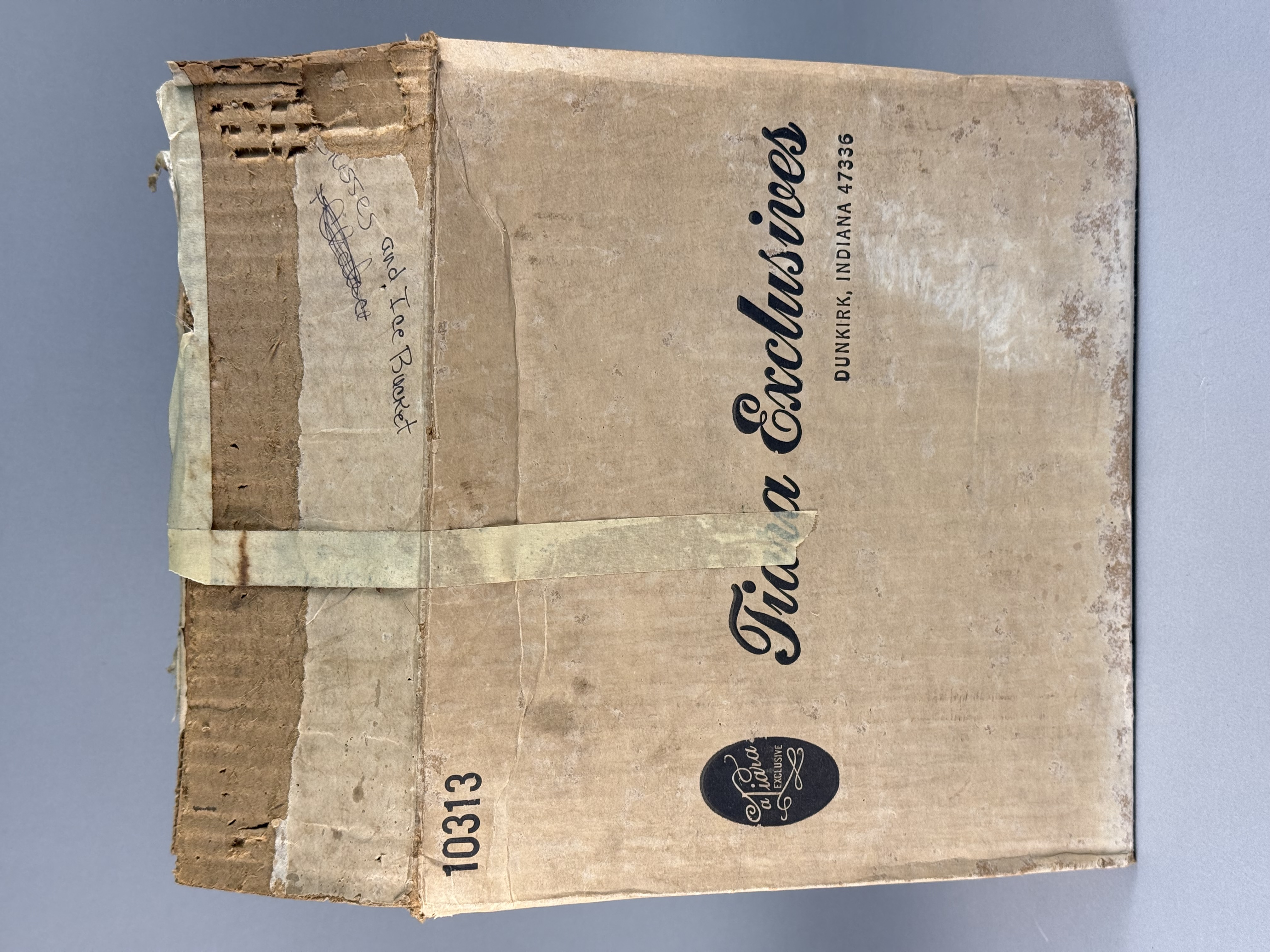 The glass pieces are in excellent condition with no visible chips, cracks, or internal cloudiness. The original cardboard storage box is in poor condition, showing significant structural wear, staining, tears, and residue from old adhesive tape.