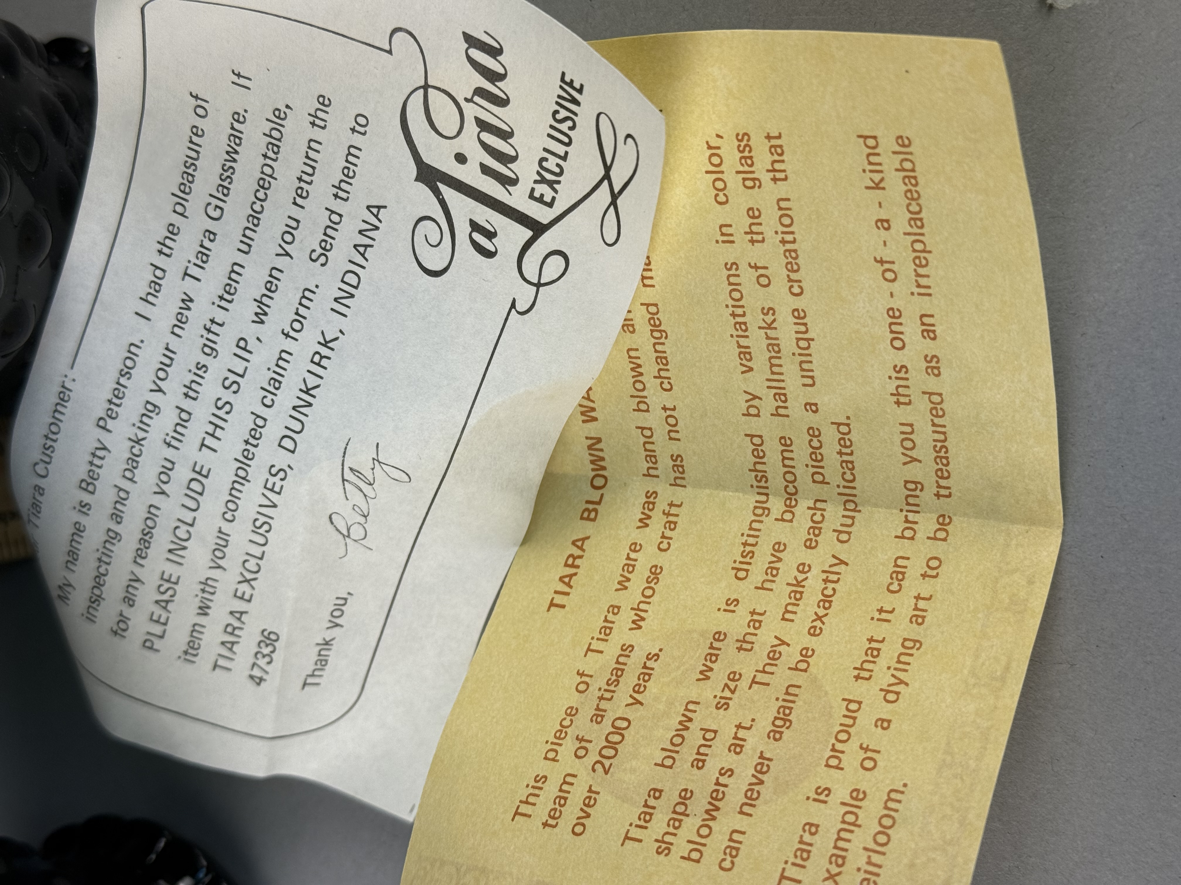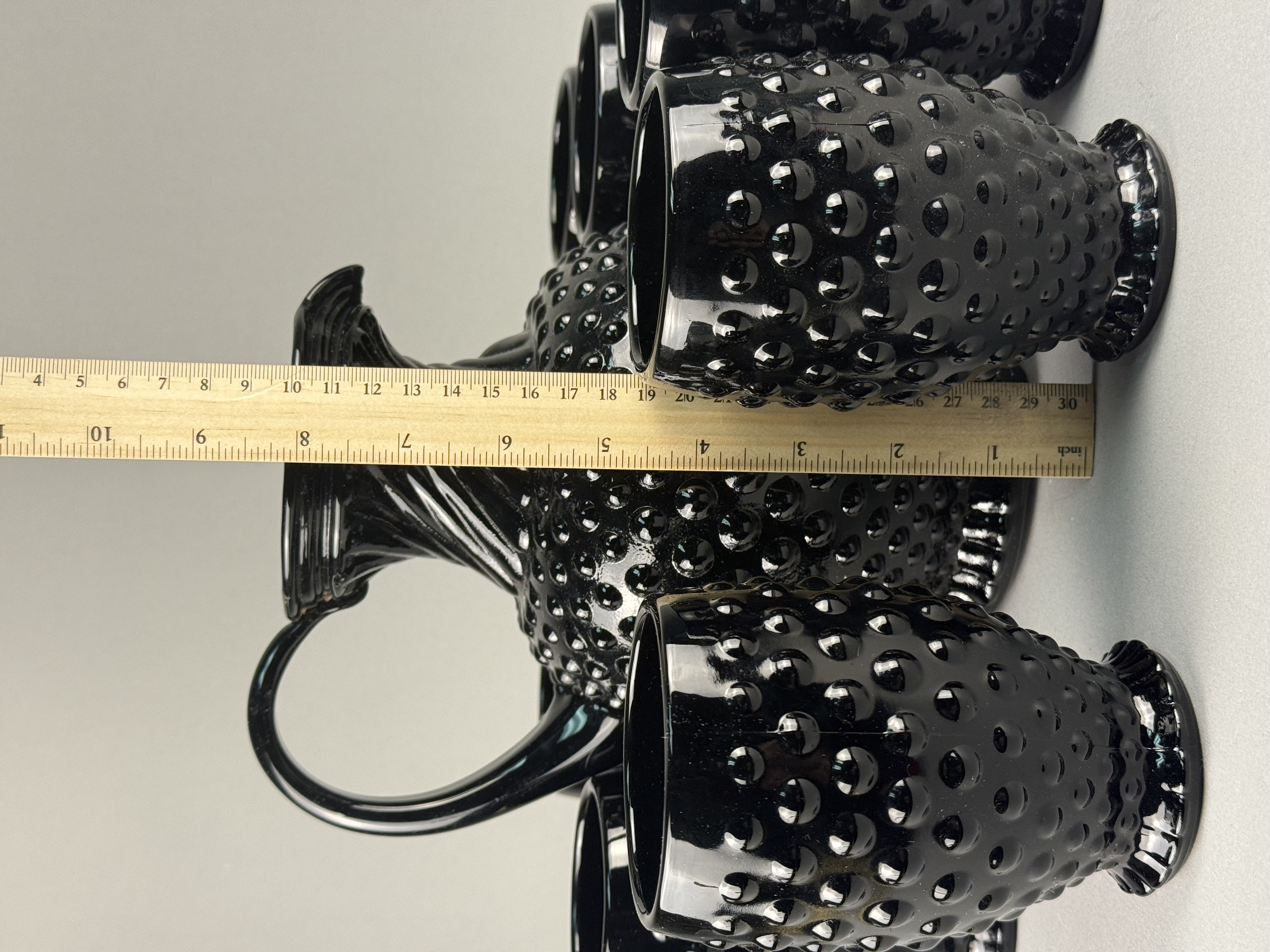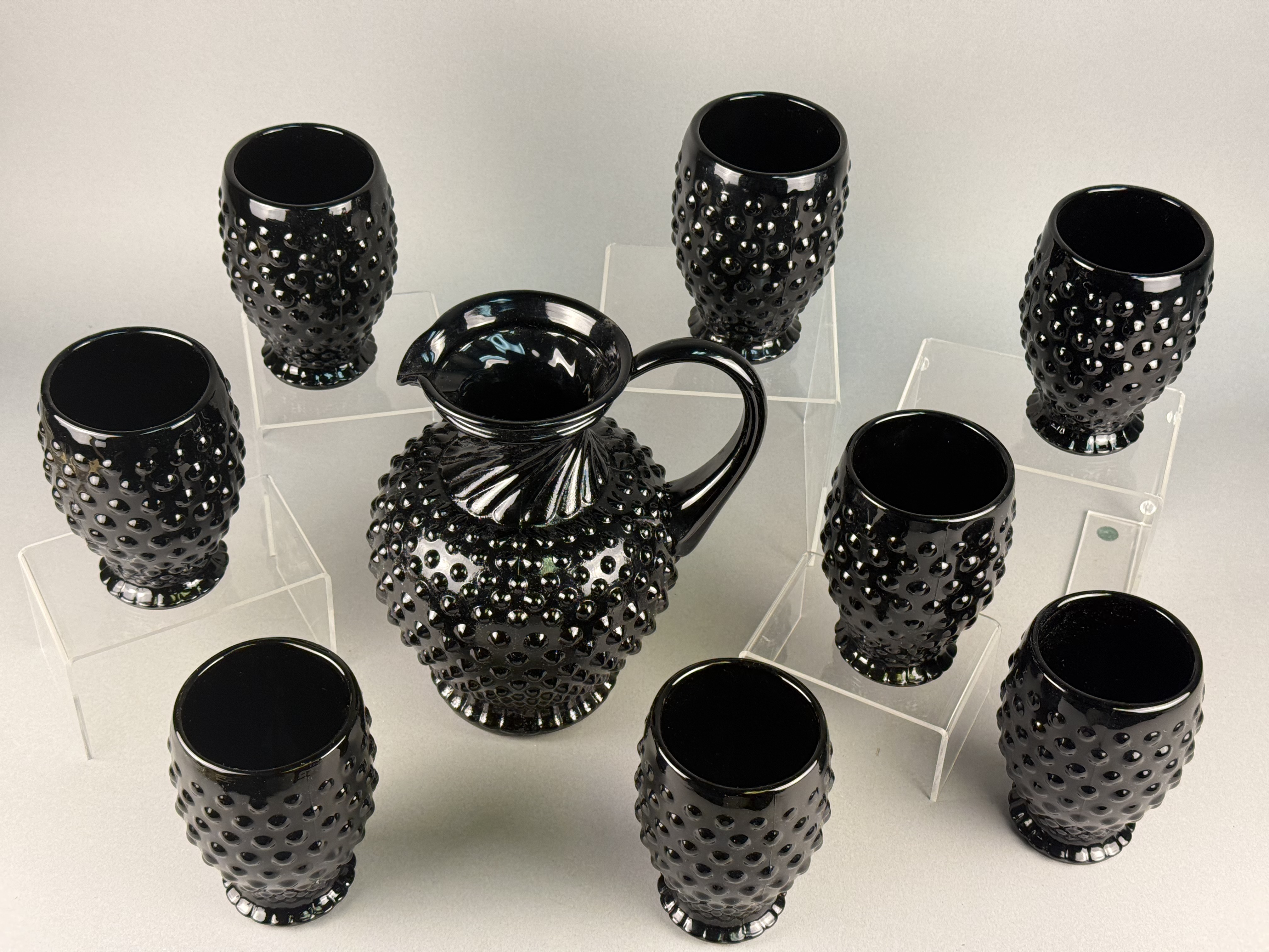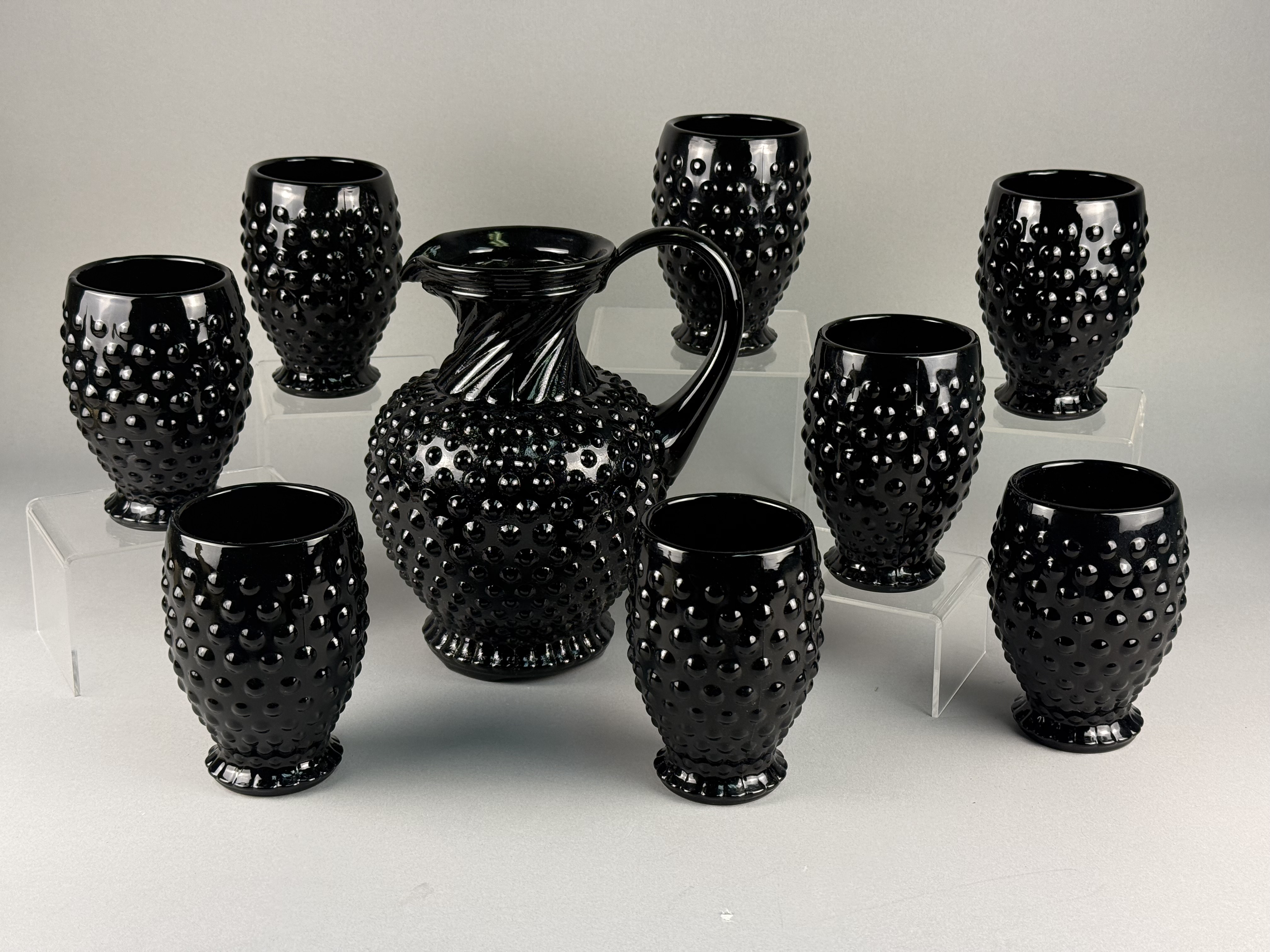 This set of black glass beverage ware is produced by Tiara Exclusives of Dunkirk, Indiana, in the hobnail pattern. The collection includes a pitcher and multiple footed tumblers. The pitcher features a flared rim, a swirled or diagonally ribbed neck, and a single applied handle. The tumblers are designed with a tapering body and a small flared foot. Included with the set is original ephemera, consisting of a packing slip and a descriptive card, which identifies the items as hand-blown glass. The glass is an opaque black color.
