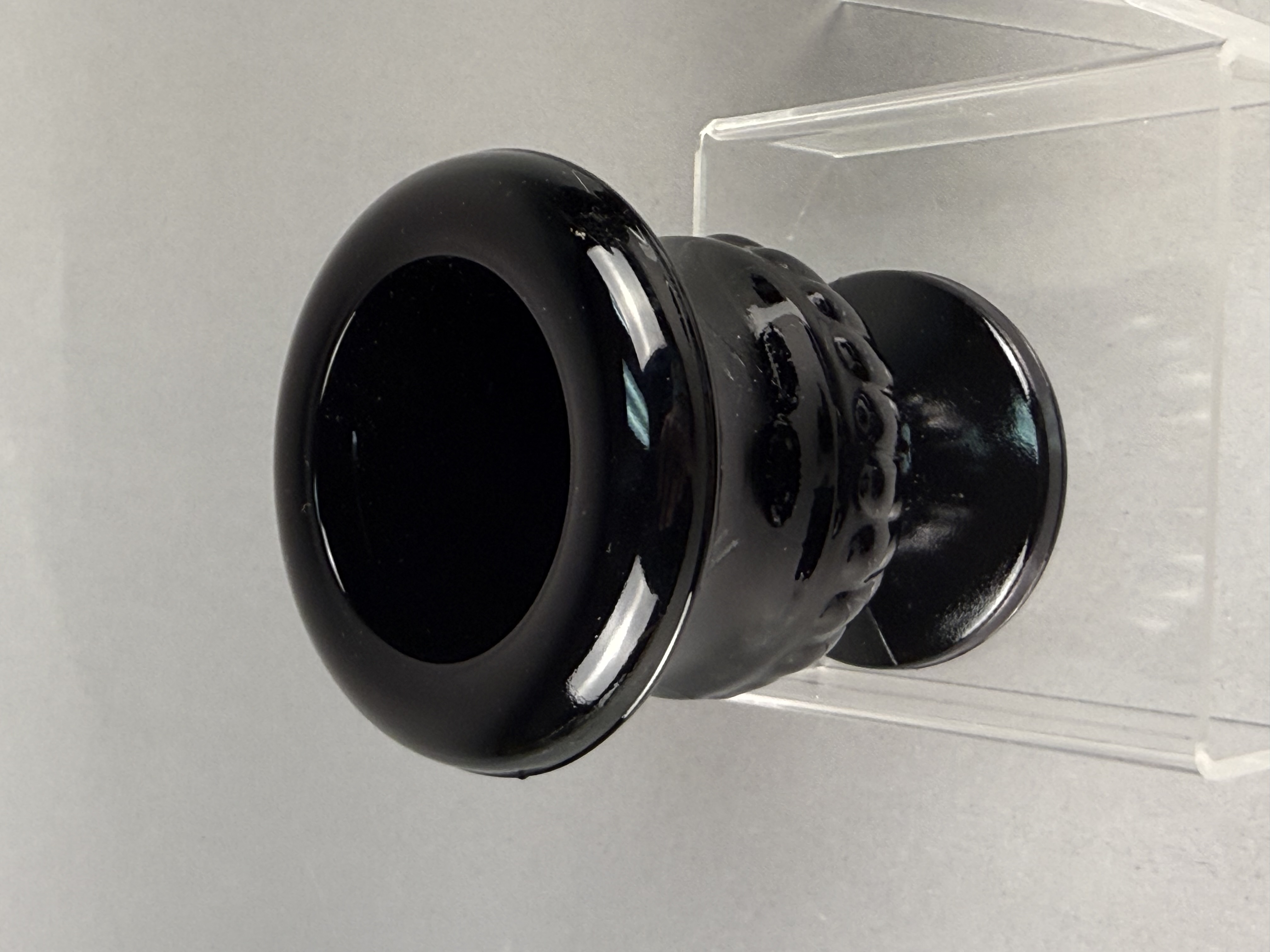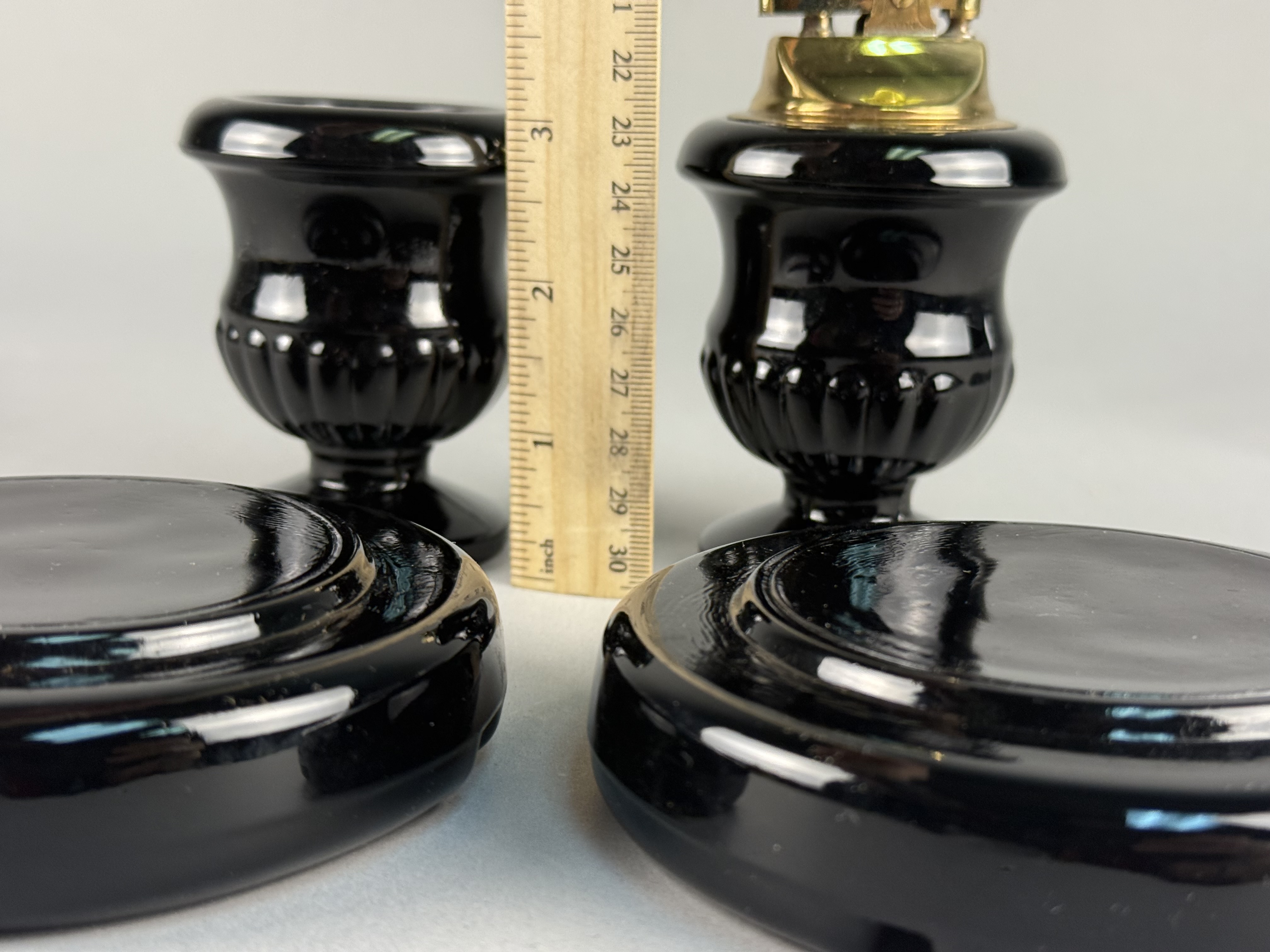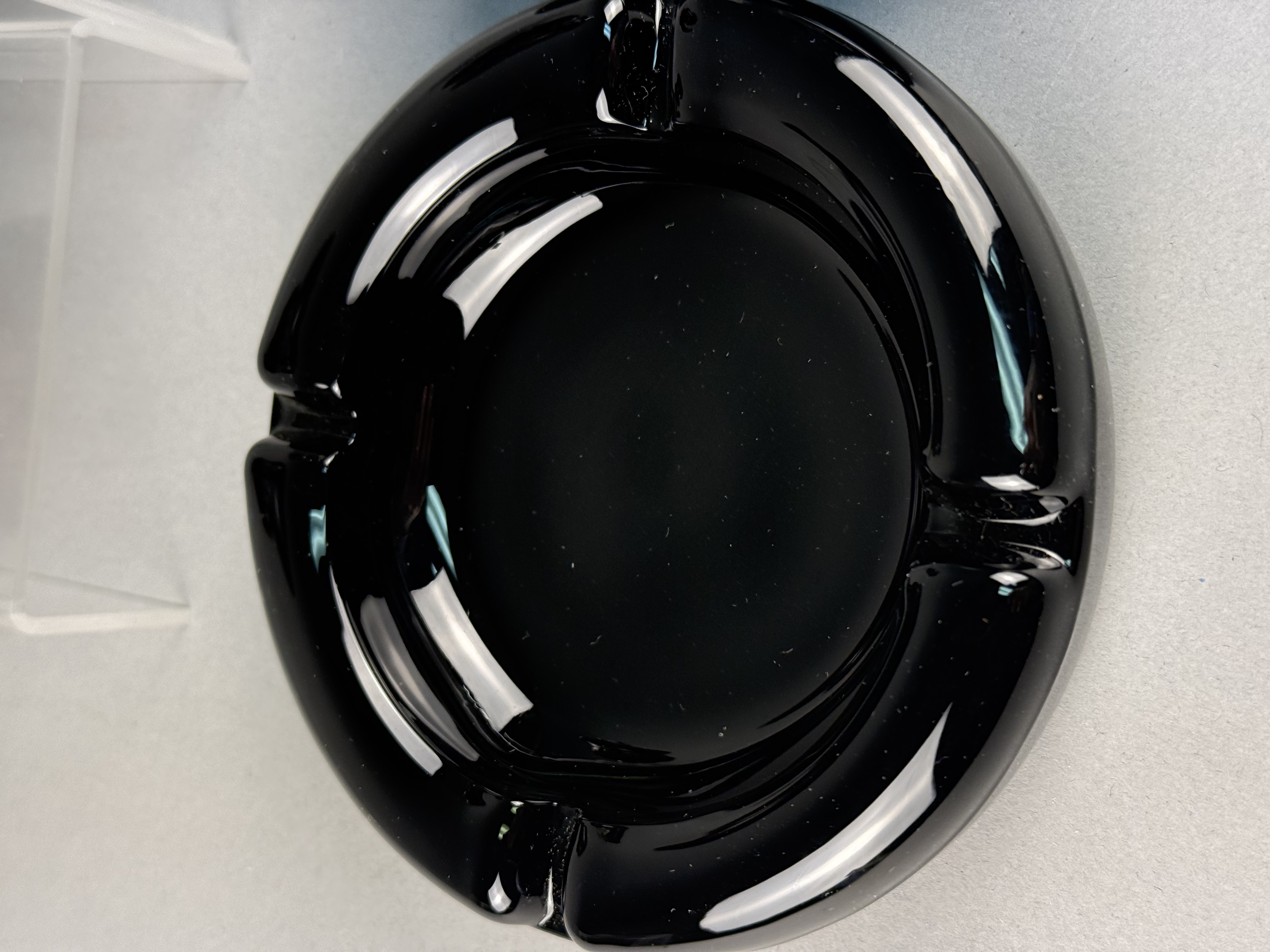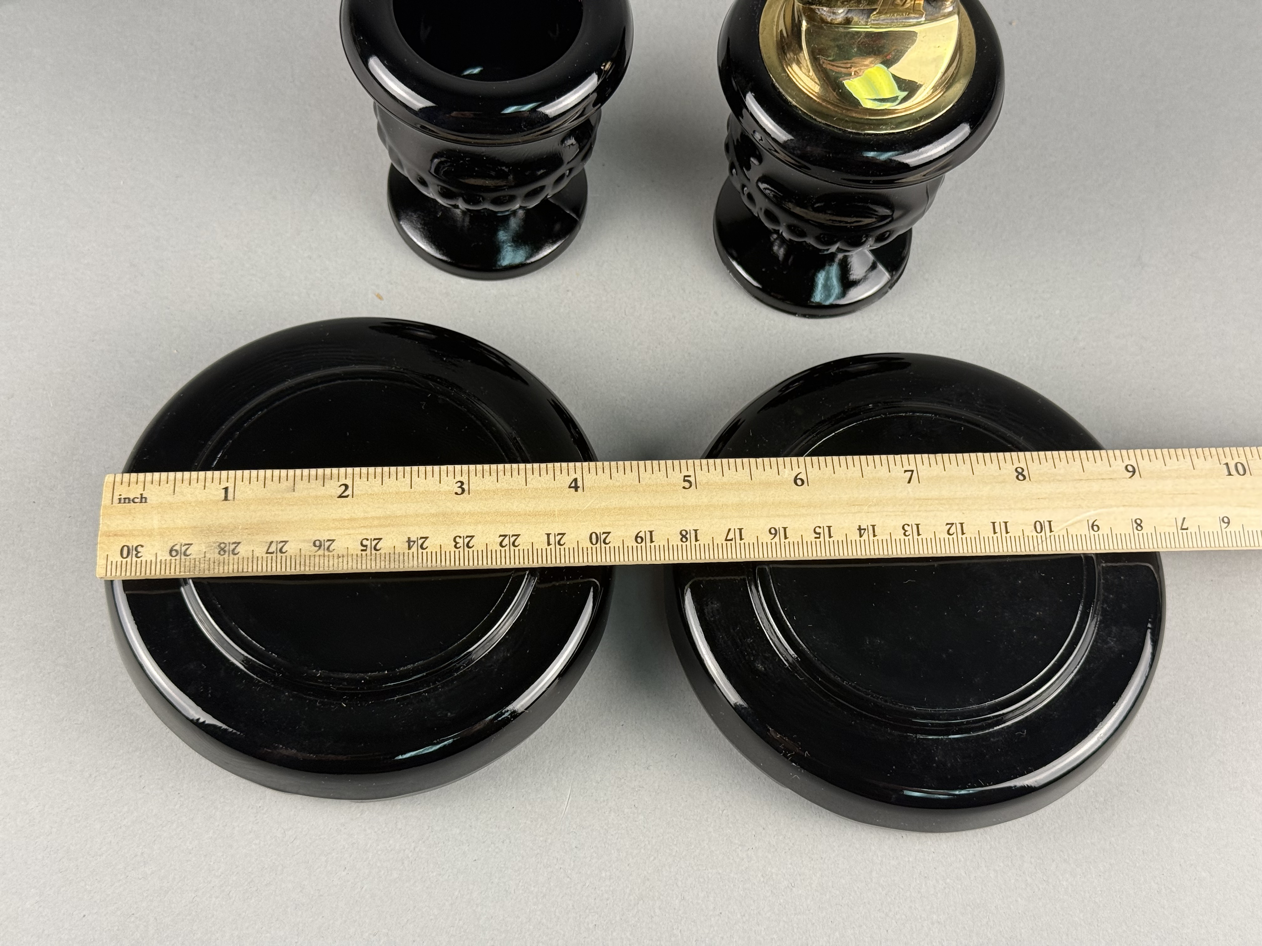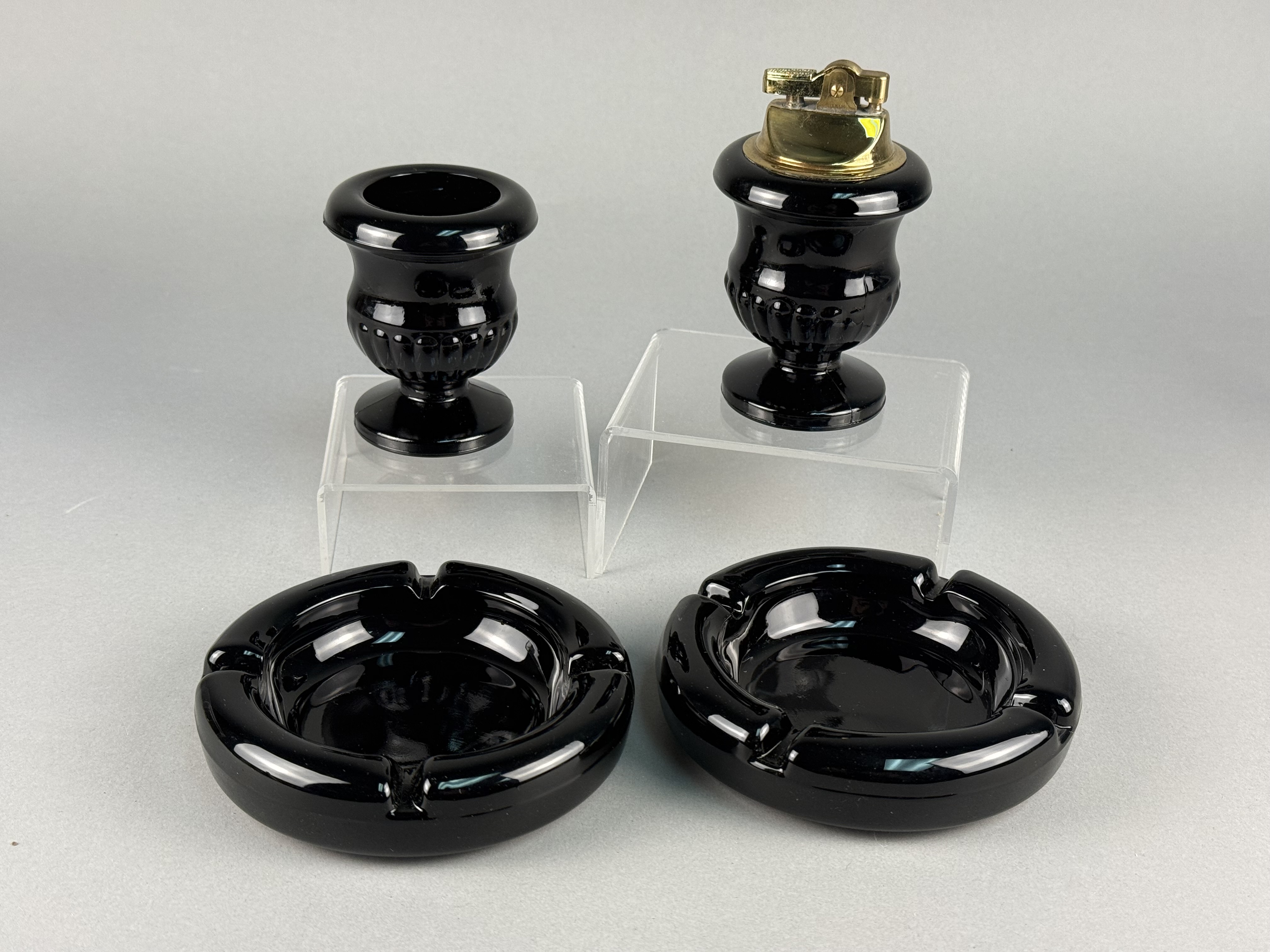 This set of black opaque glass smoking accessories includes circular ashtrays and pedestal urn-shaped vessels. The glass is a deep opaque black with a high-gloss finish. The urn-shaped vessels feature gadrooned detailing on the lower half of the body and rest on circular bases. One vessel contains a removable brass-toned metal table lighter insert, while another is an open vessel intended for use as a cigarette holder. The metal lighter mechanism is marked with the letters JAPAN on the side. The ashtrays are designed with three cigarette rests and a deep well.