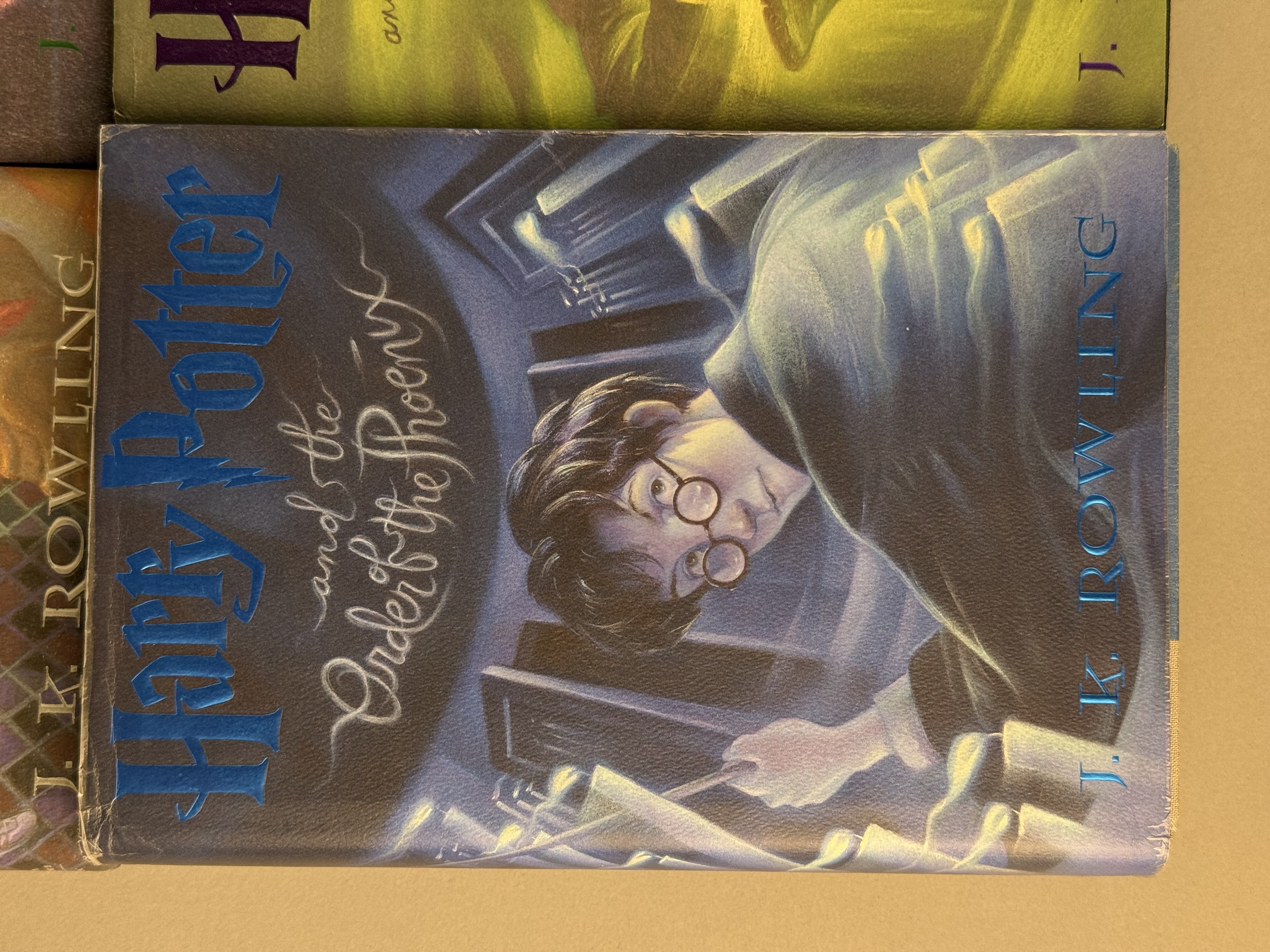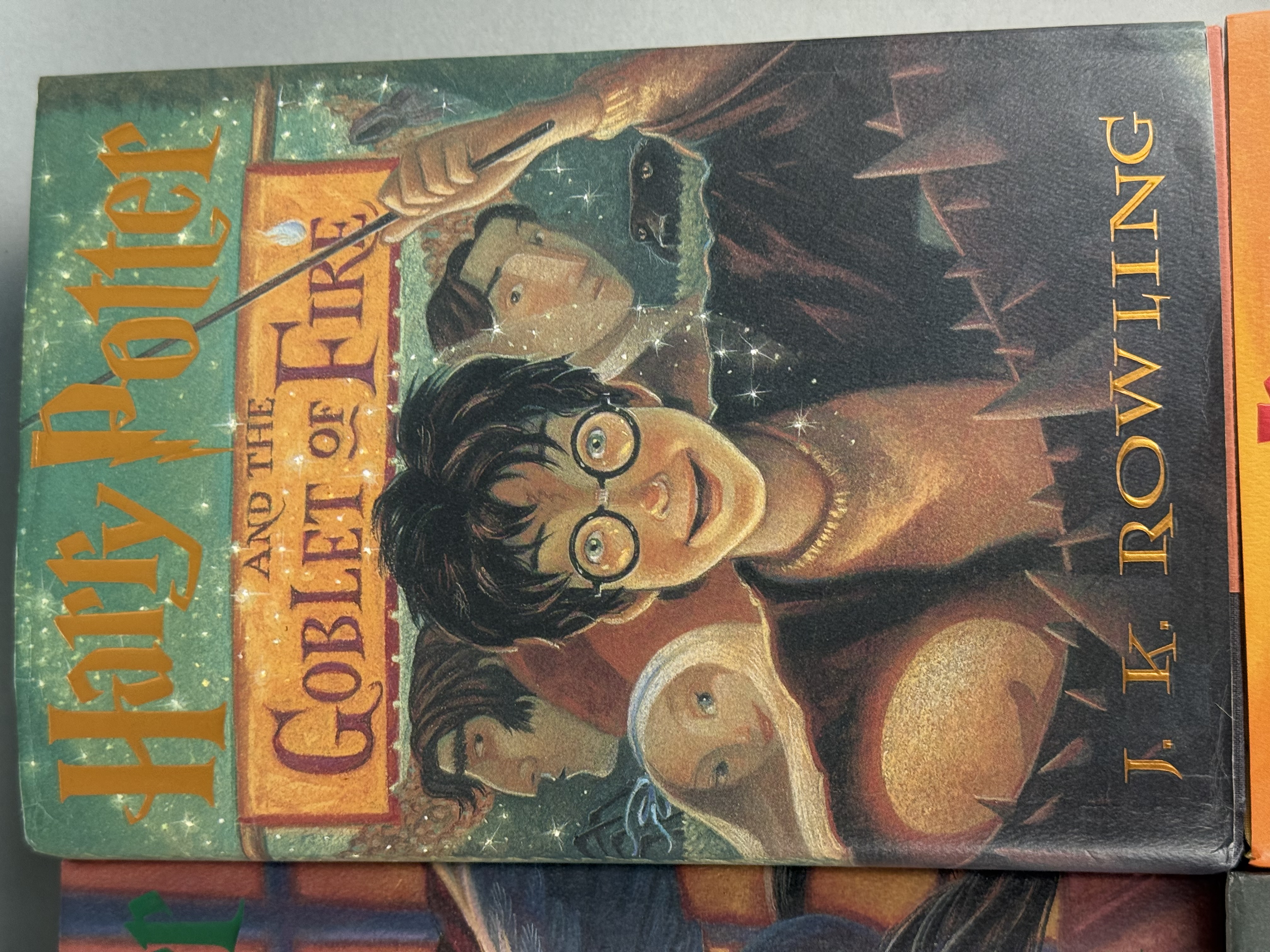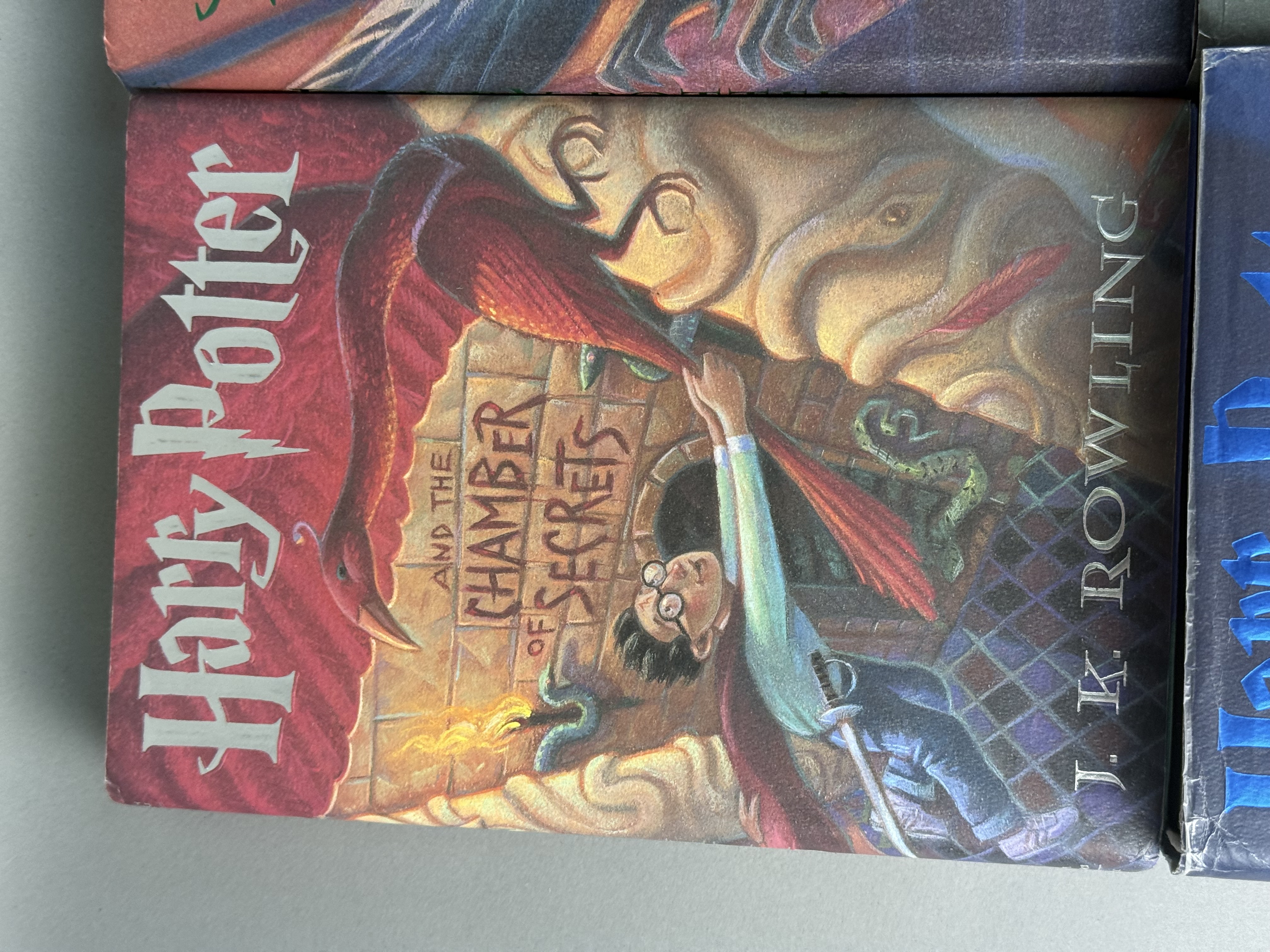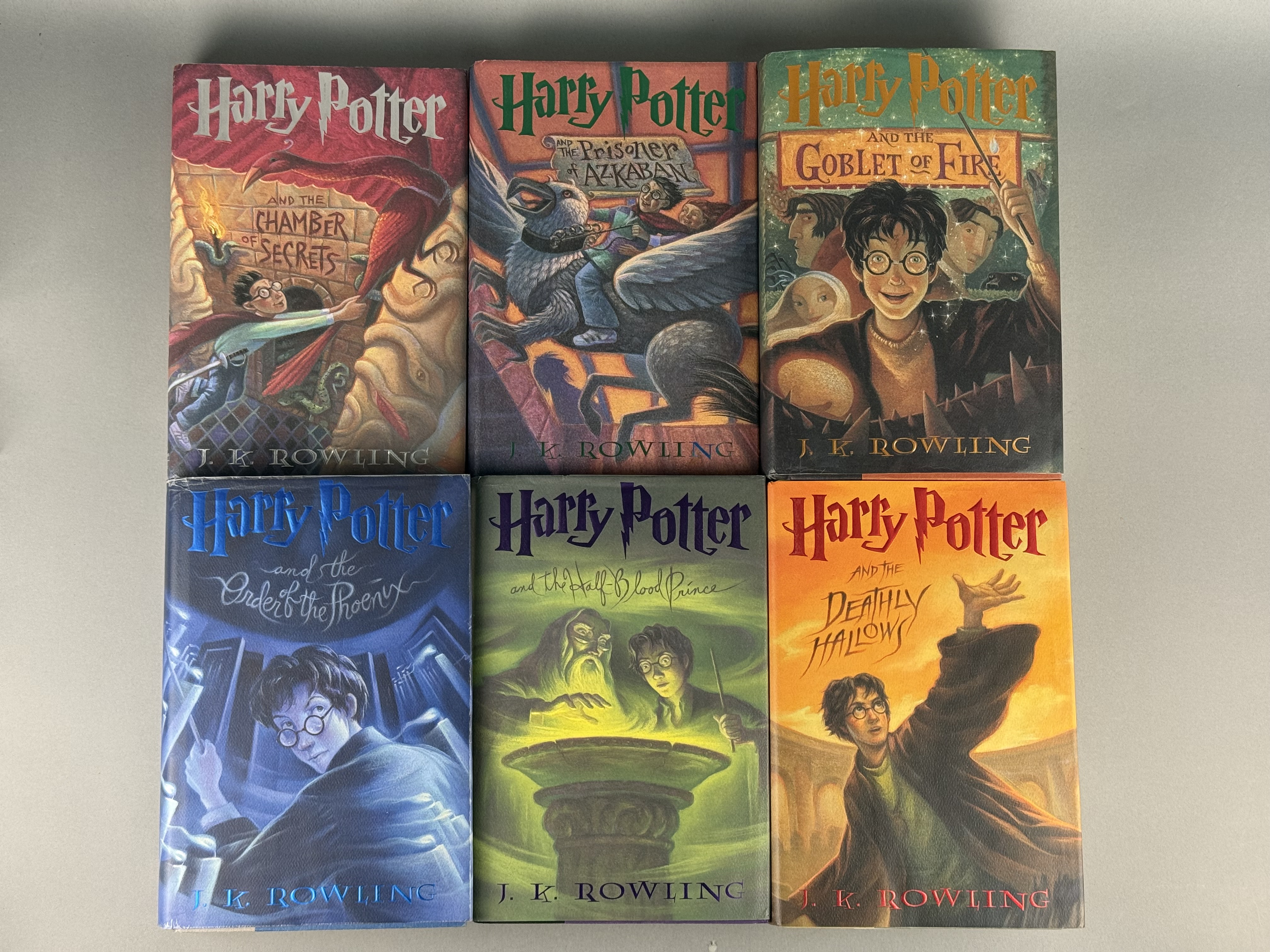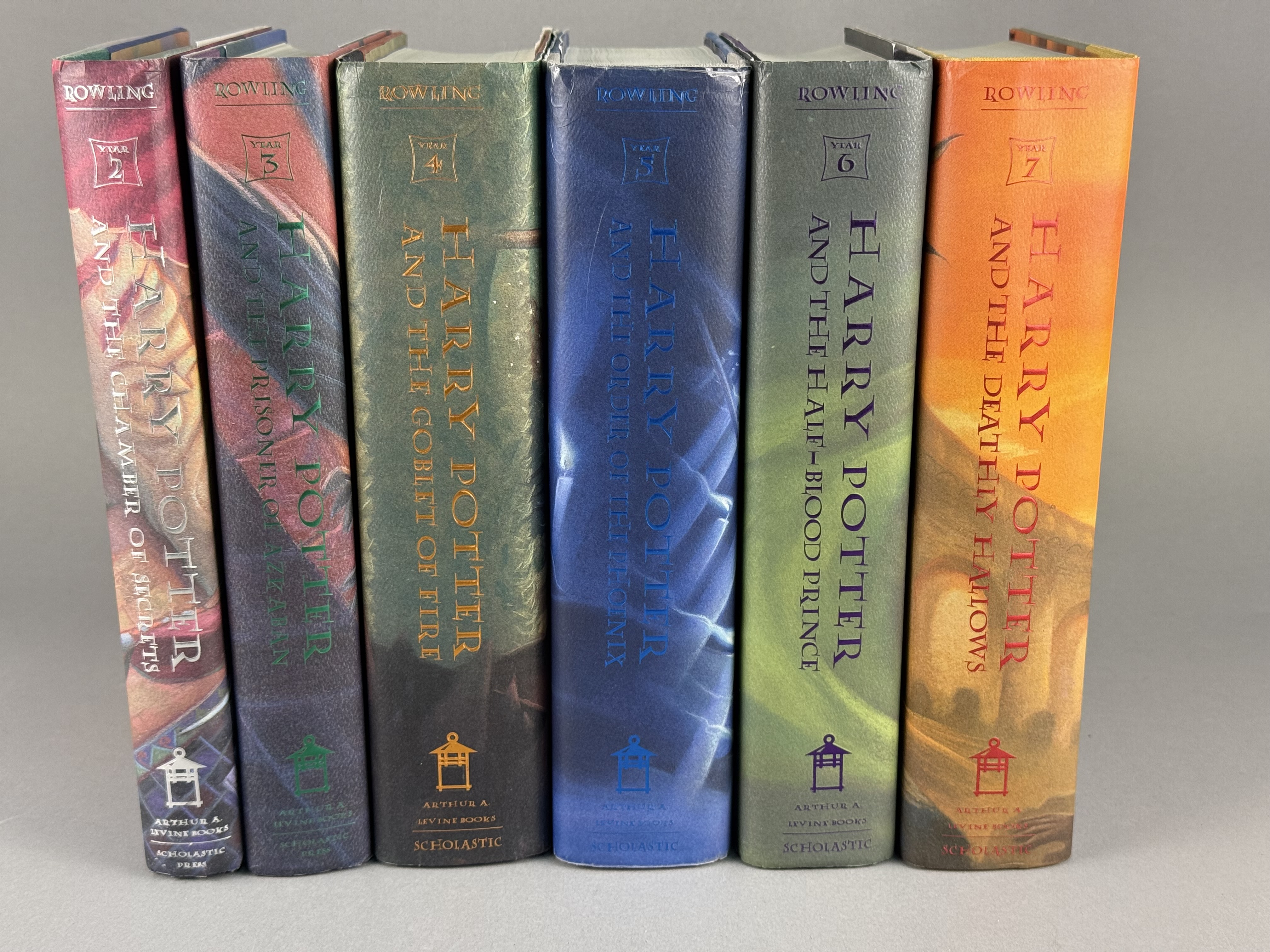 A collection of six hardcover volumes from the Harry Potter series by J.K. Rowling, published in New York by Arthur A. Levine Books, an imprint of Scholastic Press. The group includes Harry Potter and the Chamber of Secrets, Harry Potter and the Prisoner of Azkaban, Harry Potter and the Goblet of Fire, Harry Potter and the Order of the Phoenix, Harry Potter and the Half-Blood Prince, and Harry Potter and the Deathly Hallows. Each volume is an octavo in publisher cloth-backed boards with pictorial dust jackets illustrated by Mary GrandPre. The spine of each volume features the author name Rowling at the base, with the publisher marks for Arthur A. Levine Books and Scholastic below a lantern-shaped logo. Bibliographic details from the copyright pages identify the following: Chamber of Secrets (ISBN 0-439-06486-4) is a First American edition, June 1999, 32nd printing; Prisoner of Azkaban (ISBN 0-439-13635-0) is a First American edition, October 1999, first printing; Goblet of Fire (ISBN 0-439-13959-7) is a First American edition, July 2000, first printing; Order of the Phoenix (ISBN 0-43.
