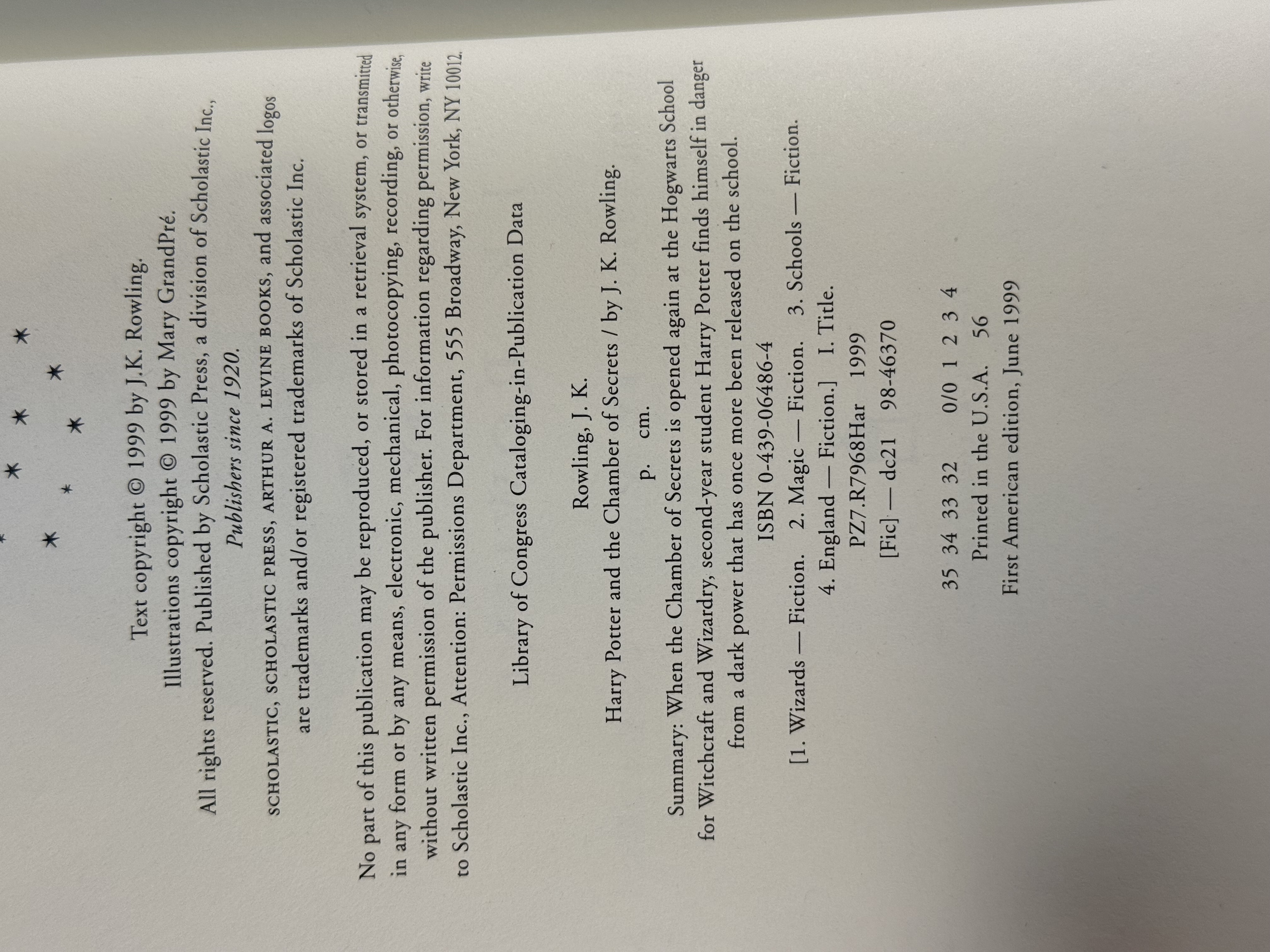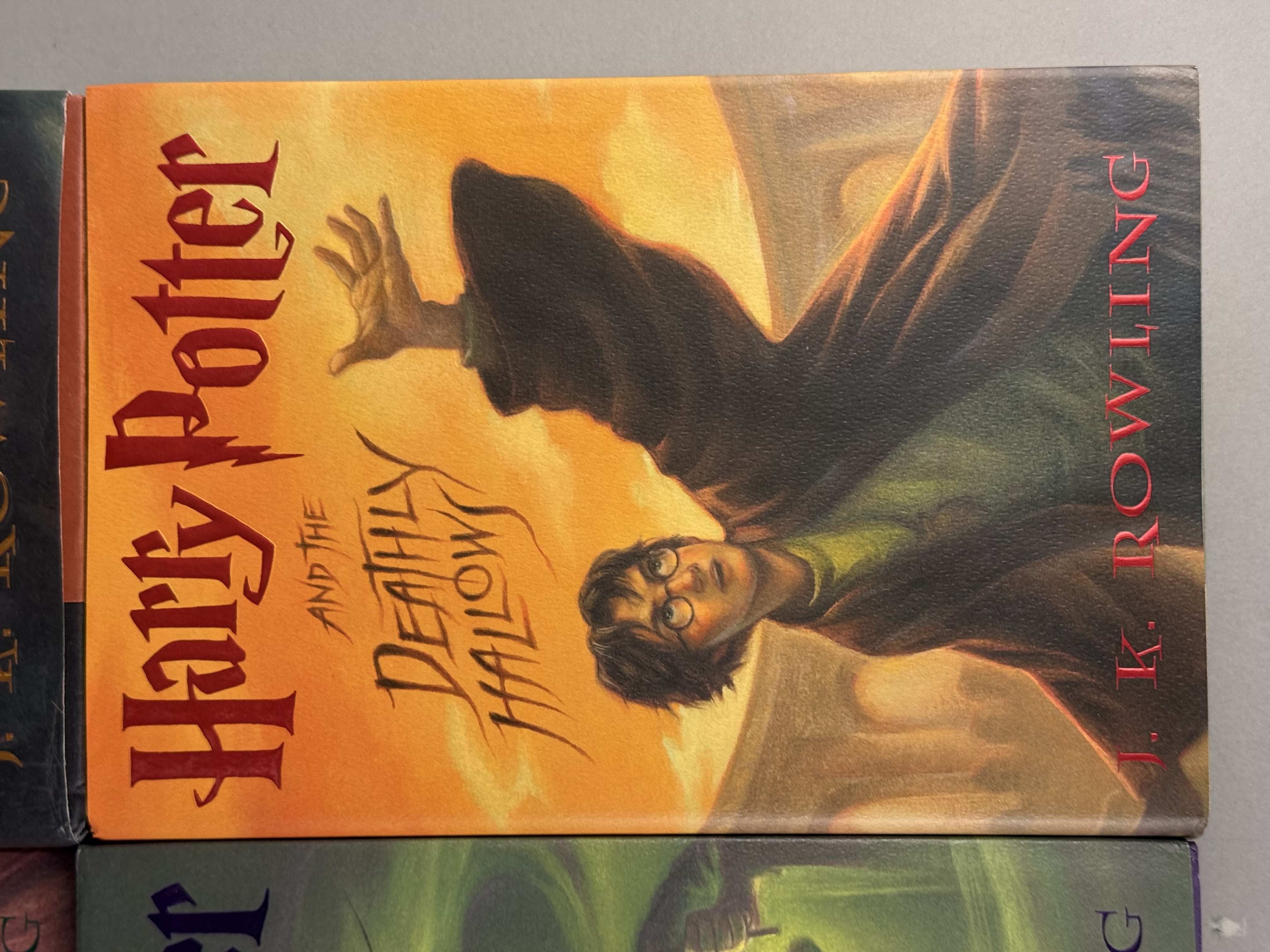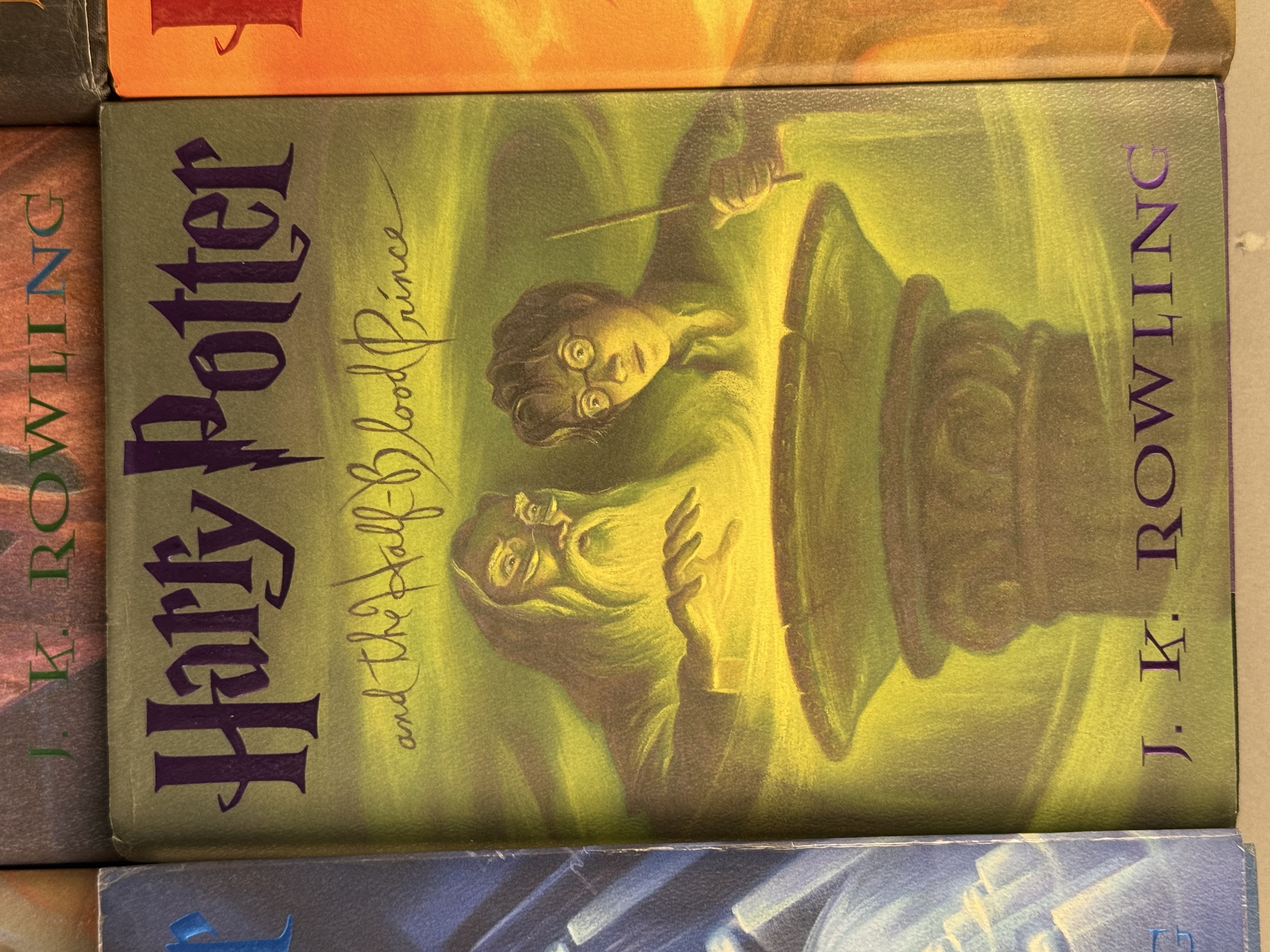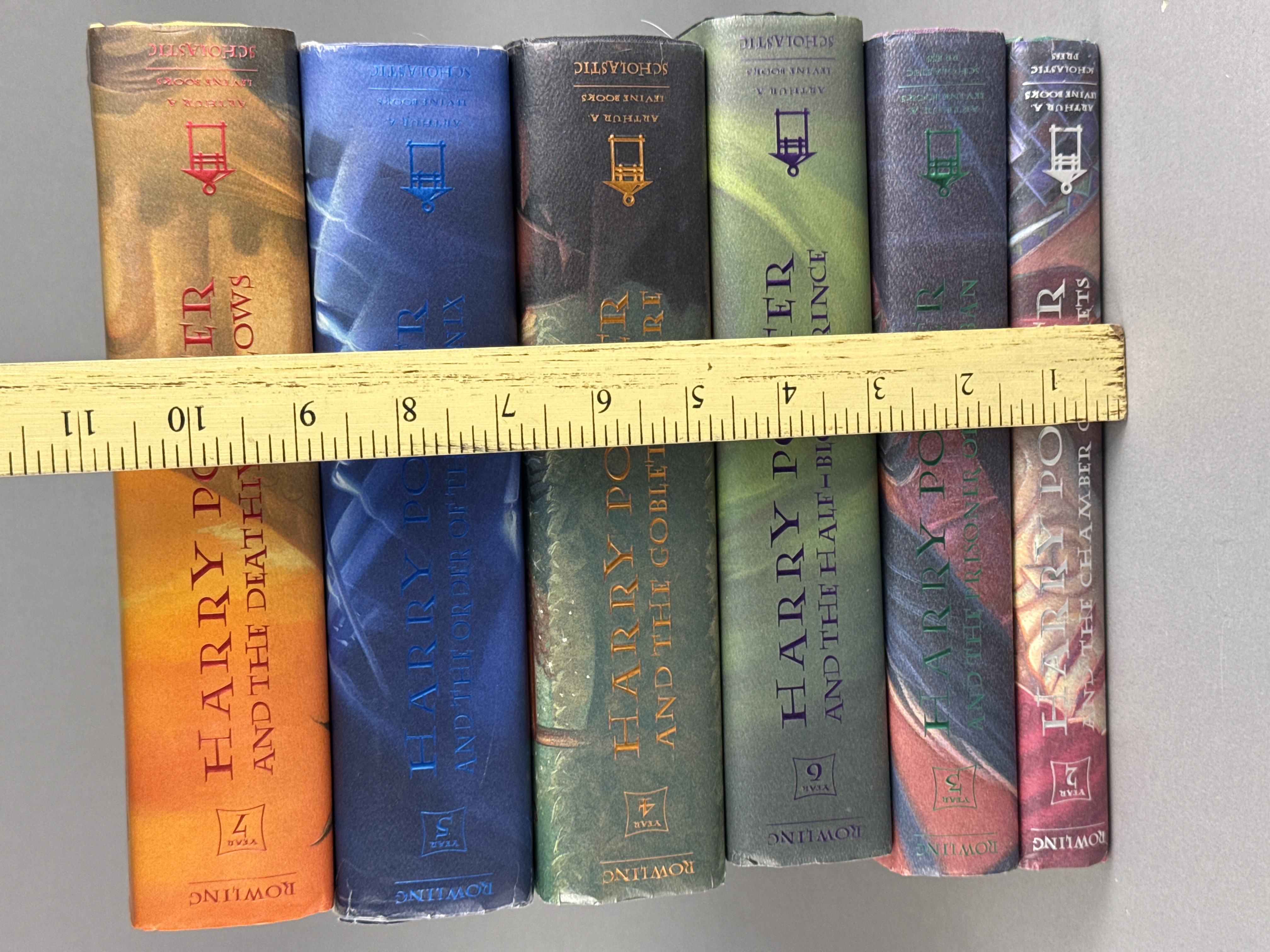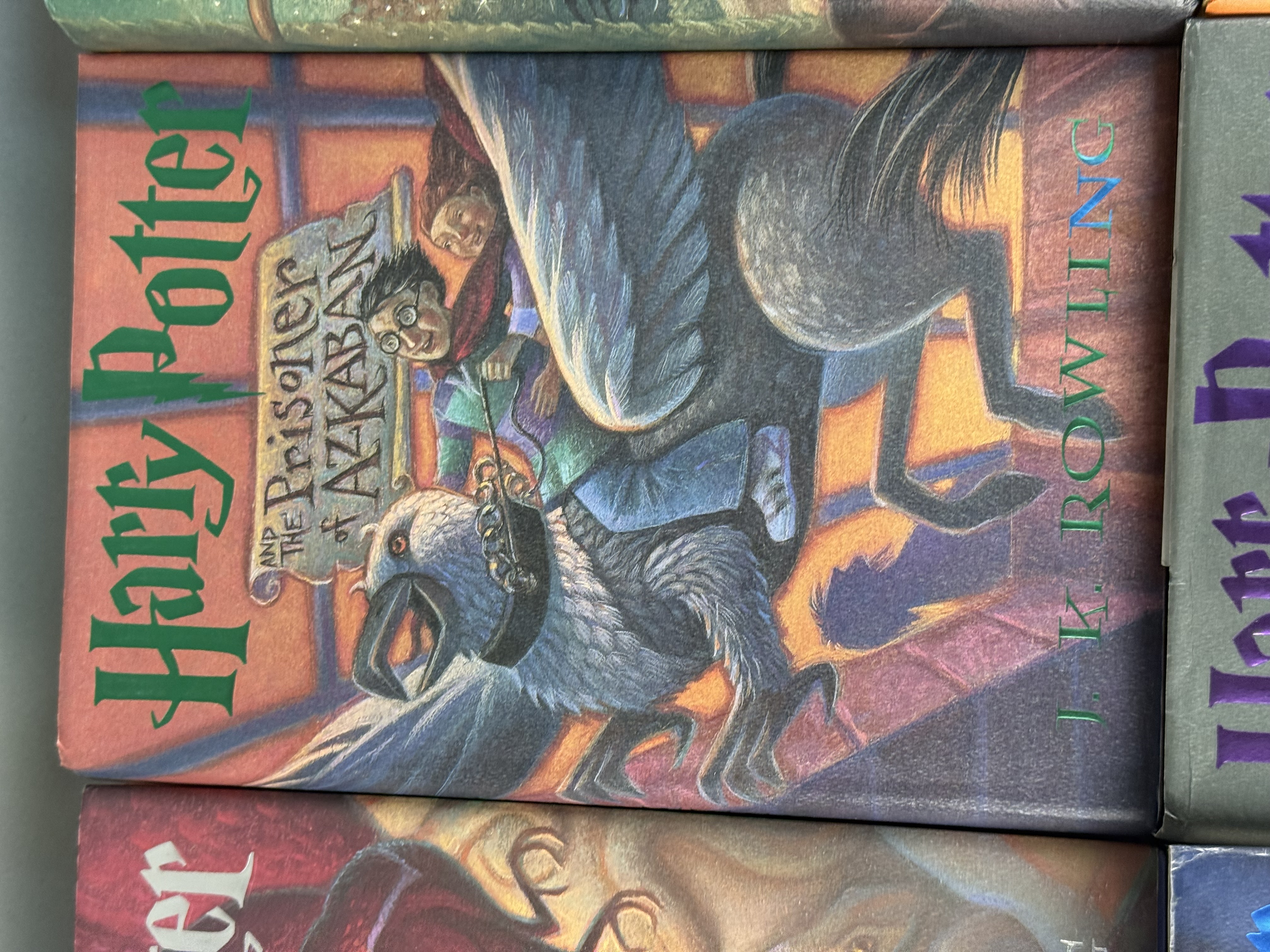 A collection of six hardcover volumes from the Harry Potter series by J.K. Rowling, published in New York by Arthur A. Levine Books, an imprint of Scholastic Press. The group includes Harry Potter and the Chamber of Secrets, Harry Potter and the Prisoner of Azkaban, Harry Potter and the Goblet of Fire, Harry Potter and the Order of the Phoenix, Harry Potter and the Half-Blood Prince, and Harry Potter and the Deathly Hallows. Each volume is an octavo in publisher cloth-backed boards with pictorial dust jackets illustrated by Mary GrandPre. The spine of each volume features the author name Rowling at the base, with the publisher marks for Arthur A. Levine Books and Scholastic below a lantern-shaped logo. Bibliographic details from the copyright pages identify the following: Chamber of Secrets (ISBN 0-439-06486-4) is a First American edition, June 1999, 32nd printing; Prisoner of Azkaban (ISBN 0-439-13635-0) is a First American edition, October 1999, first printing; Goblet of Fire (ISBN 0-439-13959-7) is a First American edition, July 2000, first printing; Order of the Phoenix (ISBN 0-43.