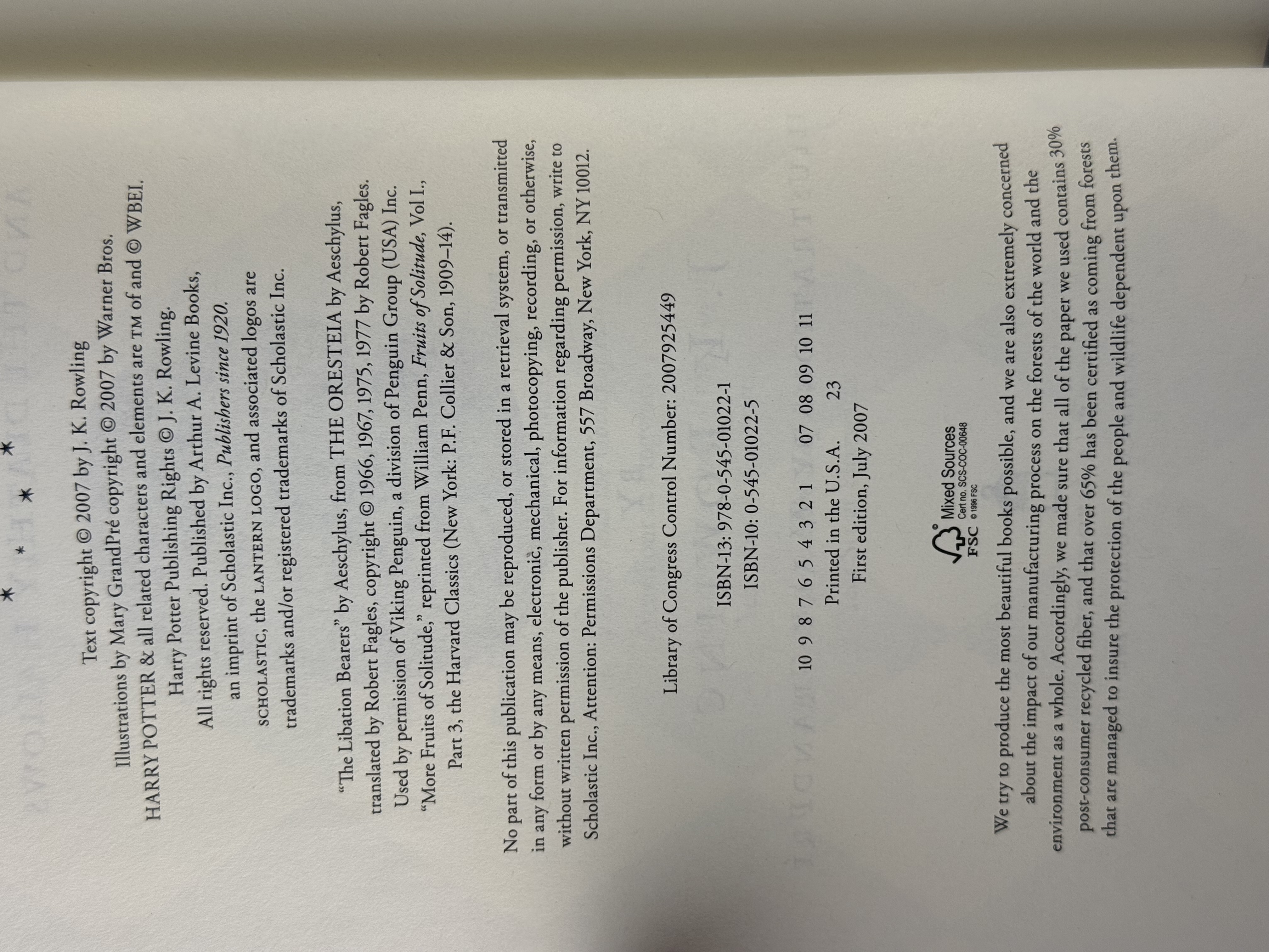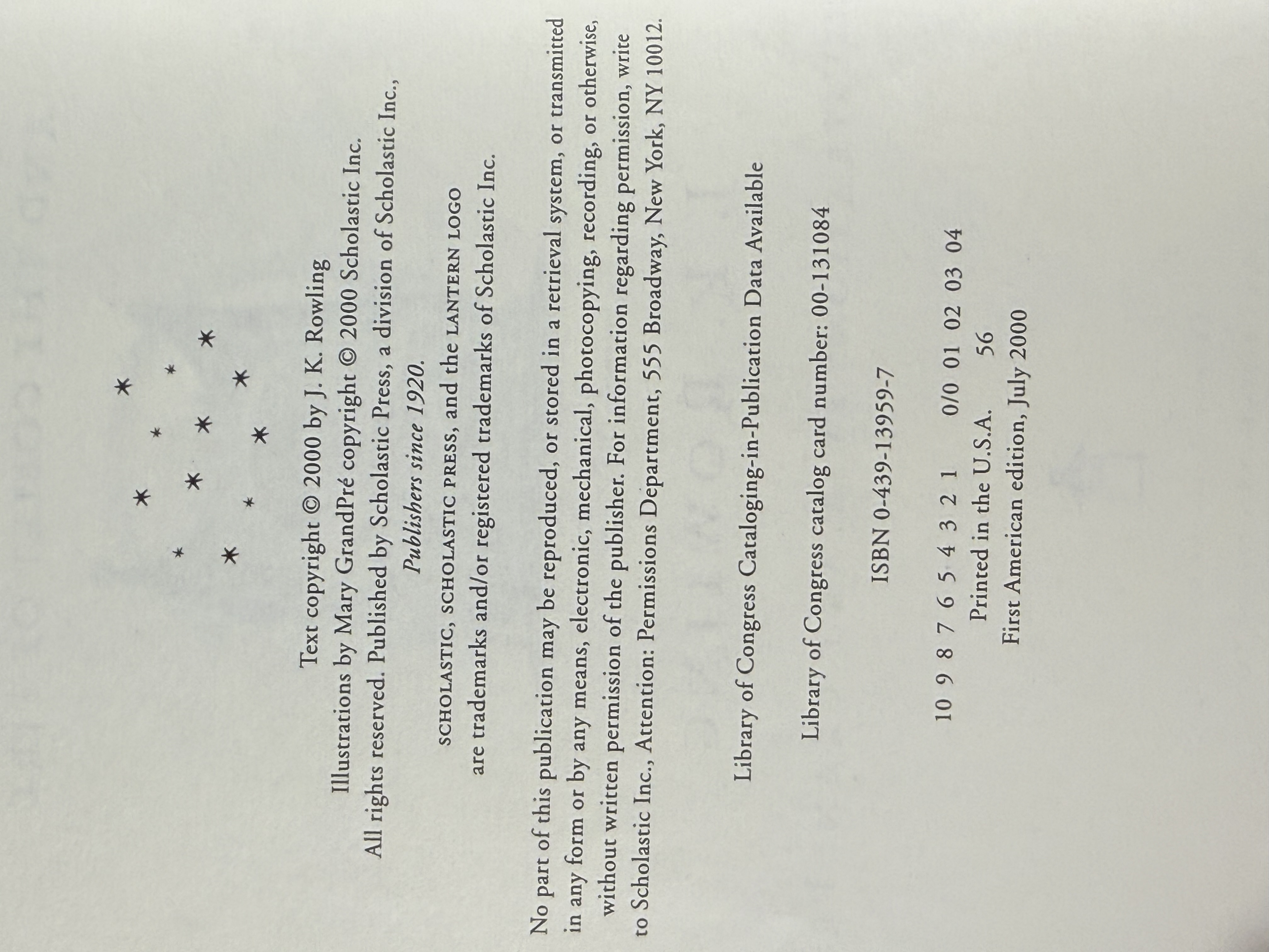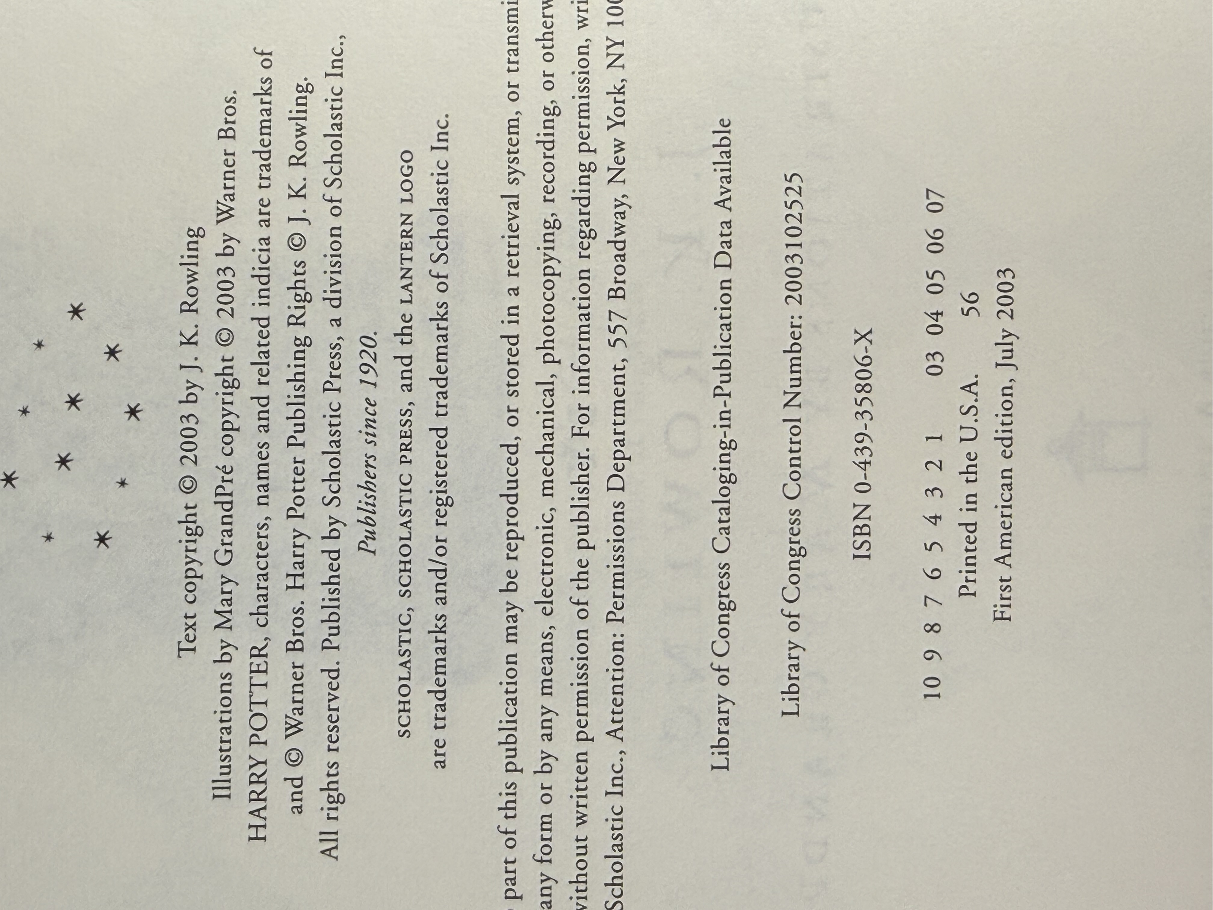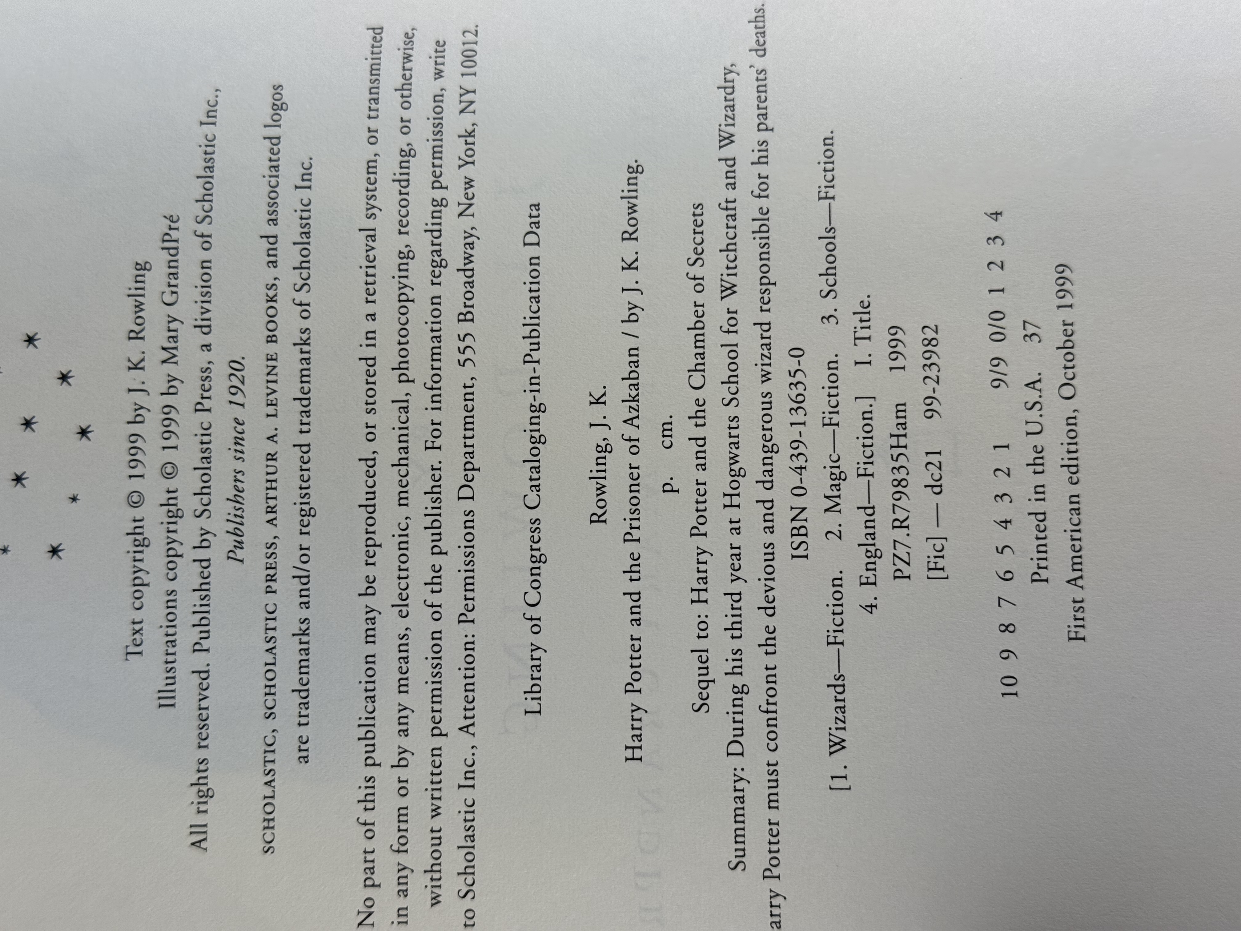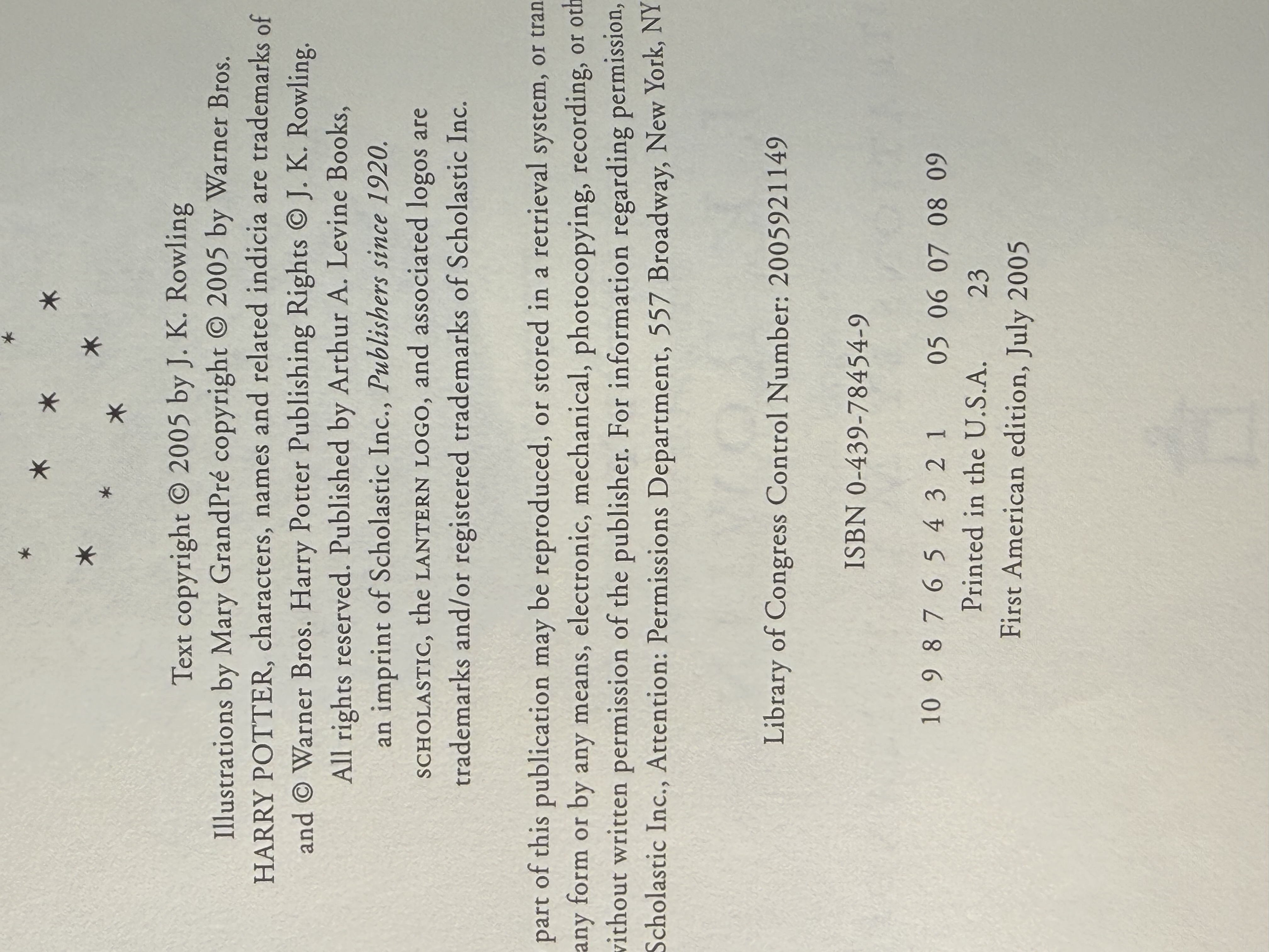 A collection of six hardcover volumes from the Harry Potter series by J.K. Rowling, published in New York by Arthur A. Levine Books, an imprint of Scholastic Press. The group includes Harry Potter and the Chamber of Secrets, Harry Potter and the Prisoner of Azkaban, Harry Potter and the Goblet of Fire, Harry Potter and the Order of the Phoenix, Harry Potter and the Half-Blood Prince, and Harry Potter and the Deathly Hallows. Each volume is an octavo in publisher cloth-backed boards with pictorial dust jackets illustrated by Mary GrandPre. The spine of each volume features the author name Rowling at the base, with the publisher marks for Arthur A. Levine Books and Scholastic below a lantern-shaped logo. Bibliographic details from the copyright pages identify the following: Chamber of Secrets (ISBN 0-439-06486-4) is a First American edition, June 1999, 32nd printing; Prisoner of Azkaban (ISBN 0-439-13635-0) is a First American edition, October 1999, first printing; Goblet of Fire (ISBN 0-439-13959-7) is a First American edition, July 2000, first printing; Order of the Phoenix (ISBN 0-43.
