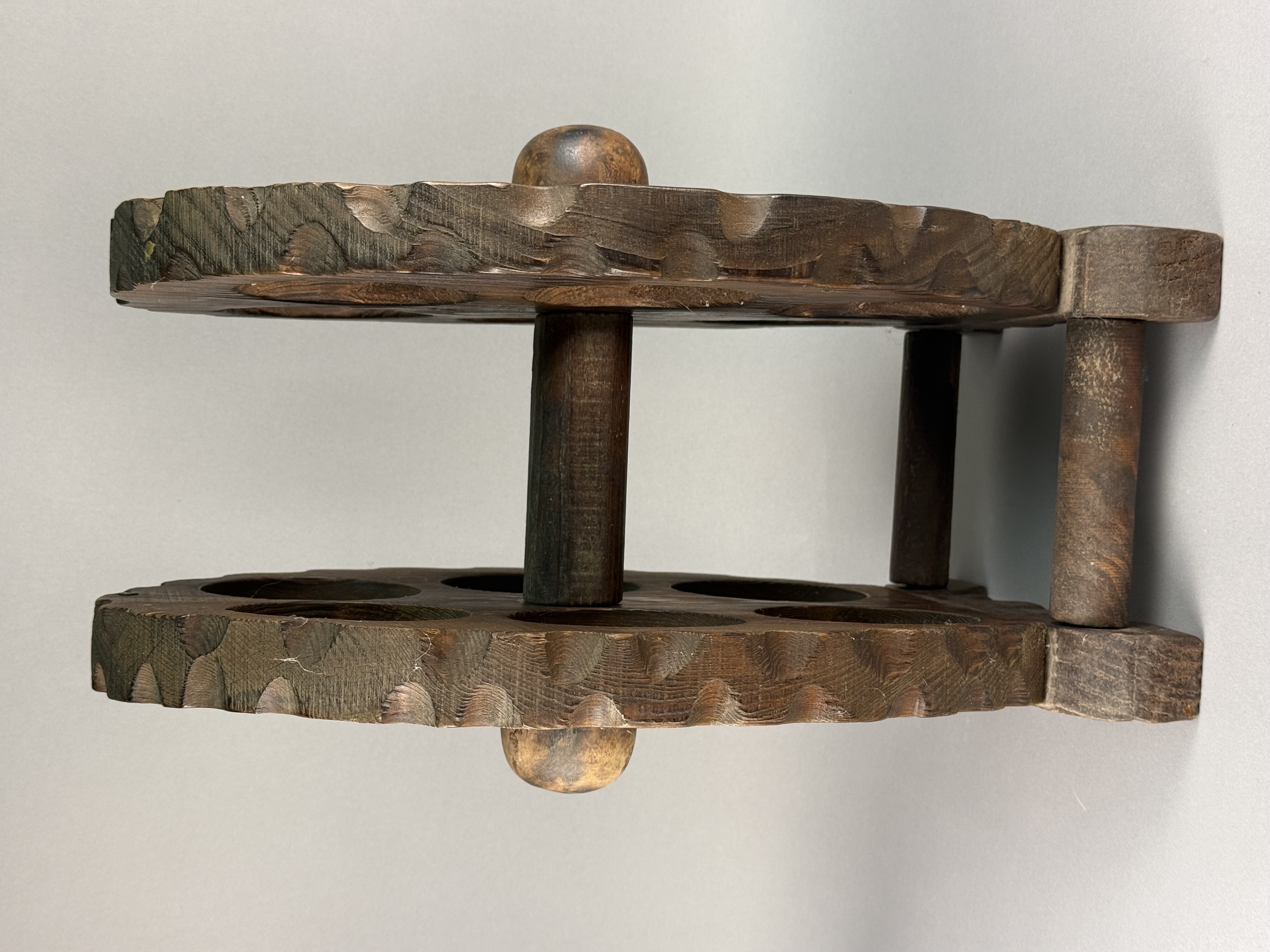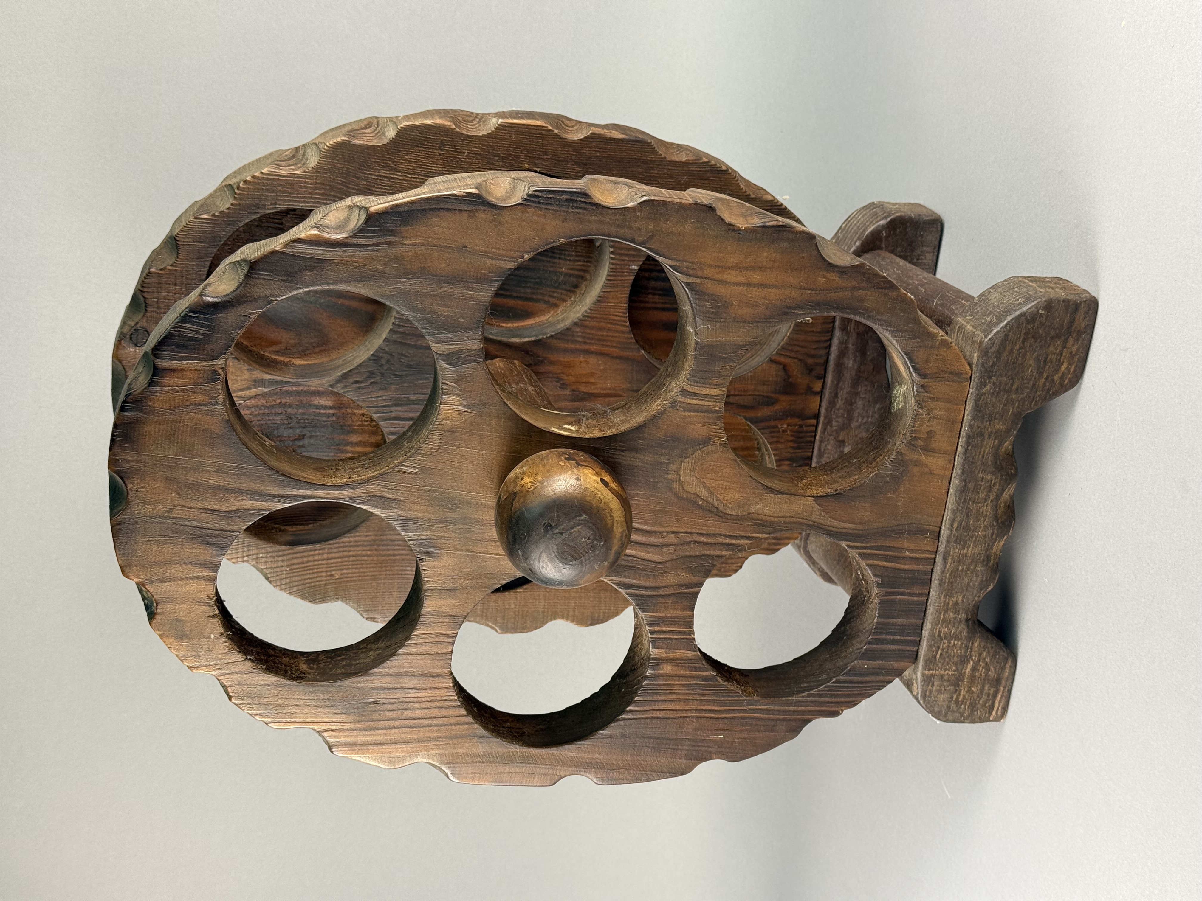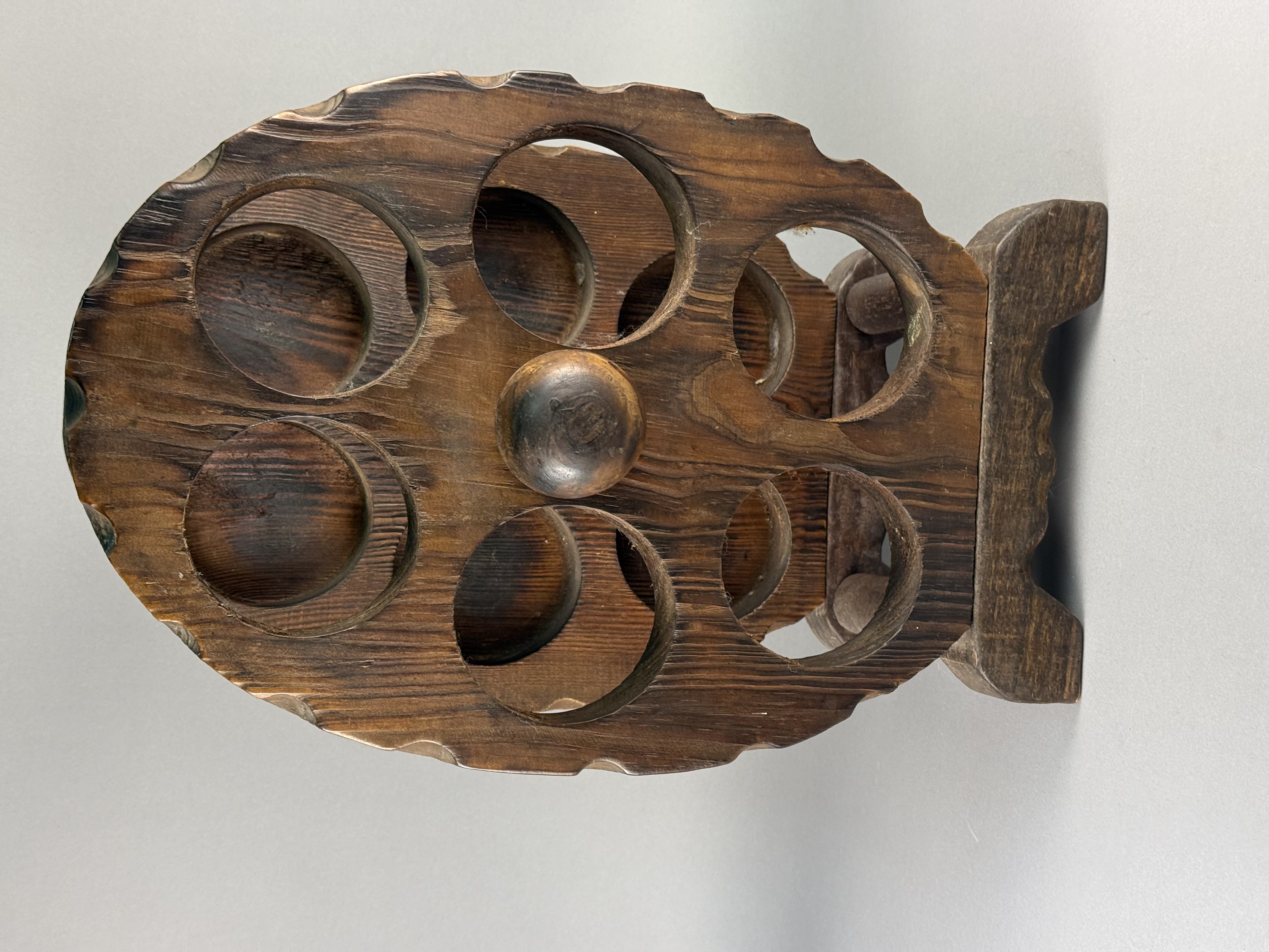 A rustic wooden tabletop bottle rack designed in the form of a six-shot revolver cylinder. The construction consists of two thick, oval-shaped wooden plates with decorative scalloped edges, each featuring six circular apertures for bottle storage. The plates are joined by a central wooden dowel and perimeter dowels, supported by a shaped flat base at one end. The wood is finished with a dark brown stain, highlighting a prominent grain pattern. No maker marks or signatures are visible on the base or body of the item.