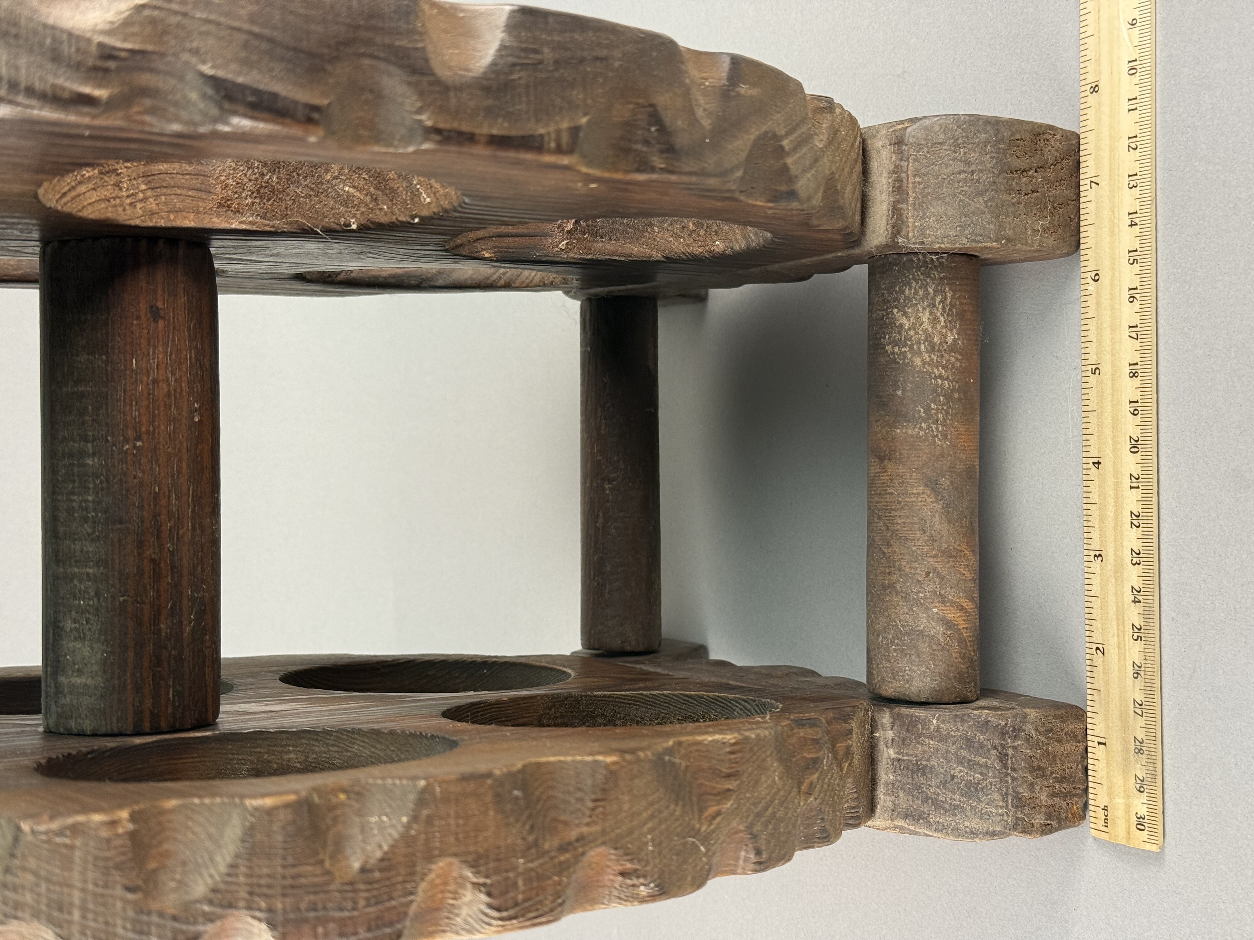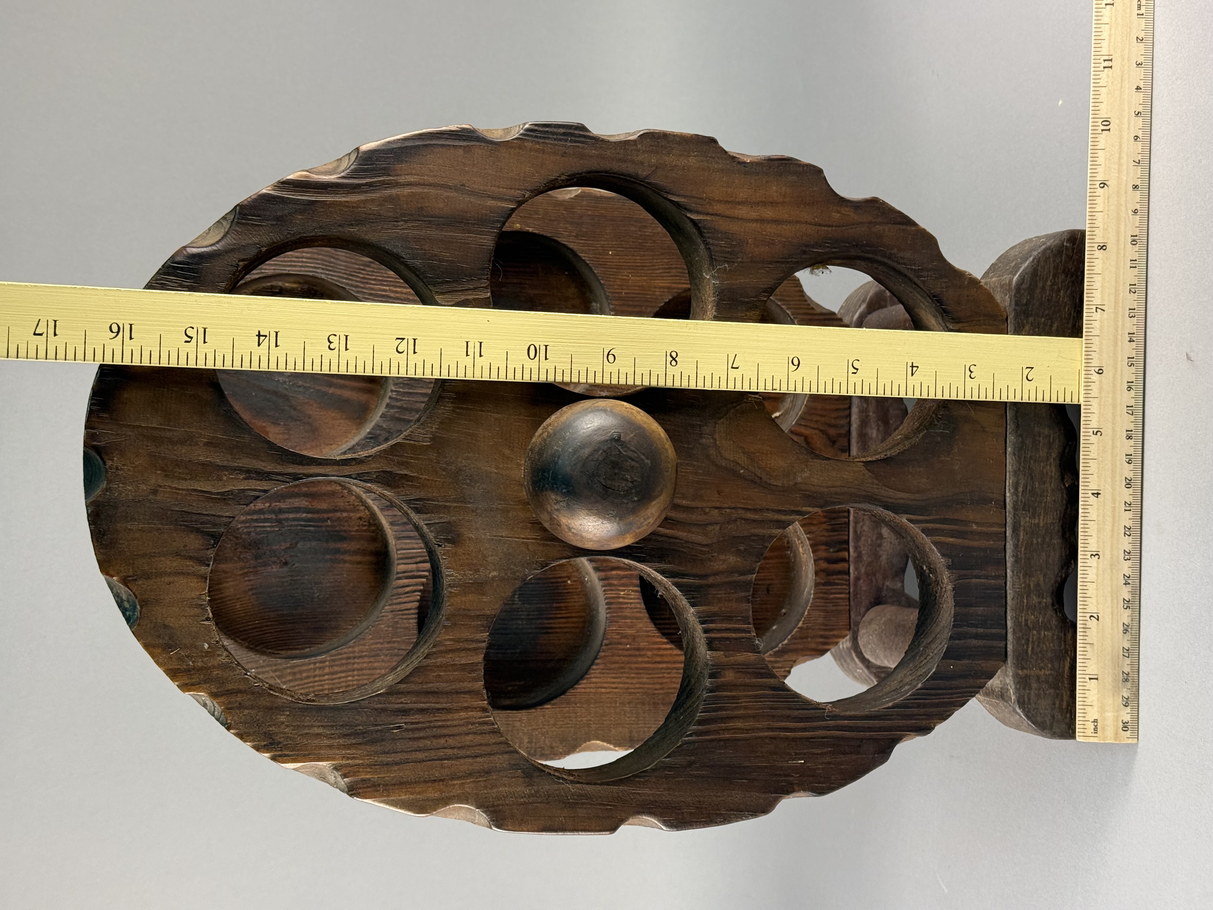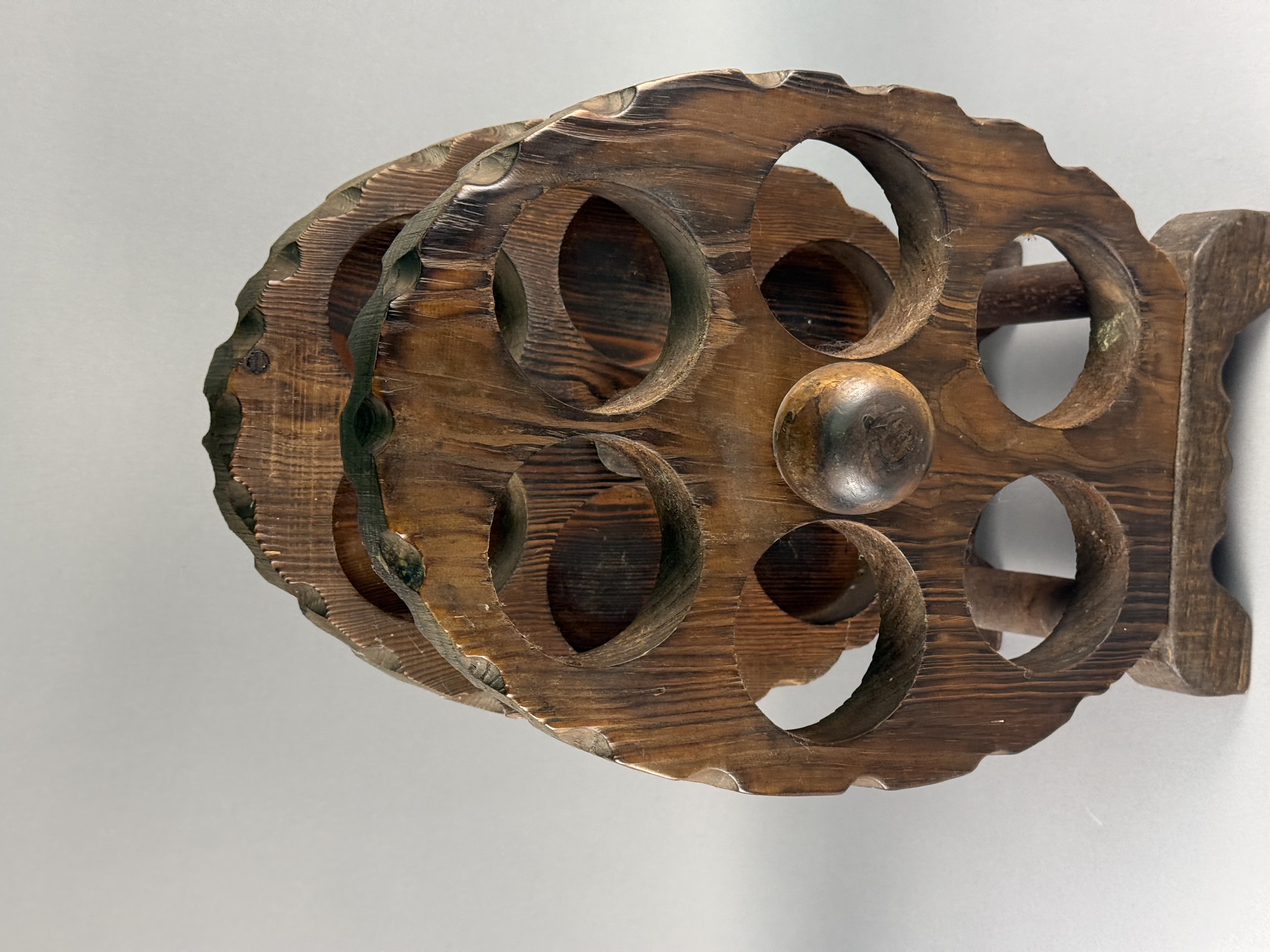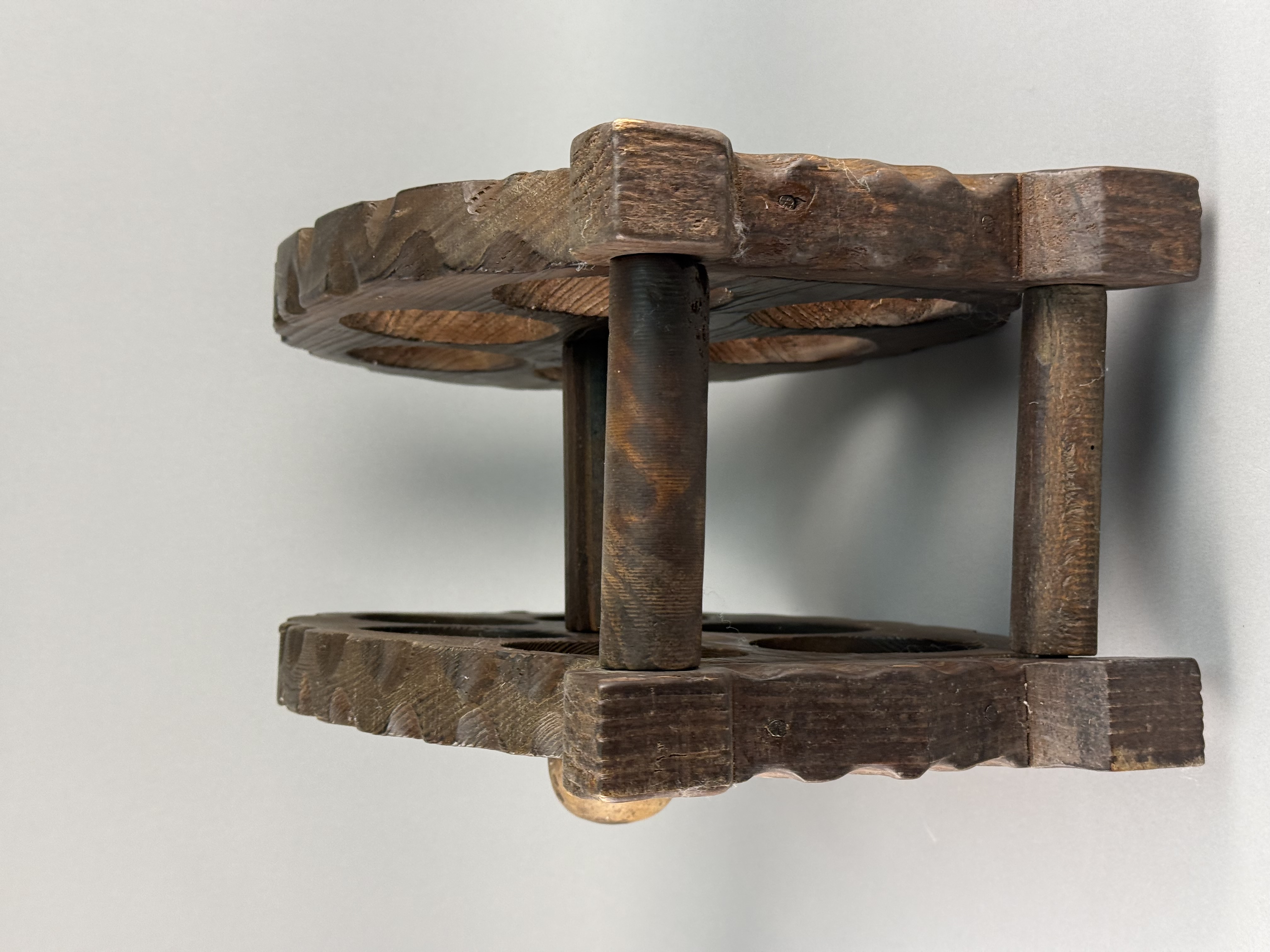 A rustic wooden tabletop bottle rack designed in the form of a six-shot revolver cylinder. The construction consists of two thick, oval-shaped wooden plates with decorative scalloped edges, each featuring six circular apertures for bottle storage. The plates are joined by a central wooden dowel and perimeter dowels, supported by a shaped flat base at one end. The wood is finished with a dark brown stain, highlighting a prominent grain pattern. No maker marks or signatures are visible on the base or body of the item.