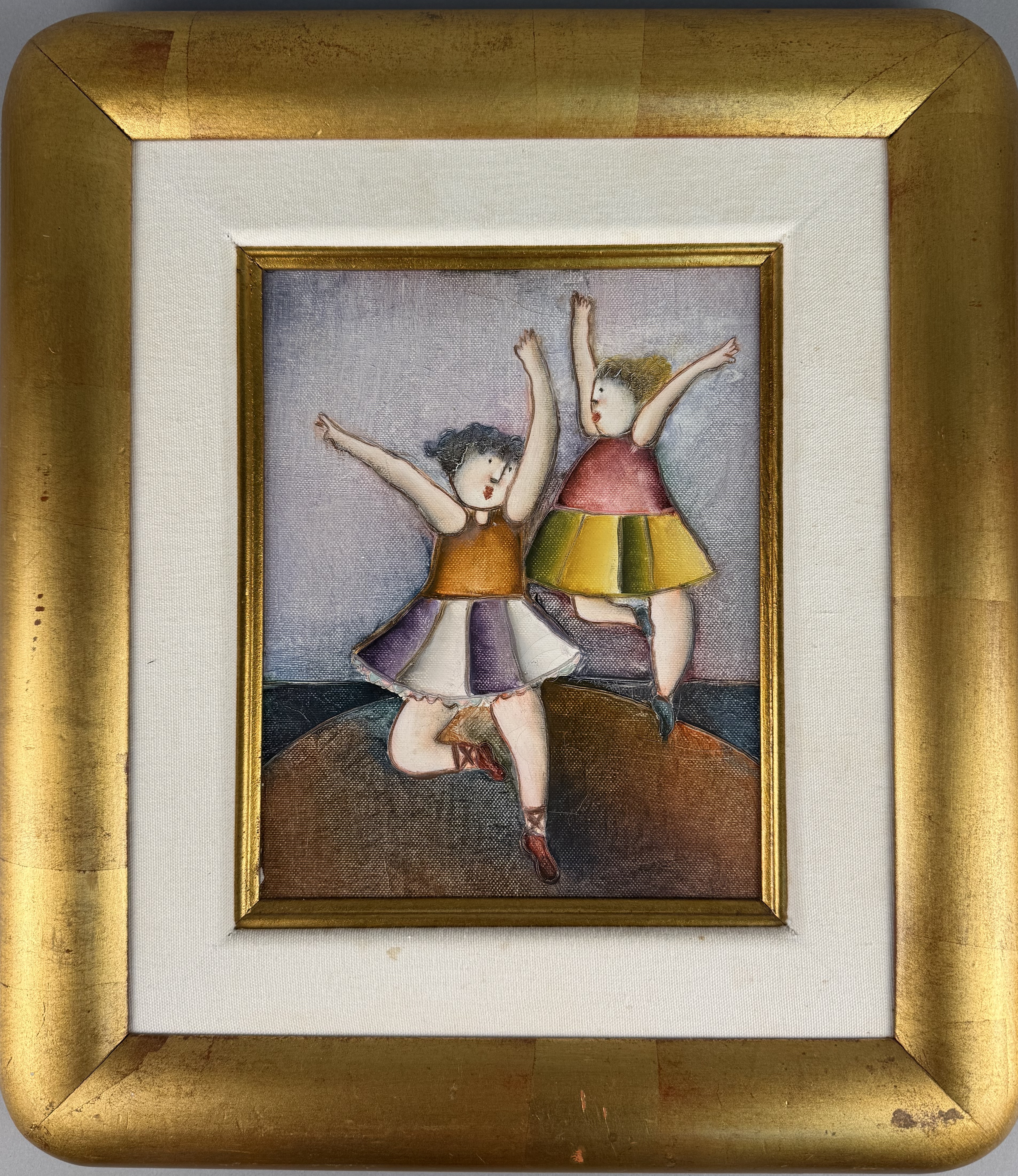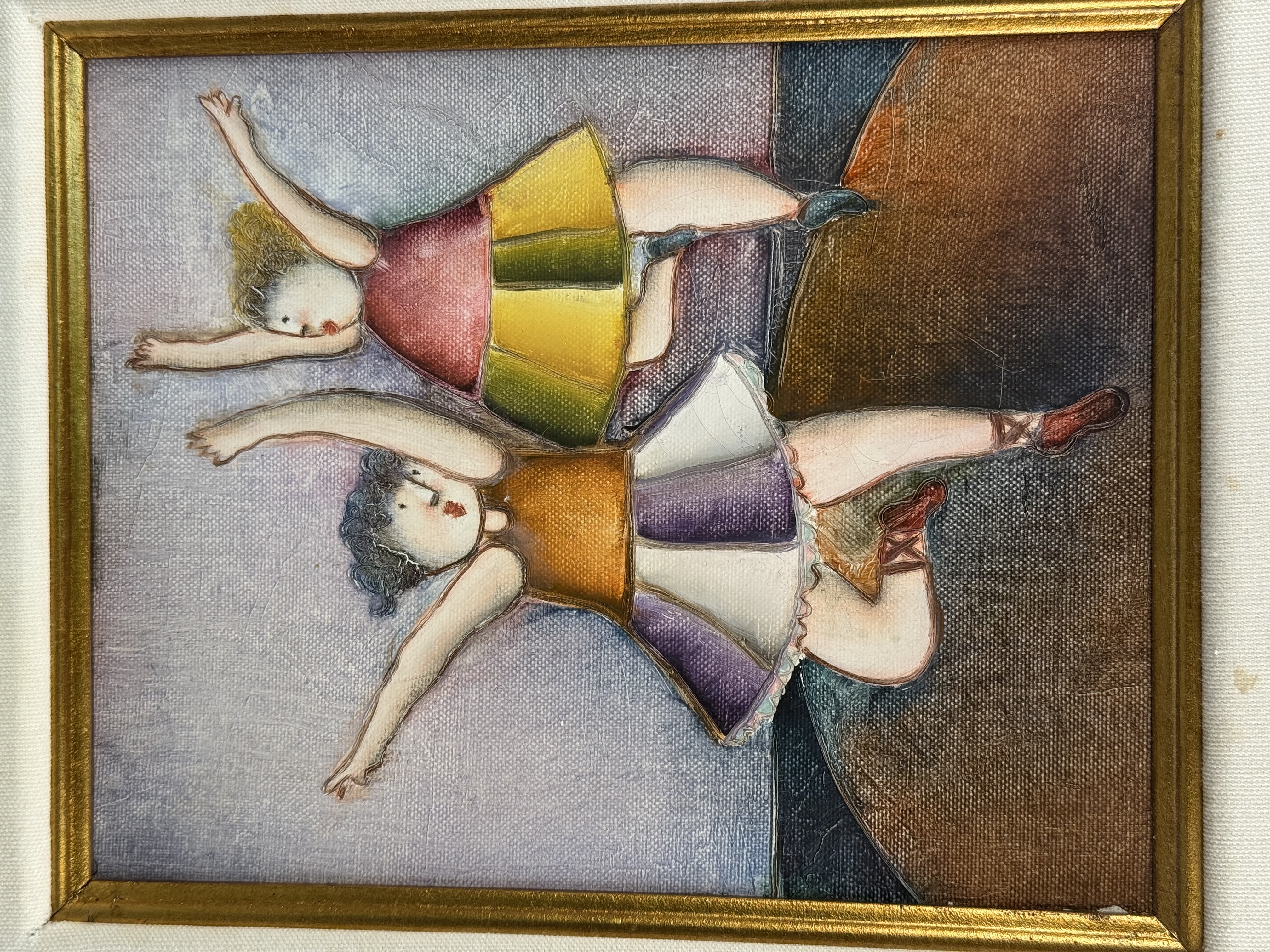 painting on canvas is executed in the style of Joyce Robal. The composition features two stylized, volumetric female figures dressed in colorful circus-style costumes, including tutus in shades of yellow, red, orange, and purple. The figures are depicted mid-motion against a muted purple and gray background that includes a large, dark brown circular element suggesting a circus ring. The artwork is housed in a substantial, rounded gold-toned frame with a white linen-wrapped liner. The verso of the piece shows the canvas secured to a wooden stretcher with black metal clips. Handwritten inscriptions on the lower reverse of the frame read 026-2019 and 16×20. A partially obscured adhesive label with a barcode is affixed to the left side of the frame’s reverse. 8 x 10 in.