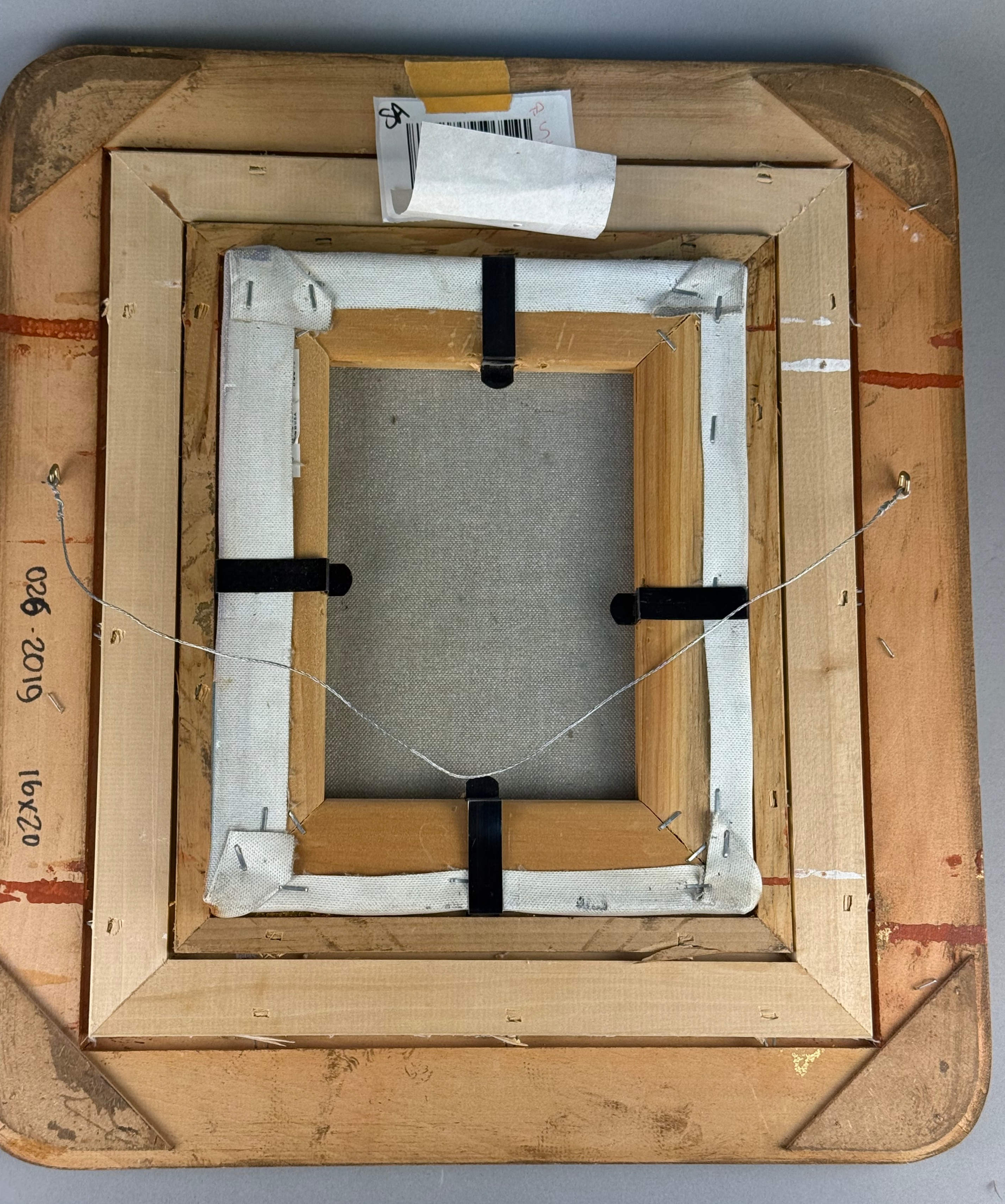 The painting is in good overall condition with the canvas remaining taut on the stretcher. The gold-toned frame exhibits minor surface wear and small scuffs consistent with age and handling.