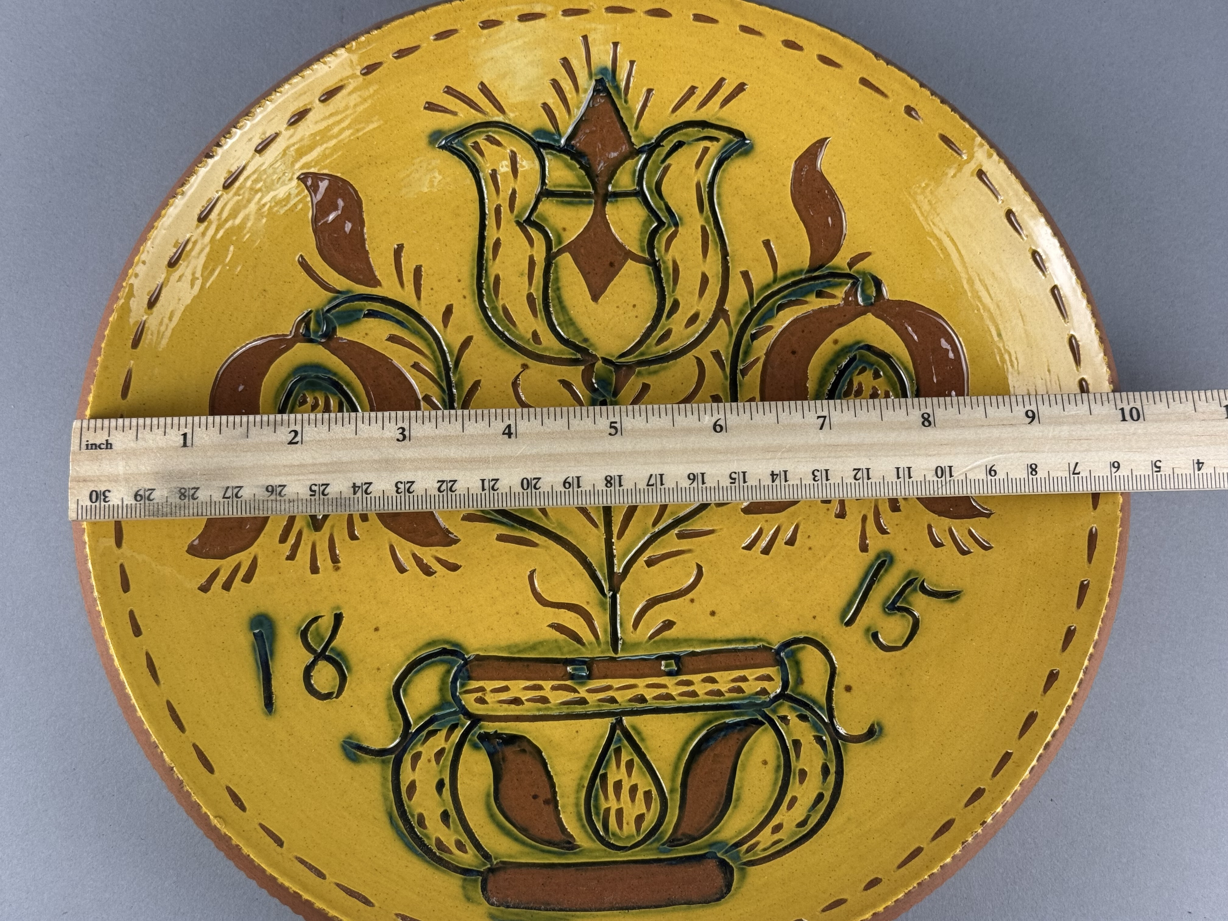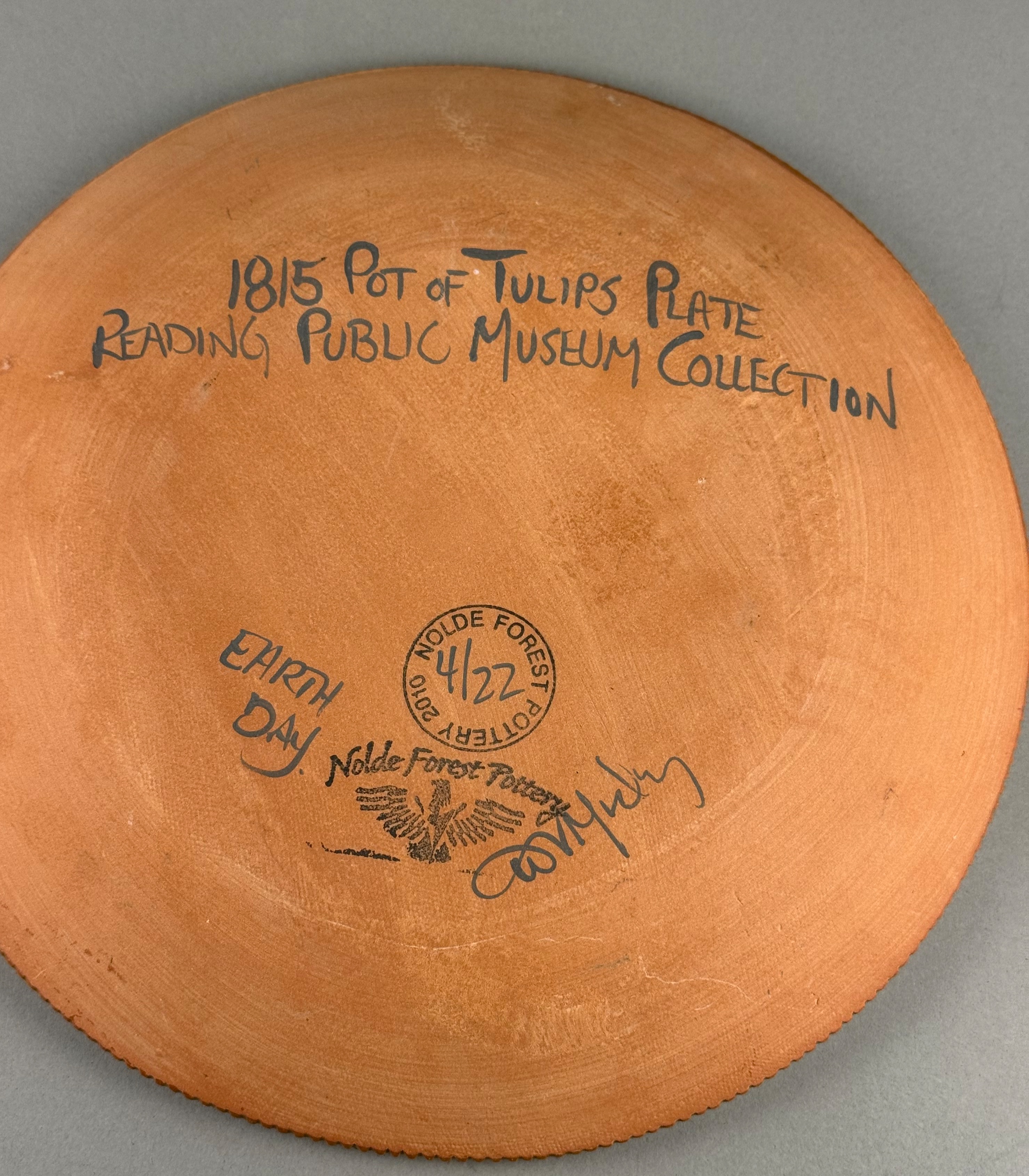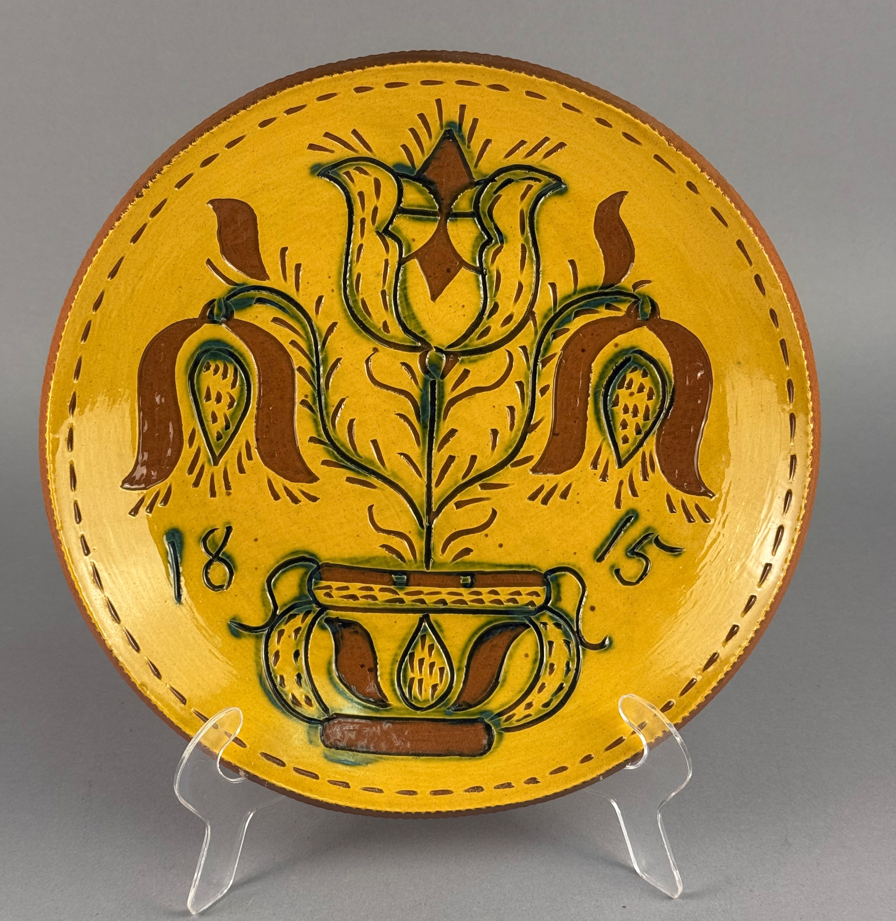This contemporary redware charger is a reproduction of an 1815 historic piece from the Reading Public Museum collection. Handcrafted in the traditional Pennsylvania German style, the earthenware plate features a yellow slip ground with sgraffito and slip-trailed decoration. The central design depicts a pot of tulips with three blossoms in brown and green glazes, flanked by the date 1815. The rim is coggled and decorated with a dashed slip border. The underside bears a circular Nolde Forest Pottery ink stamp dated 2010 and 4/22, along with handwritten text identifying the museum source and an Earth Day commemoration. It is signed in cursive by the potter. Diameter: 10 inches. The item is in excellent condition. There are no cracks, major chips, or restorations. A few minor, shallow nicks are visible on the slip of the coggled rim, which are characteristic of this handcrafted pottery style.