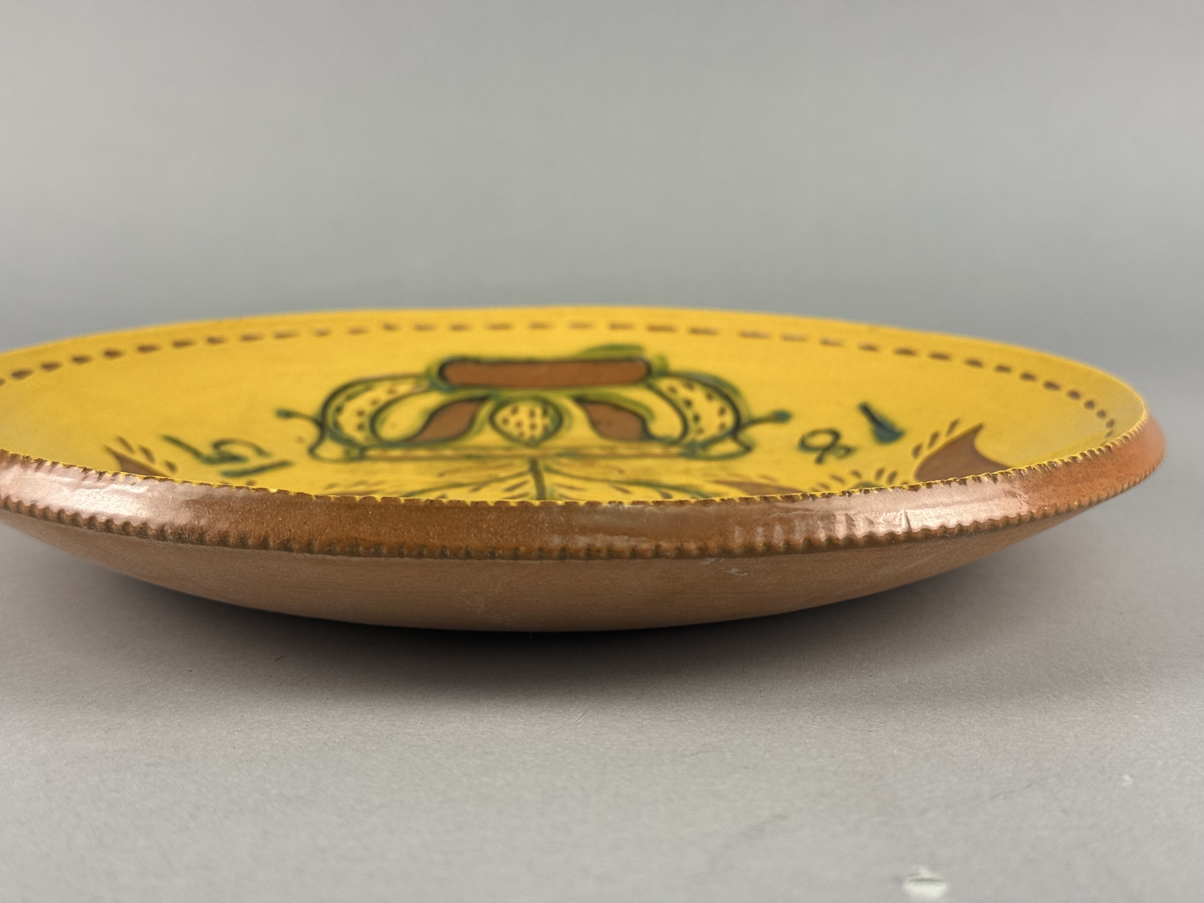 The item is in excellent condition. There are no cracks, major chips, or restorations. A few minor, shallow nicks are visible on the slip of the coggled rim, which are characteristic of this handcrafted pottery style.
