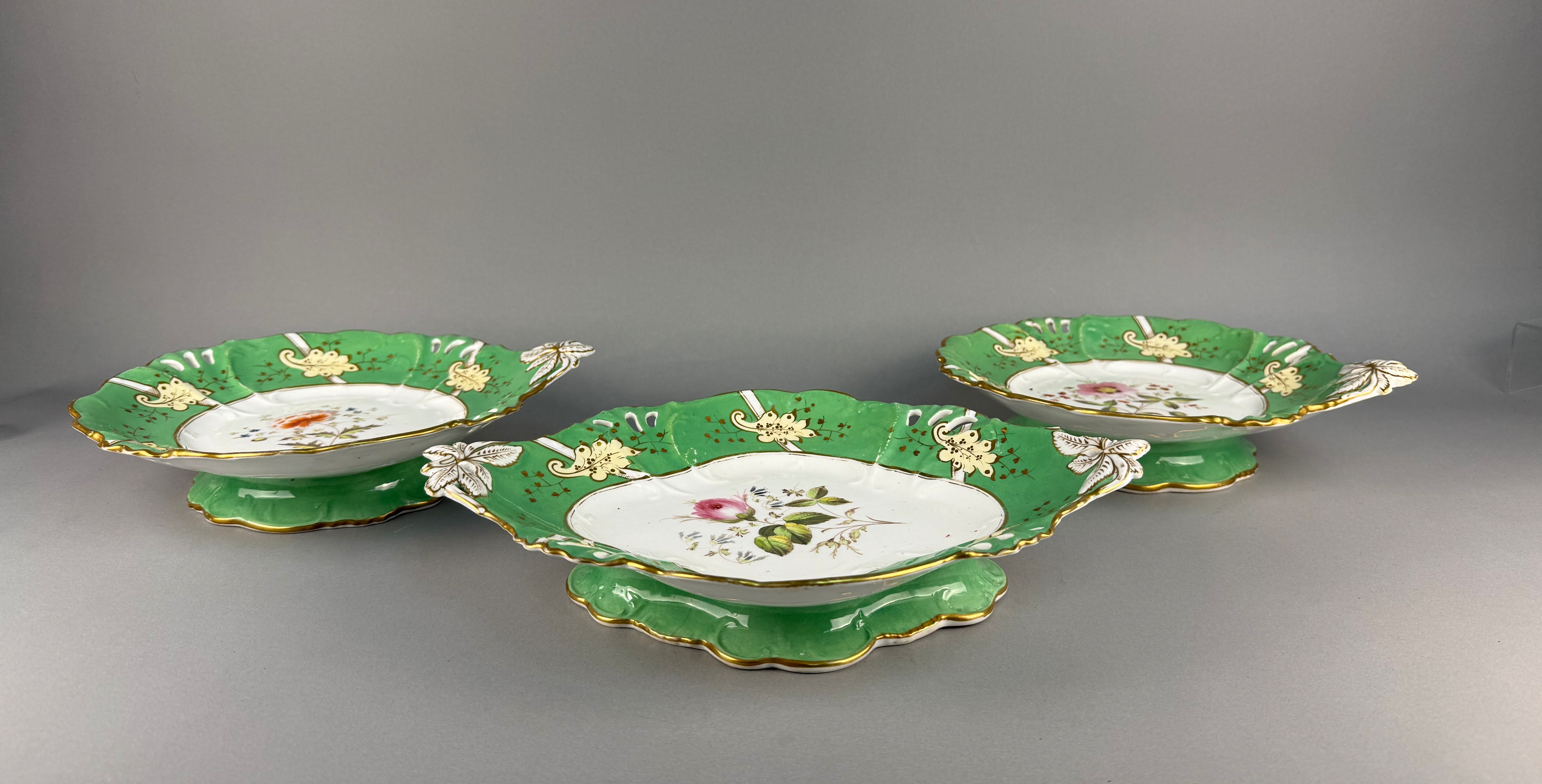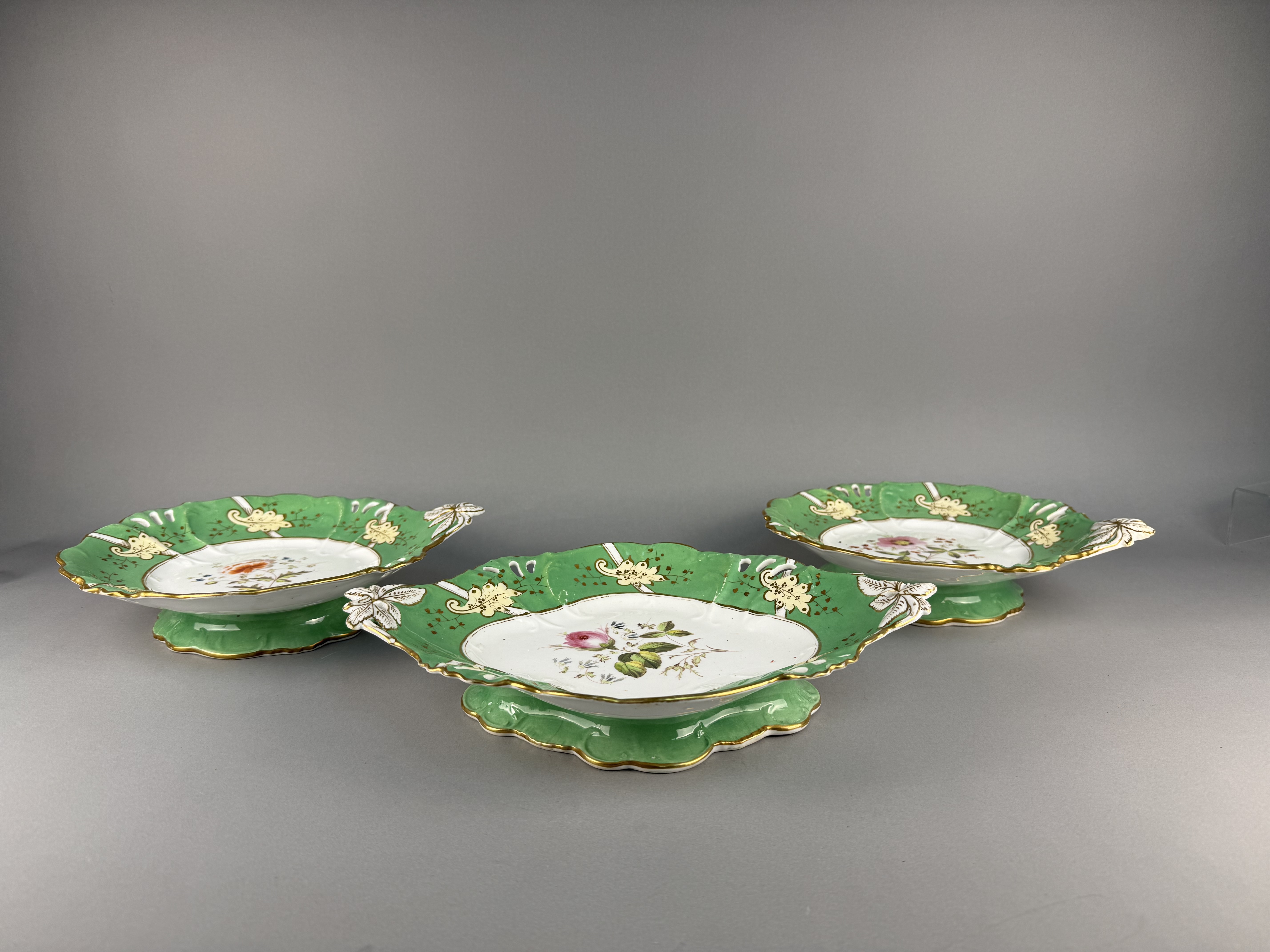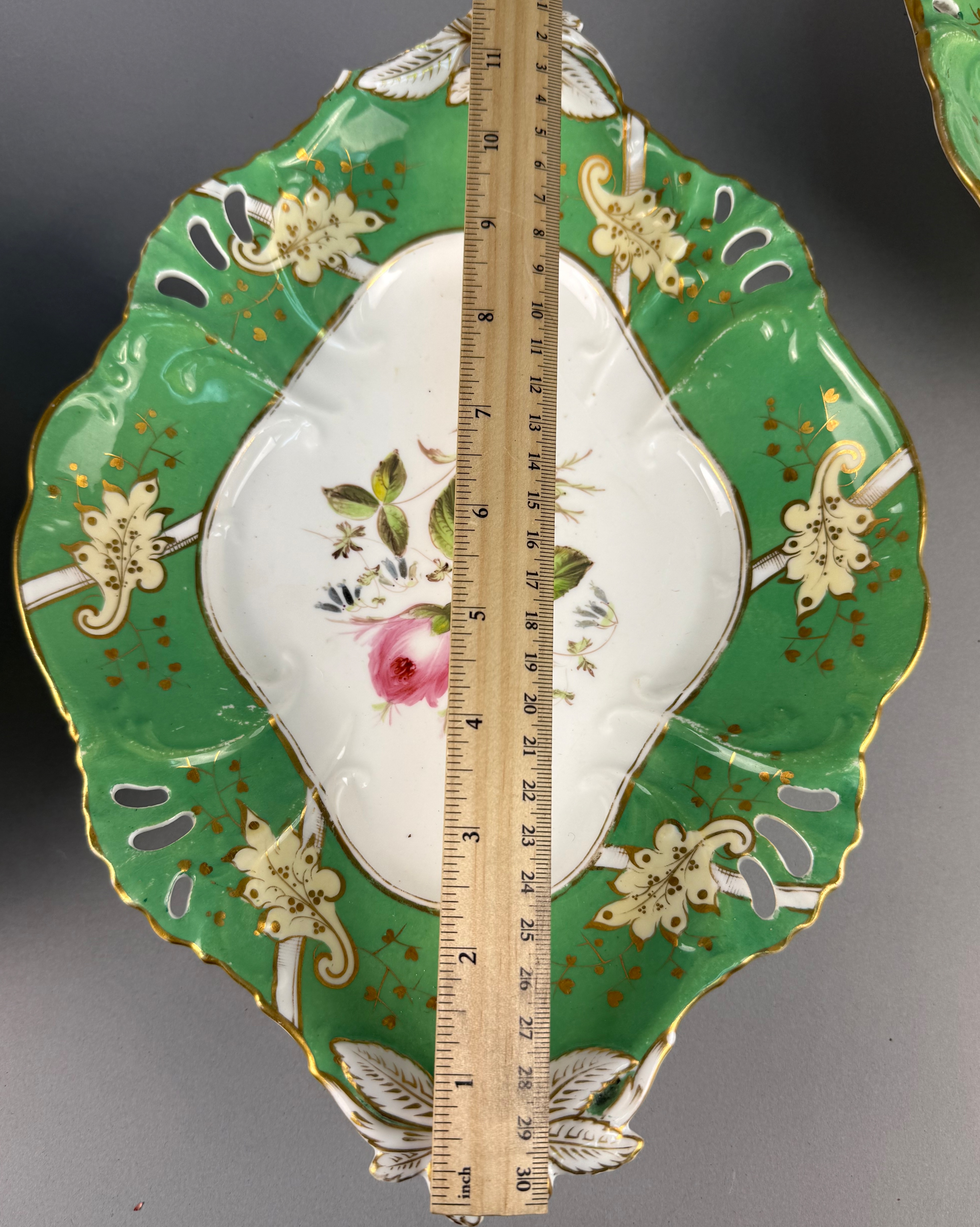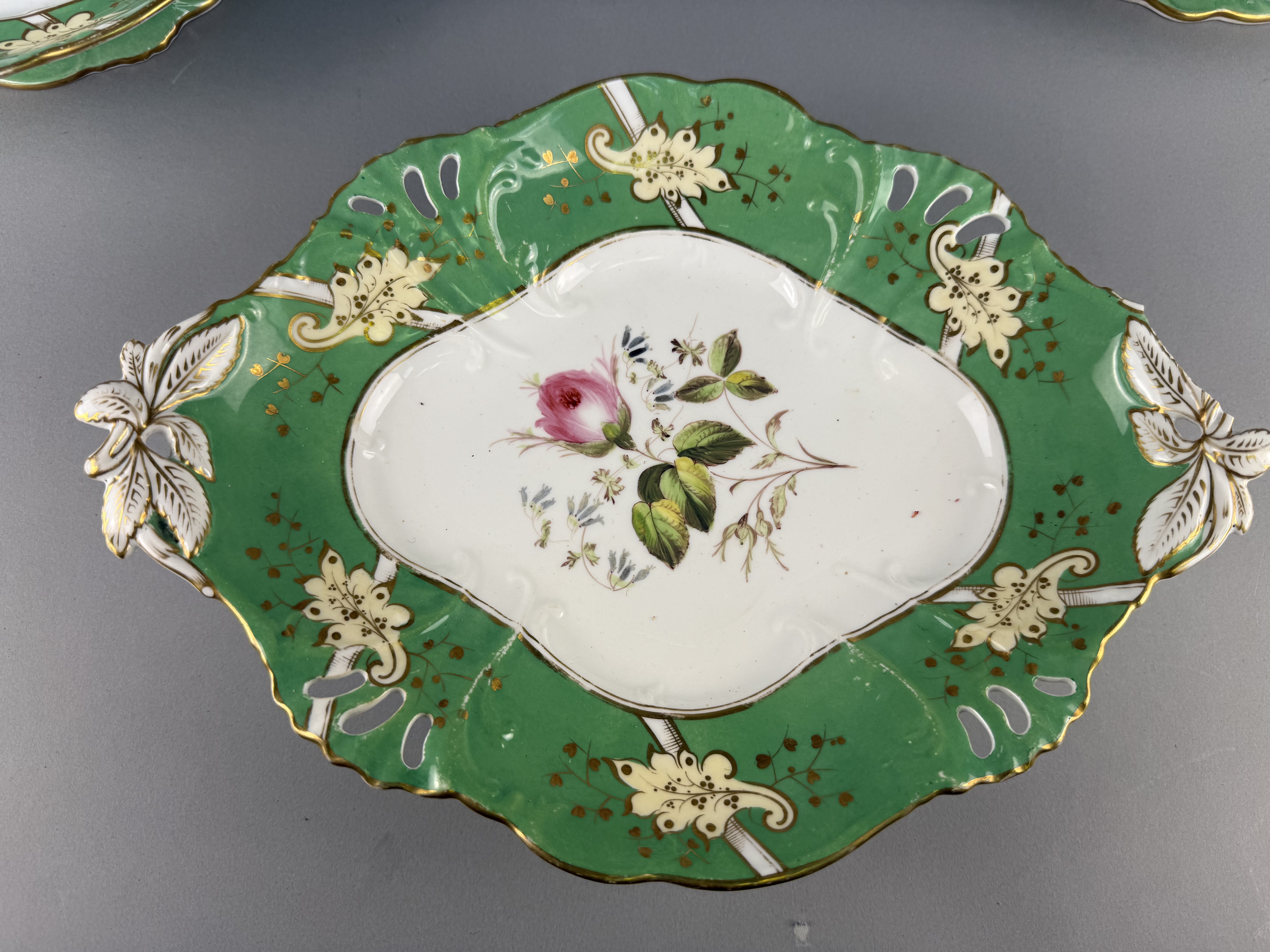 A trio of Victorian-style porcelain pedestal dishes, possibly English and resembling the work of Samuel Alcock or similar Staffordshire potteries. The set comprises one oval twin-handled compote and two circular single-handled compotes. Each vessel features a central hand-painted botanical floral spray on a white ground, framed by a wide apple-green glazed border. The scalloped rims are decorated with reticulated pierced cutouts and molded foliate scrolls, embellished with raised gilding and gilt stippling. The underside of each base displays handwritten characters in pink ink consisting of the numbers 1907 over the number 1 or 2. Each base also features a worn rectangular gold-toned paper label with illegible text. No factory stamps are present. Oval dish: 12 inches length Circular dishes: 10 inches diameter Height: 2.25 inches. The items are in good overall condition with minor wear to the gilding consistent with age. One circular dish shows a fine hairline crack extending from the rim toward the center.