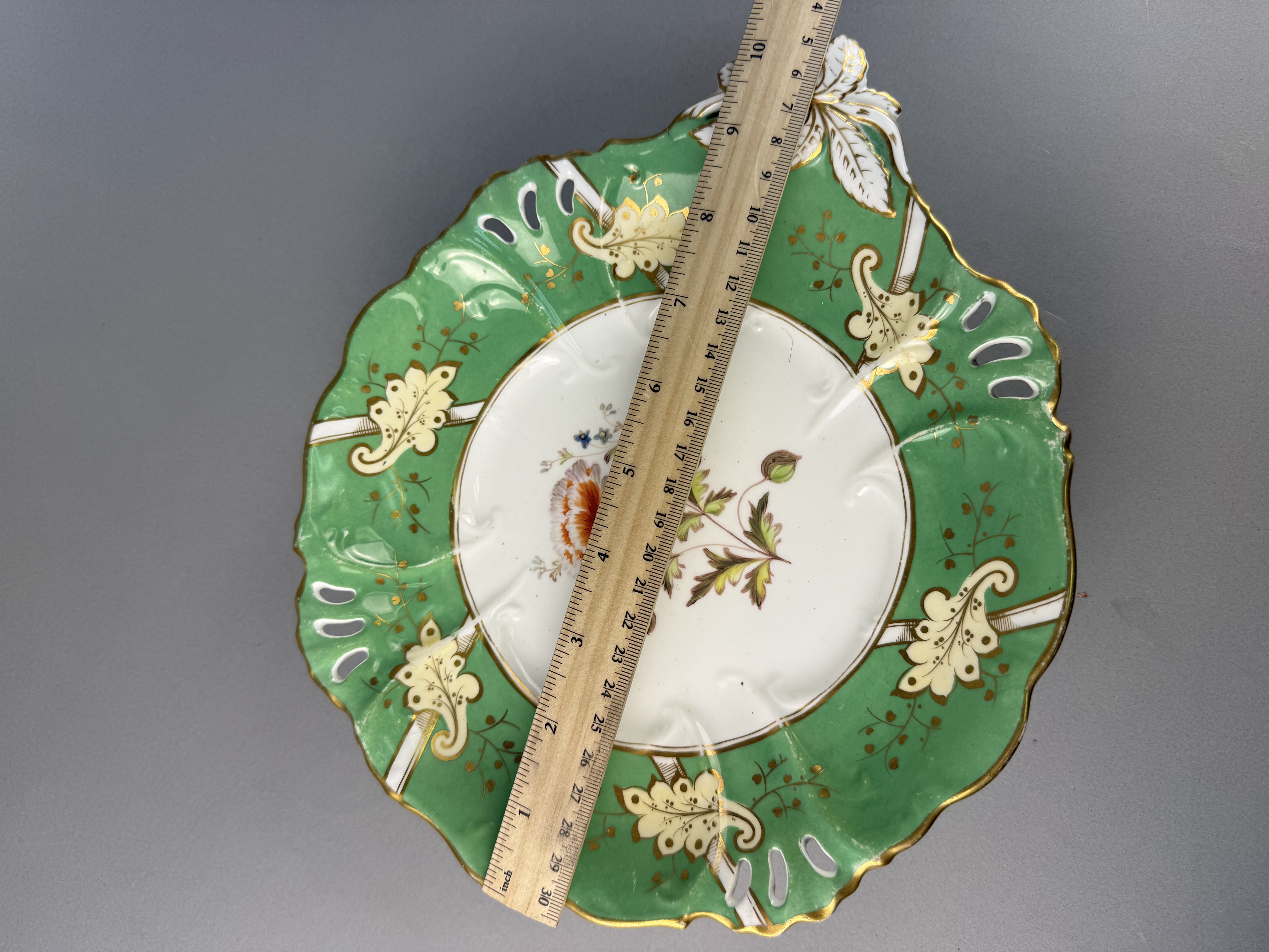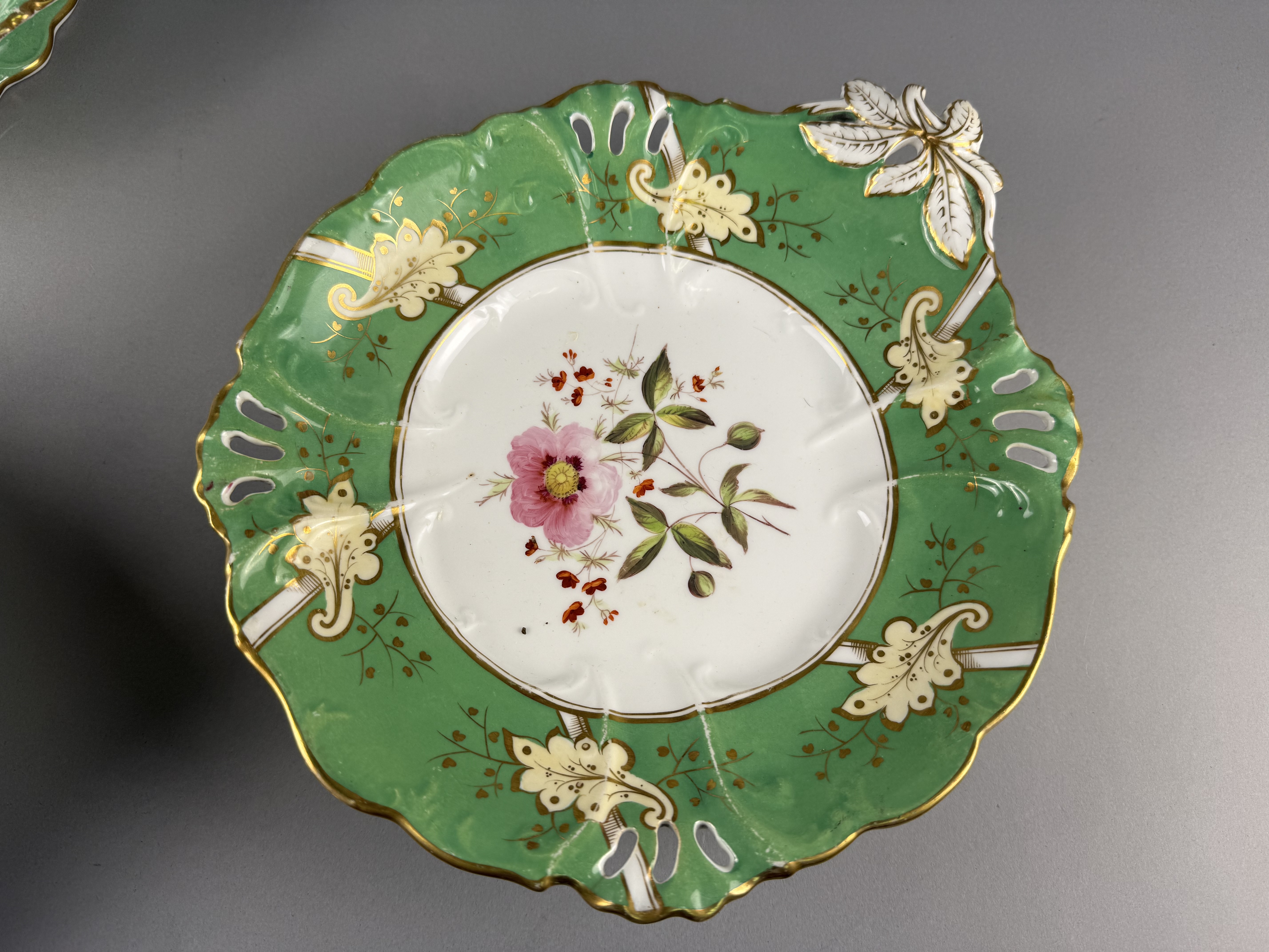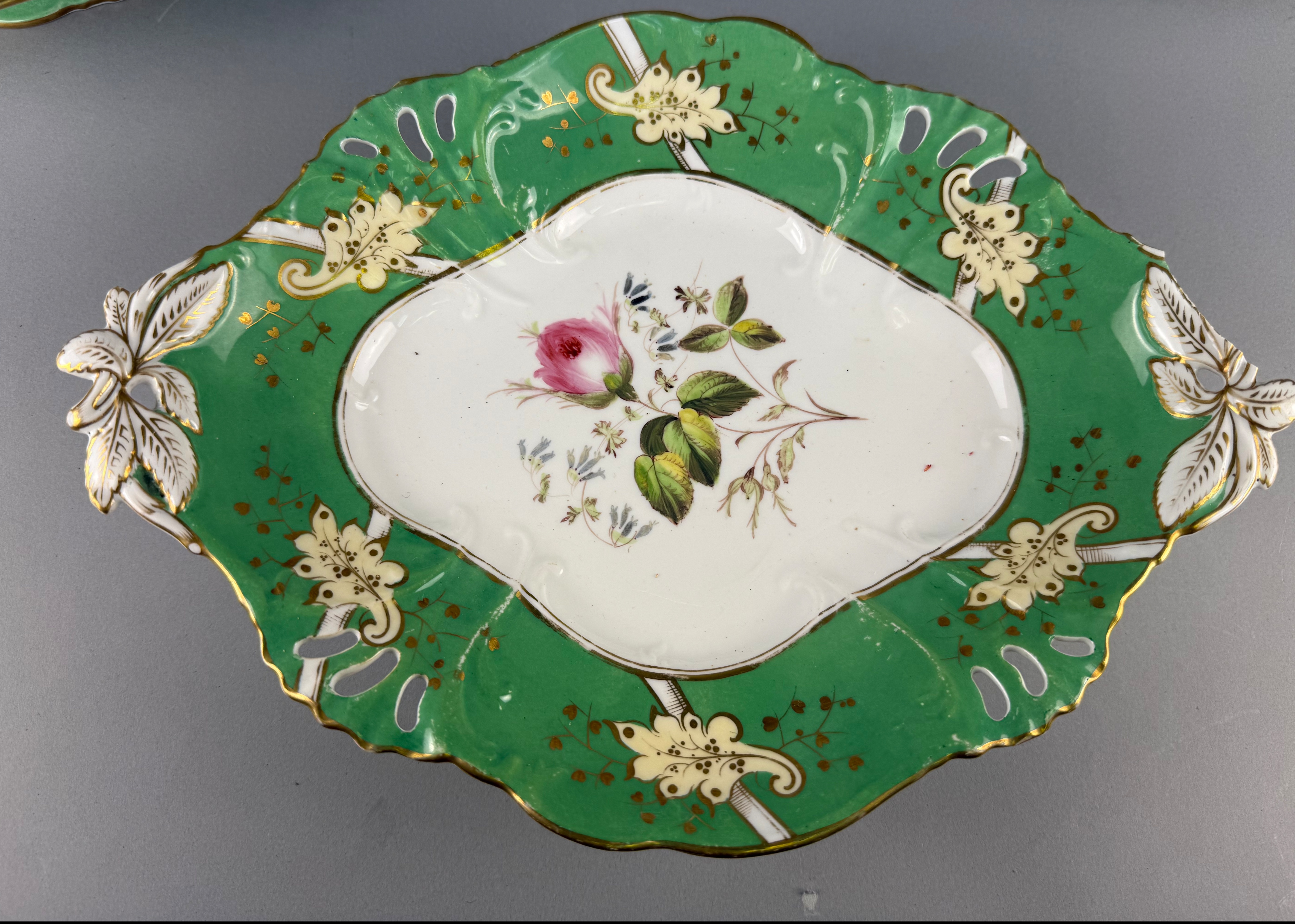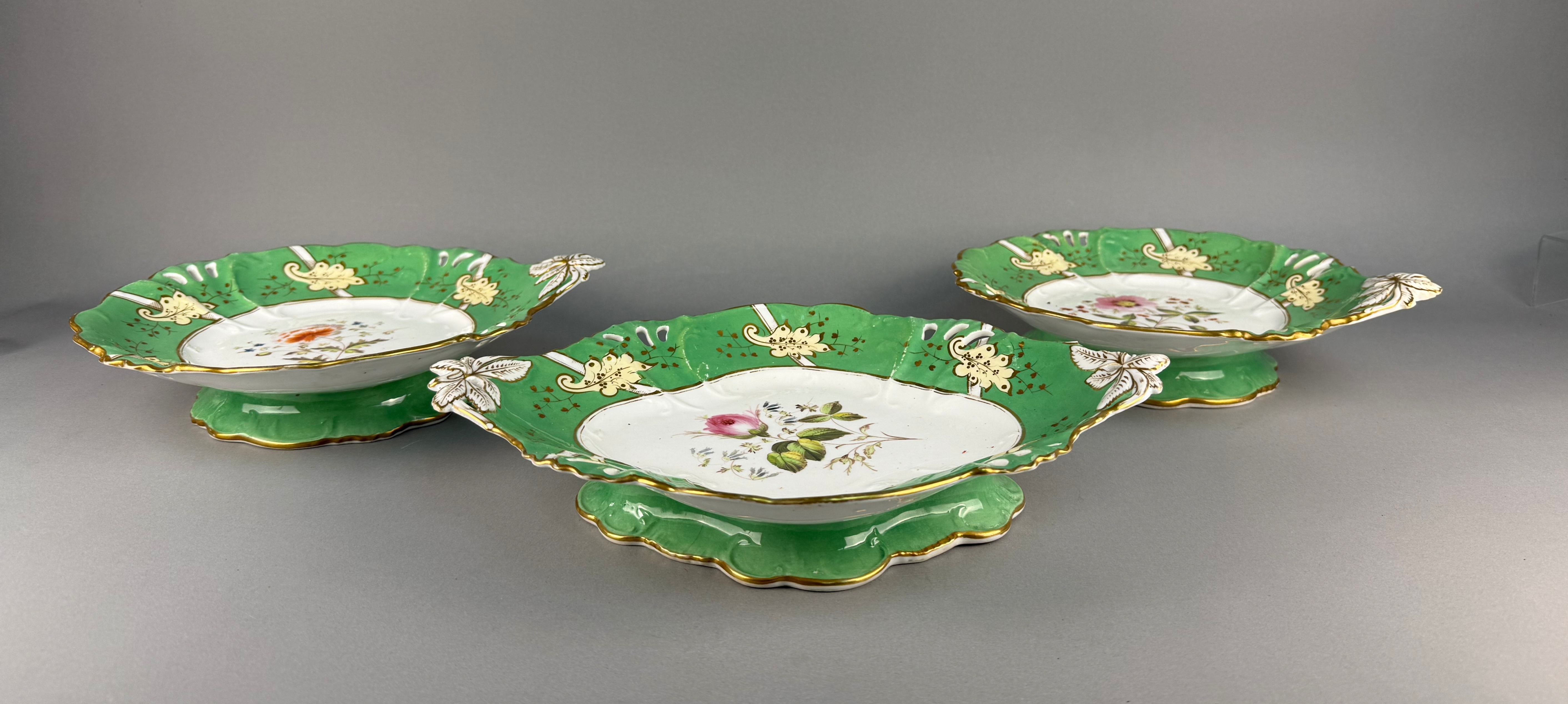 A trio of Victorian-style porcelain pedestal dishes, possibly English and resembling the work of Samuel Alcock or similar Staffordshire potteries. The set comprises one oval twin-handled compote and two circular single-handled compotes. Each vessel features a central hand-painted botanical floral spray on a white ground, framed by a wide apple-green glazed border. The scalloped rims are decorated with reticulated pierced cutouts and molded foliate scrolls, embellished with raised gilding and gilt stippling. The underside of each base displays handwritten characters in pink ink consisting of the numbers 1907 over the number 1 or 2. Each base also features a worn rectangular gold-toned paper label with illegible text. No factory stamps are present. Oval dish: 12 inches length Circular dishes: 10 inches diameter Height: 2.25 inches. The items are in good overall condition with minor wear to the gilding consistent with age. One circular dish shows a fine hairline crack extending from the rim toward the center.