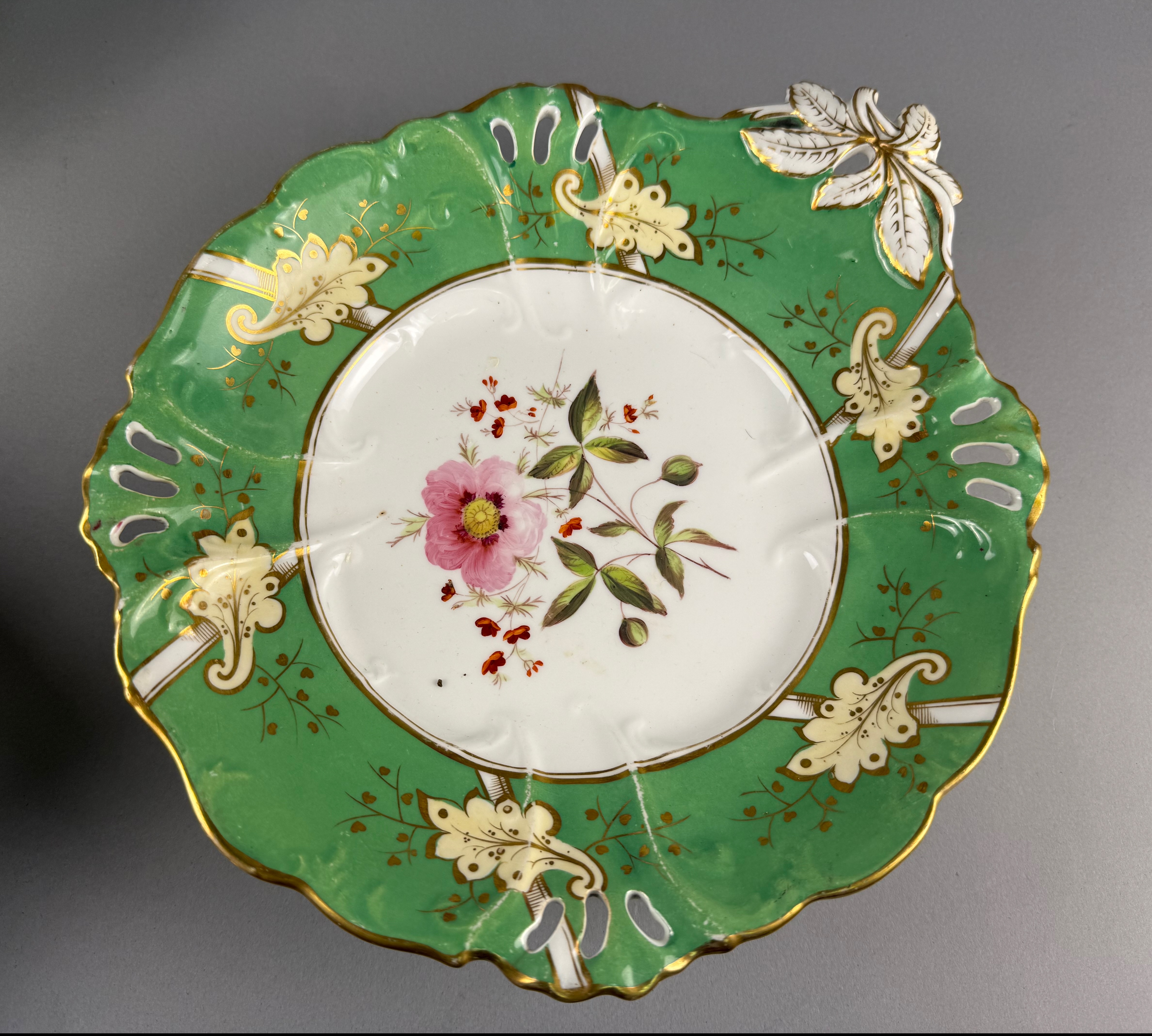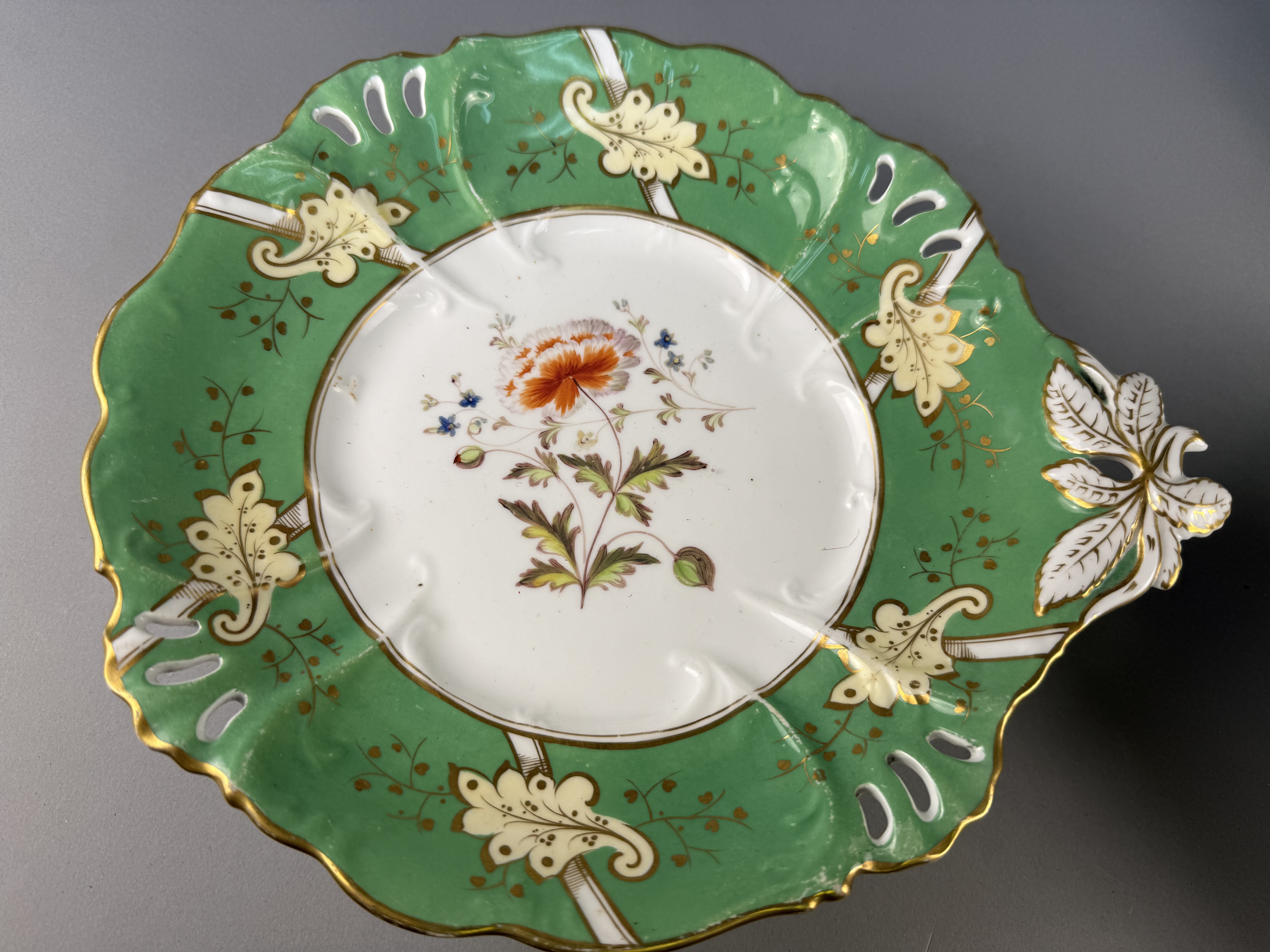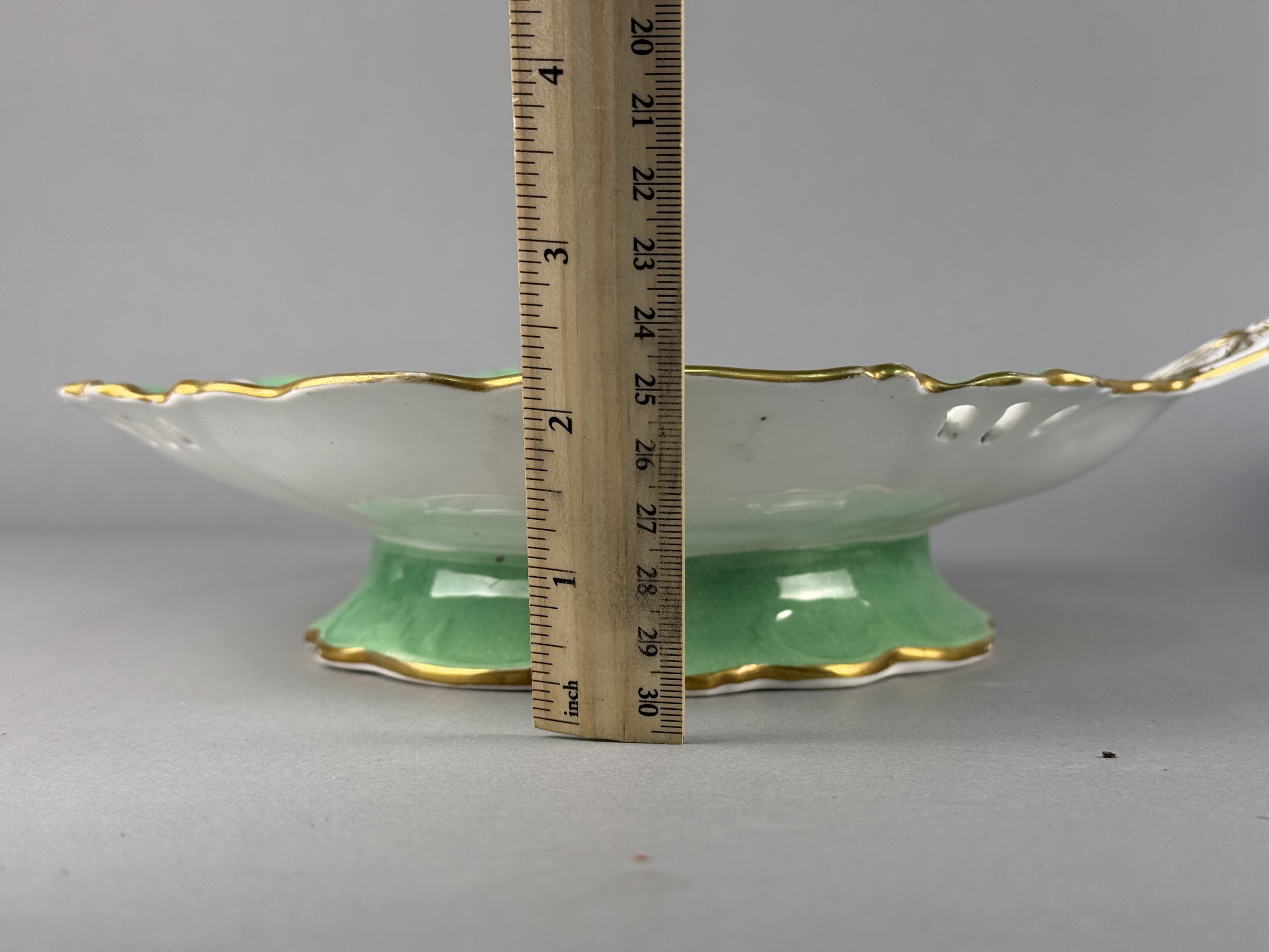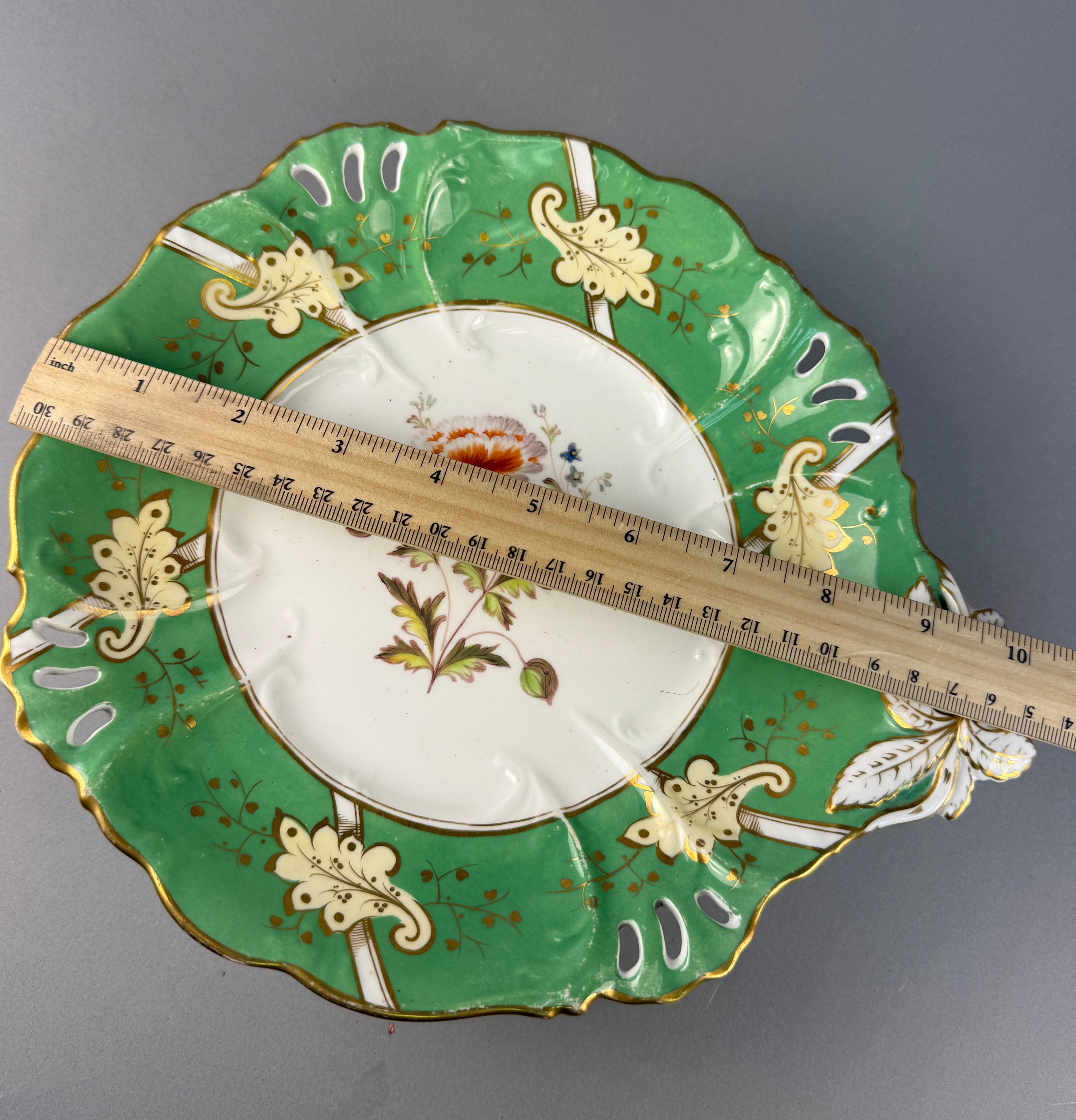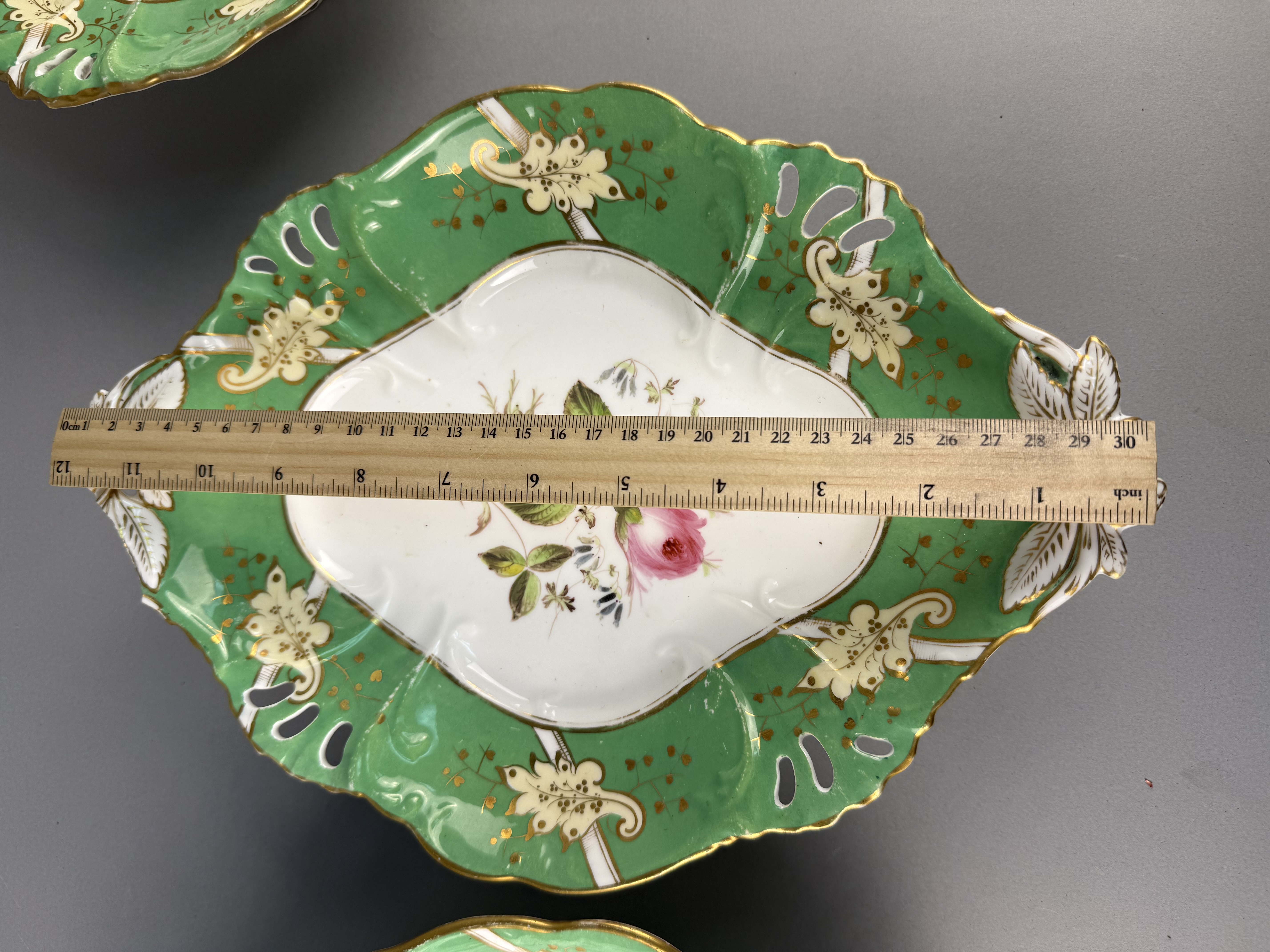 A trio of Victorian-style porcelain pedestal dishes, possibly English and resembling the work of Samuel Alcock or similar Staffordshire potteries. The set comprises one oval twin-handled compote and two circular single-handled compotes. Each vessel features a central hand-painted botanical floral spray on a white ground, framed by a wide apple-green glazed border. The scalloped rims are decorated with reticulated pierced cutouts and molded foliate scrolls, embellished with raised gilding and gilt stippling. The underside of each base displays handwritten characters in pink ink consisting of the numbers 1907 over the number 1 or 2. Each base also features a worn rectangular gold-toned paper label with illegible text. No factory stamps are present. Oval dish: 12 inches length Circular dishes: 10 inches diameter Height: 2.25 inches. The items are in good overall condition with minor wear to the gilding consistent with age. One circular dish shows a fine hairline crack extending from the rim toward the center.