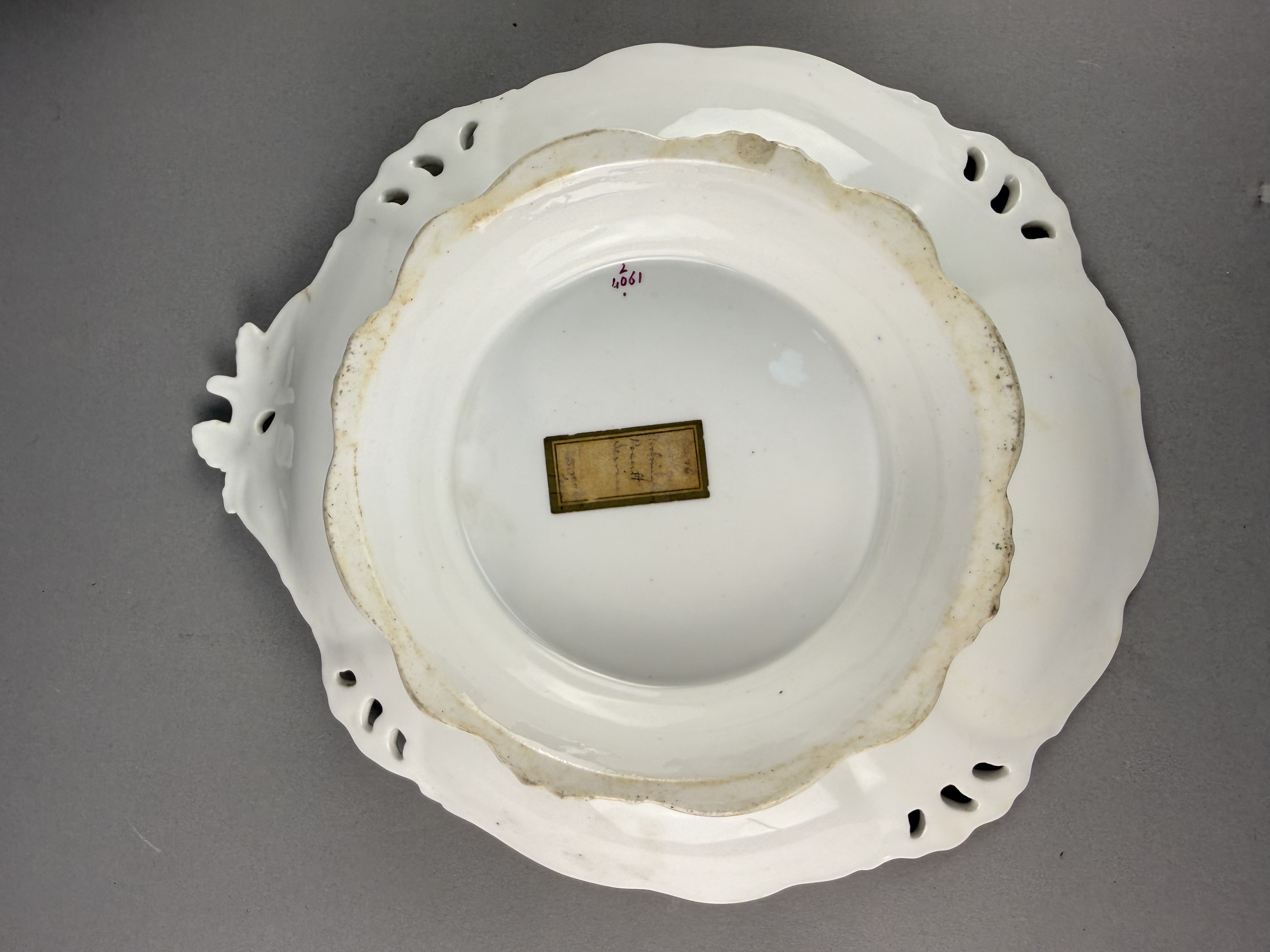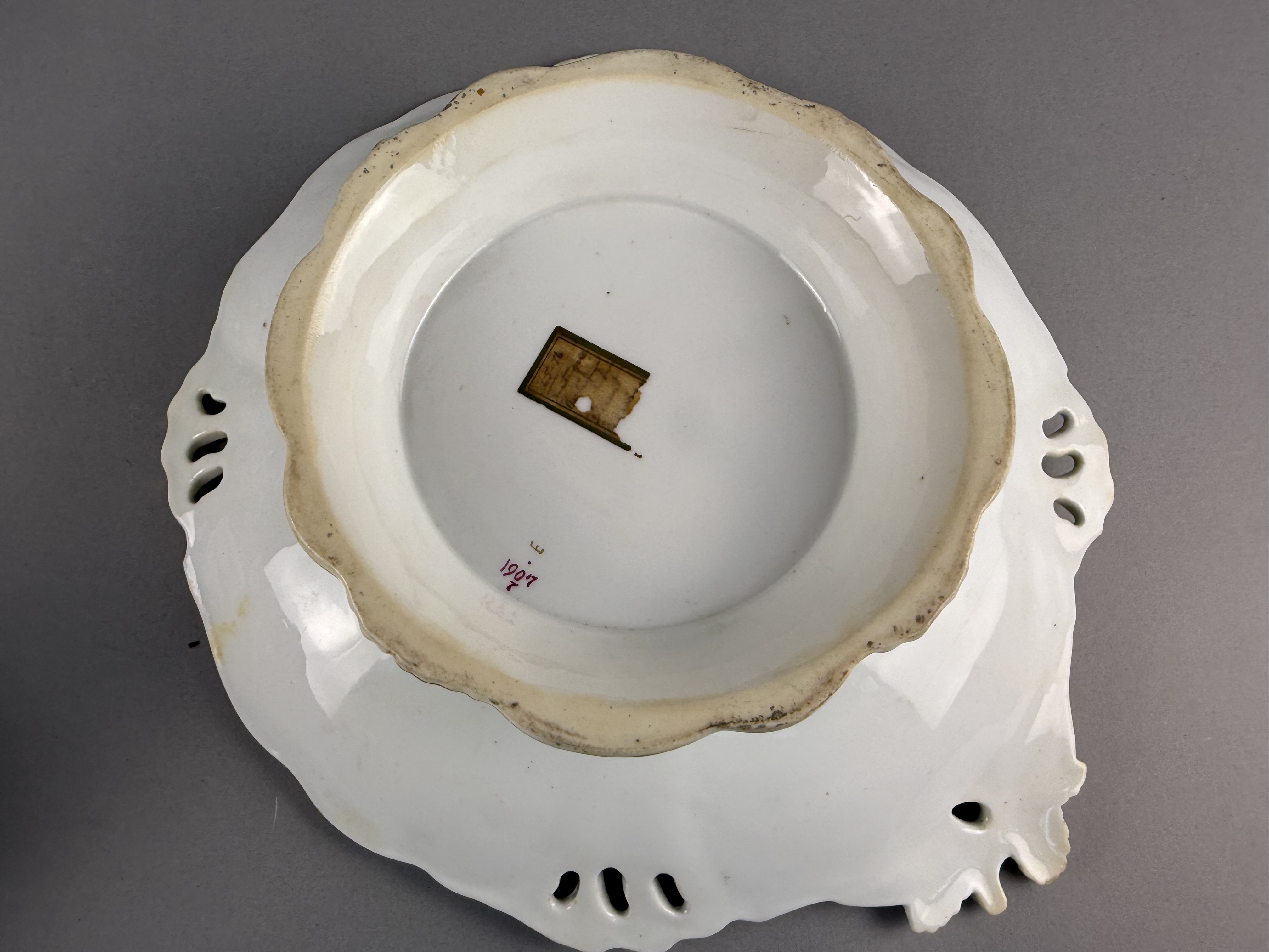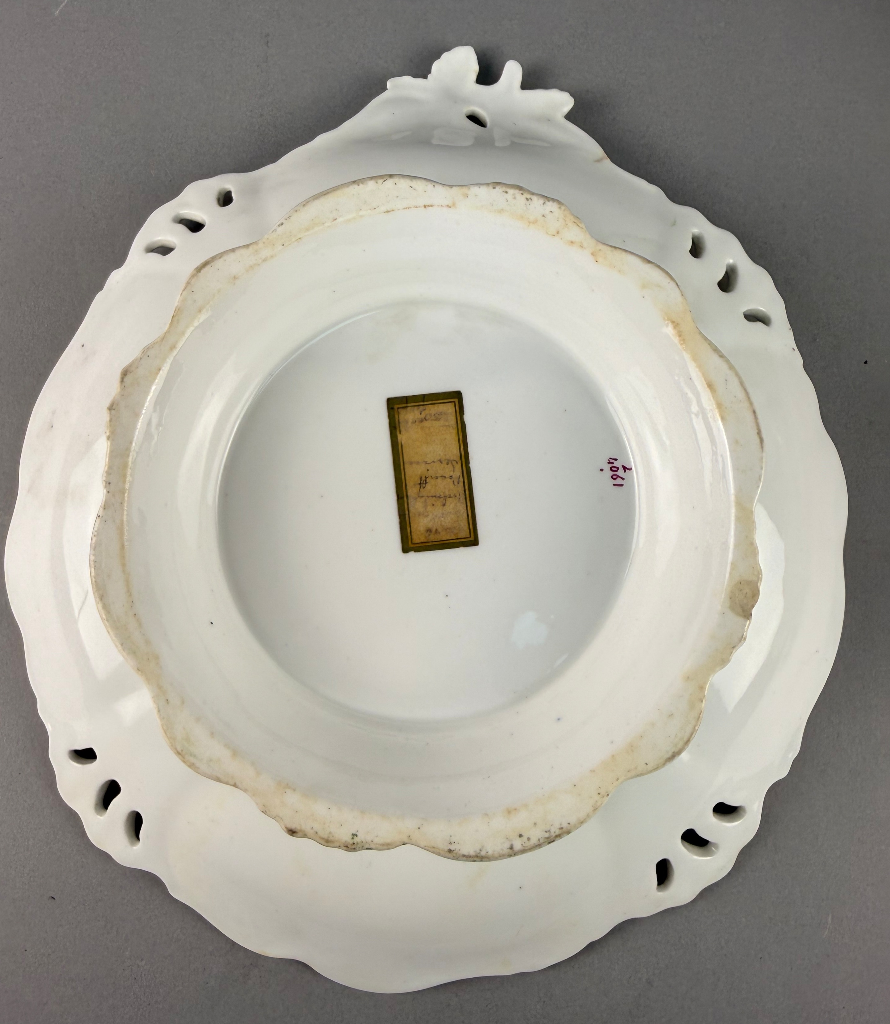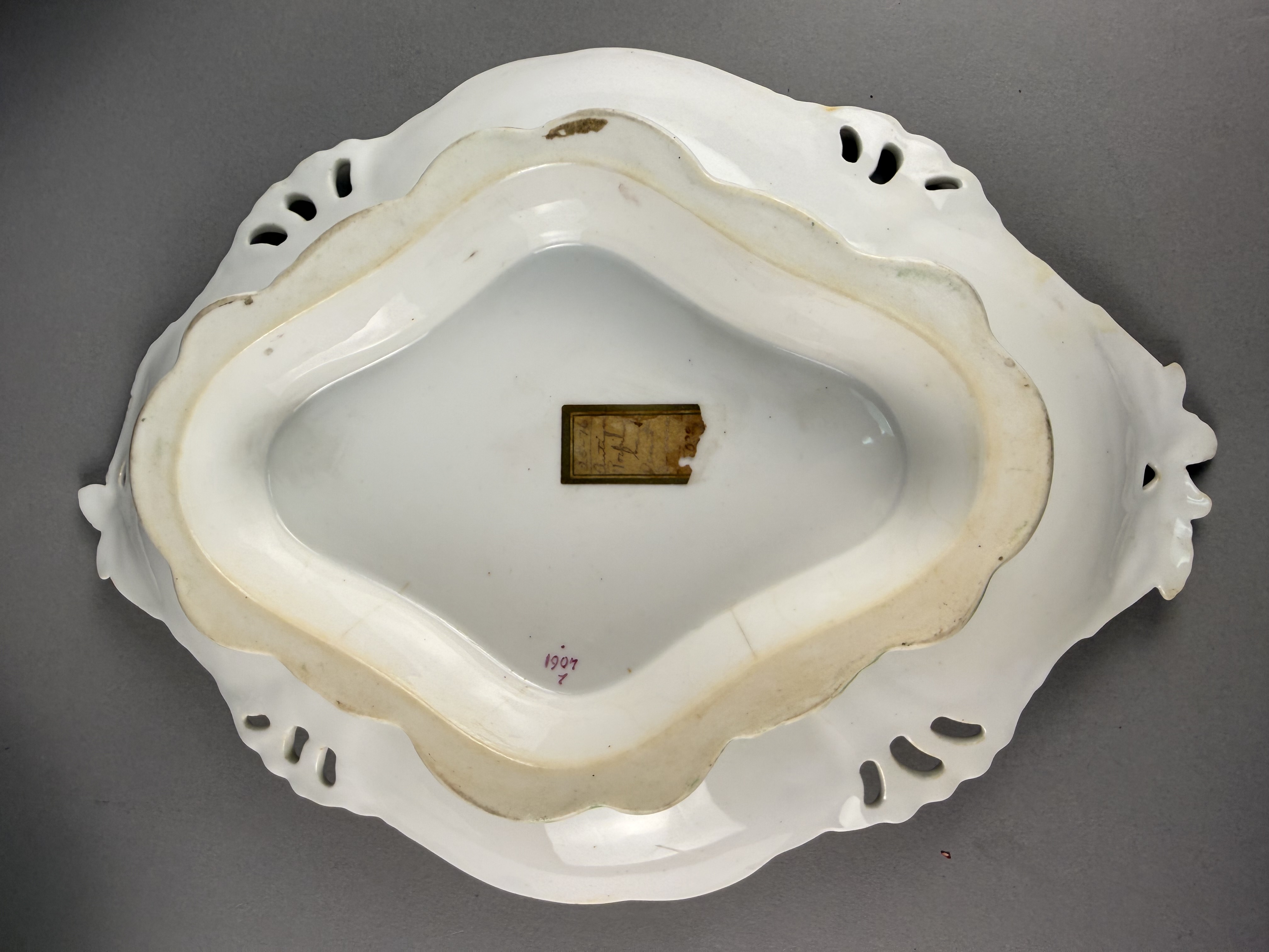 A trio of Victorian-style porcelain pedestal dishes, possibly English and resembling the work of Samuel Alcock or similar Staffordshire potteries. The set comprises one oval twin-handled compote and two circular single-handled compotes. Each vessel features a central hand-painted botanical floral spray on a white ground, framed by a wide apple-green glazed border. The scalloped rims are decorated with reticulated pierced cutouts and molded foliate scrolls, embellished with raised gilding and gilt stippling. The underside of each base displays handwritten characters in pink ink consisting of the numbers 1907 over the number 1 or 2. Each base also features a worn rectangular gold-toned paper label with illegible text. No factory stamps are present. Oval dish: 12 inches length Circular dishes: 10 inches diameter Height: 2.25 inches. The items are in good overall condition with minor wear to the gilding consistent with age. One circular dish shows a fine hairline crack extending from the rim toward the center.