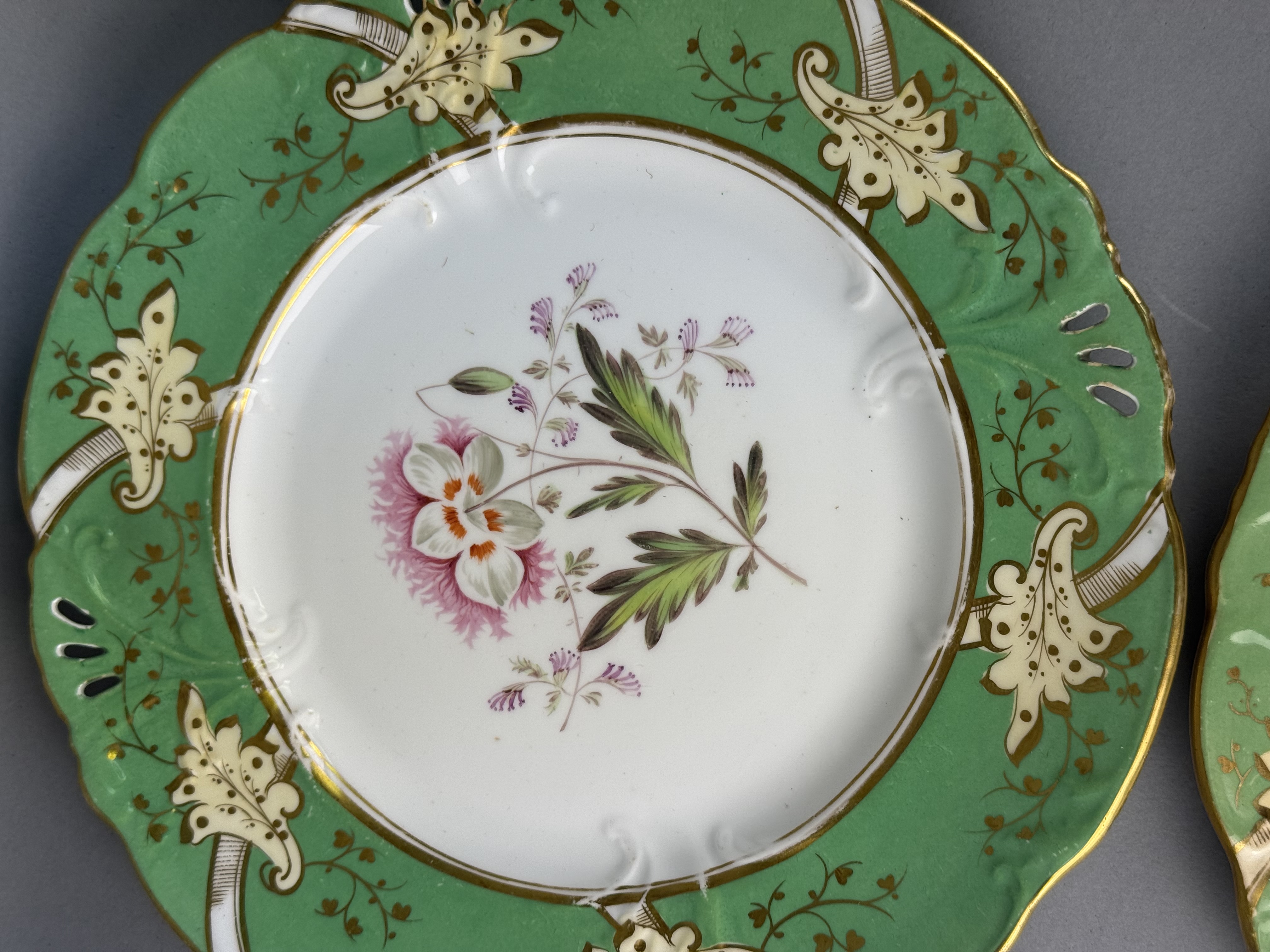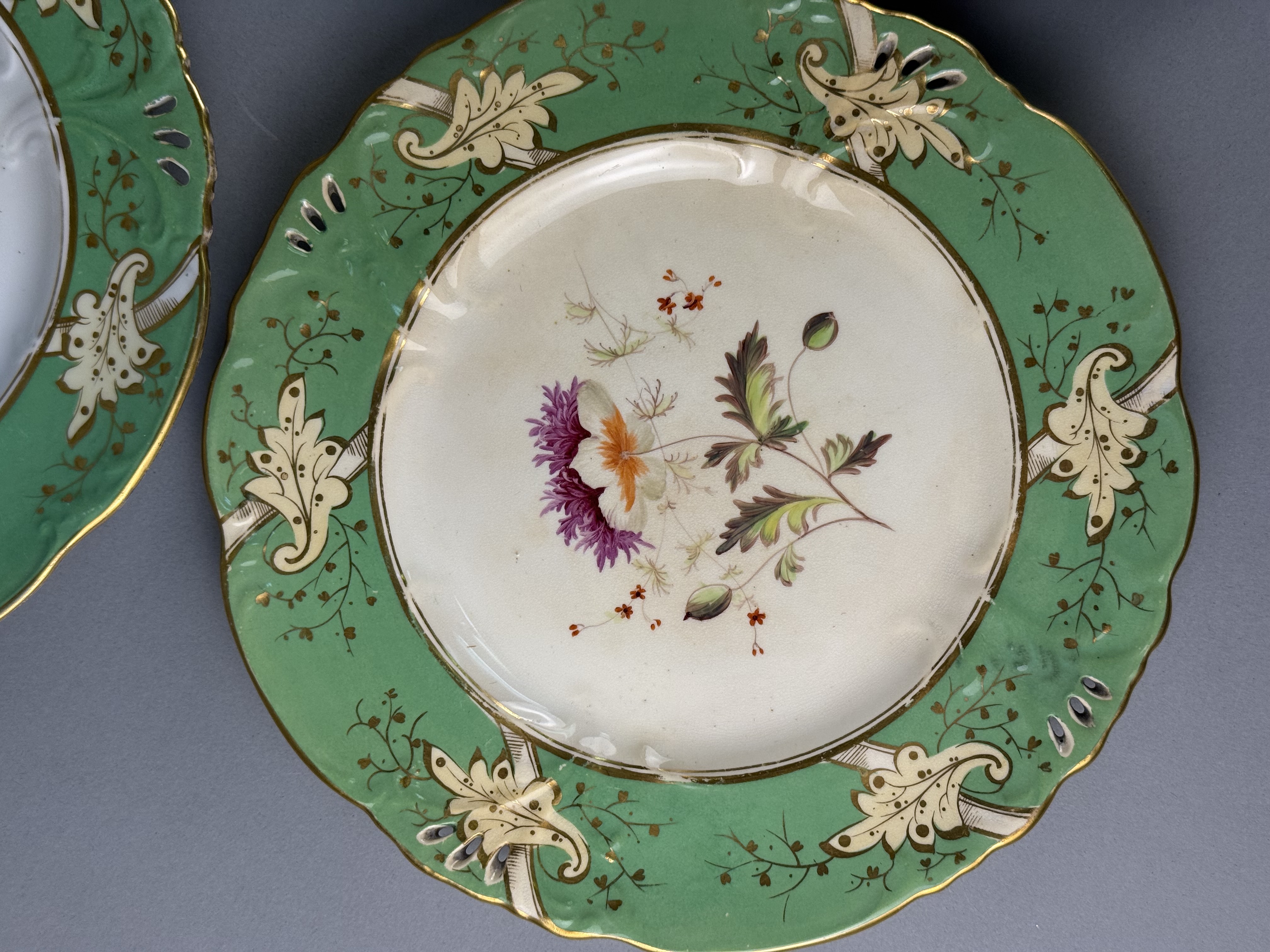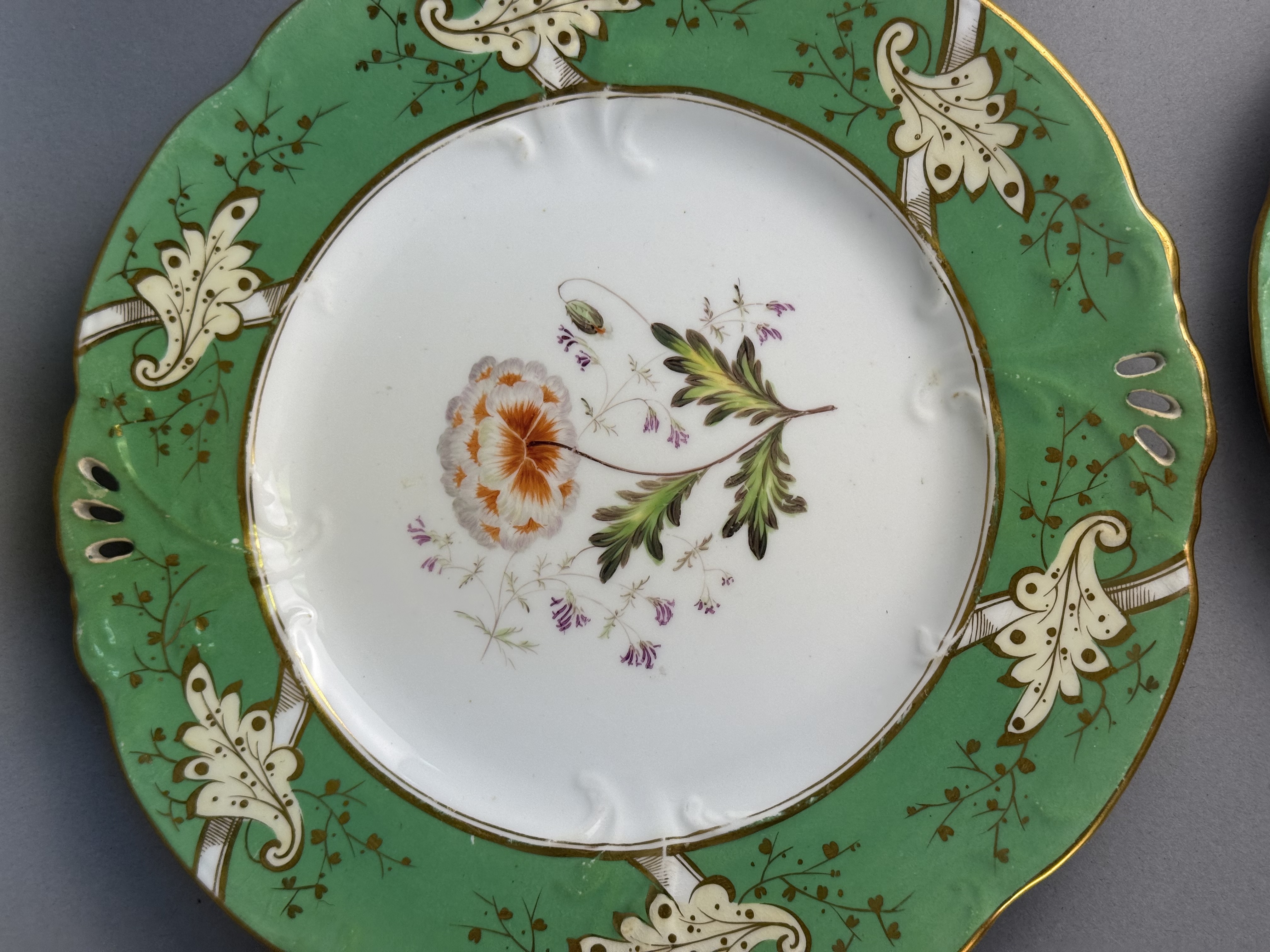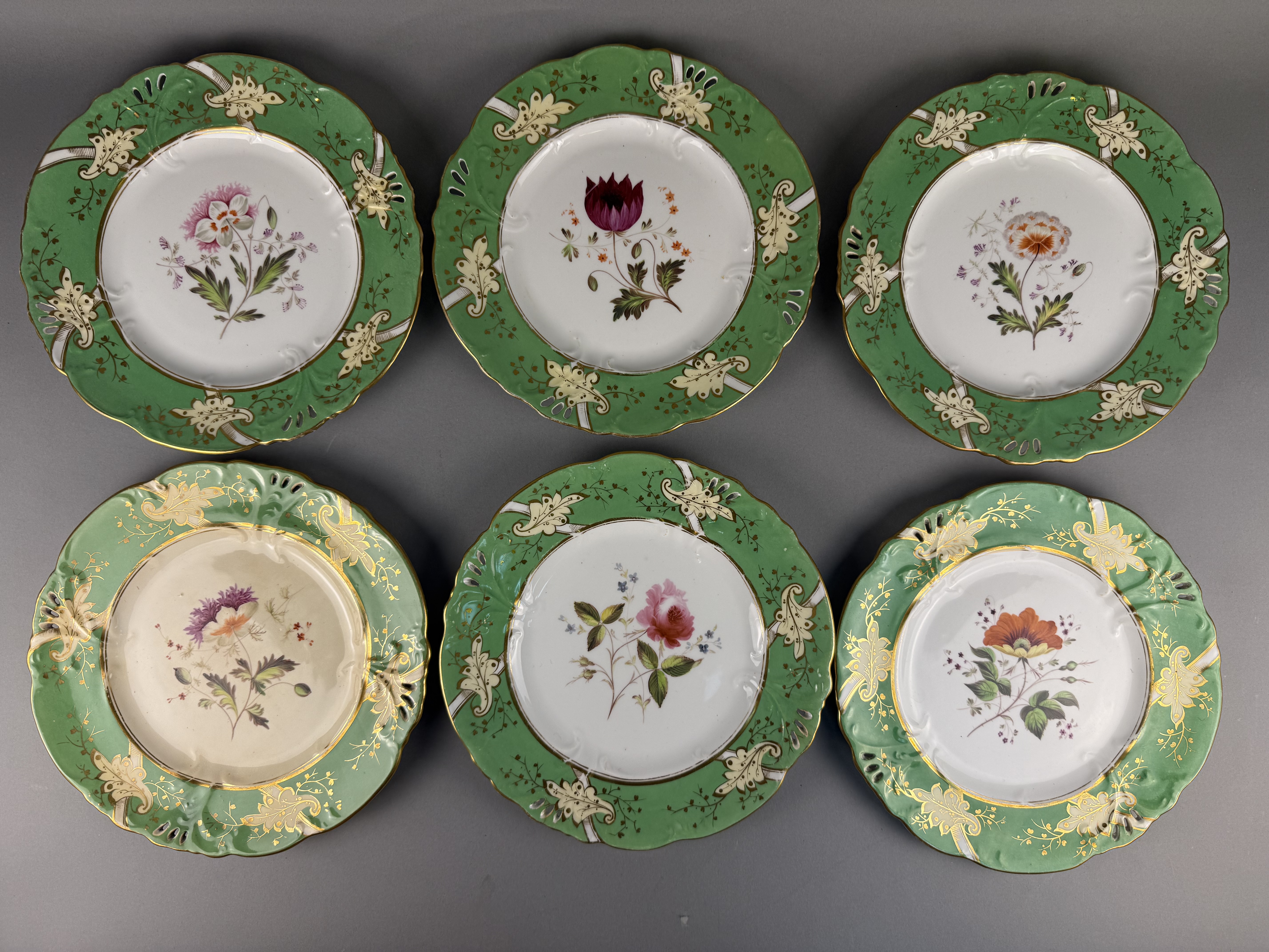 A set of porcelain dessert plates featuring central hand-painted polychrome enamel botanical studies, including specimens such as roses, tulips, and pansies. Each plate is designed with a wide apple-green ground border enriched with molded foliate and acanthus scroll motifs in a cream tone. The borders are further decorated with gilded vine-and-leaf patterns and finished with scalloped, gold-rimmed edges. Several plates in the group incorporate reticulated or pierced sections within the molded border design. The reverse of at least one plate bears hand-painted red marks consisting of the numerals 1904 and a script 2. The form and decoration are characteristic of mid-19th century Paris porcelain, often attributed to decorators such as Feuillet or Boyer.