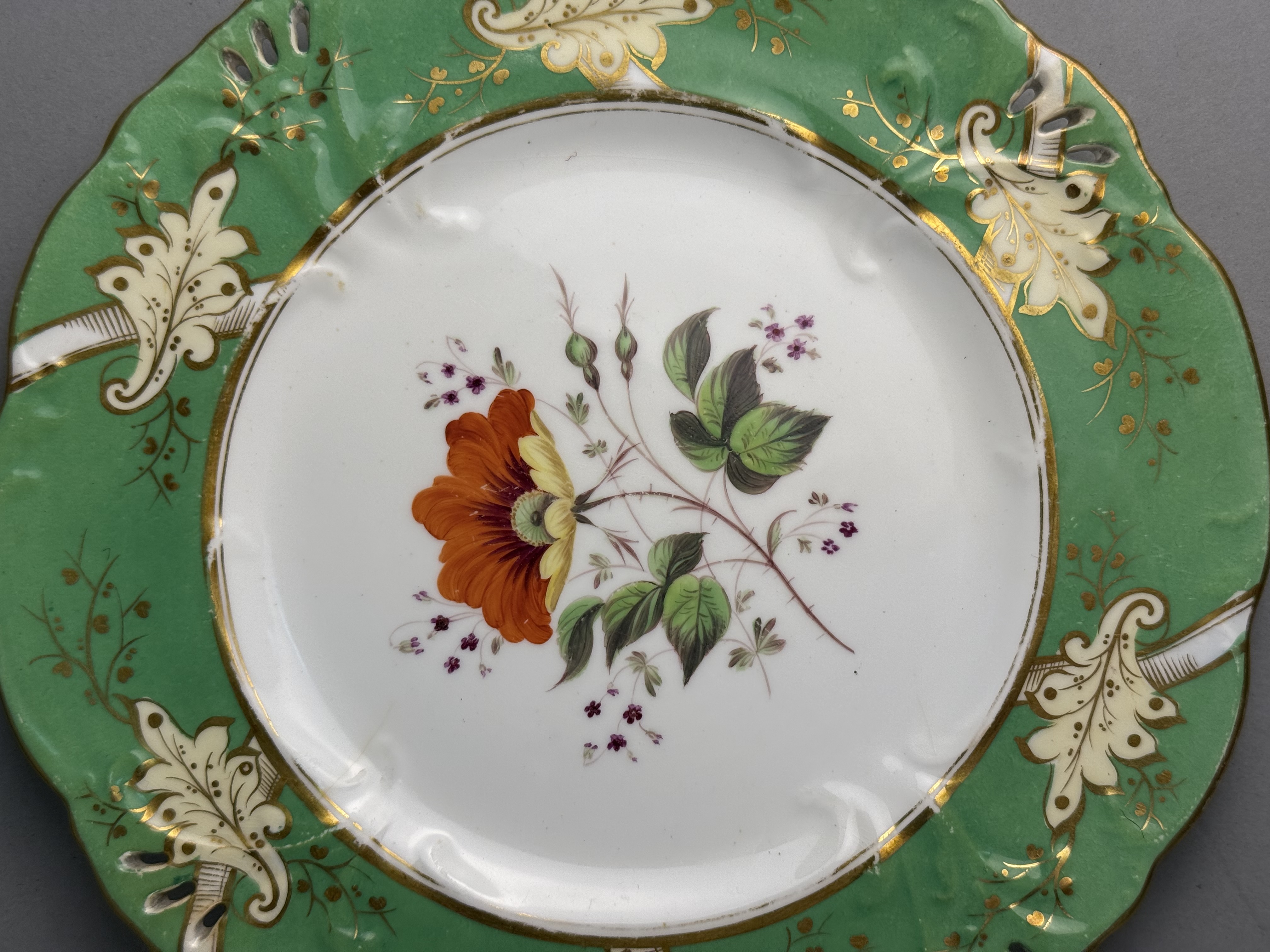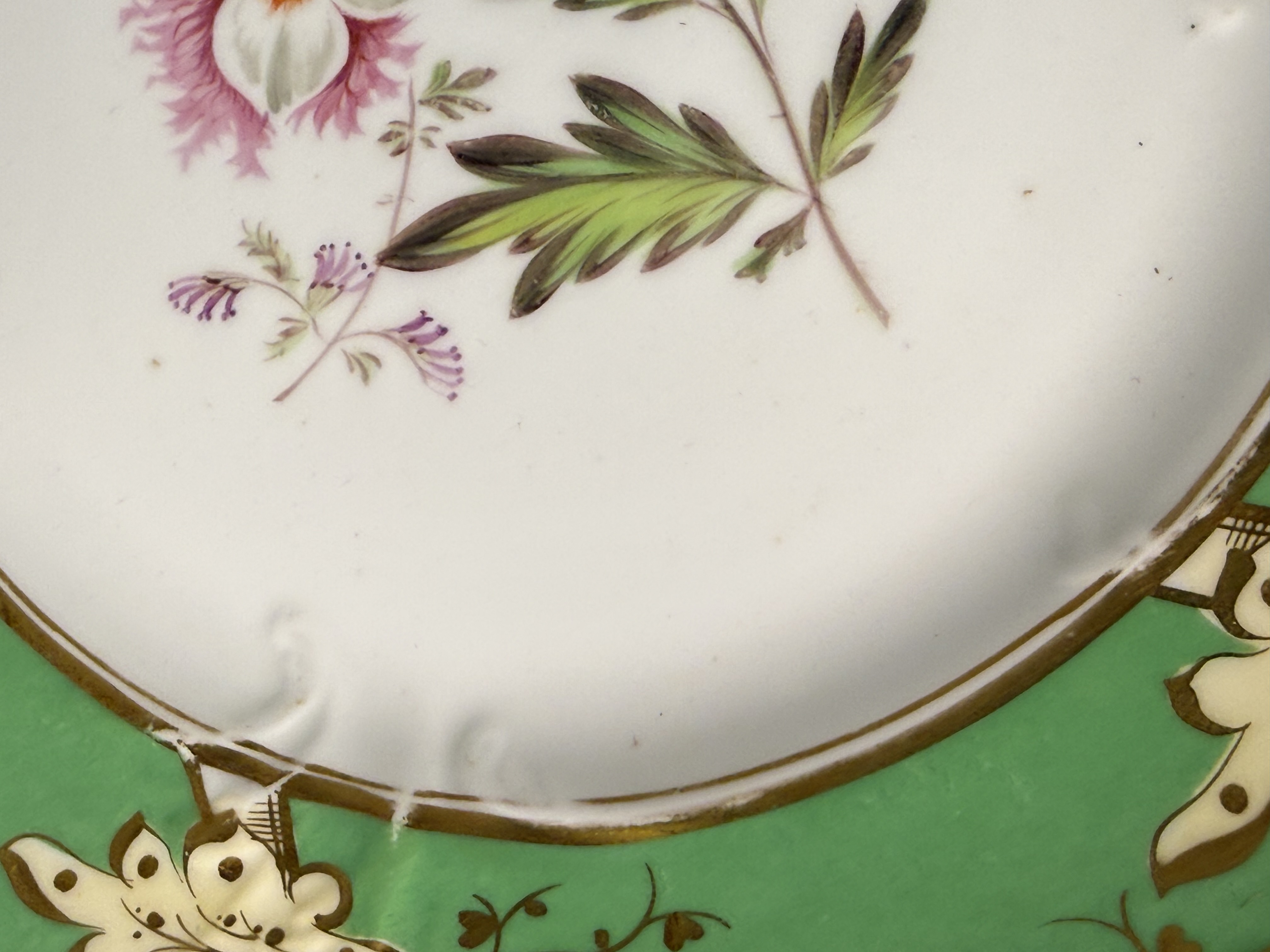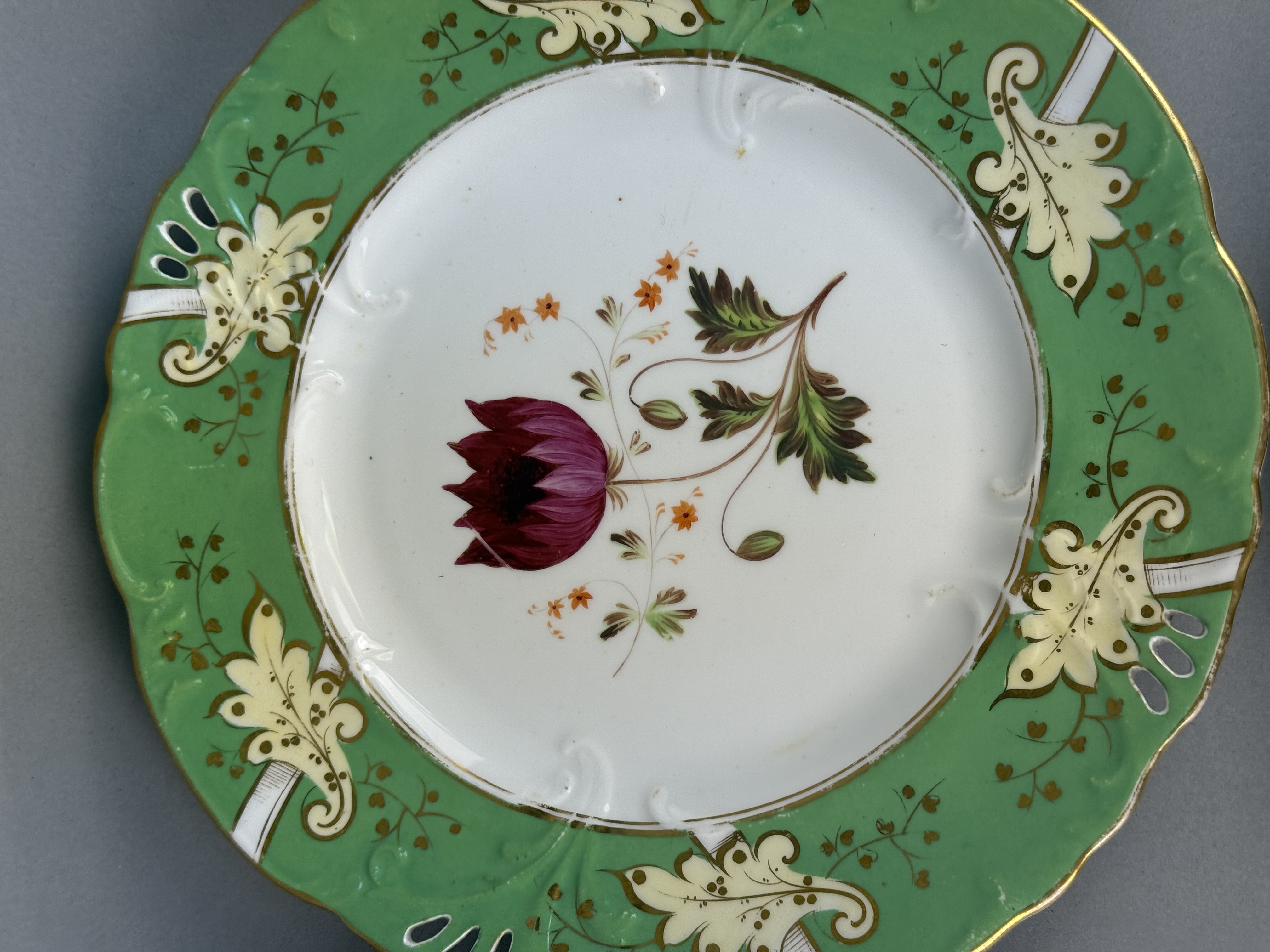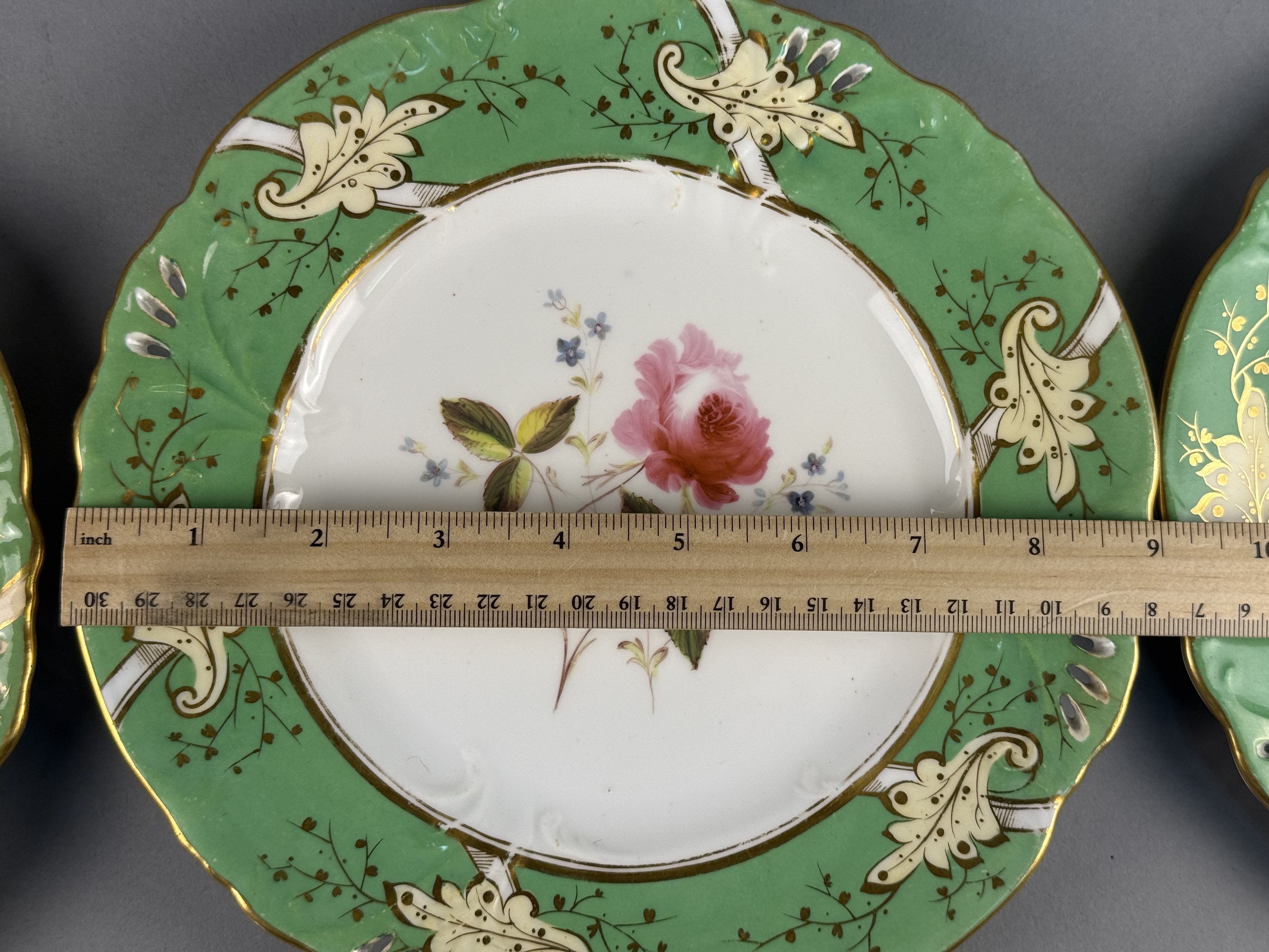 A set of porcelain dessert plates featuring central hand-painted polychrome enamel botanical studies, including specimens such as roses, tulips, and pansies. Each plate is designed with a wide apple-green ground border enriched with molded foliate and acanthus scroll motifs in a cream tone. The borders are further decorated with gilded vine-and-leaf patterns and finished with scalloped, gold-rimmed edges. Several plates in the group incorporate reticulated or pierced sections within the molded border design. The reverse of at least one plate bears hand-painted red marks consisting of the numerals 1904 and a script 2. The form and decoration are characteristic of mid-19th century Paris porcelain, often attributed to decorators such as Feuillet or Boyer.