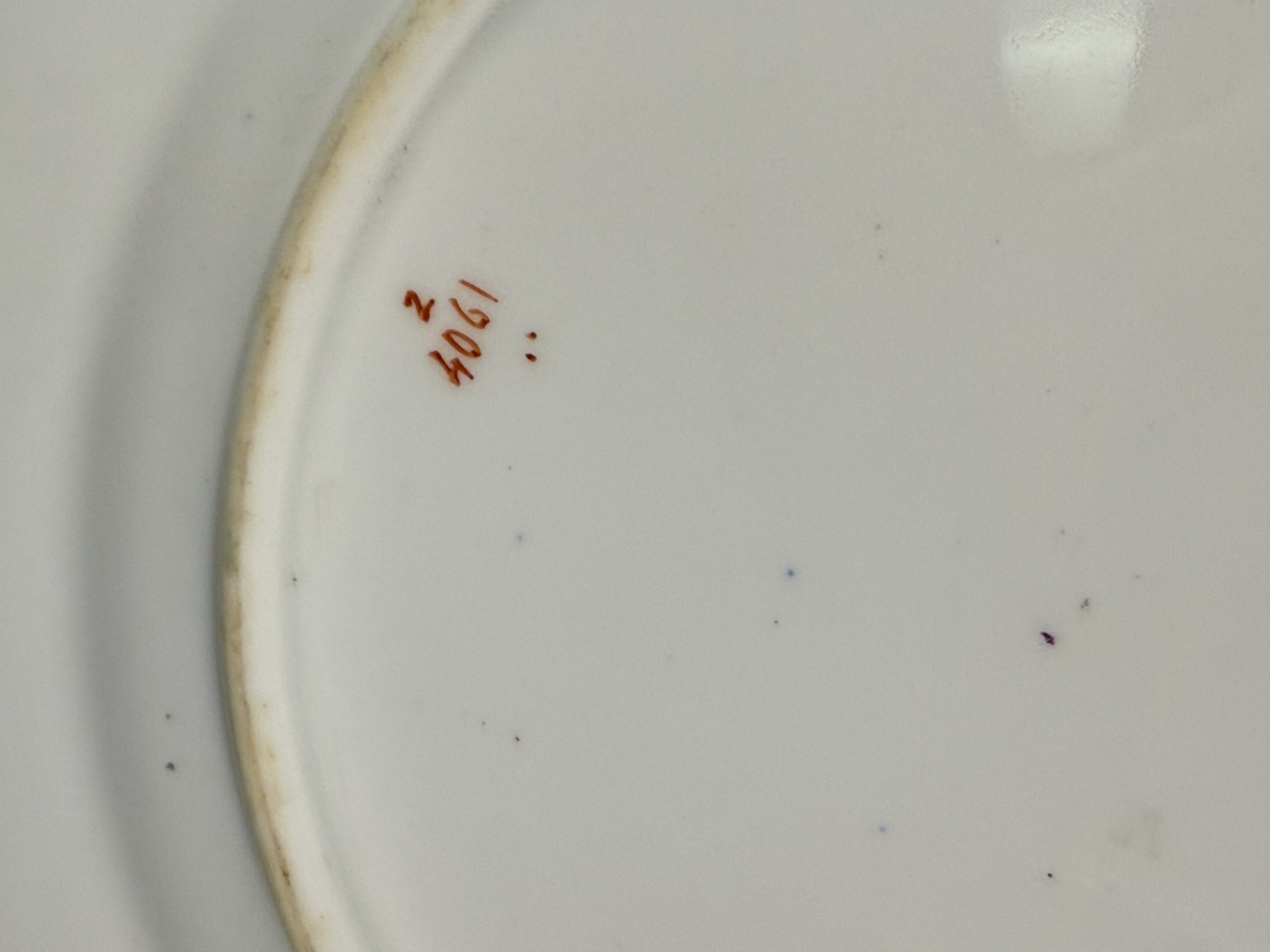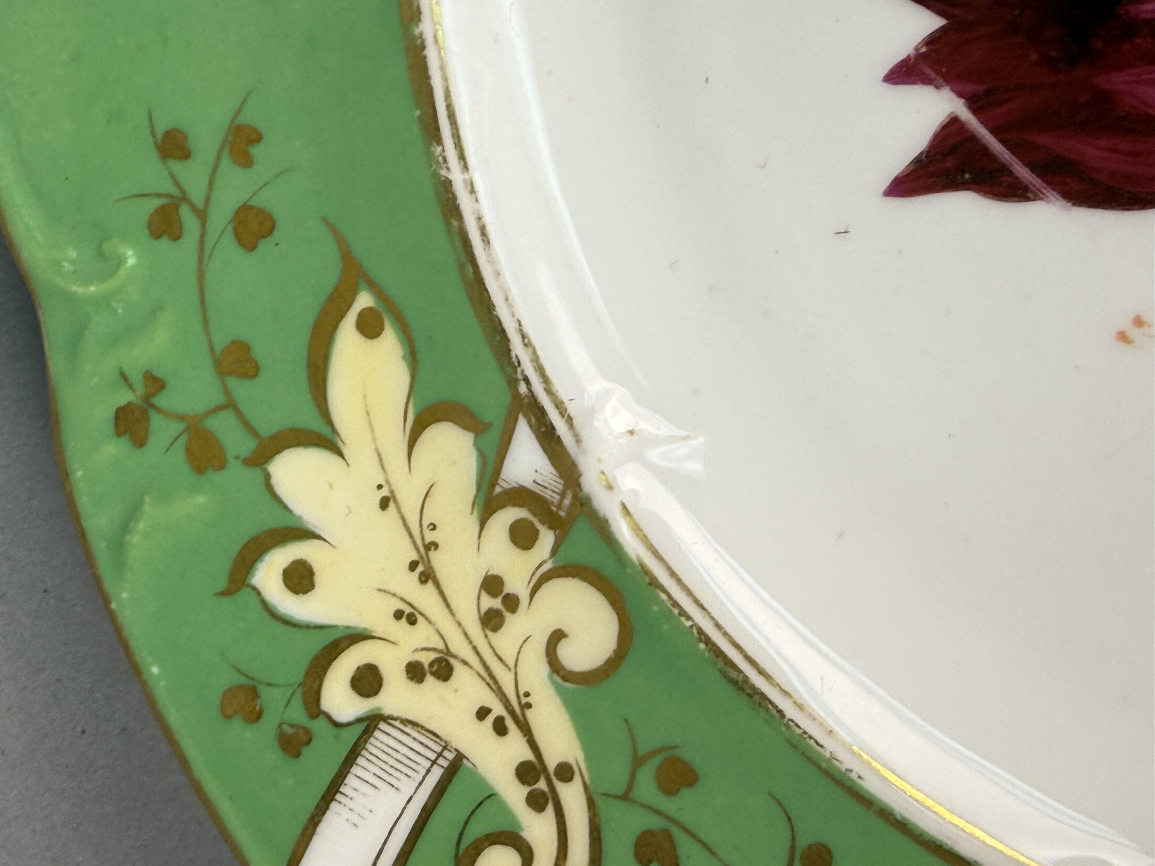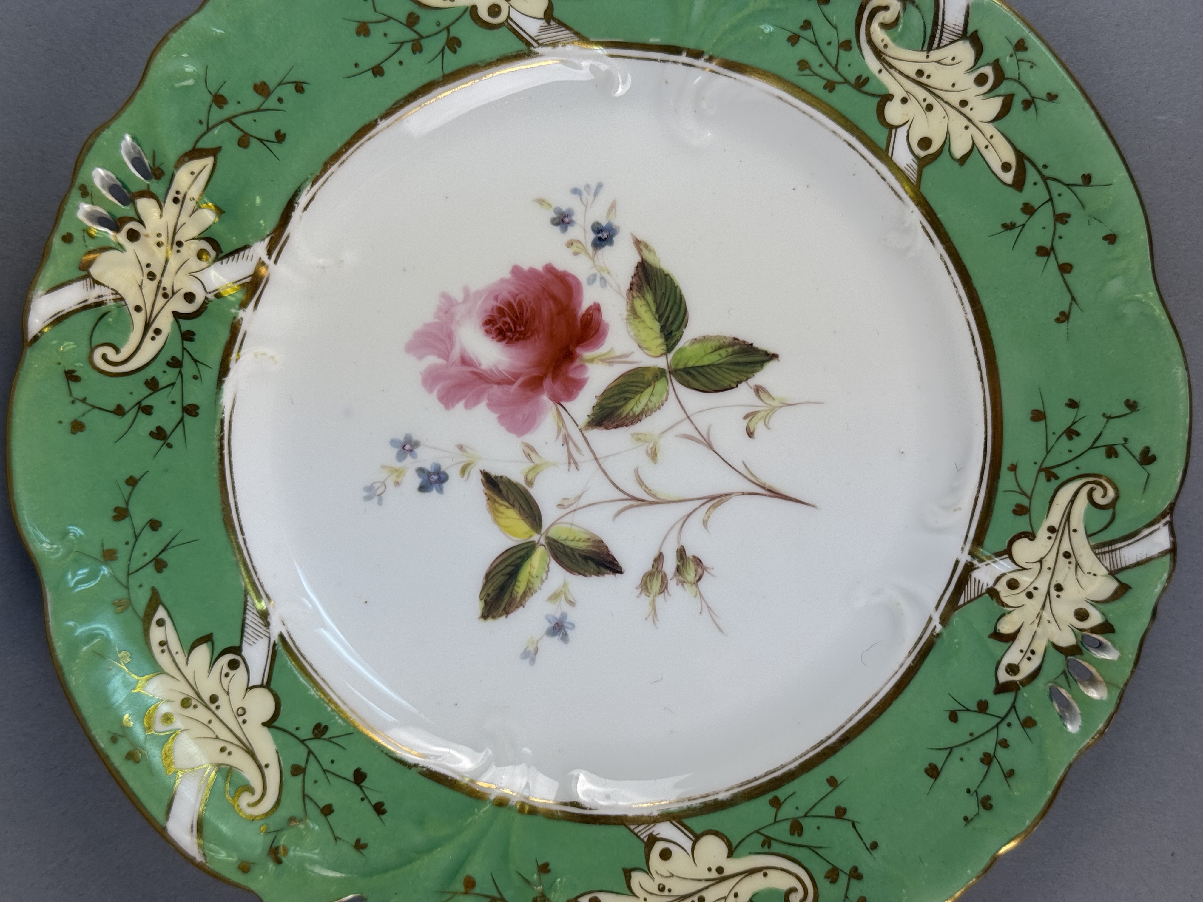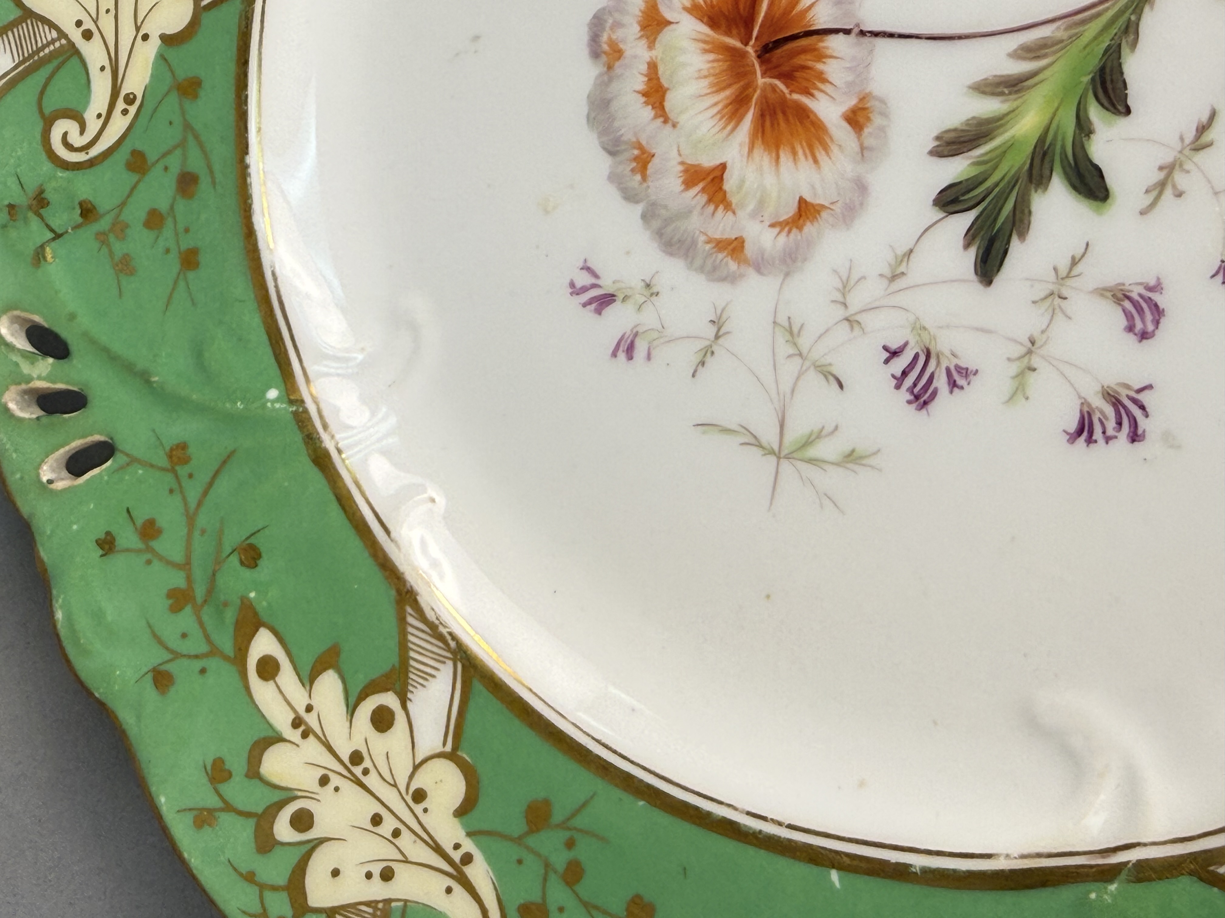 A set of porcelain dessert plates featuring central hand-painted polychrome enamel botanical studies, including specimens such as roses, tulips, and pansies. Each plate is designed with a wide apple-green ground border enriched with molded foliate and acanthus scroll motifs in a cream tone. The borders are further decorated with gilded vine-and-leaf patterns and finished with scalloped, gold-rimmed edges. Several plates in the group incorporate reticulated or pierced sections within the molded border design. The reverse of at least one plate bears hand-painted red marks consisting of the numerals 1904 and a script 2. The form and decoration are characteristic of mid-19th century Paris porcelain, often attributed to decorators such as Feuillet or Boyer.