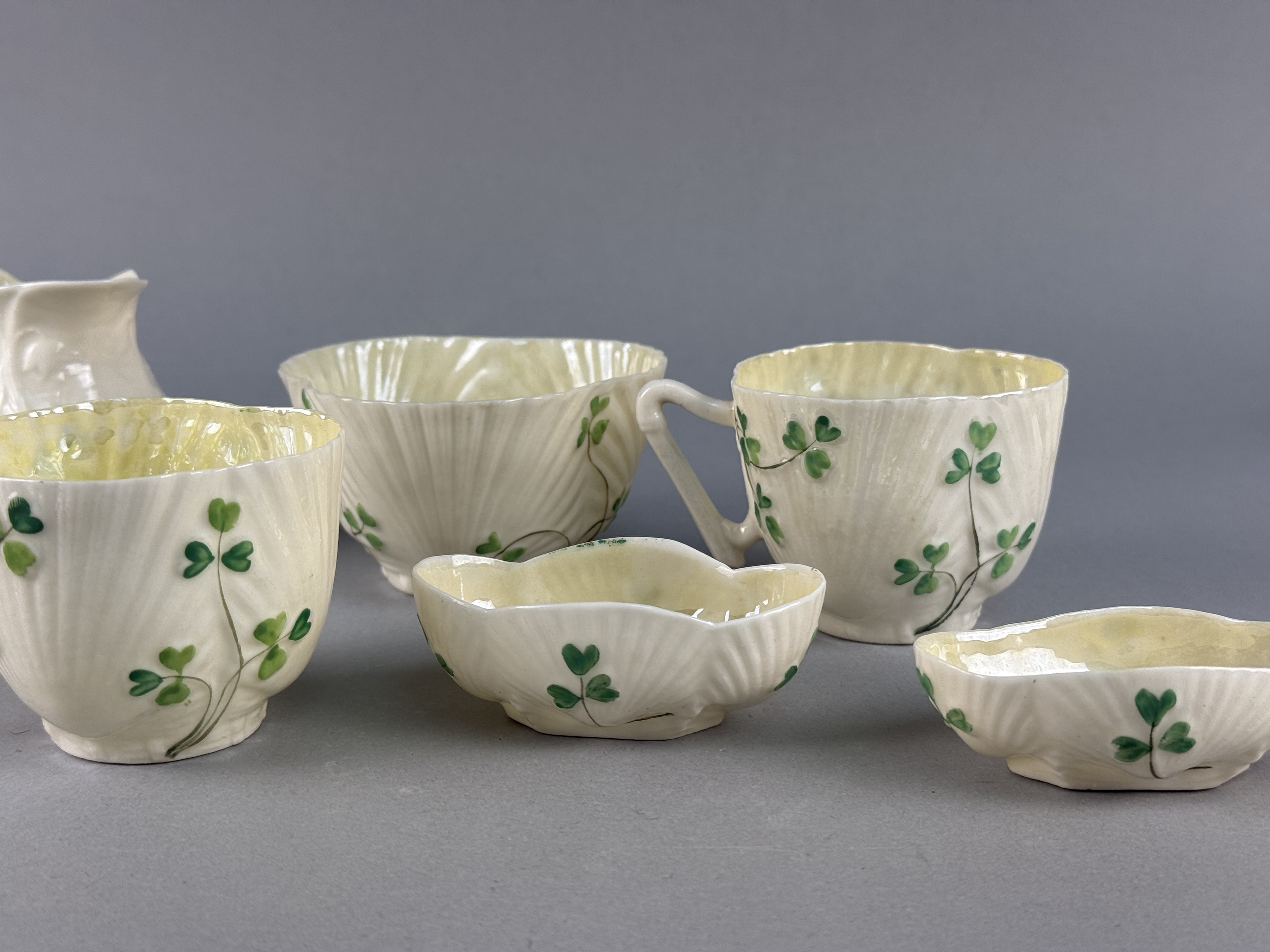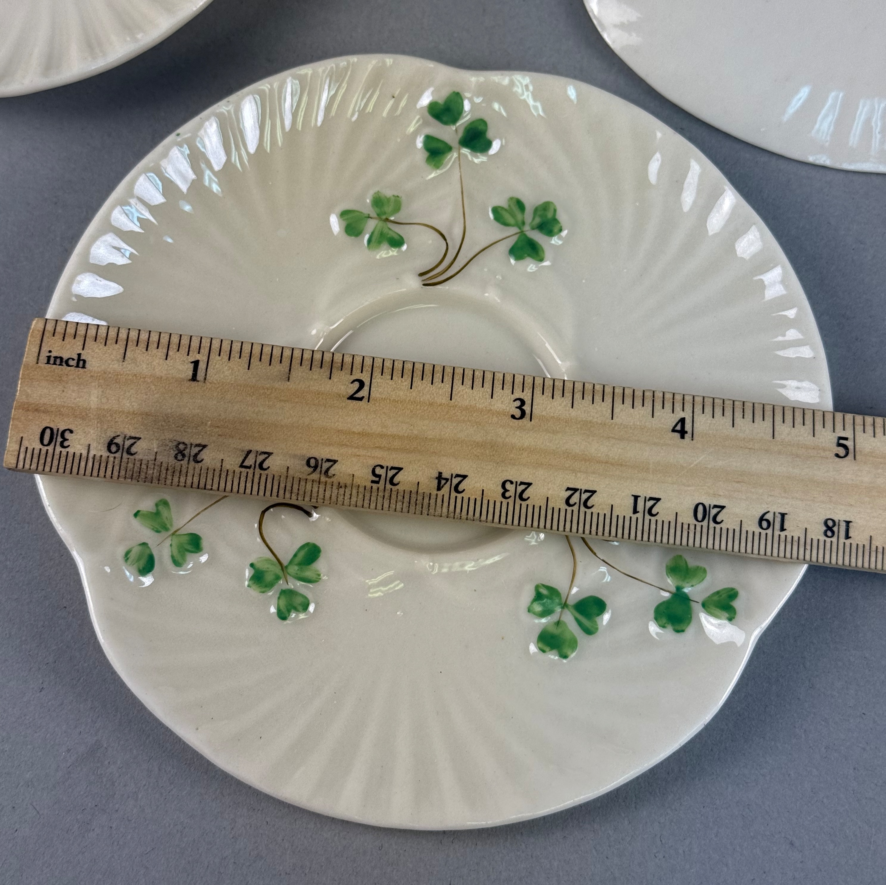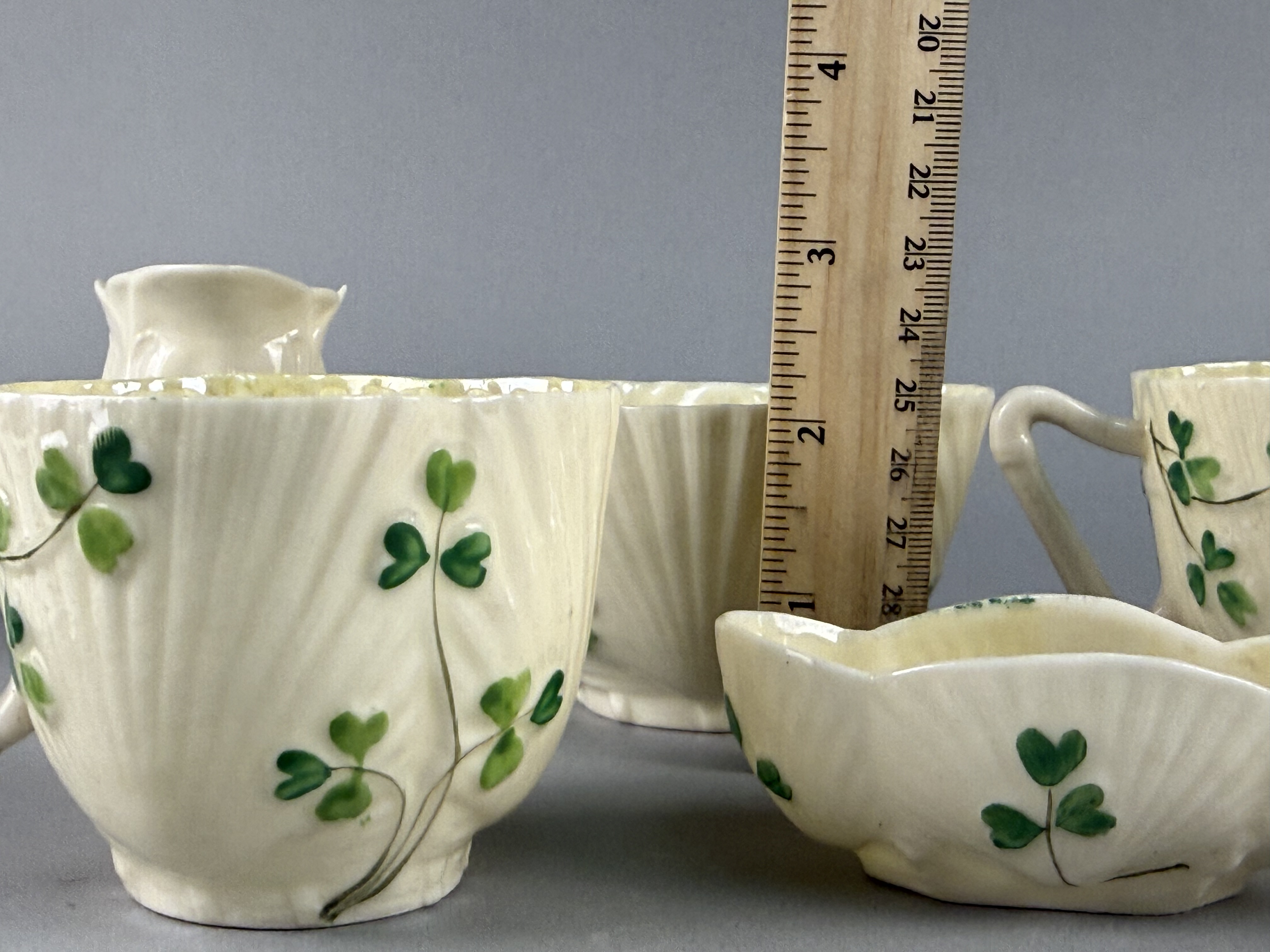 This collection of Irish porcelain from Belleek Pottery features the Shamrock pattern on a molded fluted body. The set is crafted from fine parian porcelain with a creamy iridescent luster glaze on the interiors. Each piece is decorated with hand-painted green shamrocks on delicate brown stems. The collection includes two teacups with wishbone handles, three saucers with scalloped edges, one small creamer, one open sugar bowl, and two small scalloped condiment dishes. The bases bear various black printed marks. One mark includes a banner for Belleek and a ribbon for the retailer Robinson and Cleaver, Belfast. Another mark displays the Belleek crest featuring a wolfhound, harp, and tower, along with the registration number 0857 and the location Co. Fermanagh Ireland. Saucers: 5 inches diameter Teacups: 2.25 inches height. The set is in very good condition with no visible chips, cracks, or repairs. There is light wear to the luster glaze on the interior of the cups and bowls consistent with age and use. Minor kiln specks and manufacturing irregularities are present.
