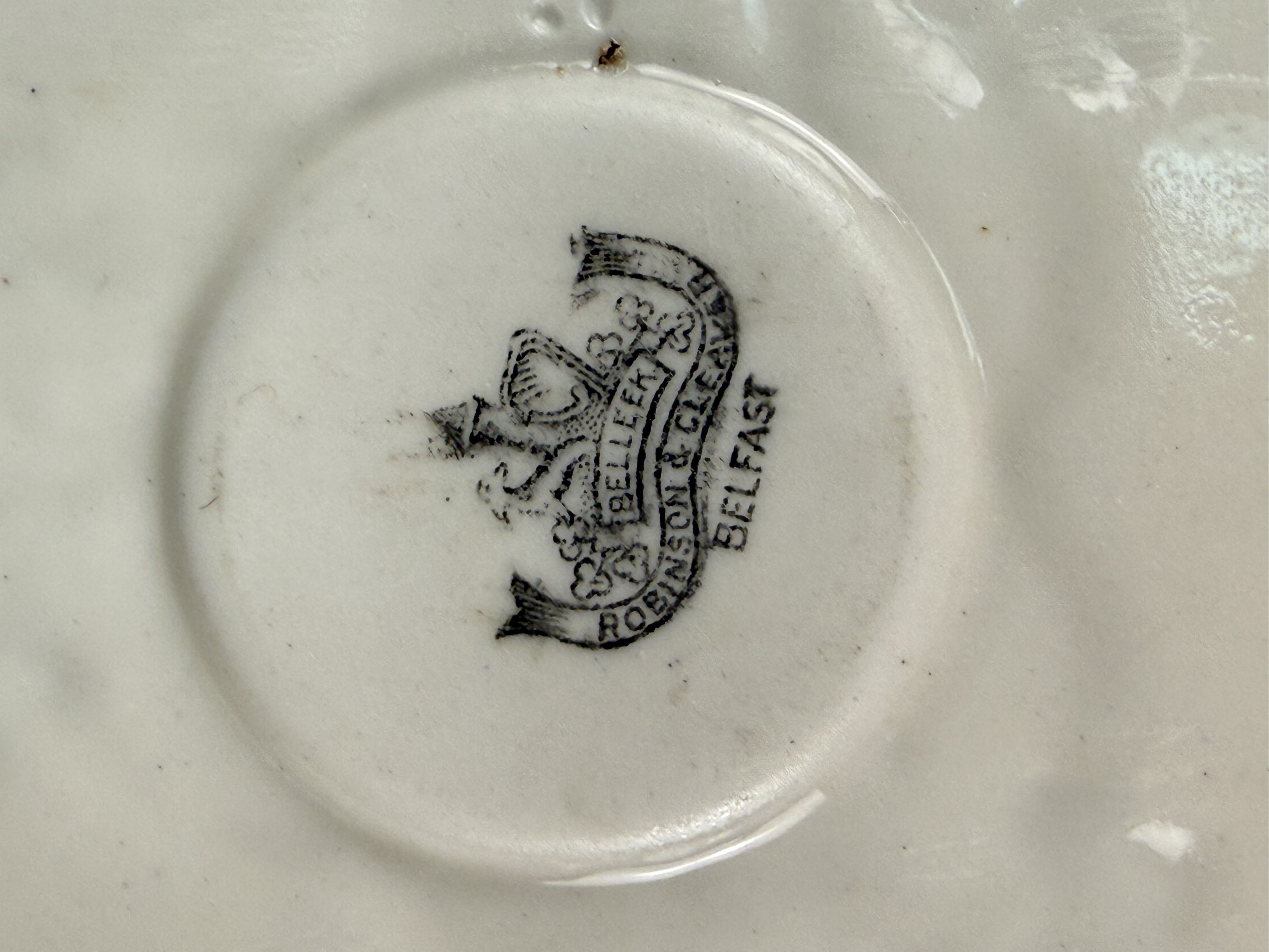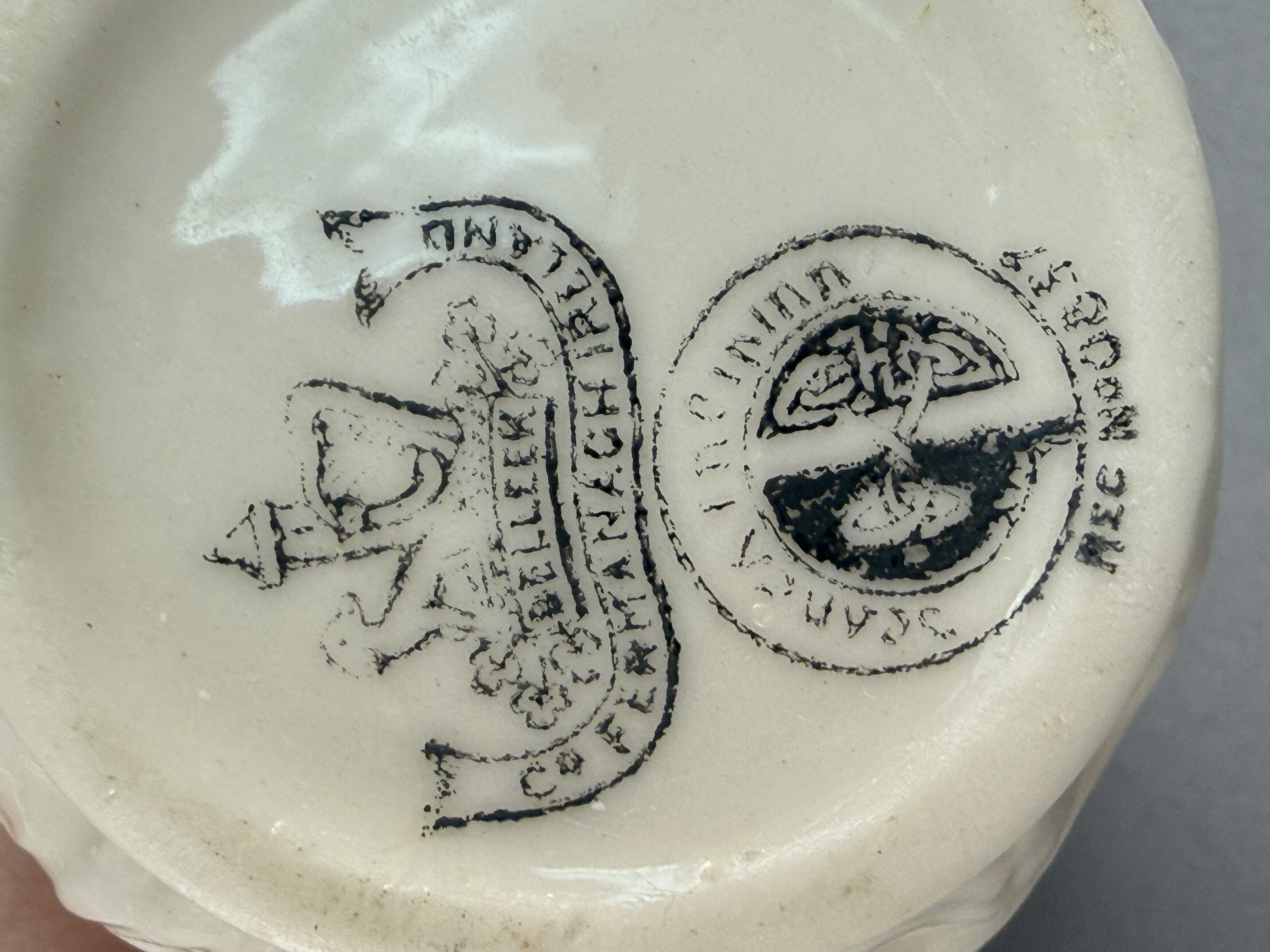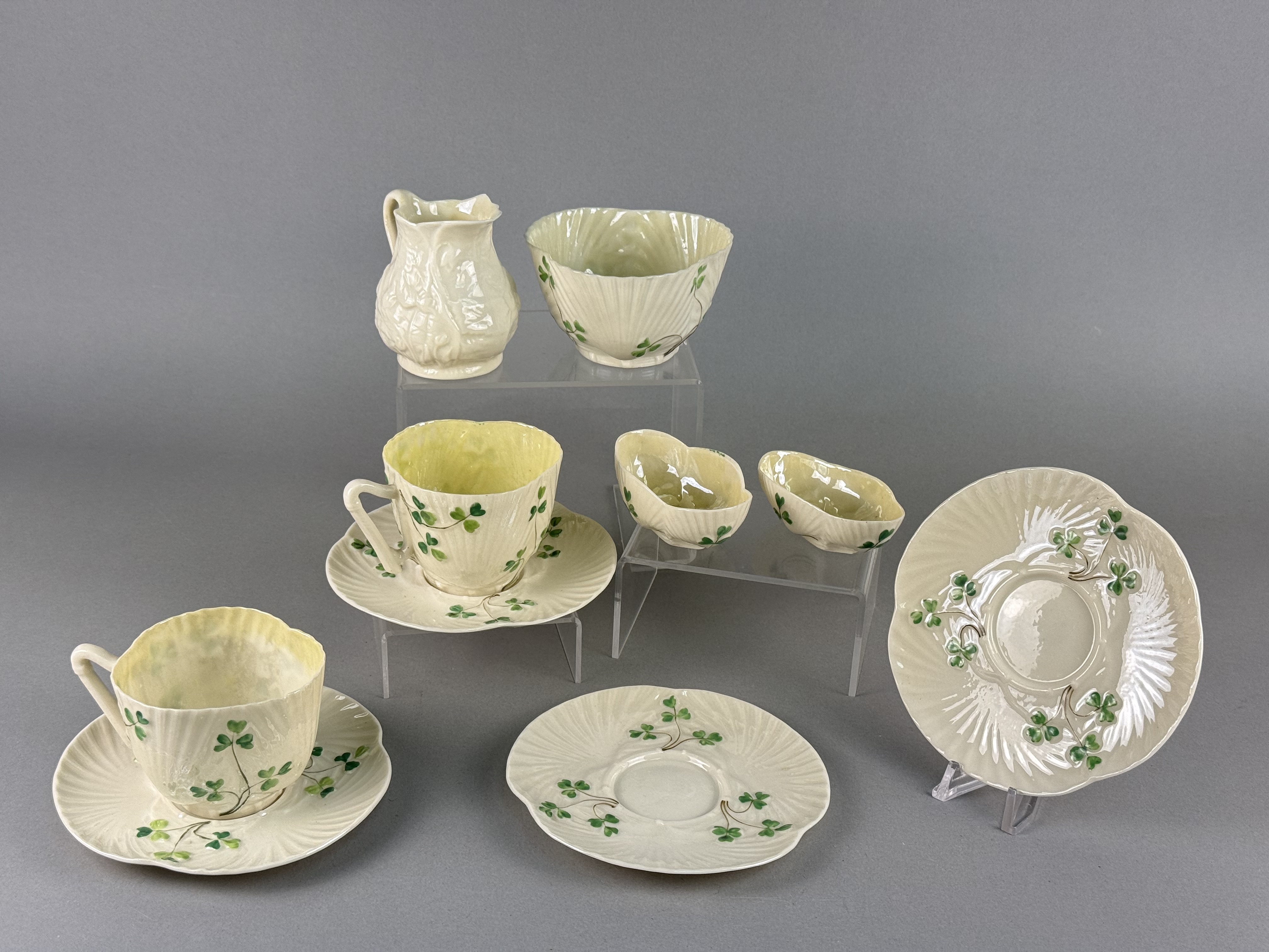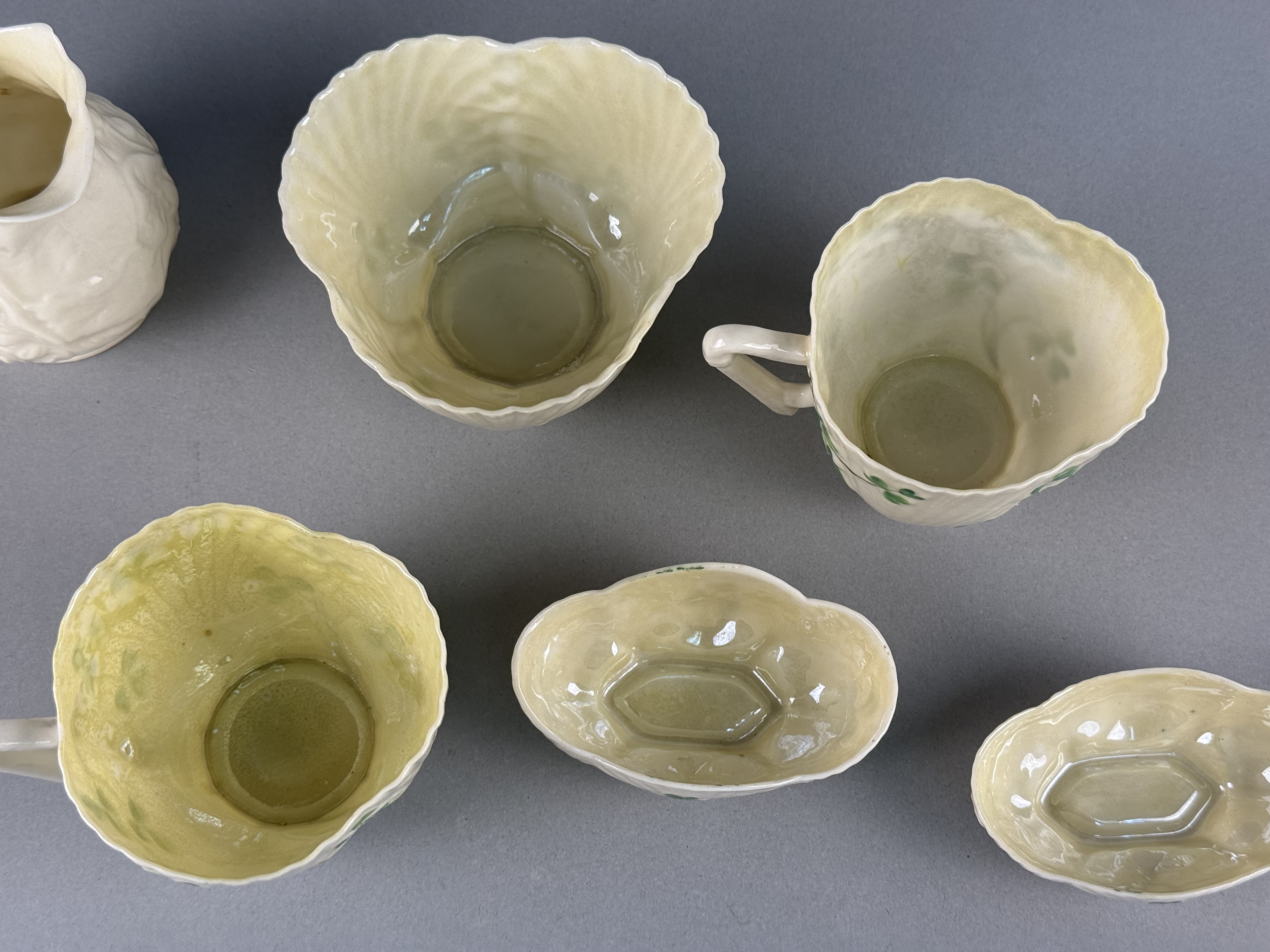 This collection of Irish porcelain from Belleek Pottery features the Shamrock pattern on a molded fluted body. The set is crafted from fine parian porcelain with a creamy iridescent luster glaze on the interiors. Each piece is decorated with hand-painted green shamrocks on delicate brown stems. The collection includes two teacups with wishbone handles, three saucers with scalloped edges, one small creamer, one open sugar bowl, and two small scalloped condiment dishes. The bases bear various black printed marks. One mark includes a banner for Belleek and a ribbon for the retailer Robinson and Cleaver, Belfast. Another mark displays the Belleek crest featuring a wolfhound, harp, and tower, along with the registration number 0857 and the location Co. Fermanagh Ireland. Saucers: 5 inches diameter Teacups: 2.25 inches height. The set is in very good condition with no visible chips, cracks, or repairs. There is light wear to the luster glaze on the interior of the cups and bowls consistent with age and use. Minor kiln specks and manufacturing irregularities are present.