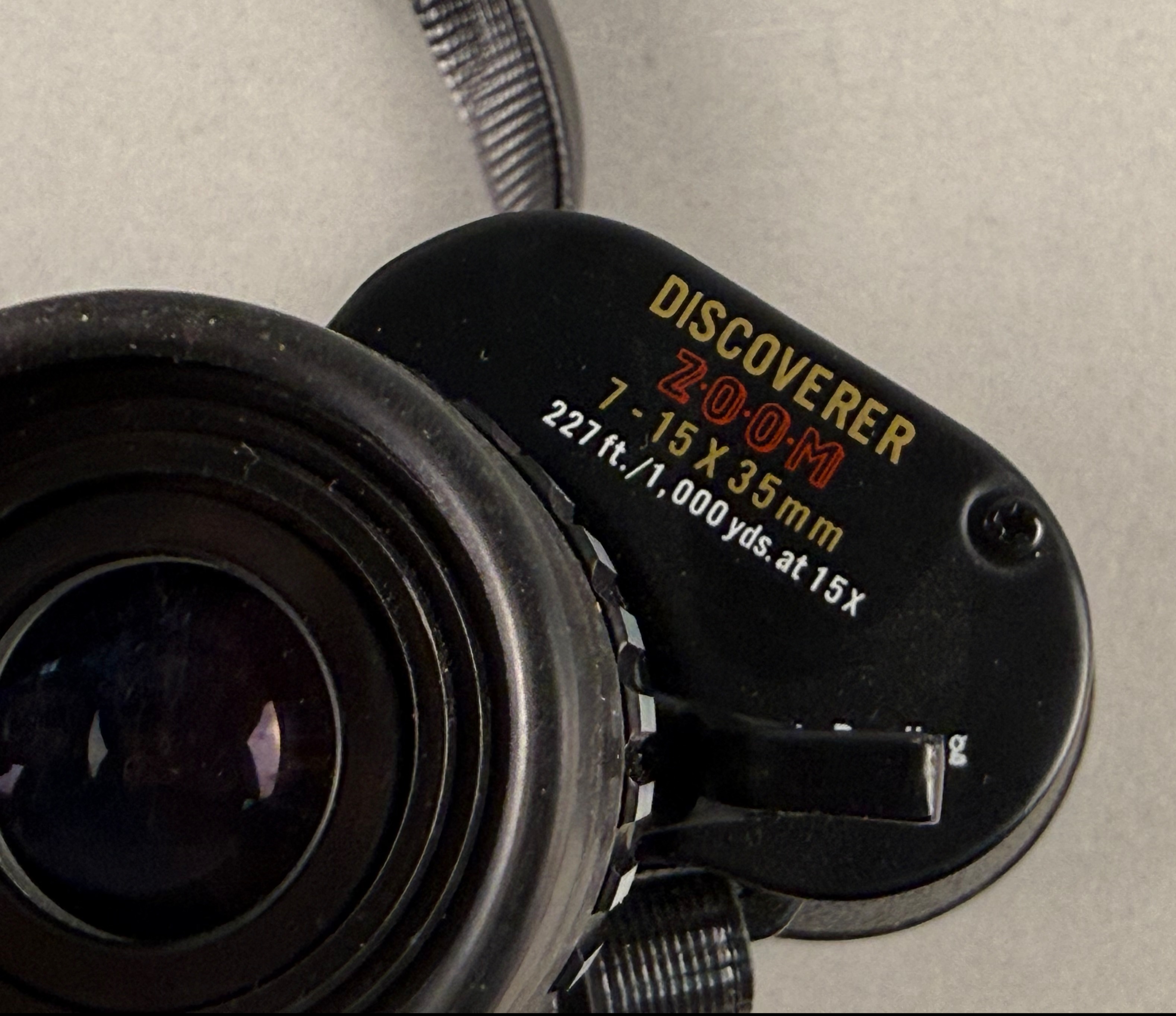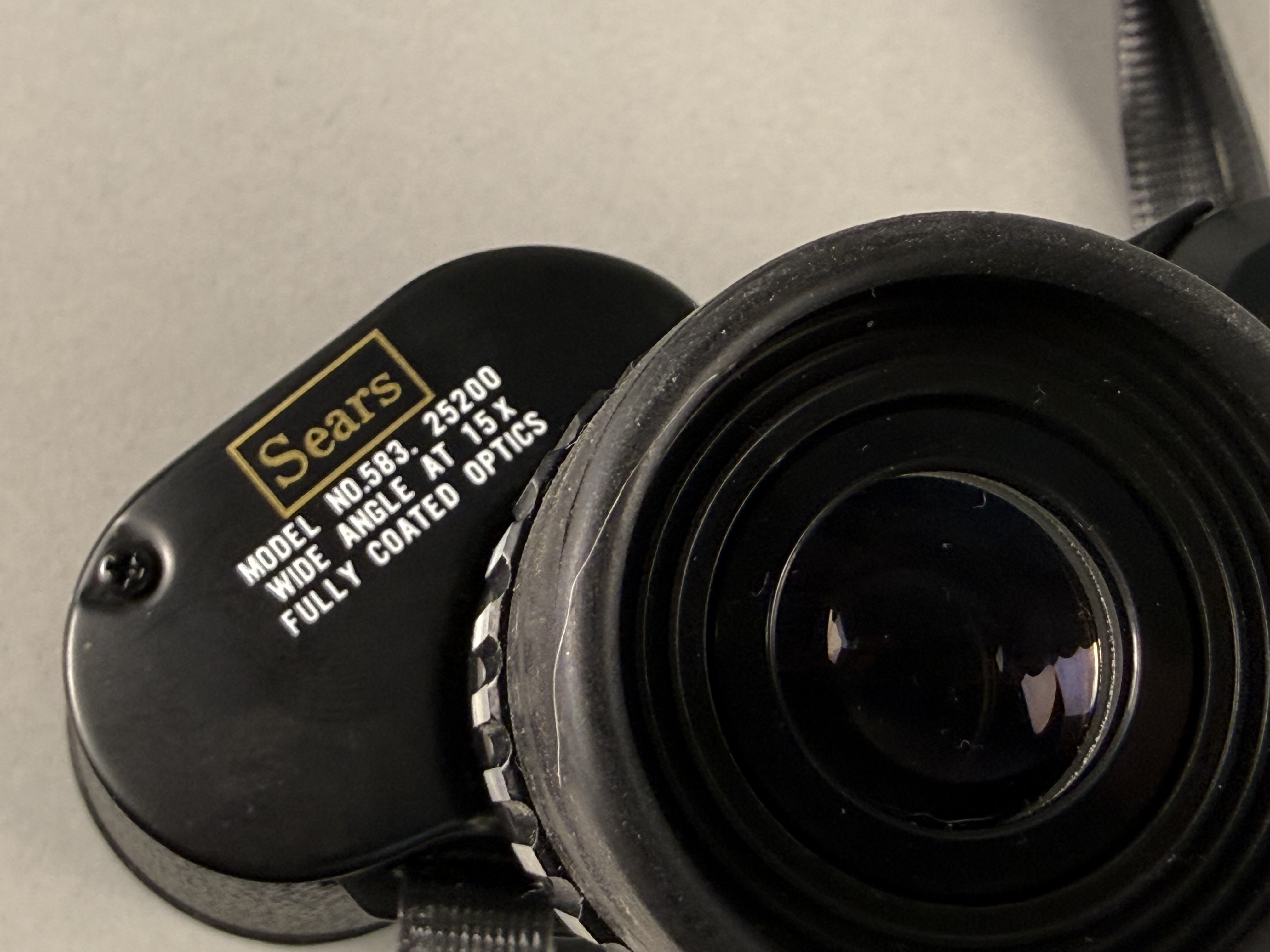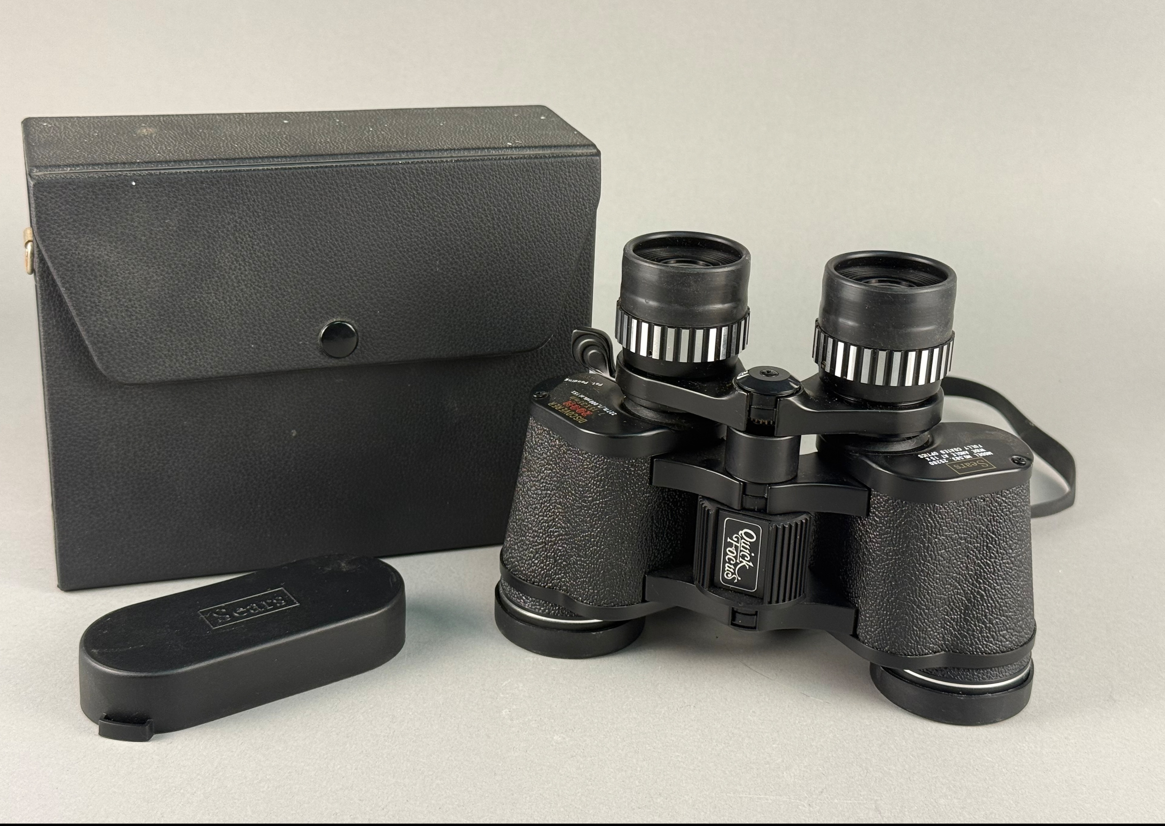 This pair of Sears Discoverer zoom binoculars features a variable magnification range from 7x to 15x with 35mm objective lenses. The instrument is constructed with a black-finished metal body and a textured pebble-grain synthetic covering. The left eyepiece plate is inscribed with the Sears logo and Model No. 583.25200, Wide Angle at 15x, and Fully Coated Optics. The right eyepiece plate is marked Discoverer Zoom 7-15x35mm and 227 ft. / 1,000 yds. at 15X. The central focusing mechanism is labeled Quick Focus. A lever-actuated zoom on the right eyepiece is marked with a scale of 15, 13, 11, 9, and 7, with a Pat. Pending mark near the lever. The left eyepiece is equipped with a diopter adjustment. A small oval sticker marked PASSED is located on the central hinge. The binoculars include a black nylon neck strap, two Sears branded objective lens caps, and a Sears branded double-eyepiece rain guard. The set is accompanied by its original black textured hard-sided carrying case with a front snap closure. Case: 8 inches x 6 inches.