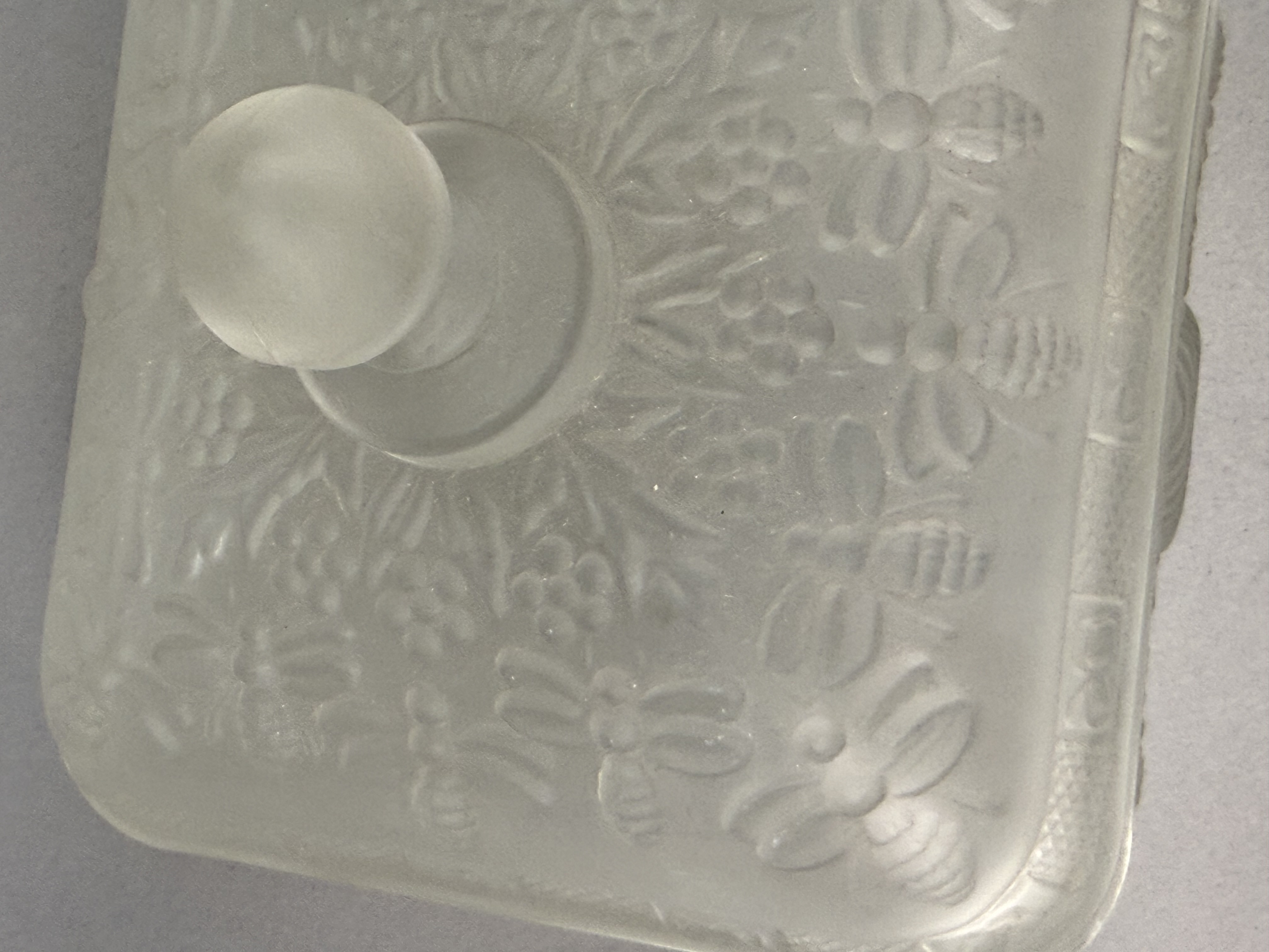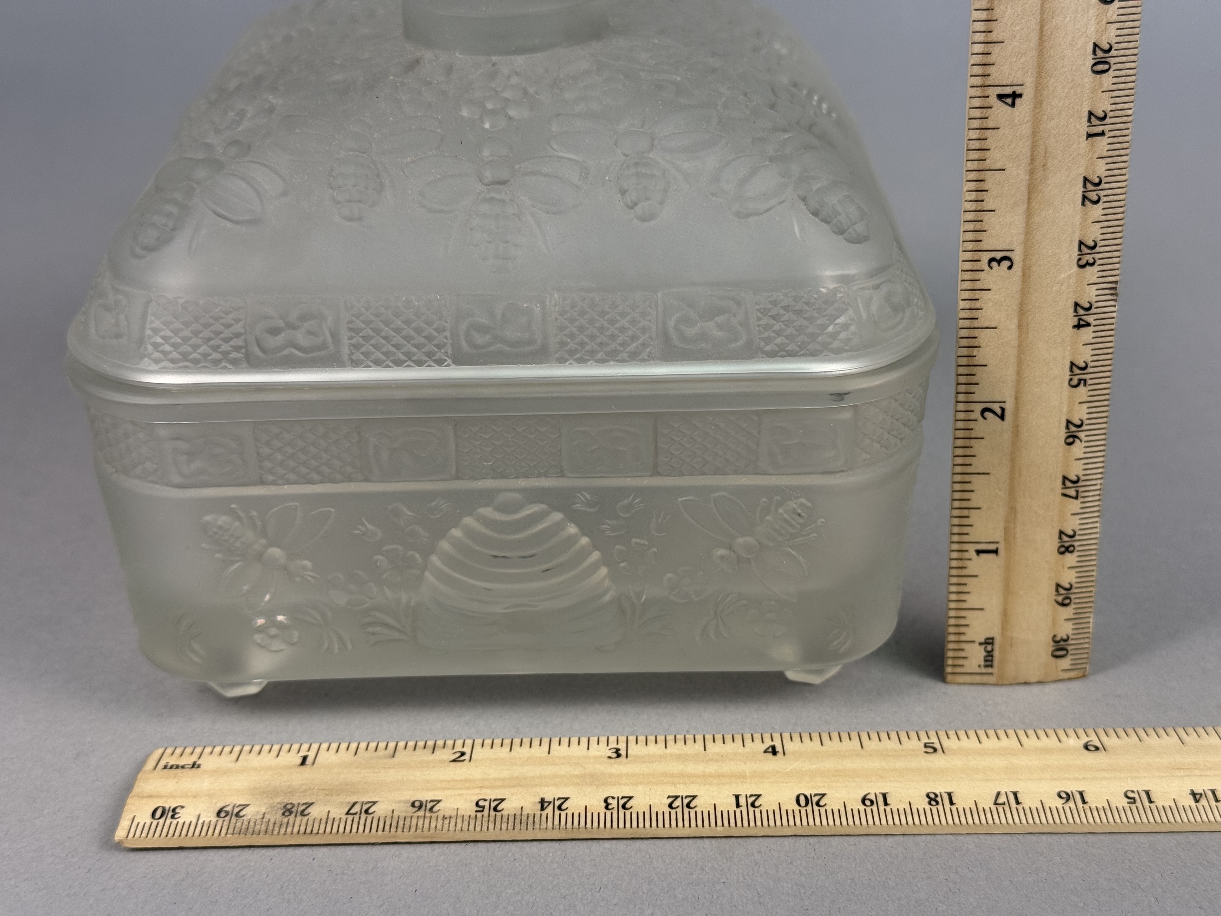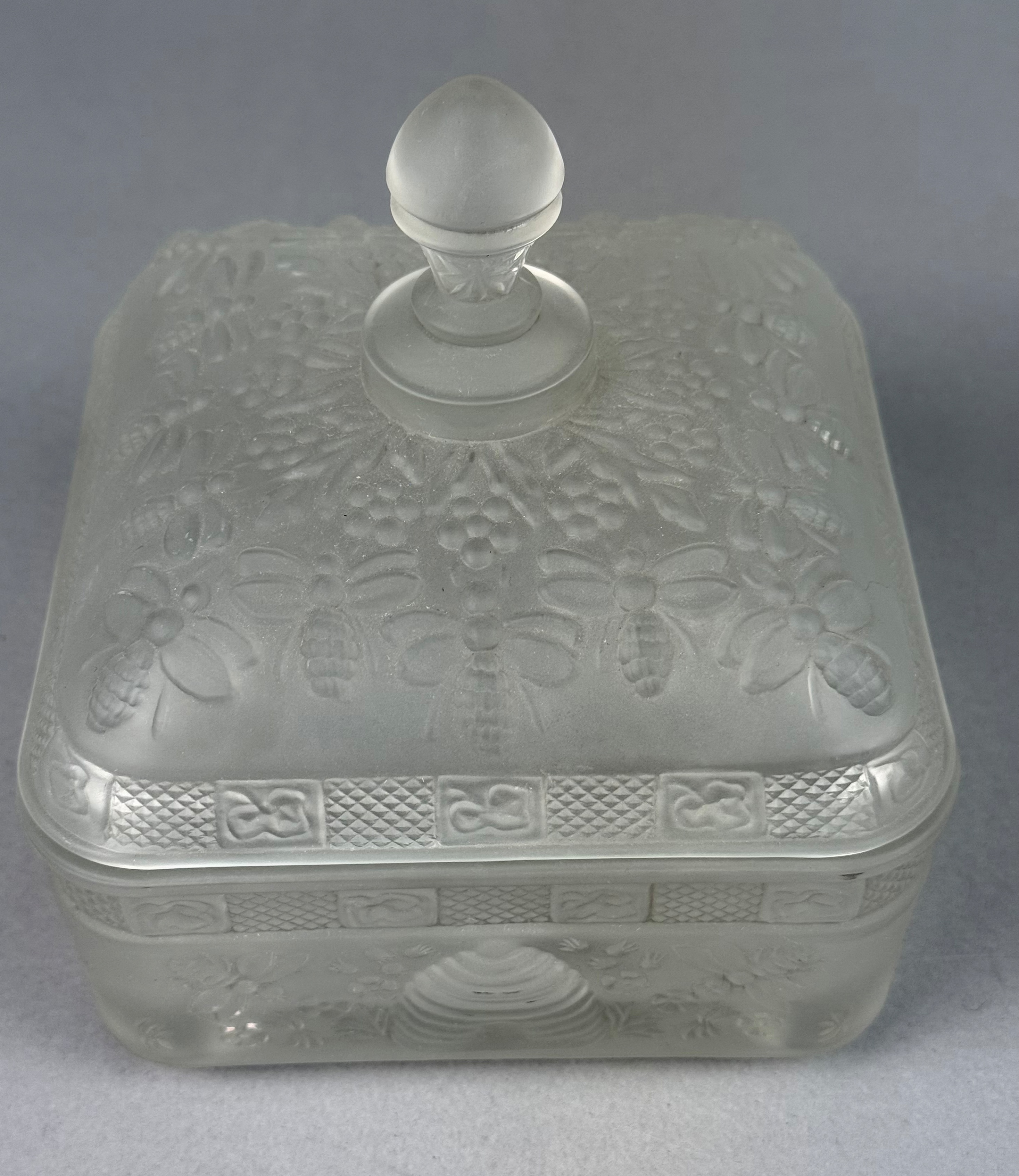 This square lidded glass box is attributed to Tiara Glass, produced by the Indiana Glass Company in the Honey Bee pattern. The piece is constructed of colorless pressed glass with an overall frosted satin finish. The lid features a central ball-shaped finial surrounded by a radial molded relief pattern of honeybees, enclosed by a border of alternating diamond-textured and scrolled panels. Each side of the base depicts a central beehive skep flanked by bees and floral motifs. The box sits on four small integral feet. No maker marks or signatures are visible on the body or base. Base: 5 inches square Height: 4.5 inches. The item appears to be in good overall condition with no visible chips, cracks, or repairs.