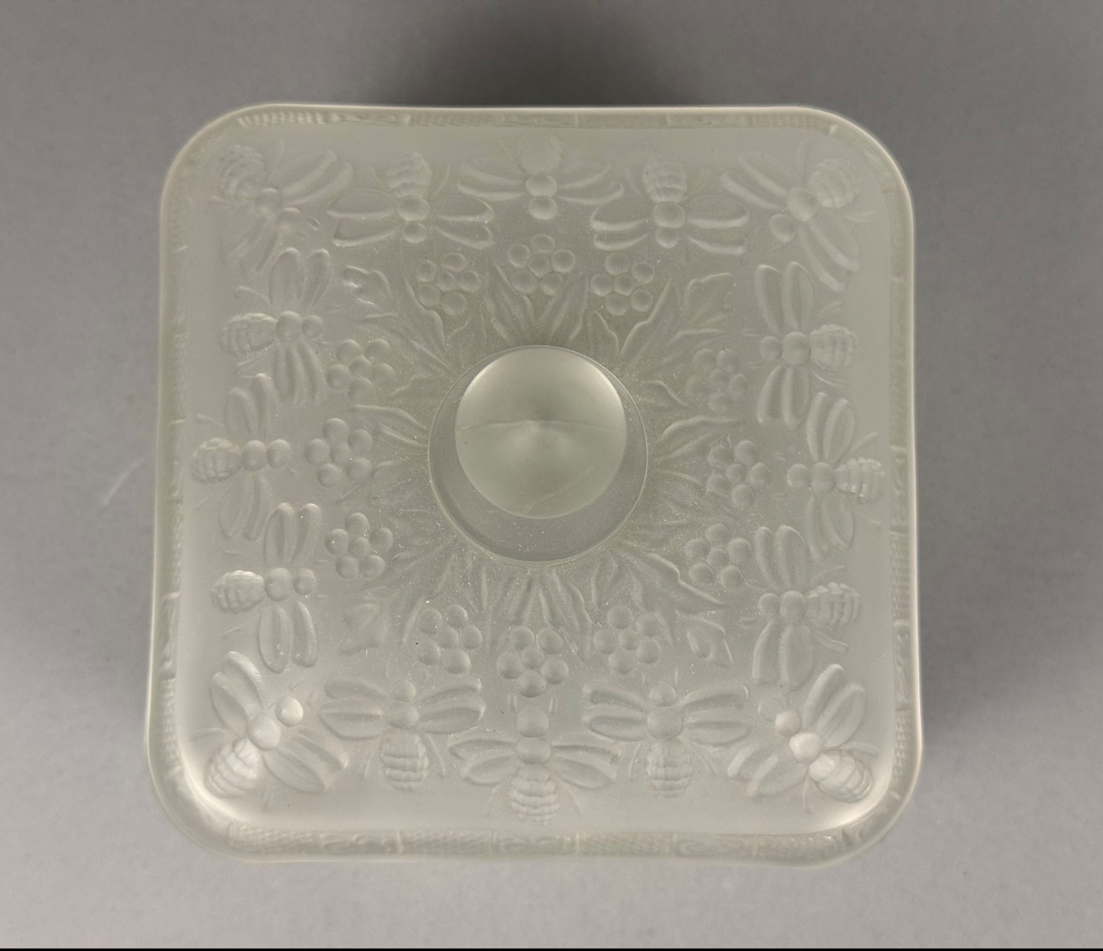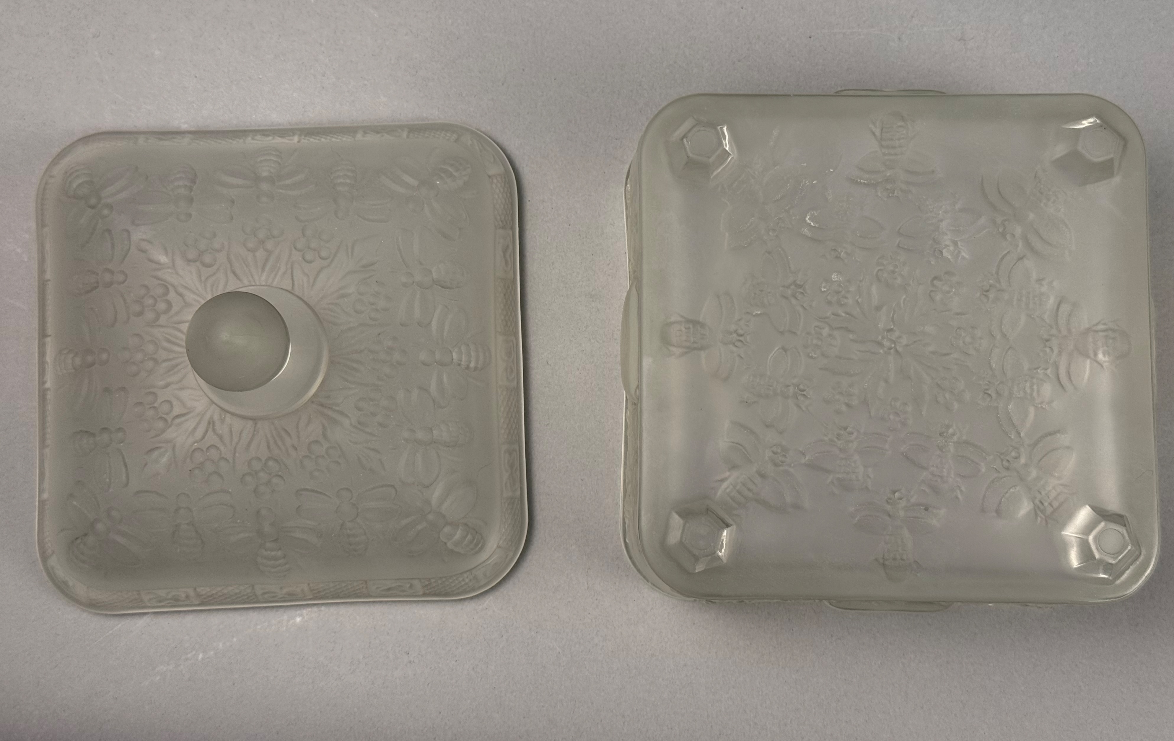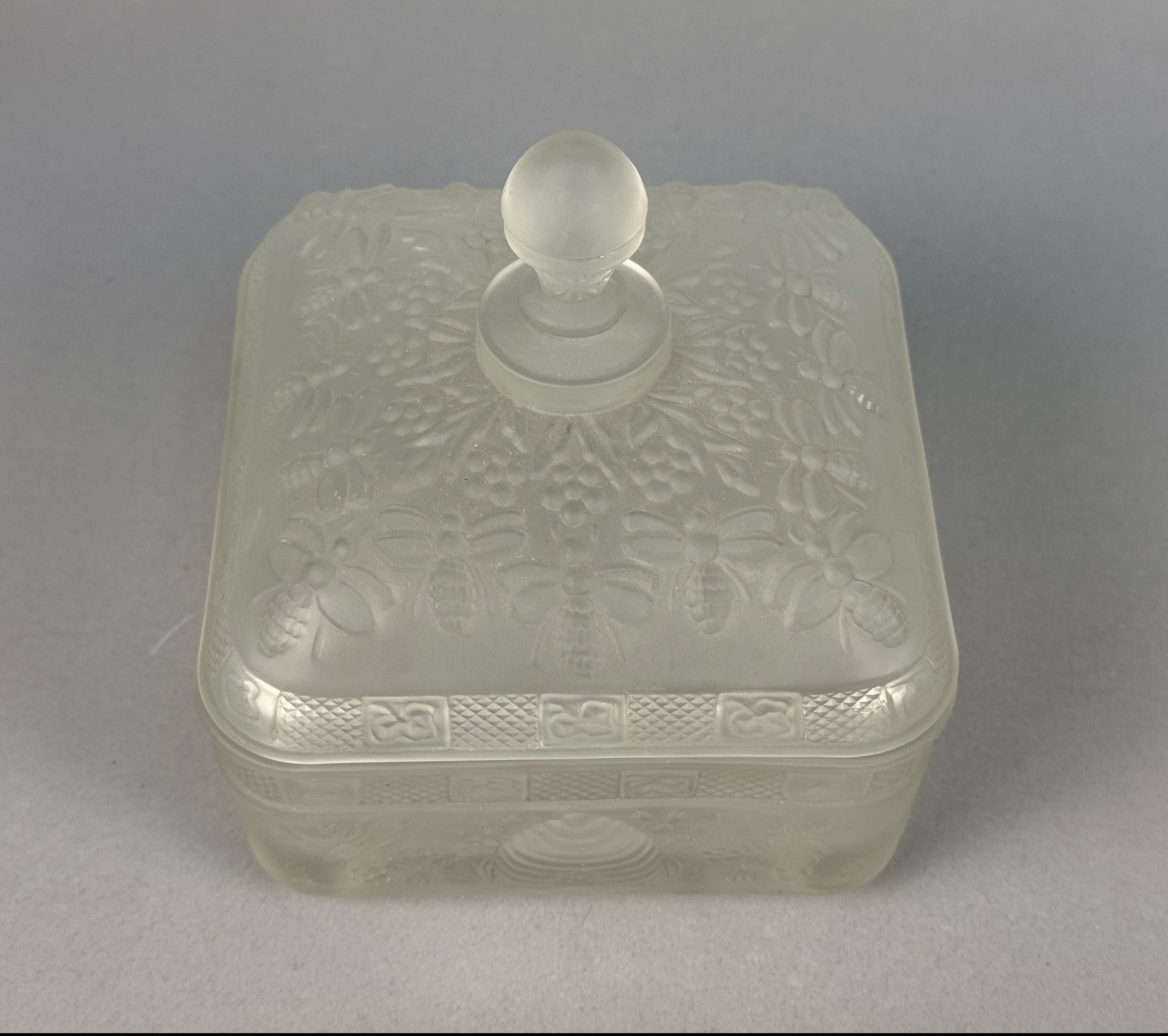This square lidded glass box is attributed to Tiara Glass, produced by the Indiana Glass Company in the Honey Bee pattern. The piece is constructed of colorless pressed glass with an overall frosted satin finish. The lid features a central ball-shaped finial surrounded by a radial molded relief pattern of honeybees, enclosed by a border of alternating diamond-textured and scrolled panels. Each side of the base depicts a central beehive skep flanked by bees and floral motifs. The box sits on four small integral feet. No maker marks or signatures are visible on the body or base. Base: 5 inches square Height: 4.5 inches. The item appears to be in good overall condition with no visible chips, cracks, or repairs.