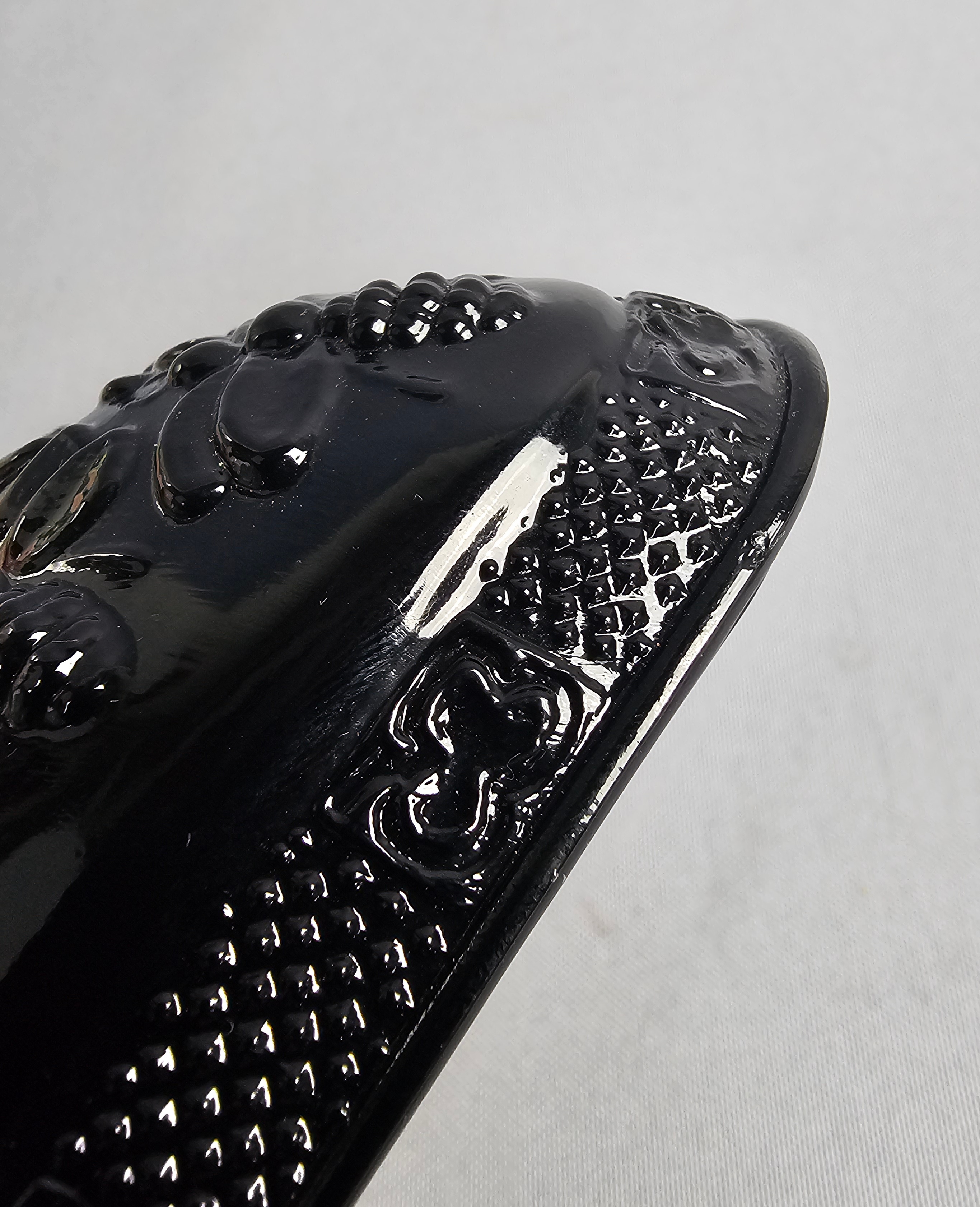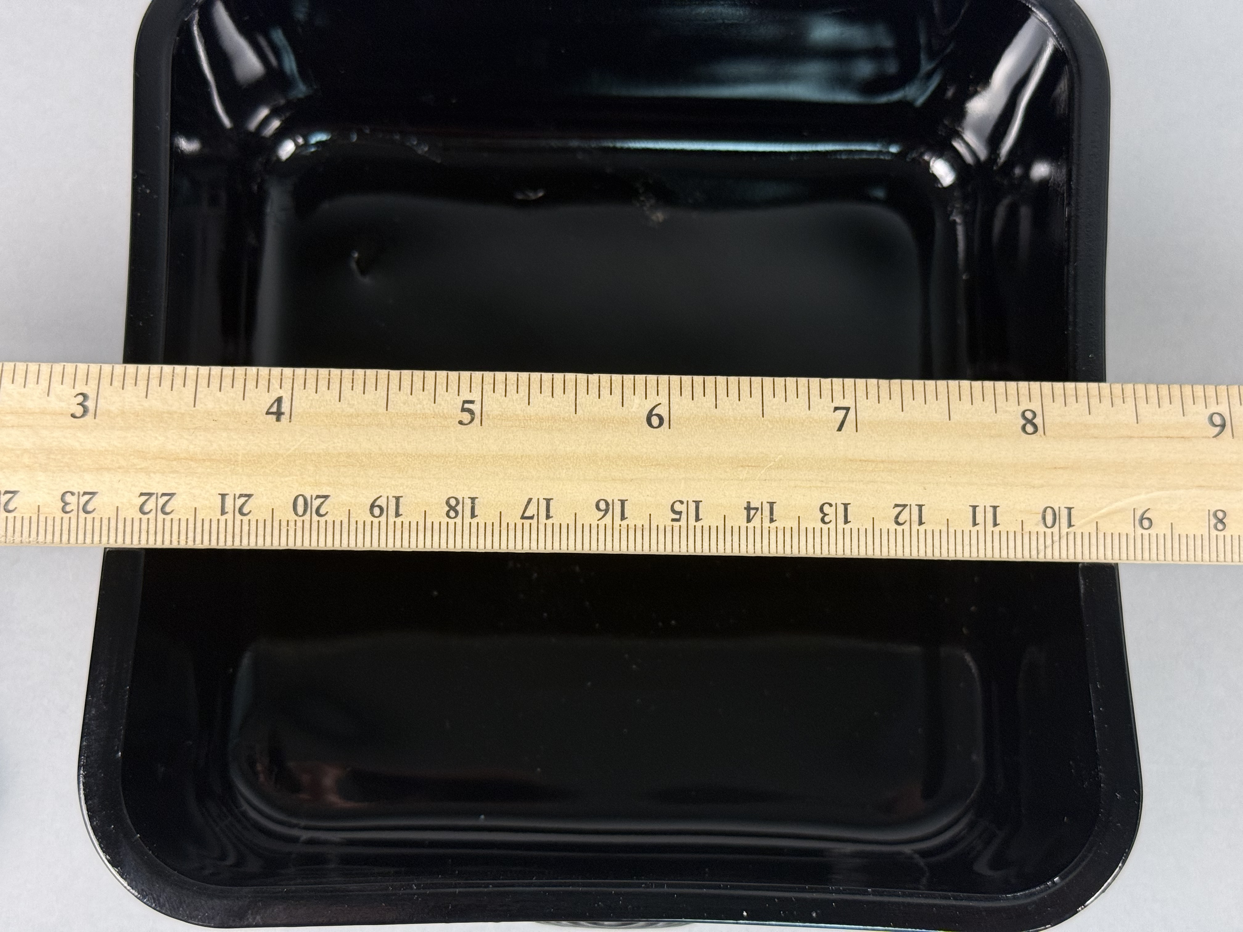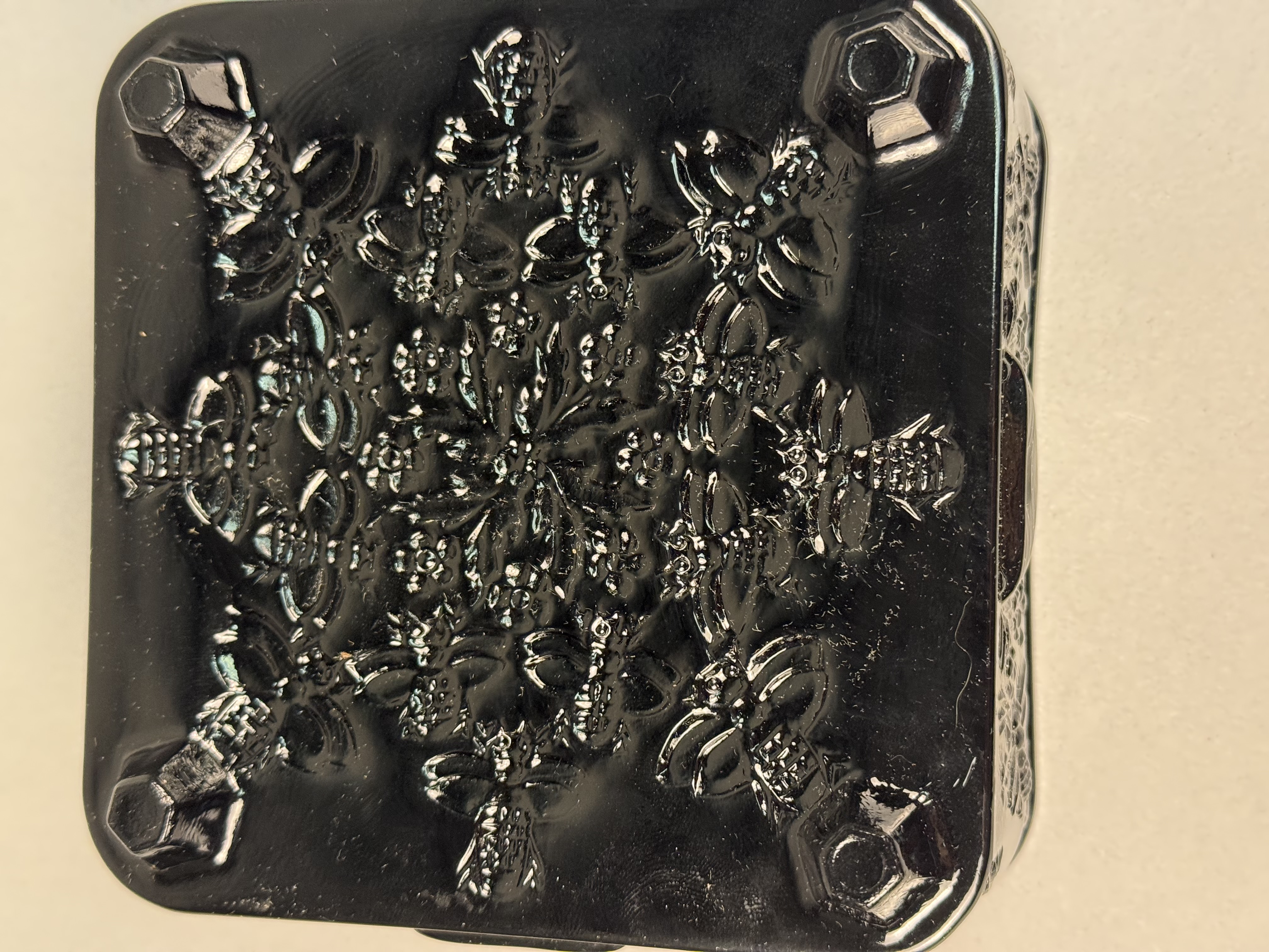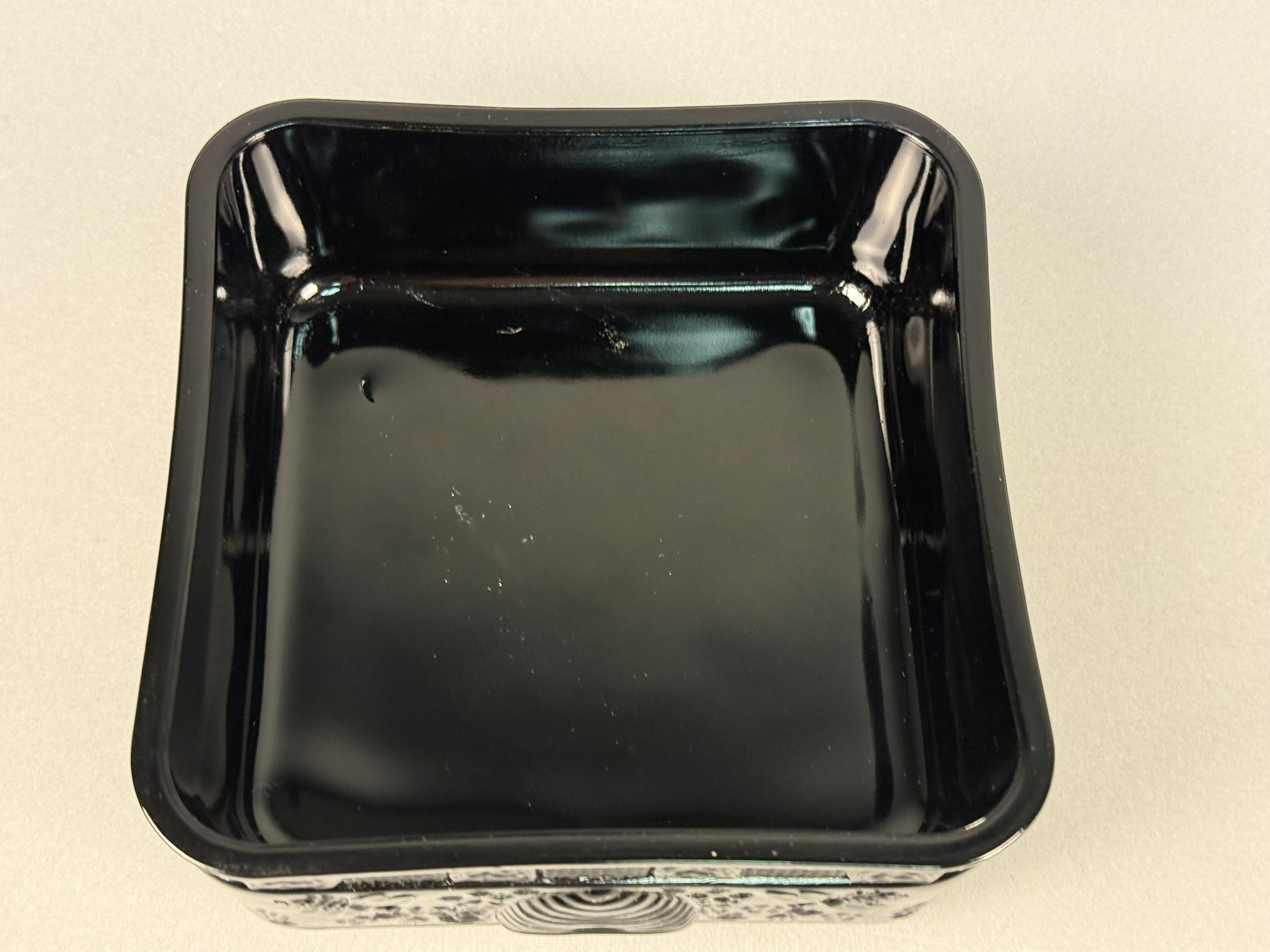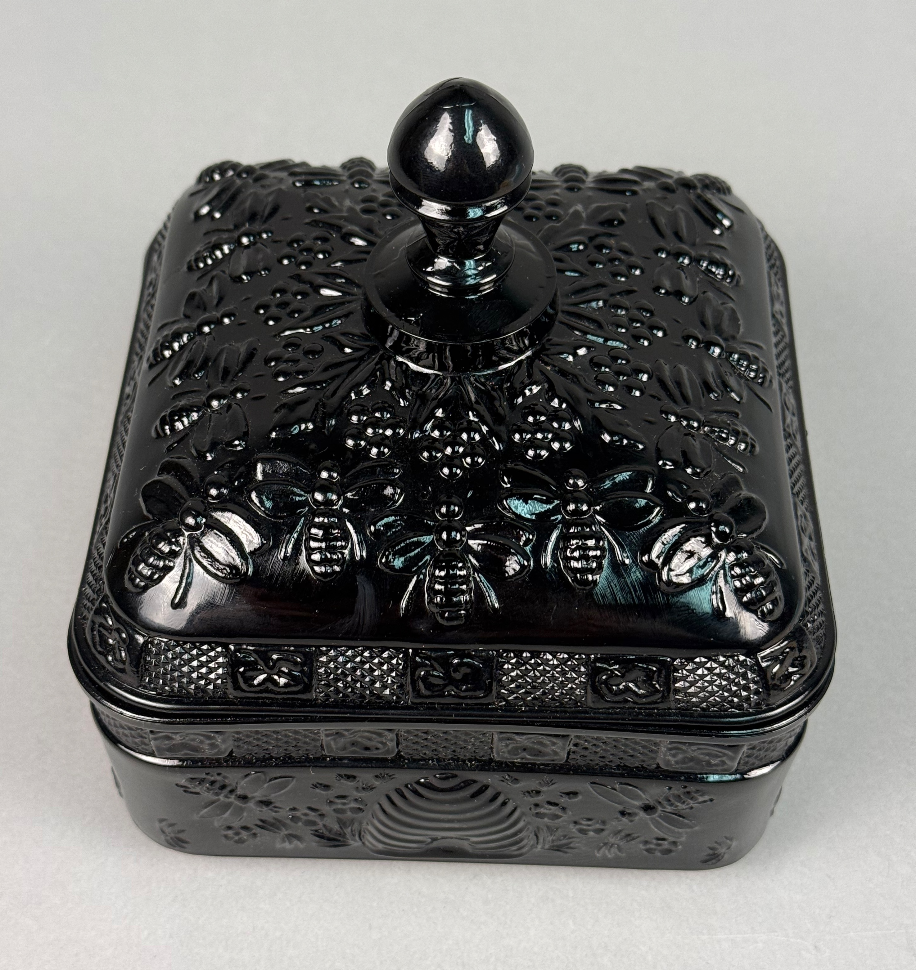 This square covered dish is crafted from opaque black pressed glass in the Honey Bee pattern, attributed to Tiara Exclusives and manufactured by Indiana Glass. The lid features a central bulbous finial and a radial arrangement of molded honeybees, a motif that is repeated on the underside of the base. The sides of the box are decorated with a central beehive skep flanked by bees and floral sprigs. A textured geometric band is molded along the upper rim. The piece stands on four integrated feet. 5 inches square by 4.5 inches high. The item is in good overall condition with minor surface dust and light wear to the interior. Tiny chip on lid edge.