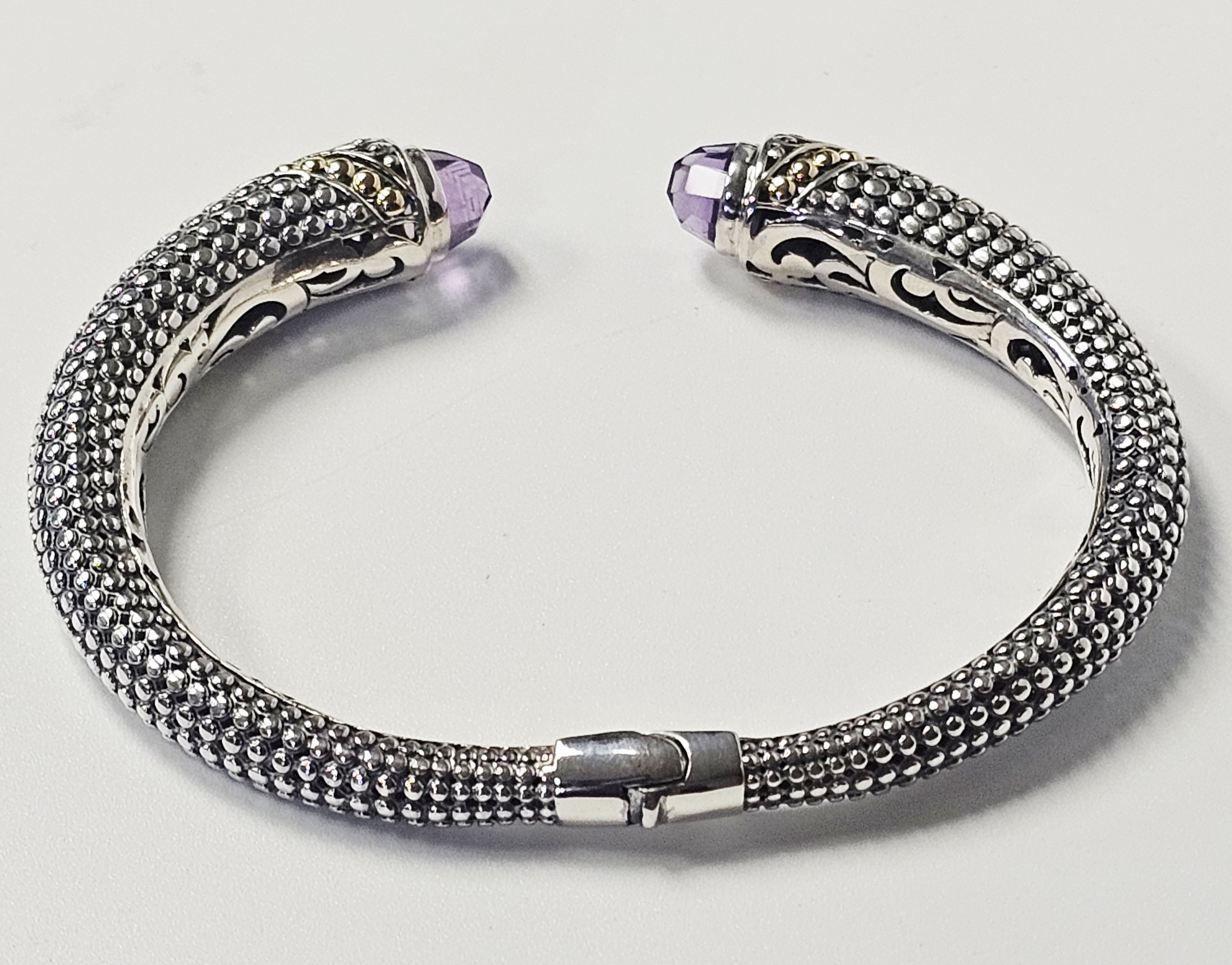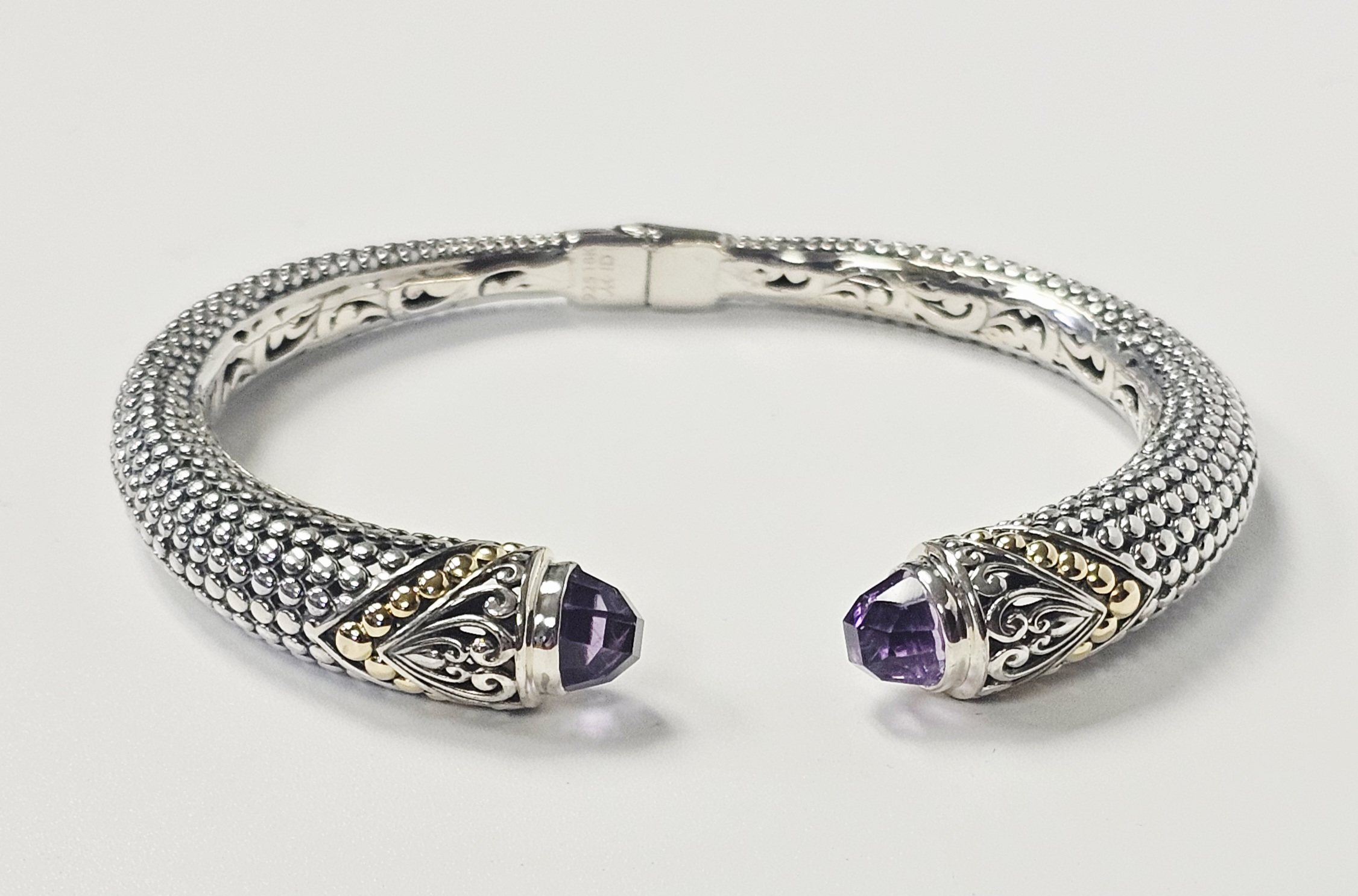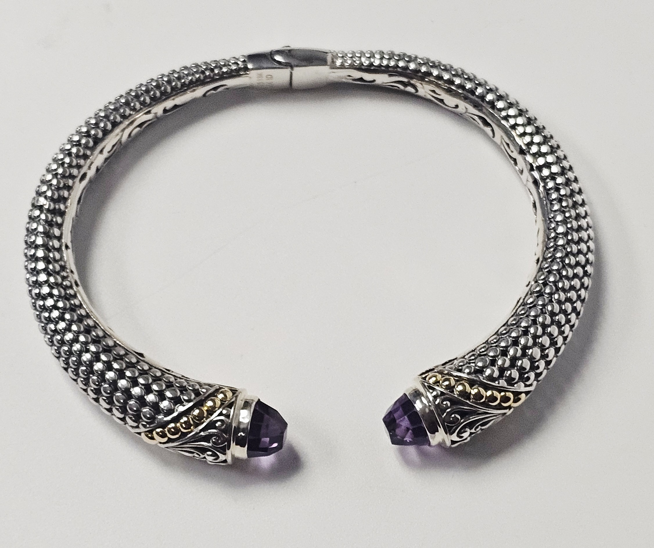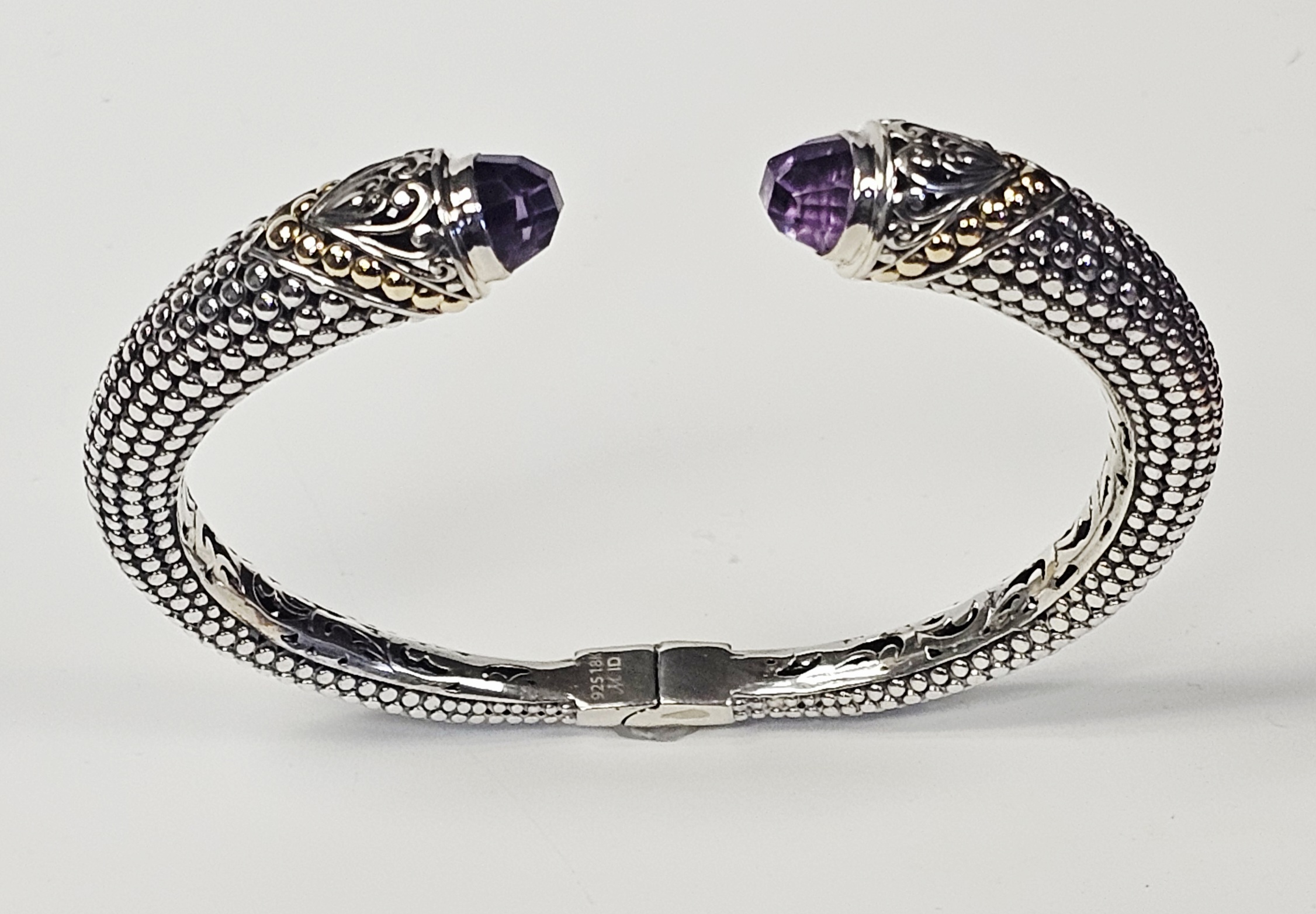This two-tone hinged cuff bracelet features a textured, beaded body transitioning into ornate terminals decorated with silver scrollwork and 18 karat gold granulated accents. Each terminal is set with a faceted purple gemstone, appearing to be amethyst, in a bezel setting. The interior of the hinge is stamped with the purity marks 925 and 18K, alongside a script letter M and the characters ID. Interior diameter: Approximately 2.25 inches Weight: 25.7 grams. The bracelet is in good condition with minor signs of wear and light tarnish in the recessed areas.