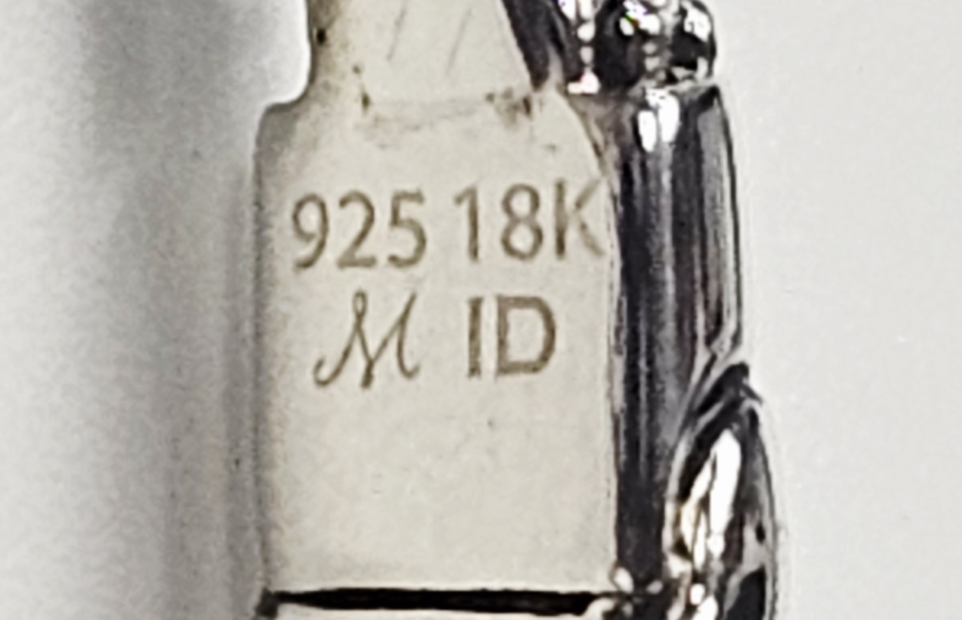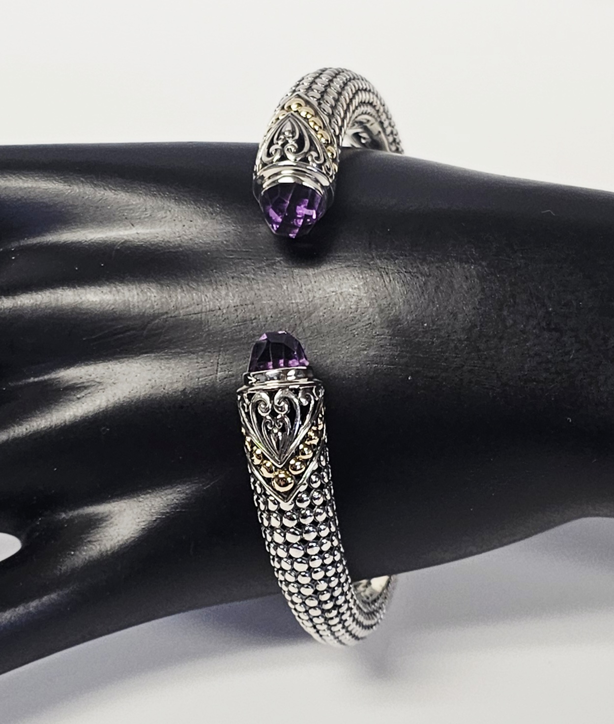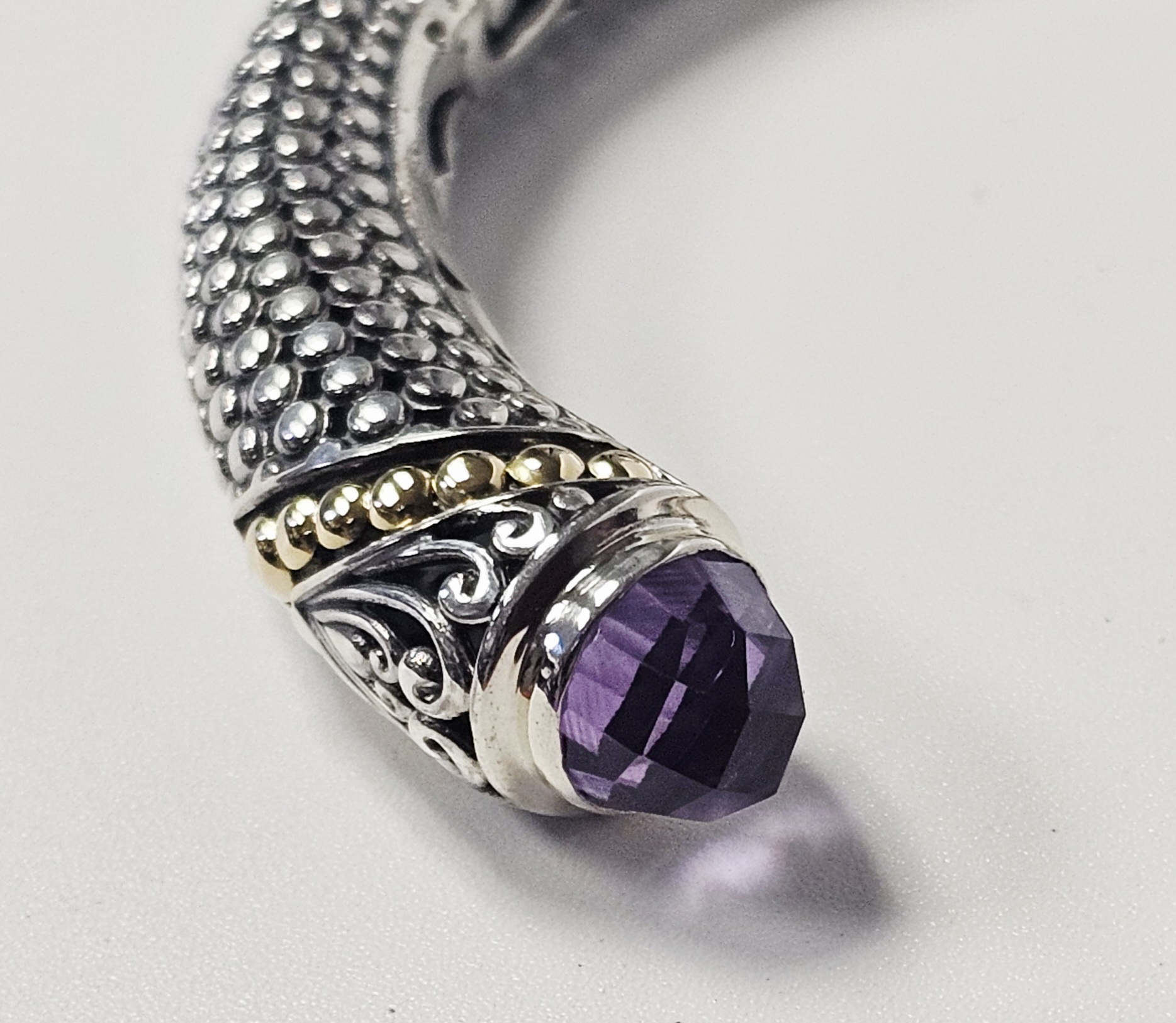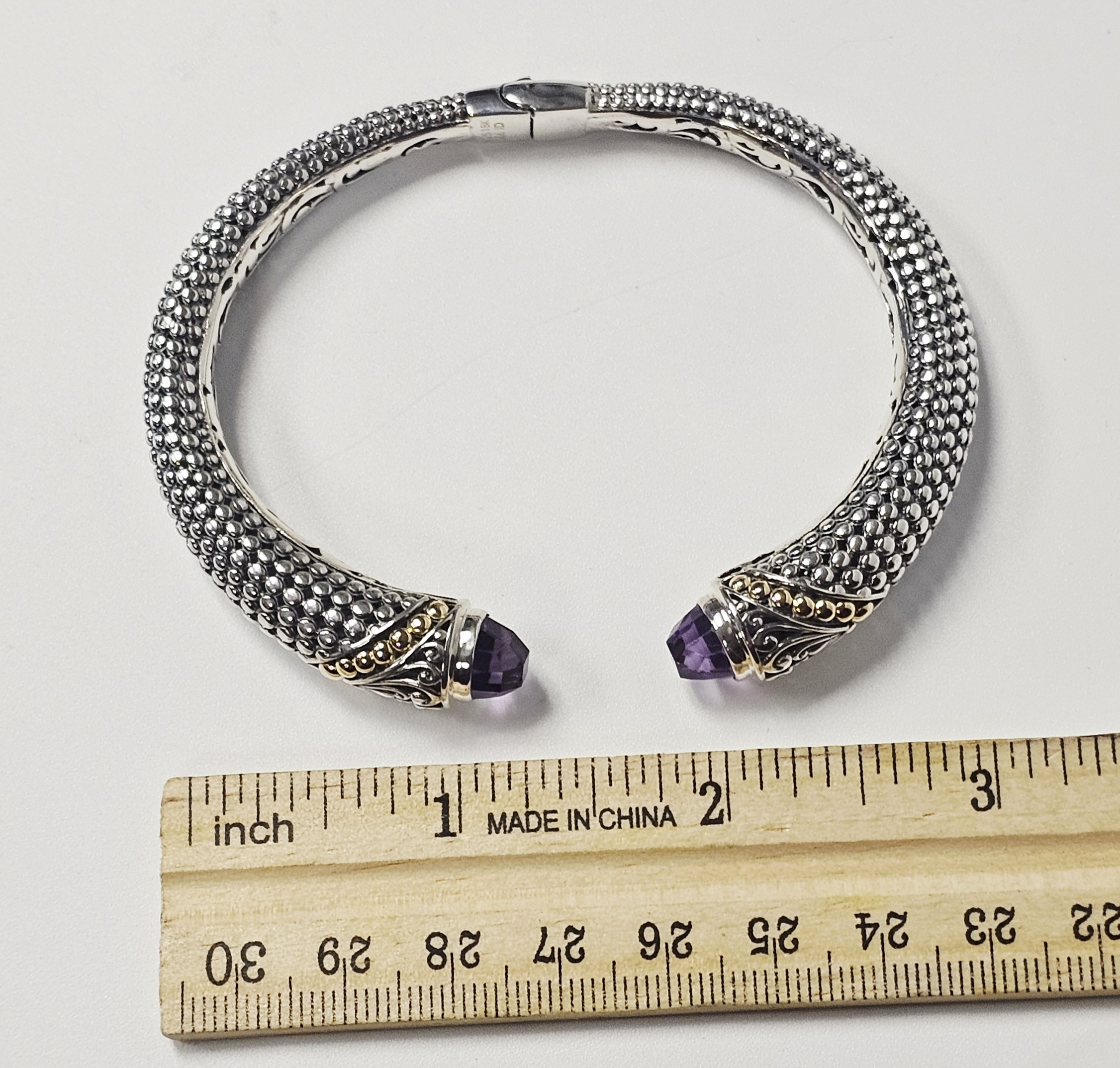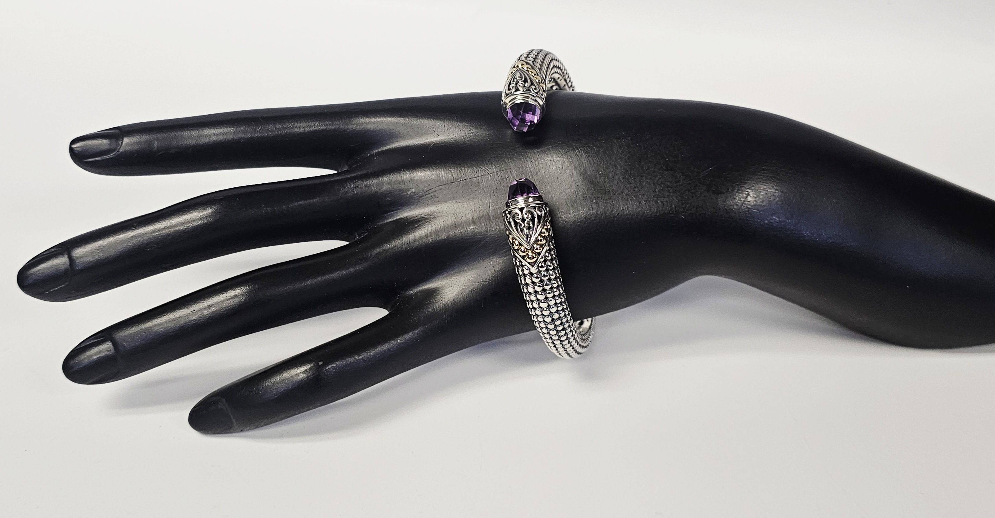 This two-tone hinged cuff bracelet features a textured, beaded body transitioning into ornate terminals decorated with silver scrollwork and 18 karat gold granulated accents. Each terminal is set with a faceted purple gemstone, appearing to be amethyst, in a bezel setting. The interior of the hinge is stamped with the purity marks 925 and 18K, alongside a script letter M and the characters ID. Interior diameter: Approximately 2.25 inches Weight: 25.7 grams. The bracelet is in good condition with minor signs of wear and light tarnish in the recessed areas.