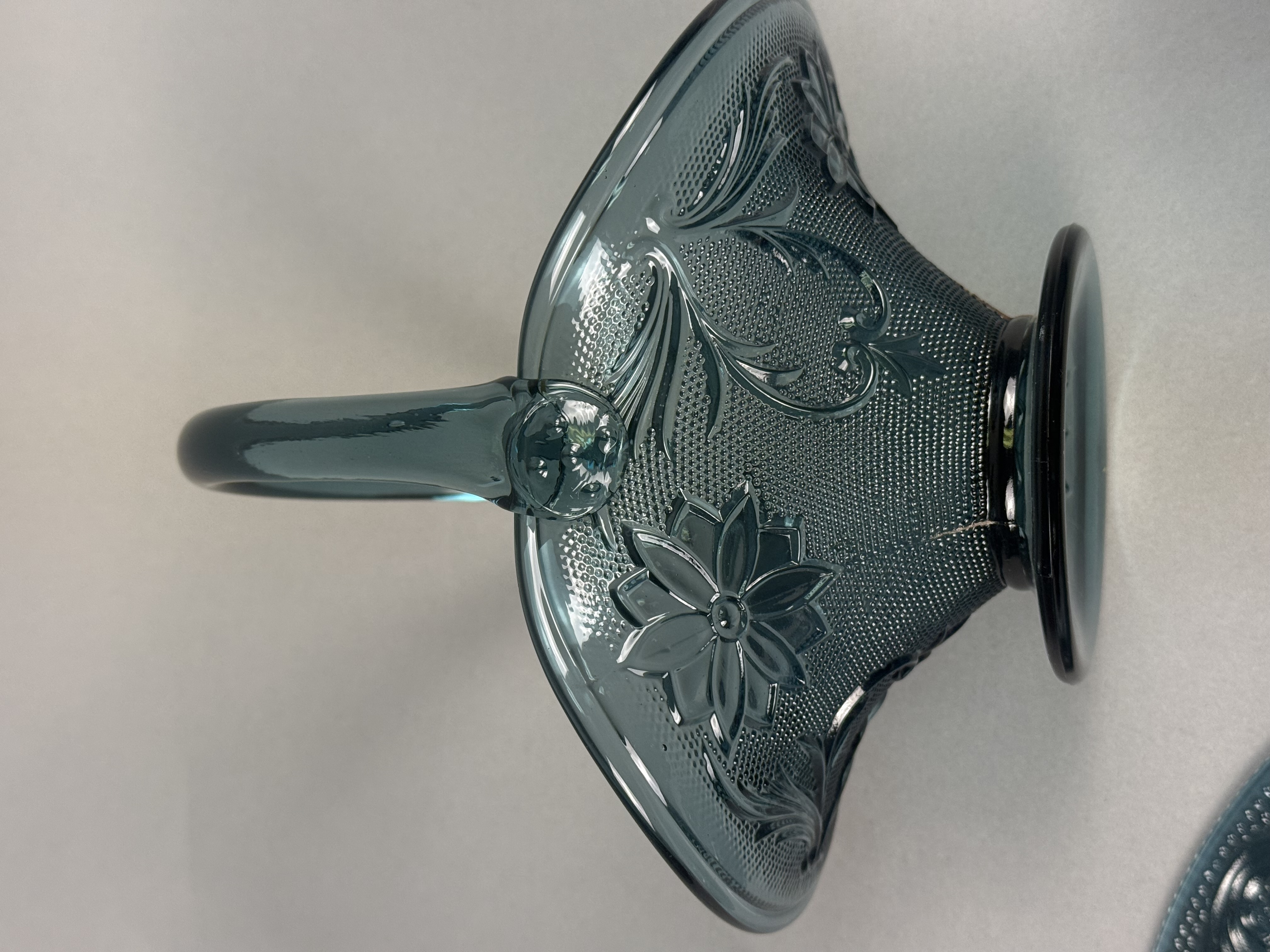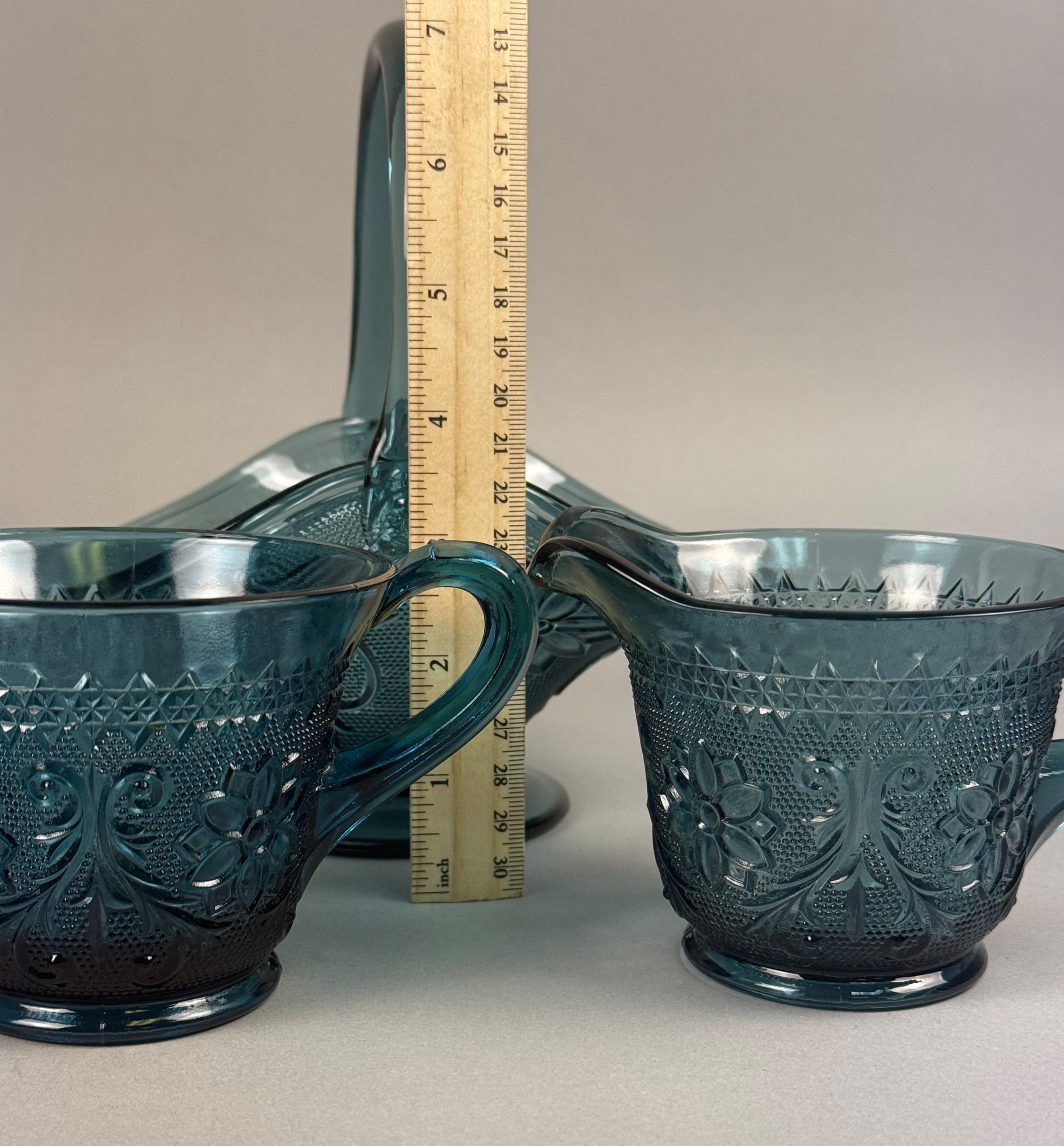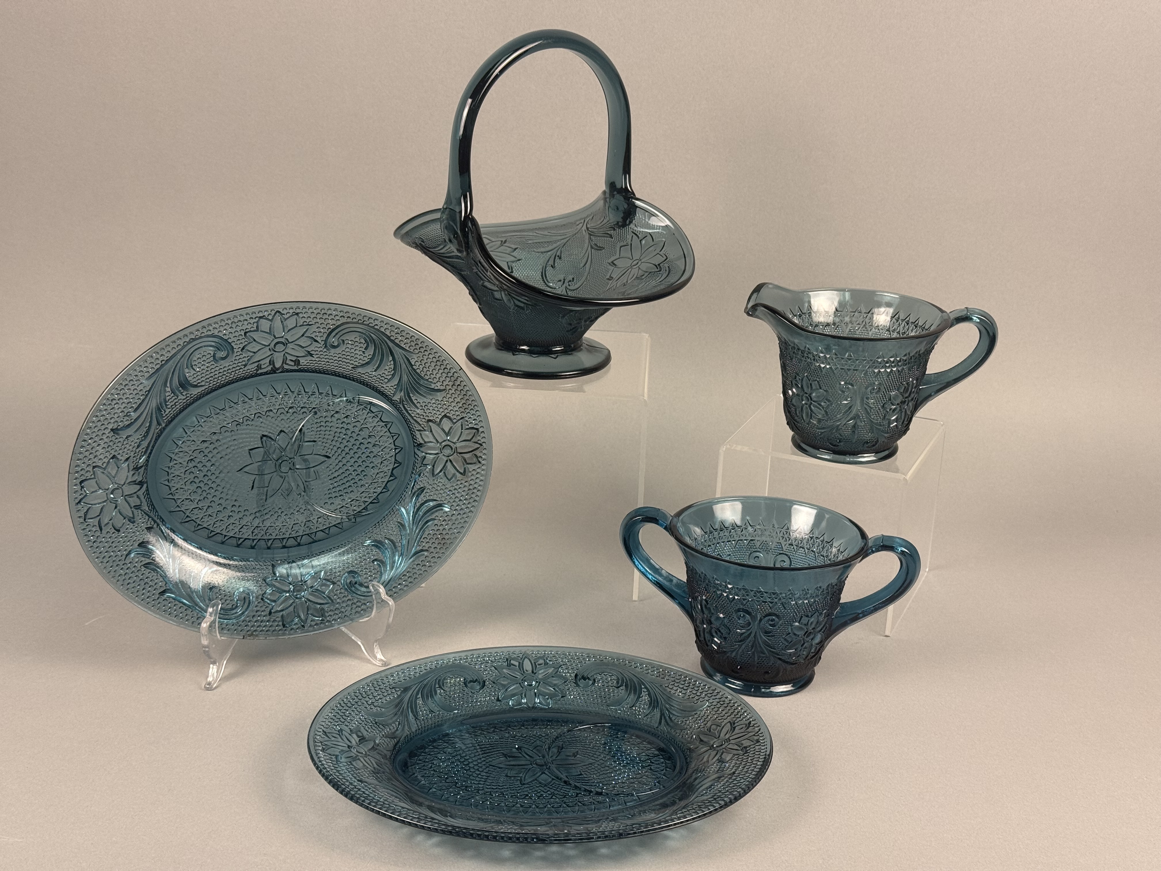 This five-piece set of pressed glass tableware is in the Sandwich pattern, attributed to Indiana Glass for Tiara Exclusives. The set is produced in a dark teal blue color and features molded decoration including stylized floral motifs, acanthus-style scrolls, and a stippled background. The collection includes one oval platter, one round plate, one footed basket with a high overhead handle and flared rim, one footed creamer with a single handle, and one footed open sugar bowl with two handles. The bases of the footed pieces feature a molded multi-petaled flower design. No maker marks or alphanumeric characters are present on the items. Oval Platter: 8.5 inches in length Basket: 7 inches tall The items are in good condition with no visible chips, cracks, or repairs. The oval platter exhibits minor dark inclusions within the glass, which are typical factory carbon spots or cooling marks common in this type of pressed glass.