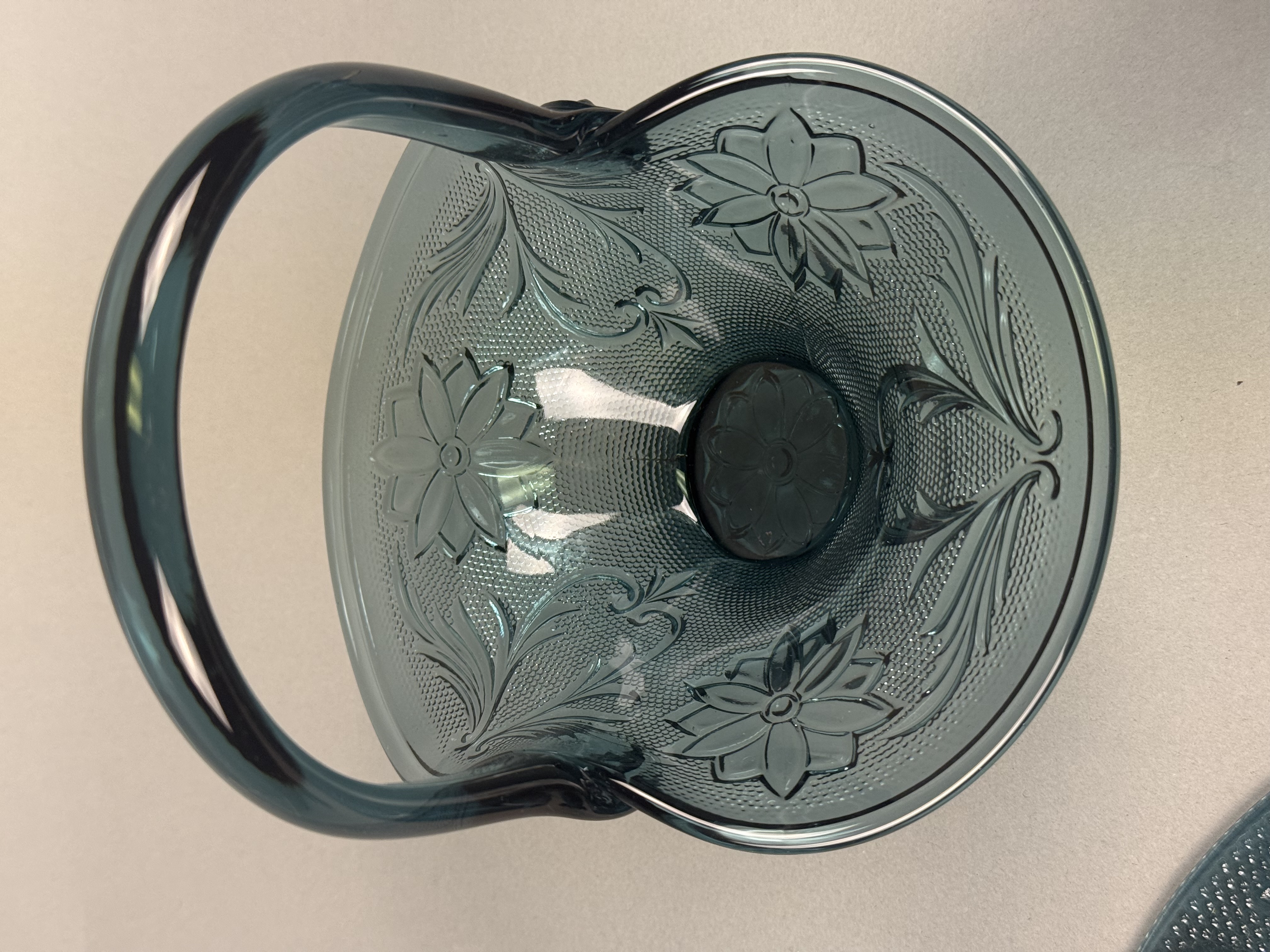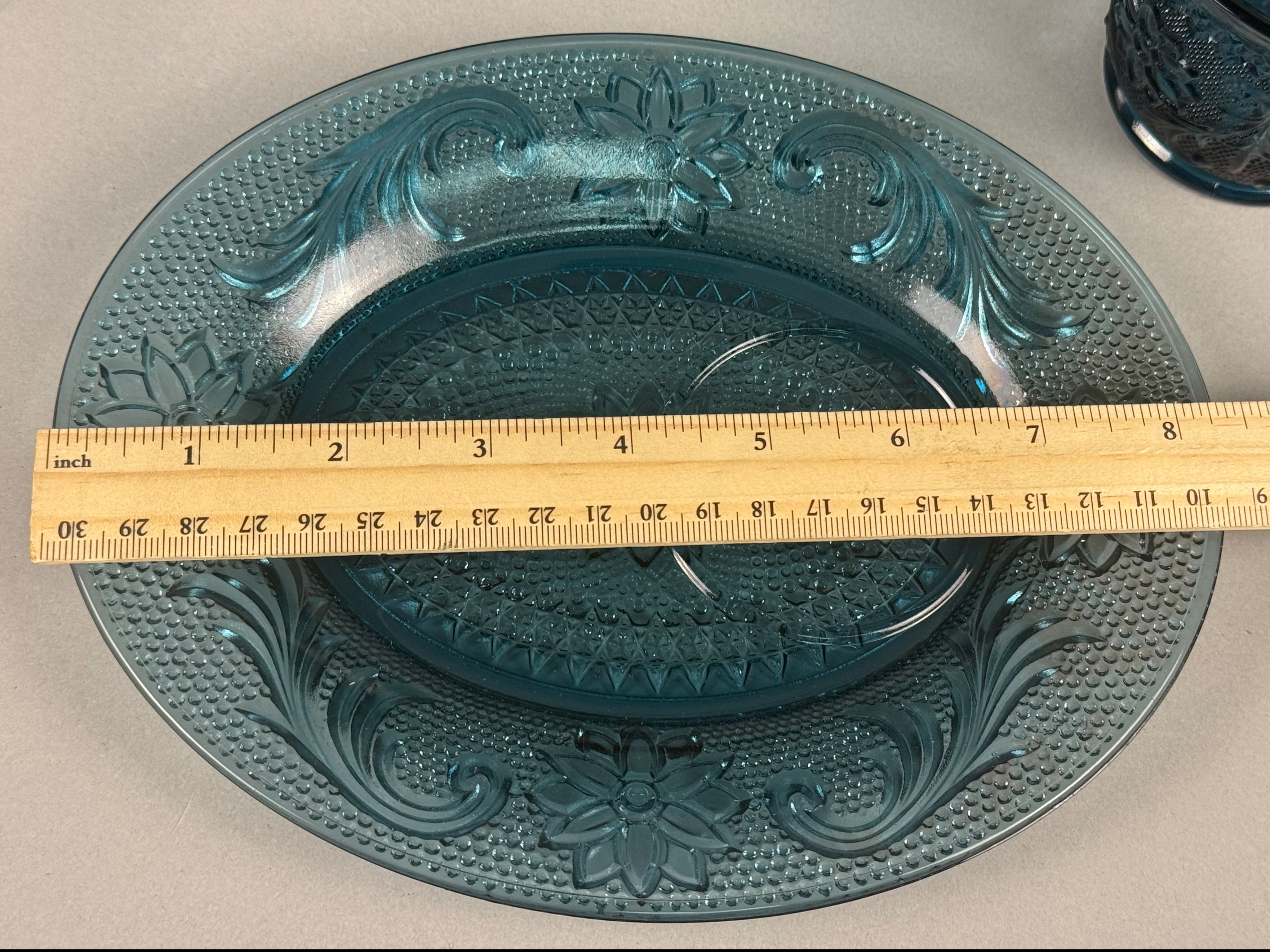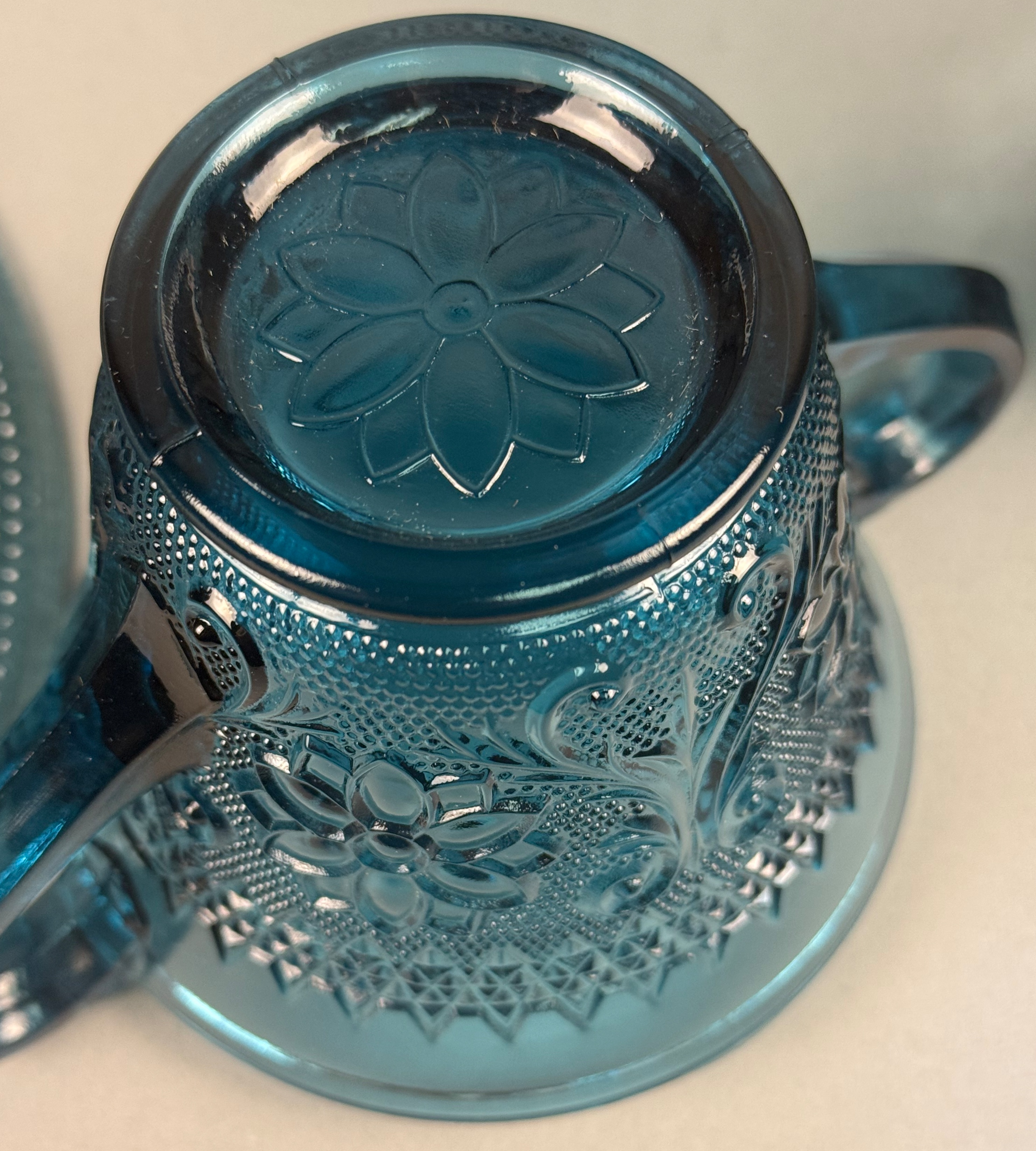This five-piece set of pressed glass tableware is in the Sandwich pattern, attributed to Indiana Glass for Tiara Exclusives. The set is produced in a dark teal blue color and features molded decoration including stylized floral motifs, acanthus-style scrolls, and a stippled background. The collection includes one oval platter, one round plate, one footed basket with a high overhead handle and flared rim, one footed creamer with a single handle, and one footed open sugar bowl with two handles. The bases of the footed pieces feature a molded multi-petaled flower design. No maker marks or alphanumeric characters are present on the items. Oval Platter: 8.5 inches in length Basket: 7 inches tall The items are in good condition with no visible chips, cracks, or repairs. The oval platter exhibits minor dark inclusions within the glass, which are typical factory carbon spots or cooling marks common in this type of pressed glass.