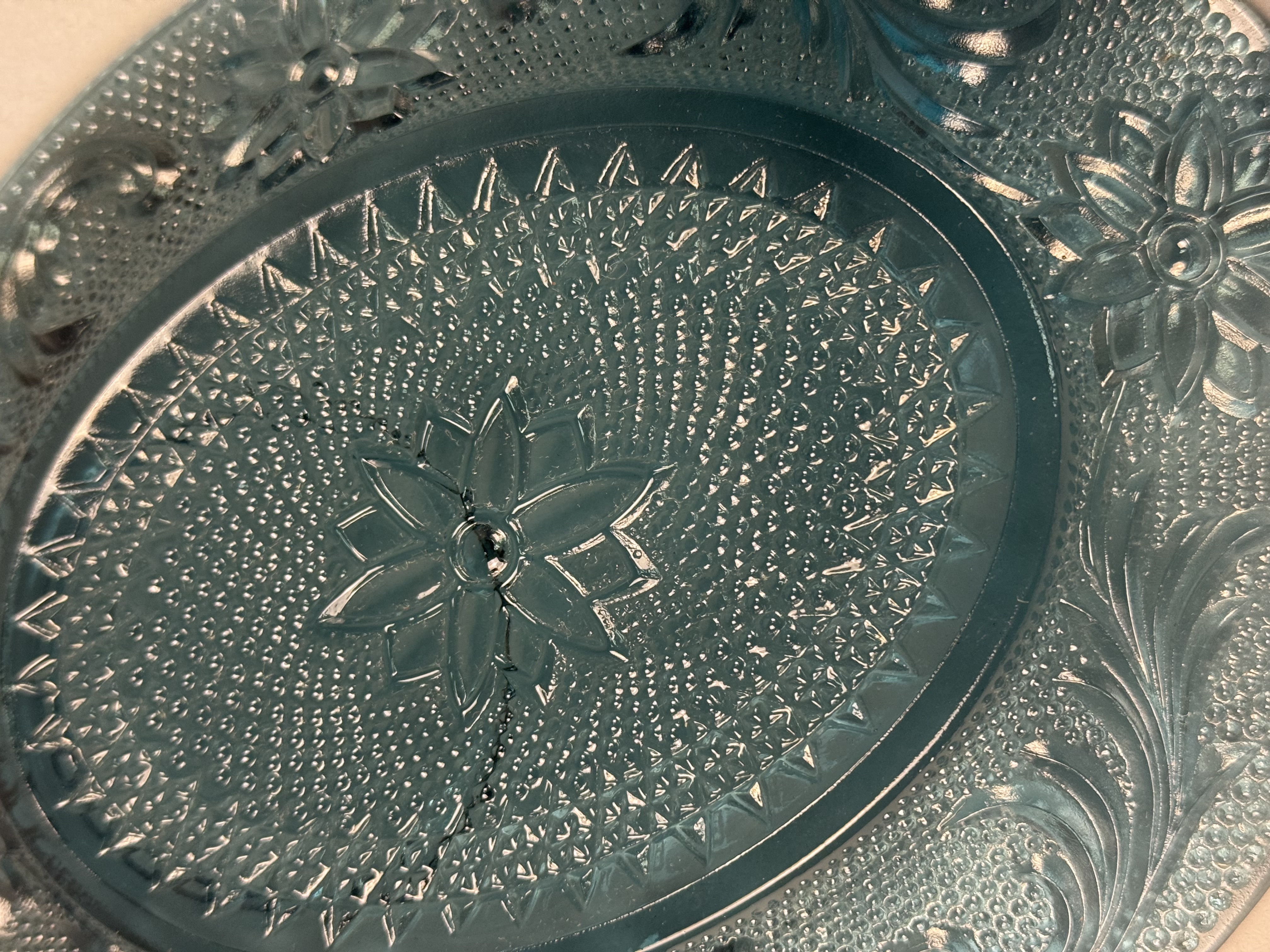 The items are in good condition with no visible chips, cracks, or repairs. The oval platter exhibits minor dark inclusions within the glass, which are typical factory carbon spots or cooling marks common in this type of pressed glass.