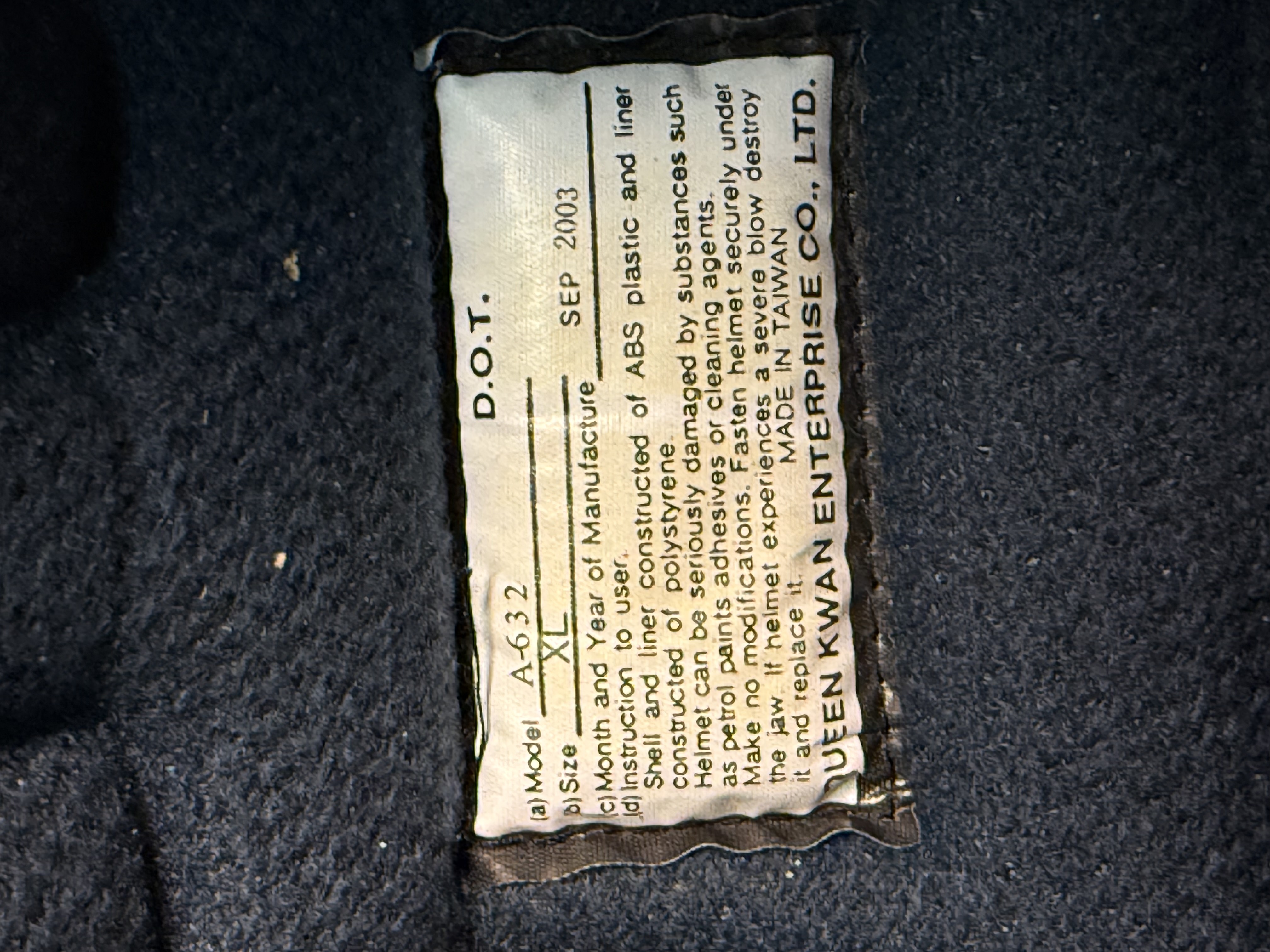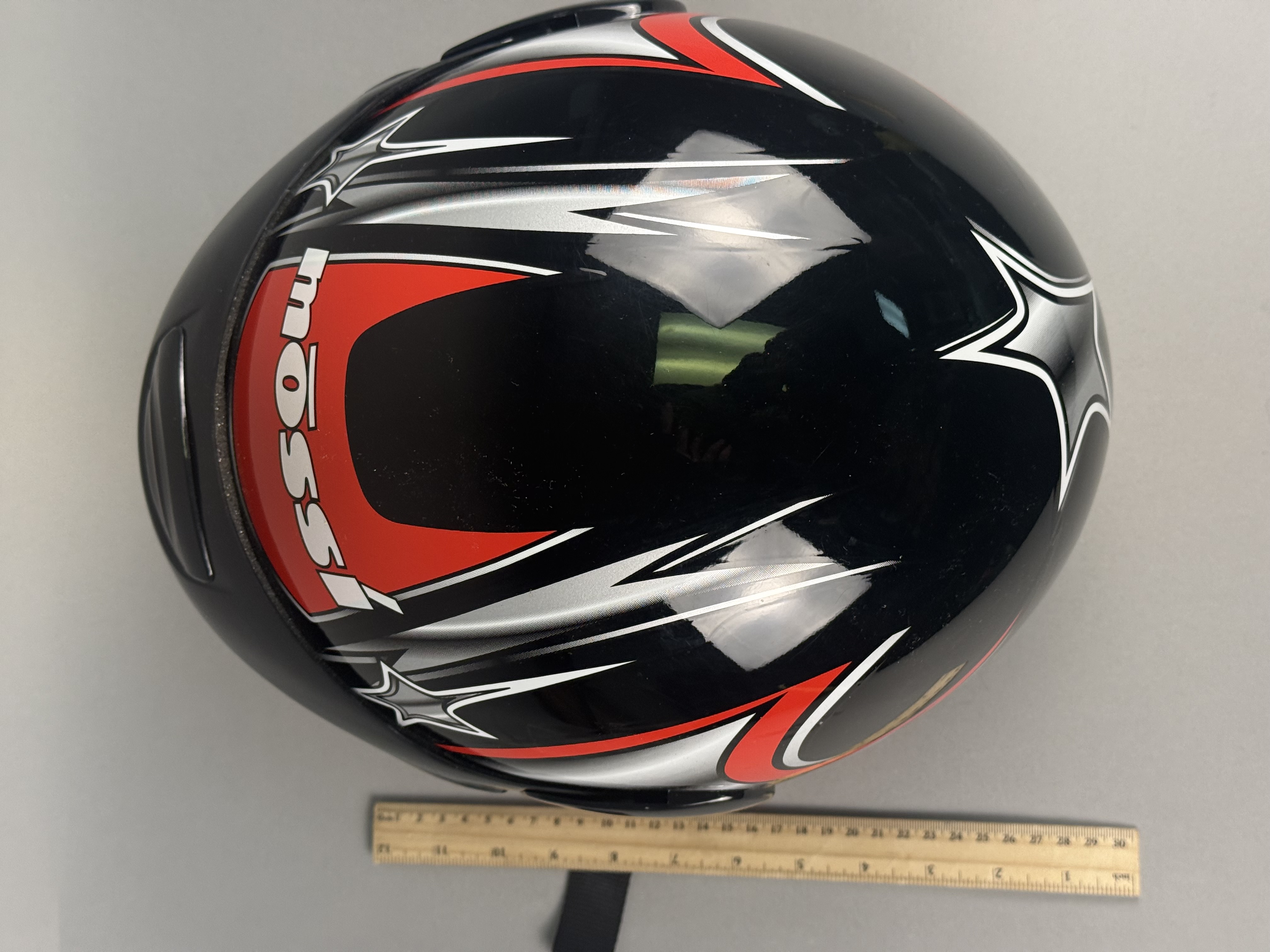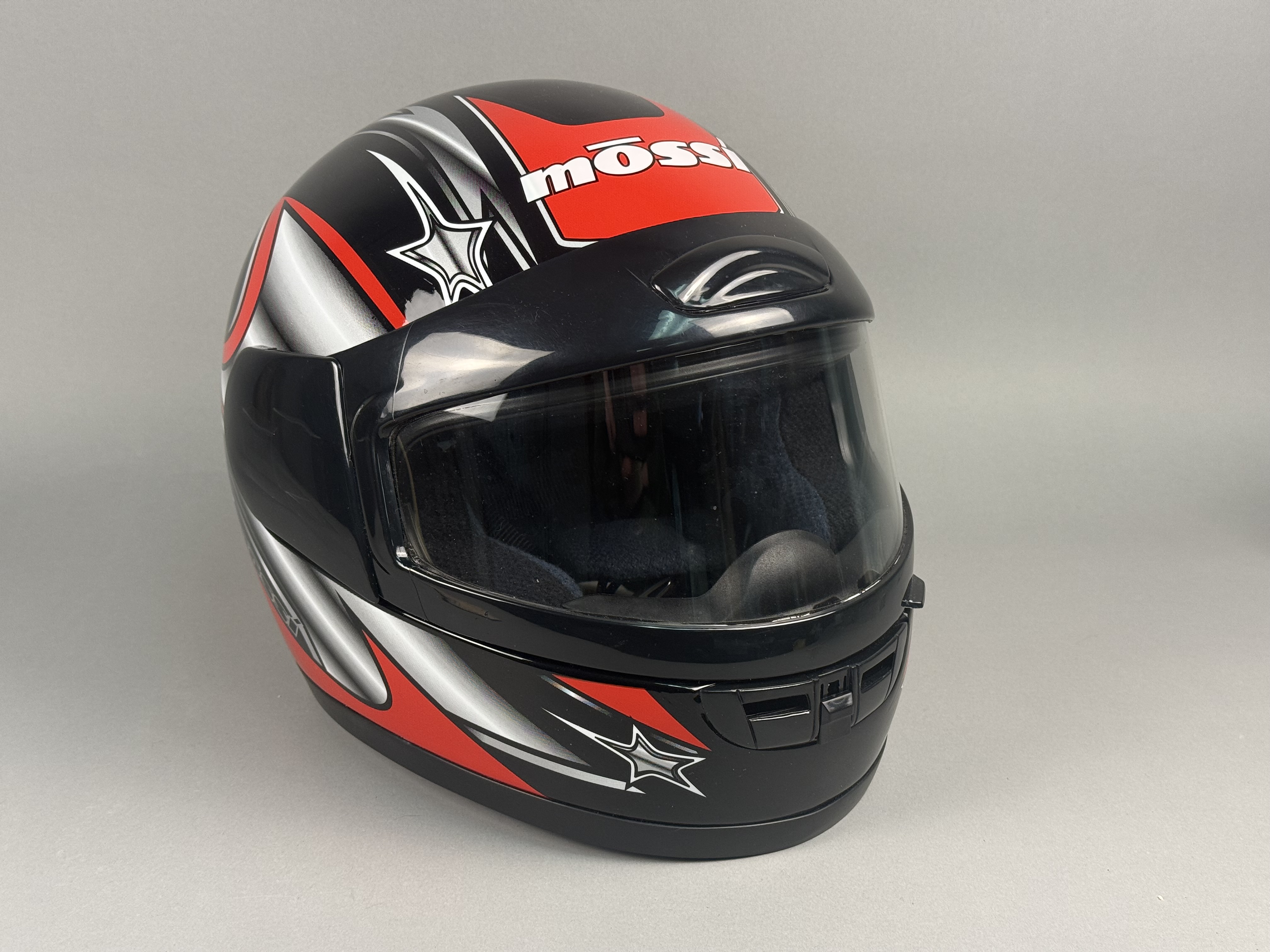 A Mossi model A-632 full-face motorcycle helmet featuring a glossy black finish decorated with red, silver, and white star and swoosh graphics. The exterior shell is constructed of ABS plastic and the interior liner is composed of polystyrene. The piece includes a clear plastic visor and integrated ventilation ports. Visible markings include the Mossi brand name on the exterior and an interior manufacturer label for Queen Kwan Enterprise Co., Ltd. The label specifies a manufacturing date of September 2003 and a size of XL. The helmet is marked with D.O.T. safety certification. Length: 11 inches. Height: 10 inches The helmet is in used condition with visible surface scuffs and scratches present on the exterior shell and the clear plastic visor.