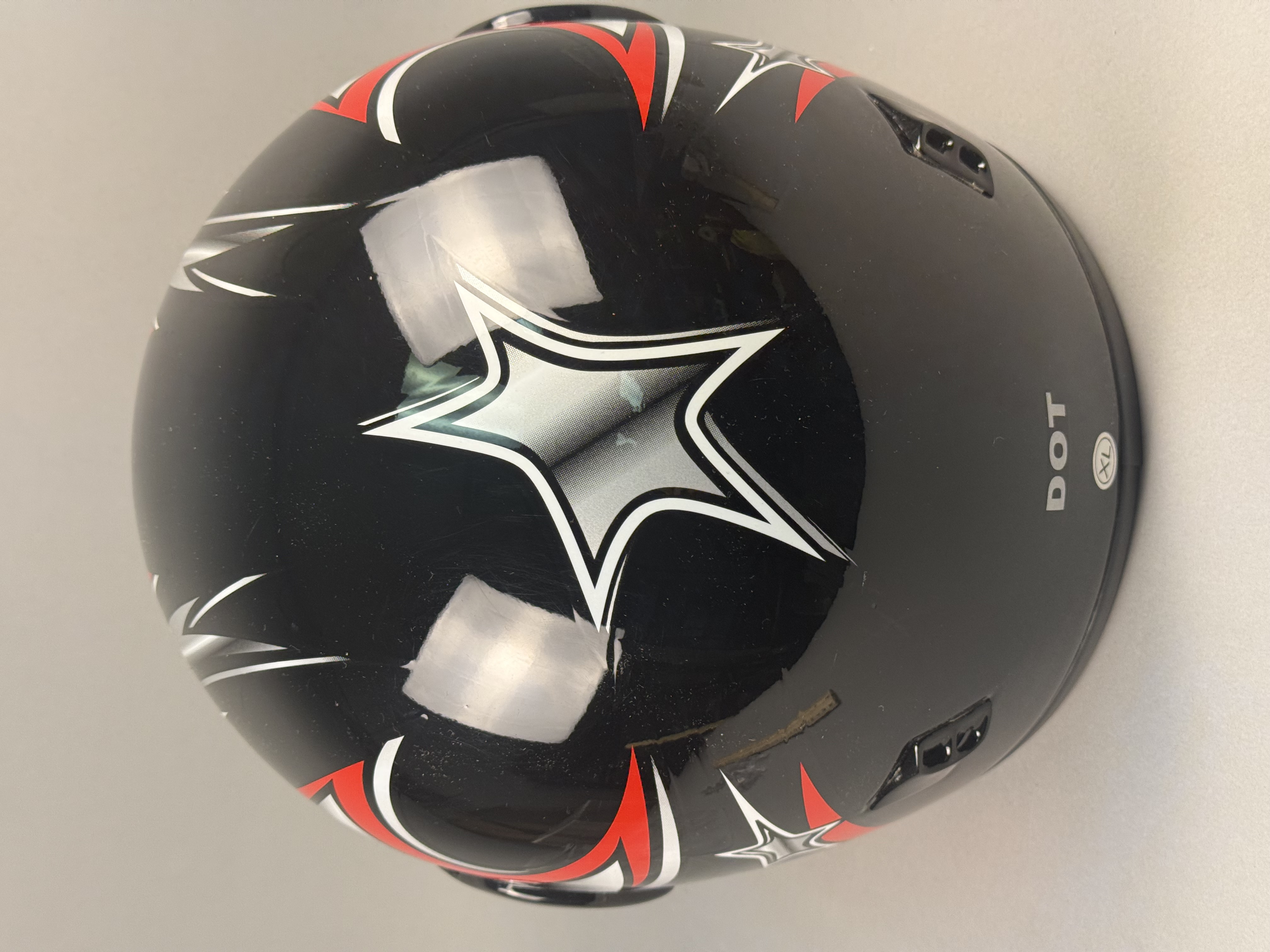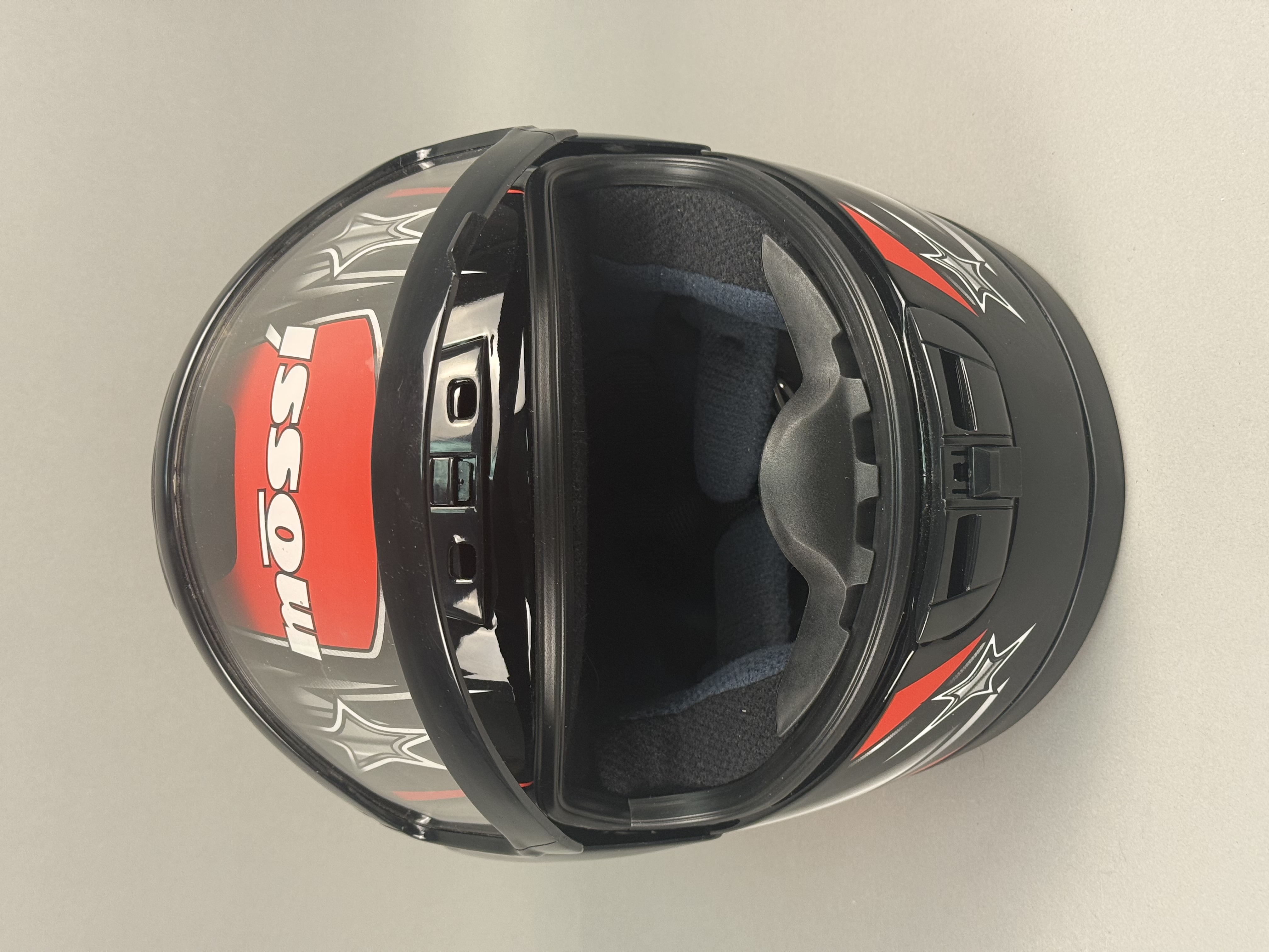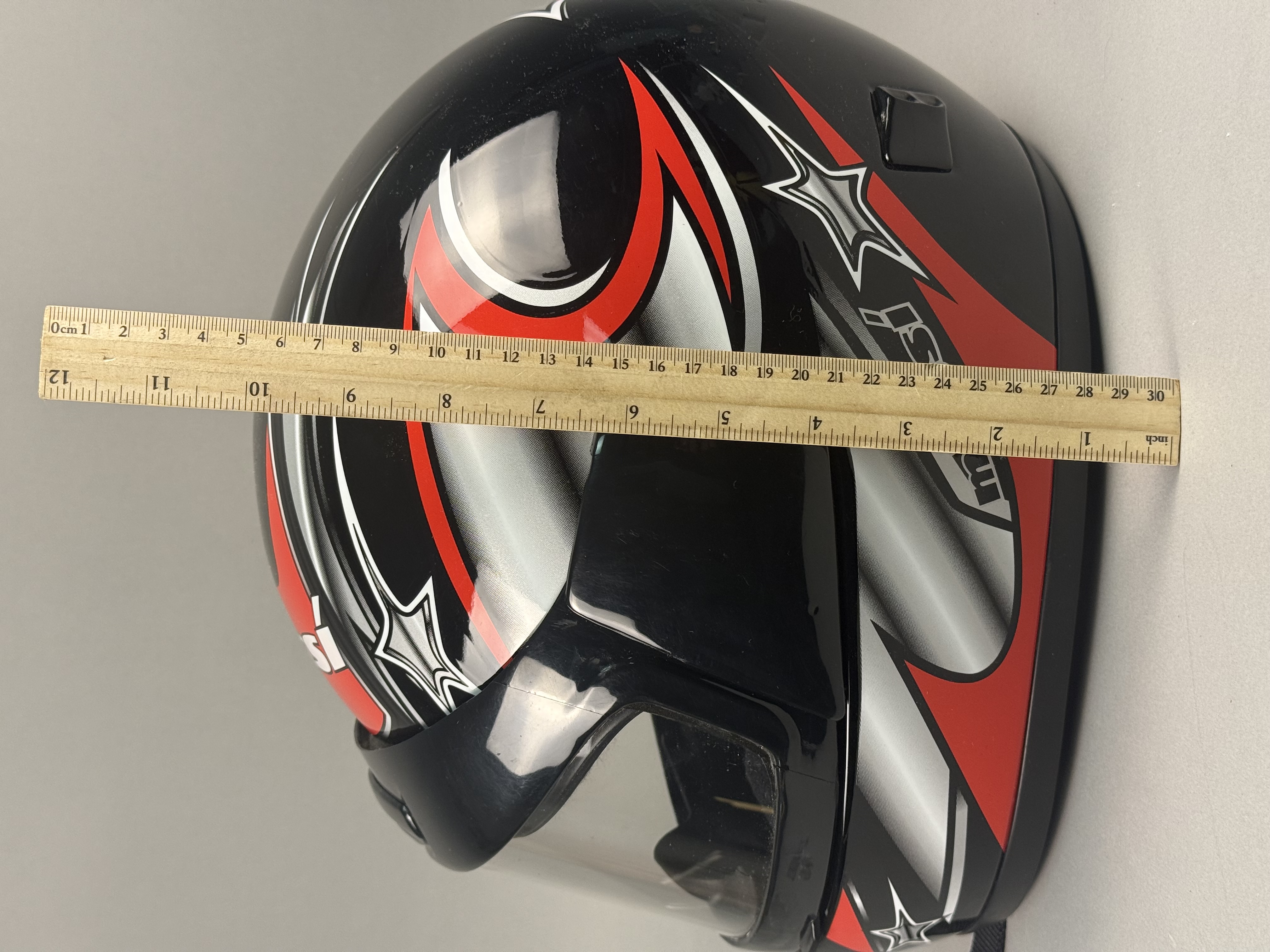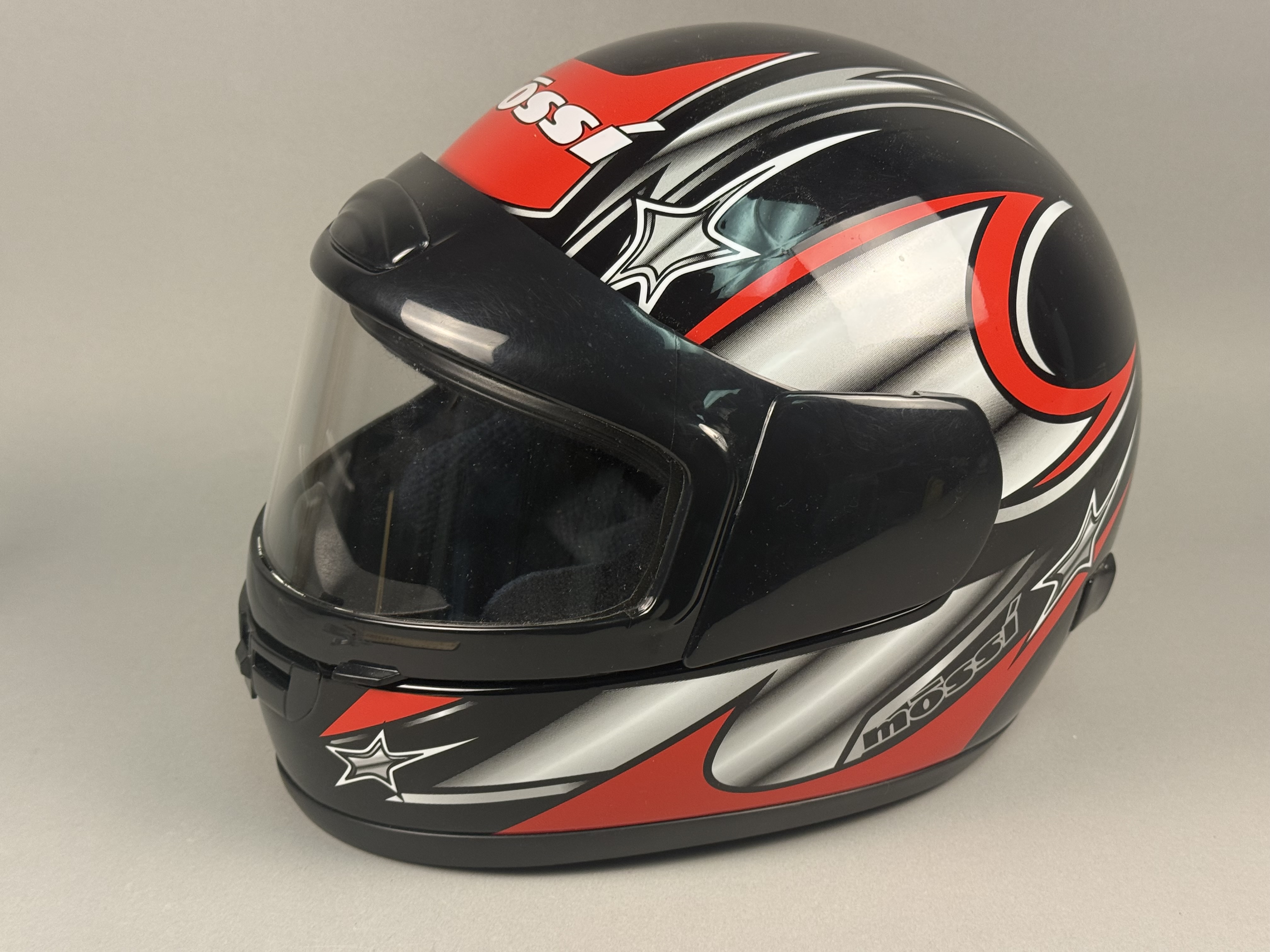 The helmet is in used condition with visible surface scuffs and scratches present on the exterior shell and the clear plastic visor.