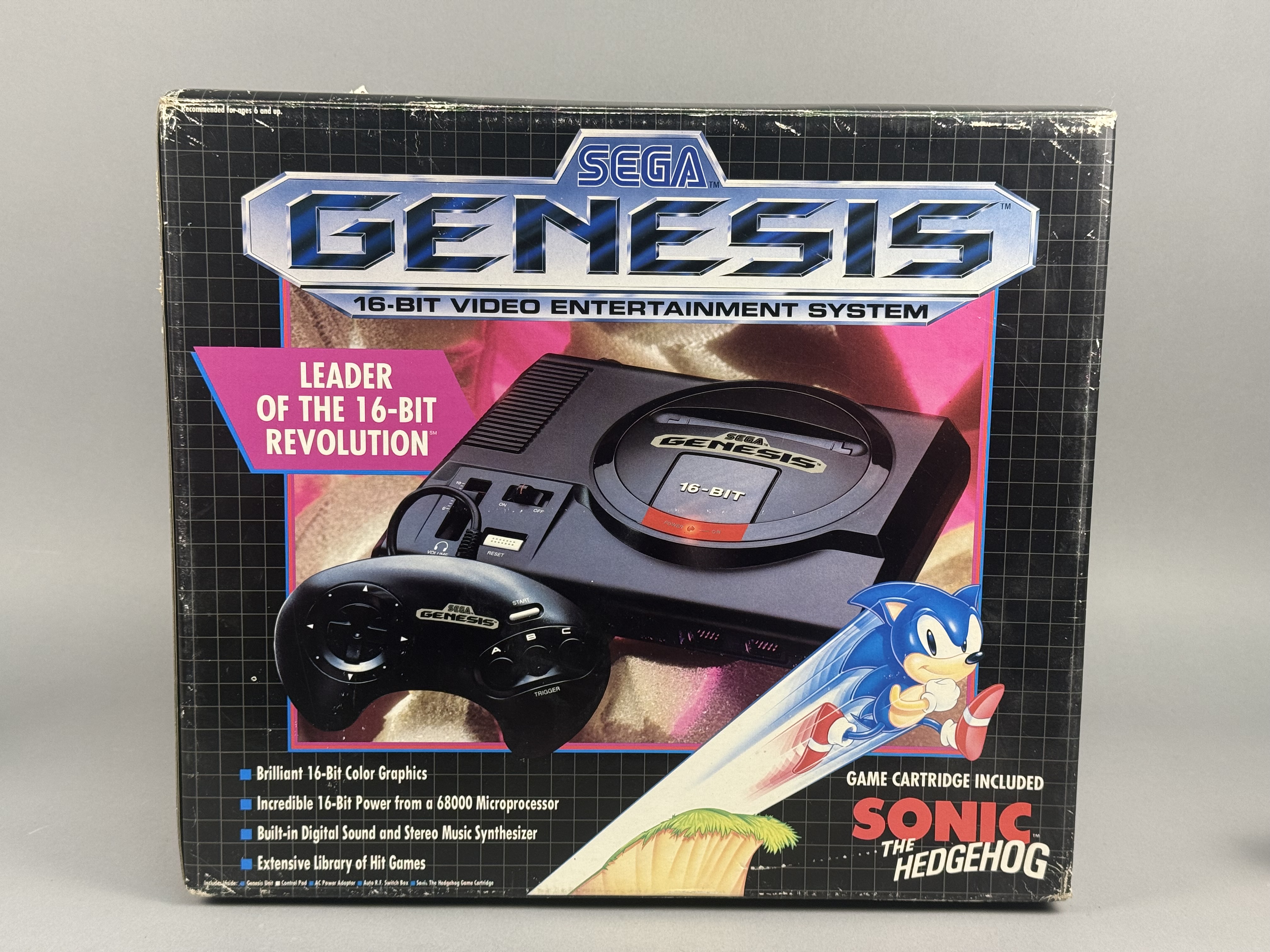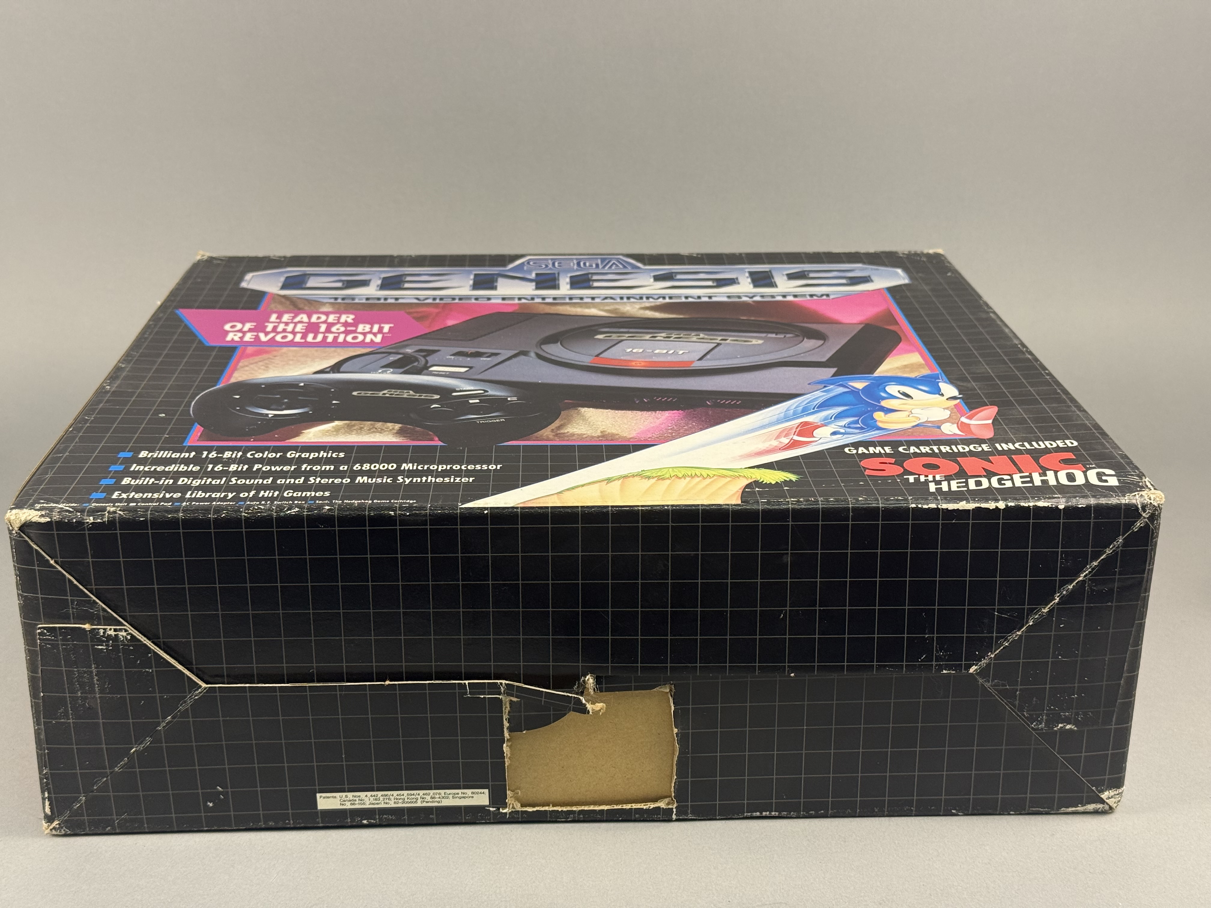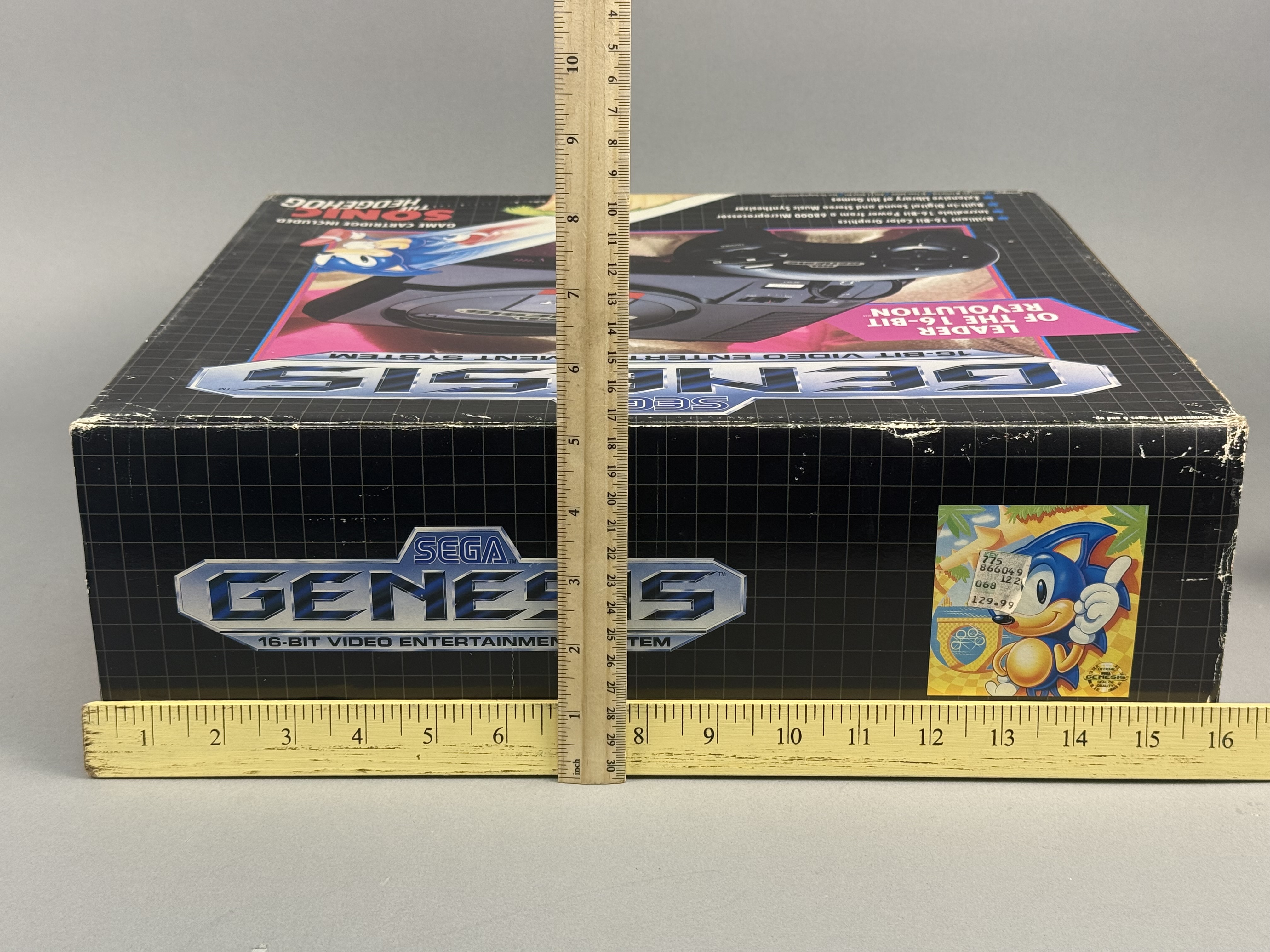 This lot comprises the original retail packaging and select internal components for a Sega Genesis 16-Bit Video Entertainment System, specifically the Sonic the Hedgehog bundle. The item is housed in its original cardboard box featuring the signature black grid pattern and promotional graphics identifying it as the Leader of the 16-bit Revolution. Included in this lot are the internal cardboard packing tray, the original Sega Genesis Instruction Manual with a yellow extended warranty sticker, and an RF switch adapter in its original plastic sleeve. Several clear plastic packing bags are also present within the tray. Please note that this listing is for the box, manual, and specific accessories only; there is no console included in this lot. Width: 16 inches Length: 5.25 inches The original retail box shows significant signs of age and shelf wear, characterized by scuffing and whitening along the edges and corners. A rectangular cutout measuring approximately 2 inches by 1.5 inches is present on the bottom panel of the outer box. A vintage retail price sticker is located on the side panel. The internal cardboard tray and printed manual remain in stable condition.