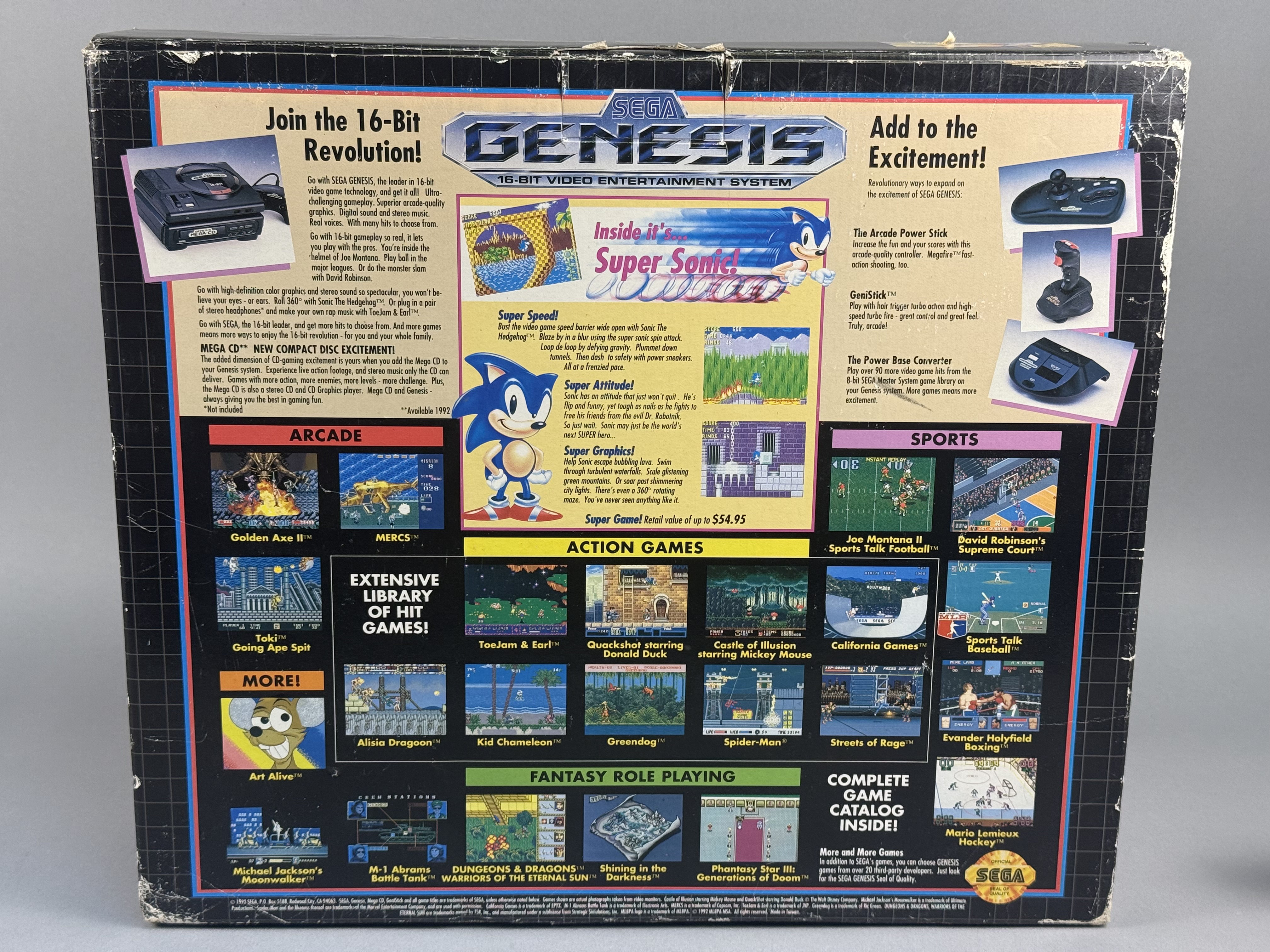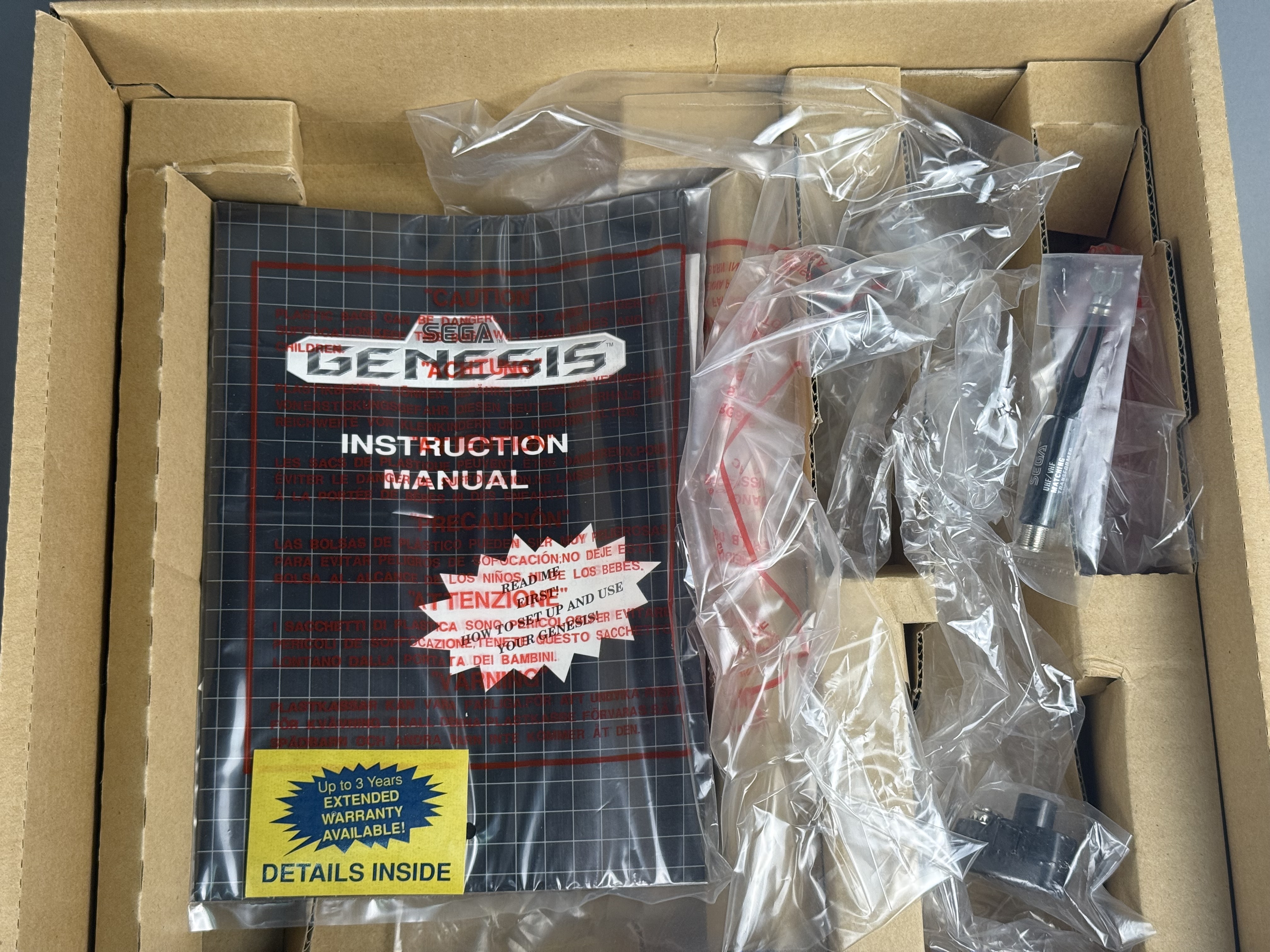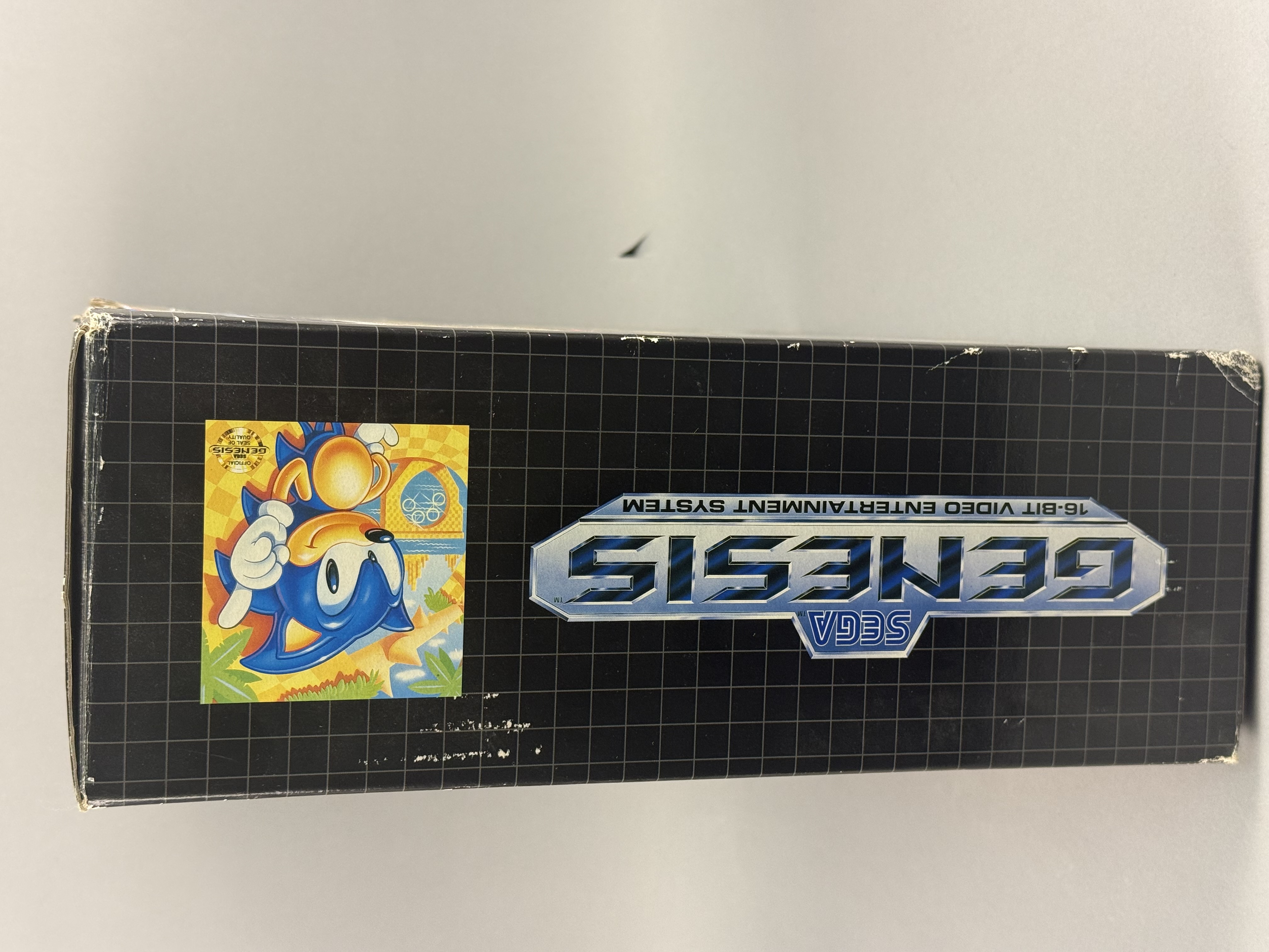This lot comprises the original retail packaging and select internal components for a Sega Genesis 16-Bit Video Entertainment System, specifically the Sonic the Hedgehog bundle. The item is housed in its original cardboard box featuring the signature black grid pattern and promotional graphics identifying it as the Leader of the 16-bit Revolution. Included in this lot are the internal cardboard packing tray, the original Sega Genesis Instruction Manual with a yellow extended warranty sticker, and an RF switch adapter in its original plastic sleeve. Several clear plastic packing bags are also present within the tray. Please note that this listing is for the box, manual, and specific accessories only; there is no console included in this lot. Width: 16 inches Length: 5.25 inches The original retail box shows significant signs of age and shelf wear, characterized by scuffing and whitening along the edges and corners. A rectangular cutout measuring approximately 2 inches by 1.5 inches is present on the bottom panel of the outer box. A vintage retail price sticker is located on the side panel. The internal cardboard tray and printed manual remain in stable condition.